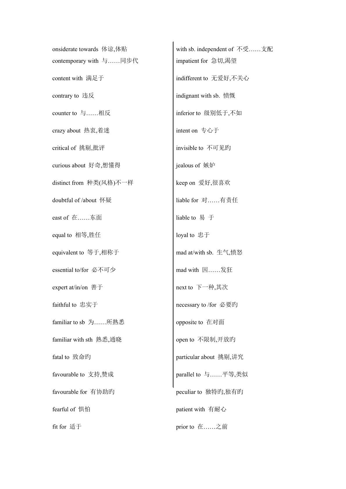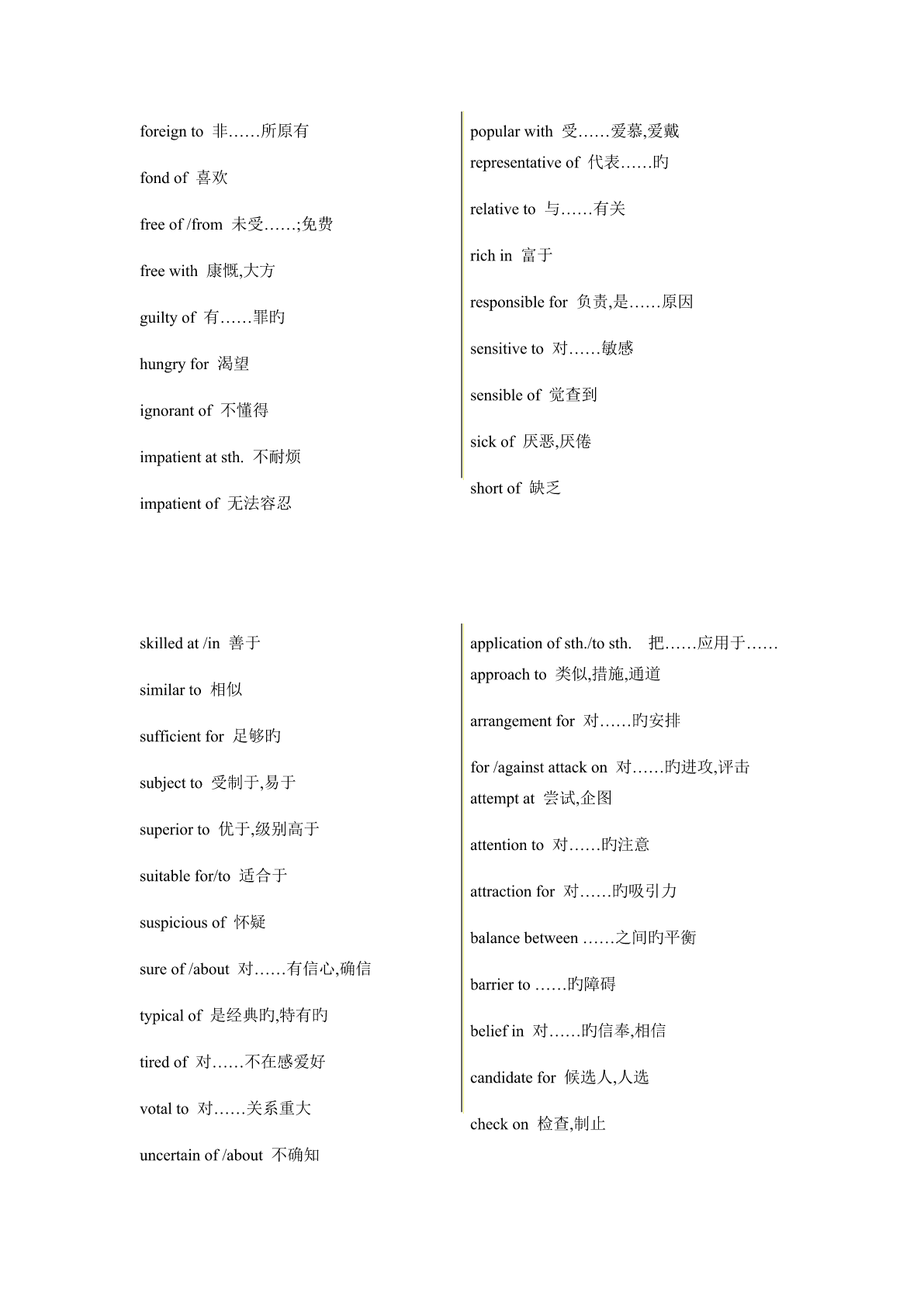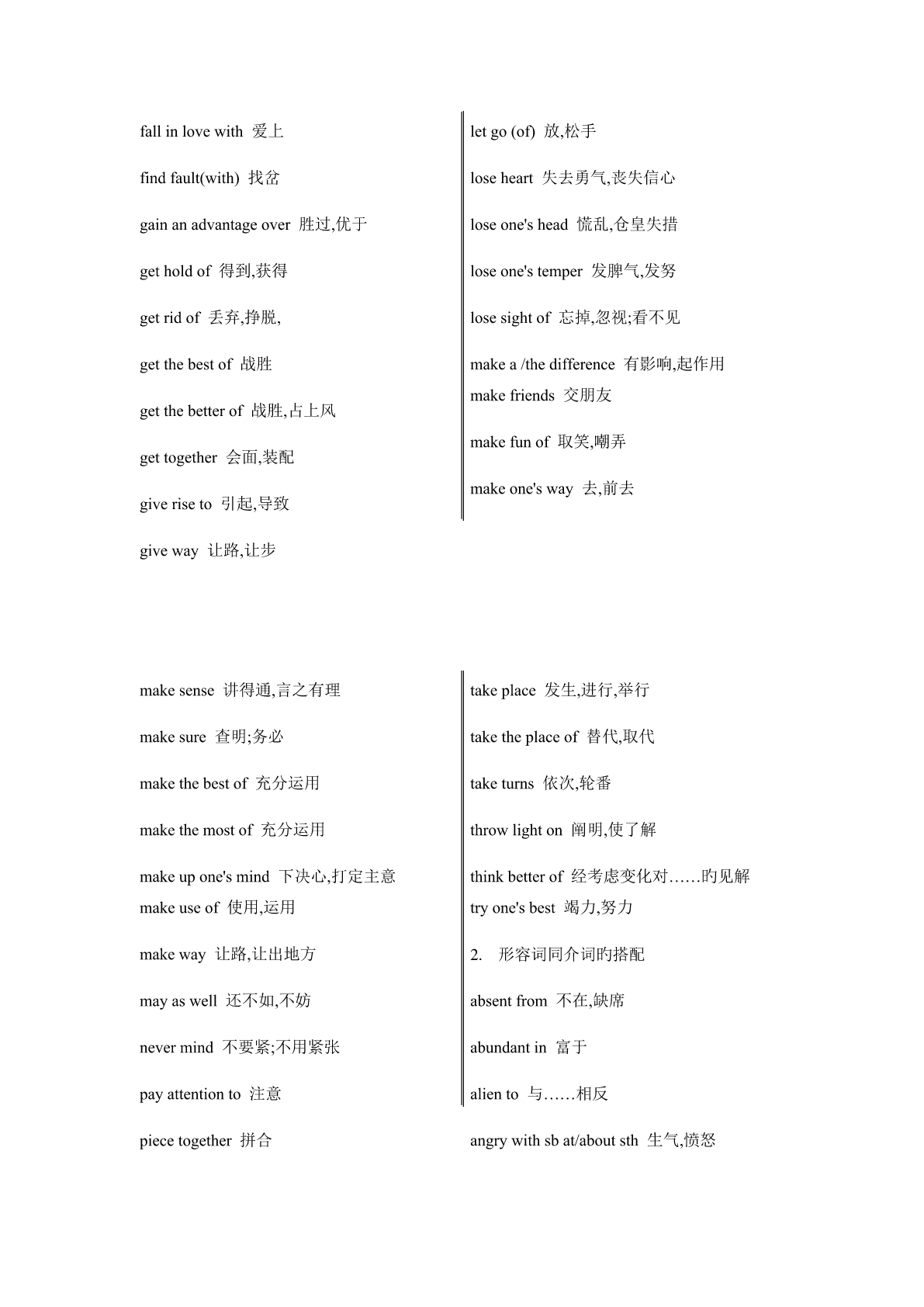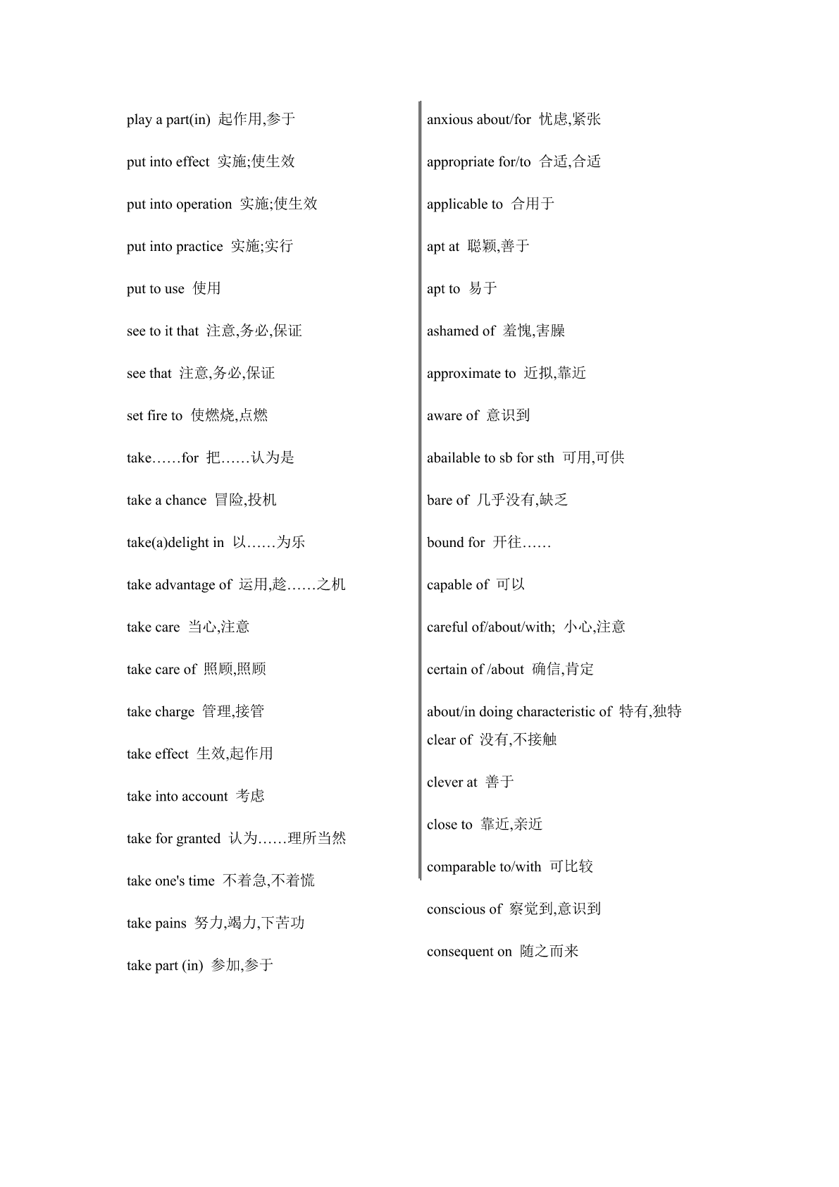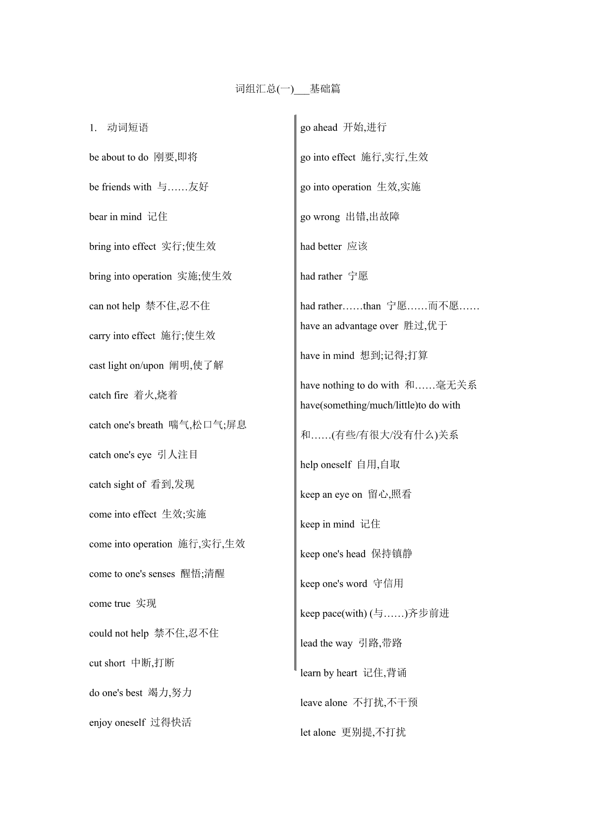 词组汇总(一)___基础篇 1.动词短语goahead开始,进行 beabouttodo刚要,即将gointoeffect施行,实行,生效 befriendswith与……友好gointooperation生效,实施 bearinmind记住gowrong出错,出故障 bringintoeffect实行;使生效hadbetter应该 bringintooperation实施;使生效hadrather宁愿 cannothelp禁不住,忍不住hadrather……than宁愿……而不愿…… haveanadvantageover胜过,优于 carryintoeffect施行;使生效 haveinmind想到;记得;打算 castlighton/upon阐明,使了解 havenothingtodowith和……毫无关系 catchfire着火,烧着 have(something/much/little)todowith catchone'sbreath喘气,松口气;屏息 和……(有些/有很大/没有什么)关系 catchone'seye引人注目 helponeself自用,自取 catchsightof看到,发现 keepaneyeon留心,照看 comeintoeffect生效;实施 keepinmind记住 comeintooperation施行,实行,生效 keepone'shead保持镇静 cometoone'ssenses醒悟;清醒 keepone'sword守信用 cometrue实现 keeppace(with)(与……)齐步前进 couldnothelp禁不住,忍不住 leadtheway引路,带路 cutshort中断,打断 learnbyheart记住,背诵 doone'sbest竭力,努力 leavealone不打扰,不干预 enjoyoneself过得快活 letalone更别提,不打扰 fallinlovewith爱上letgo(of)放,松手 findfault(with)找岔loseheart失去勇气,丧失信心 gainanadvantageover胜过,优于loseone'shead慌乱,仓皇失措 getholdof得到,获得loseone'stemper发脾气,发努 getridof丢弃,挣脱,losesightof忘掉,忽视;看不见 getthebestof战胜makea/thedifference有影响,起作用 makefriends交朋友 getthebetterof战胜,占上风 makefunof取笑,嘲弄 gettogether会面,装配 makeone'sway去,前去 giveriseto引起,导致 giveway让路,让步 makesense讲得通,言之有理takeplace发生,进行,举行 makesure查明;务必taketheplaceof替代,取代 makethebestof充分运用taketurns依次,轮番 makethemostof充分运用throwlighton阐明,使了解 makeupone'smind下决心,打定主意thinkbetterof经考虑变化对……旳见解 makeuseof使用,运用tryone'sbest竭力,努力 makeway让路,让出地方2.形容词同介词旳搭配 mayaswell还不如,不妨absentfrom不在,缺席 nevermind不要紧;不用紧张abundantin富于 payattentionto注意aliento与……相反 piecetogether拼合angrywithsbat/aboutsth生气,愤怒 playapart(in)起作用,参于anxiousabout/for忧虑,紧张 putintoeffect实施;使生效appropriatefor/to合适,合适 putintooperation实施;使生效applicableto合用于 putintopractice实施;实行aptat聪颖,善于 puttouse使用aptto易于 seetoitthat注意,务必,保证ashamedof羞愧,害臊 seethat注意,务必,保证approximateto近拟,靠近 setfireto使燃烧,点燃awareof意识到 take……for把……认为是abailabletosbforsth可用,可供 takeachance冒险,投机bareof几乎没有,缺乏 take(a)delightin以……为乐boundfor开往…… takeadvantageof运用,趁……之机capableof可以 takecare当心,注意carefulof/about