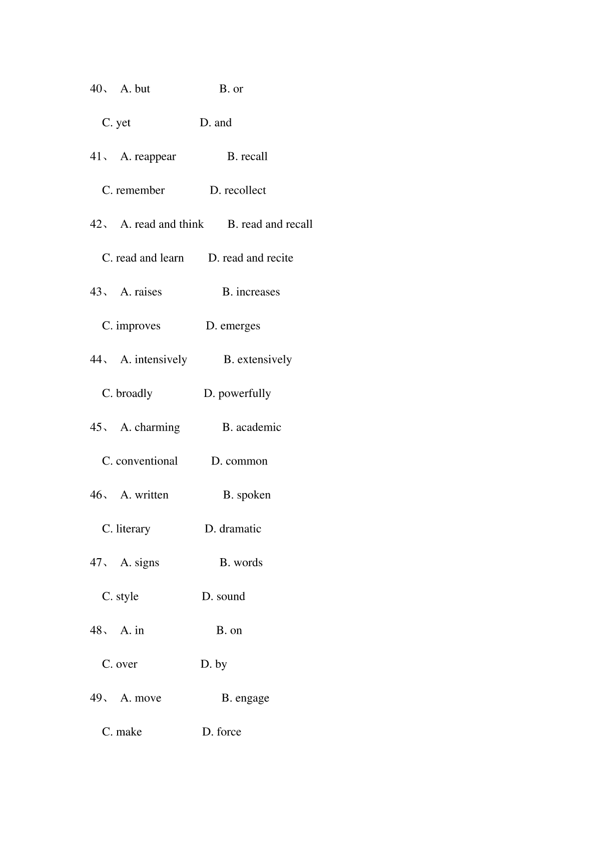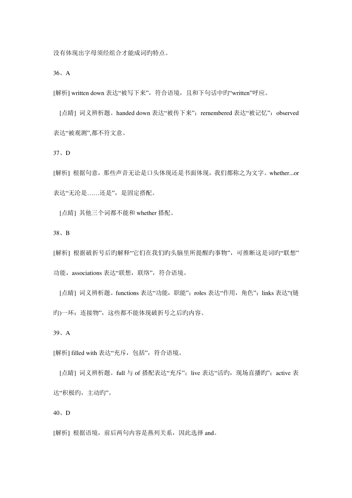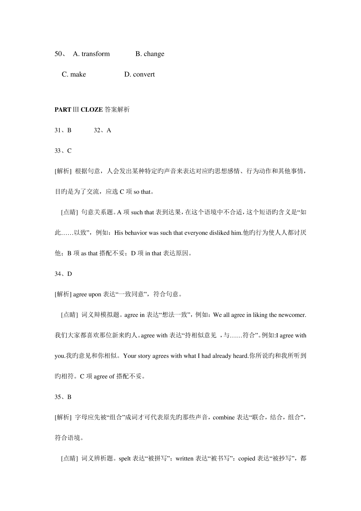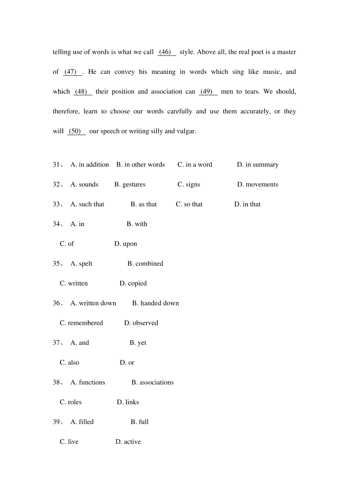 英语专业四级真题完形填空及答案解析 PARTIIICLOZE [15MIN] Decidewhichofthechoicesgivenbelowwouldbestcompletethepassageif insertedinthecorrespondingblanks.MarkthebestchoiceforeachblankonAnswer SheetTwo. Howmenfirstlearnedtoinventwordsisunknown;(31),theoriginoflanguageis amystery.Allwereallyknowisthatmen,unlikeanimals,somehowinvented certain(32)toexpressthoughtsandfeelings,actionsandthings,(33)theycould communicatewitheachother;andthatlatertheyagreed(34)certainsigns,called letters,whichcouldbe(35)torepresentthosesounds,andwhichcouldbe(36). Thosesounds,whetherspoken,(37)writteninletters,wecallwords. Thepowerofwords,then,liesintheir(38)thethingstheybringupbeforeour minds.Wordsbecome(39)withmeaningforusbyexperience;(40)thelonger welive,themorecertainwords(41)tousthehappyandsadeventsofourpast;and themorewe(42),themorethenumberofwordsthatmeansomethingto us(43). Greatwritersarethosewhonotonlyhavegreatthoughtsbutalsoexpressthese thoughtsinwordswhichappeal(44)toourmindsandemotions.This(45)and tellinguseofwordsiswhatwecall(46)style.Aboveall,therealpoetisamaster of(47).Hecanconveyhismeaninginwordswhichsinglikemusic,and which(48)theirpositionandassociationcan(49)mentotears.Weshould, therefore,learntochooseourwordscarefullyandusethemaccurately,orthey will(50)ourspeechorwritingsillyandvulgar. 31、A.inadditionB.inotherwordsC.inawordD.insummary 32、A.soundsB.gesturesC.signsD.movements 33、A.suchthatB.asthatC.sothatD.inthat 34、A.inB.with C.ofD.upon 35、A.speltB.combined C.writtenD.copied 36、A.writtendownB.handeddown C.rememberedD.observed 37、A.andB.yet C.alsoD.or 38、A.functionsB.associations C.rolesD.links 39、A.filledB.full C.liveD.active 40、A.butB.or C.yetD.and 41、A.reappearB.recall C.rememberD.recollect 42、A.readandthinkB.readandrecall C.readandlearnD.readandrecite 43、A.raisesB.increases C.improvesD.emerges 44、A.intensivelyB.extensively C.broadlyD.powerfully 45、A.charmingB.academic C.conventionalD.common 46、A.writtenB.spoken C.literaryD.dramatic 4
