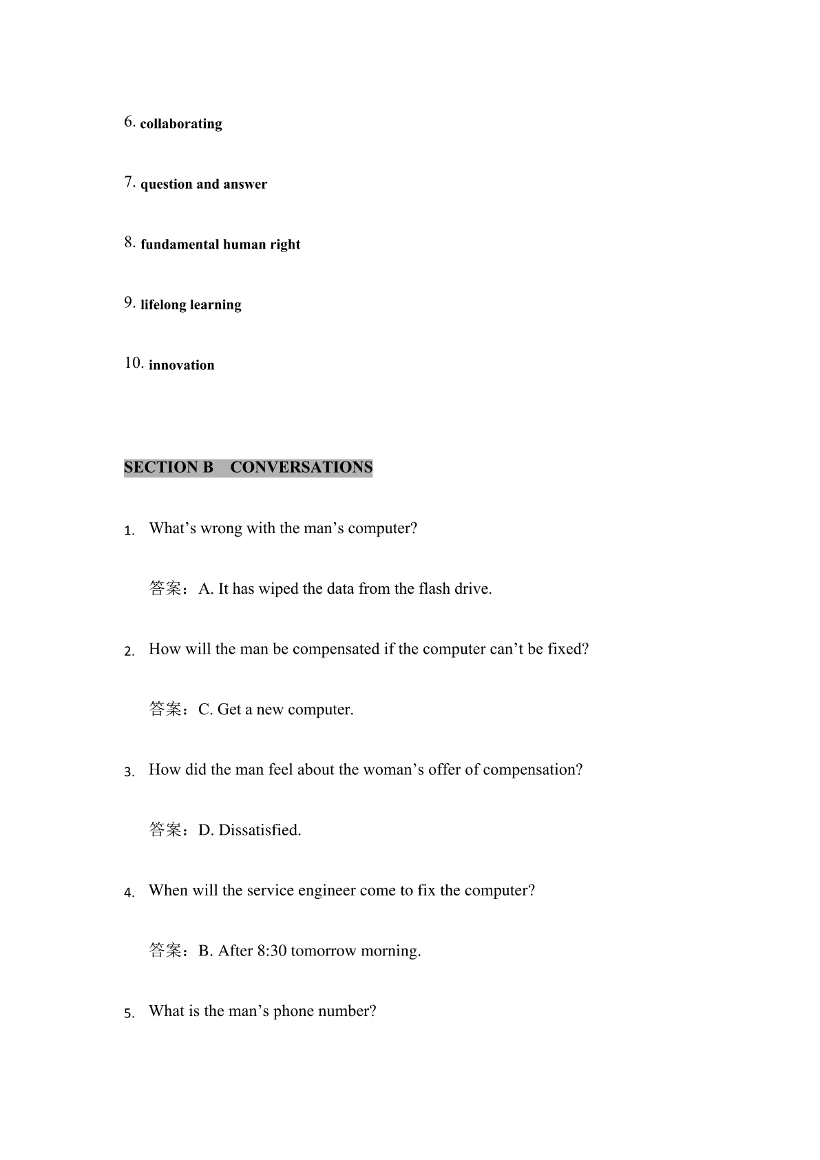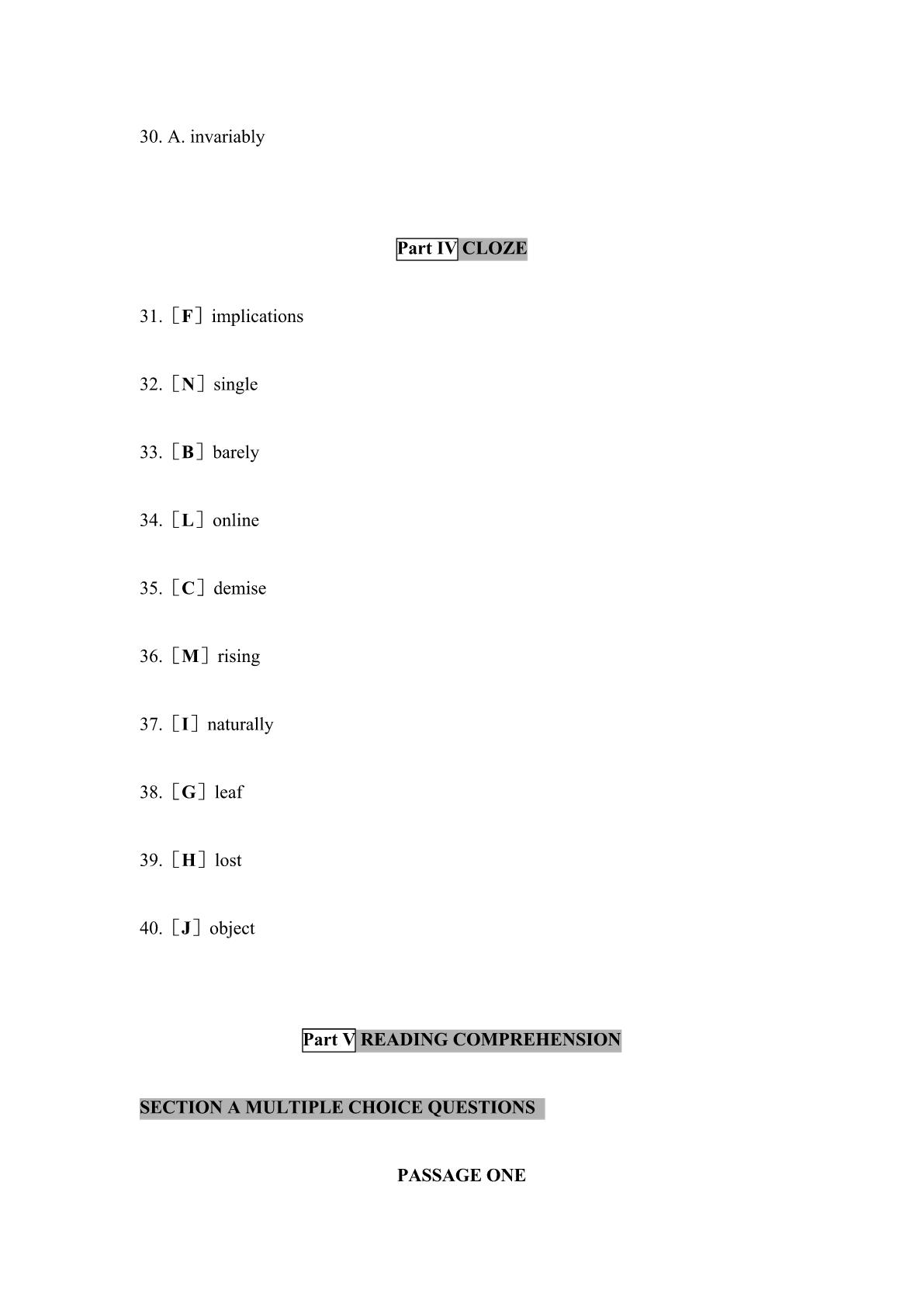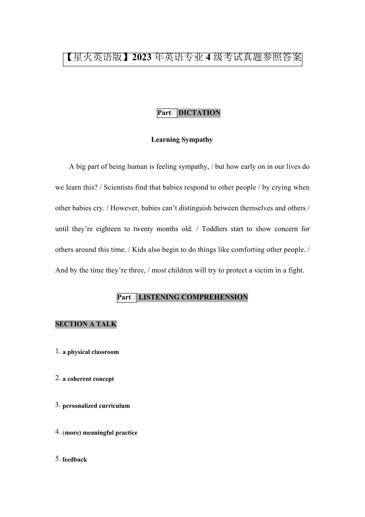 【星火英语版】2023年英语专业4级考试真题参照答案 PartⅠDICTATION LearningSympathy Abigpartofbeinghumanisfeelingsympathy,/buthowearlyoninourlivesdo welearnthis?/Scientistsfindthatbabiesrespondtootherpeople/bycryingwhen otherbabiescry./However,babiescan’tdistinguishbetweenthemselvesandothers/ untilthey’reeighteentotwentymonthsold./Toddlersstarttoshowconcernfor othersaroundthistime./Kidsalsobegintodothingslikecomfortingotherpeople./ Andbythetimethey’rethree,/mostchildrenwilltrytoprotectavictiminafight. PartⅠLISTENINGCOMPREHENSION SECTIONATALK 1.aphysicalclassroom 2.acoherentconcept 3.personalizedcurriculum 4.(more)meaningfulpractice 5.feedback 6.collaborating 7.questionandanswer 8.fundamentalhumanright 9.lifelonglearning 10.innovation SECTIONBCONVERSATIONS 1.What’swrongwiththeman’scomputer? 答案:A.Ithaswipedthedatafromtheflashdrive. 2.Howwillthemanbecompensatedifthecomputercan’tbefixed? 答案:C.Getanewcomputer. 3.Howdidthemanfeelaboutthewoman’sofferofcompensation? 答案:D.Dissatisfied. 4.Whenwilltheserviceengineercometofixthecomputer? 答案:B.After8:30tomorrowmorning. 5.Whatistheman’sphonenumber? 答案:A.6574-3205. 6.Whatshouldwedoifourneighborsdidn’treachout? 答案:B.Introduceourselvesfirst. 7.Whichisthebestwaytohandleanoisyneighbor? 答案:C.Givehimareasontostop. 8.Whatshouldwedoifwehaveanosyneighbor? 答案:D.Don’tanswertheirquestions. 9.Howlongdoweexpectourneighborstostay? 答案:B.Fivetotenminutes. 10.Wherecanwegetmoreinformationonthistopic? 答案:D.CBSnewswebsite. PartIIILANGUAGEUSAGE 11.B.Whatever 12.A.onwhich 13.C.womendrivers 14.B.presenteventfortentativeness 15.D.makeasuggestion 16.B.disappointment 17.D.wouldlatermake 18.C.tohavebeencreated 19.A.wouldhavebeen...hadbeen 20.C.that 21.B.characters 22.D.ensure 23.B.relieve 24.A.releases 25.C.indicative 26.B.eye 27.A.critically 28.C.on 29.D.bound 30.A.invariably PartIVCLOZE 31.[F]implications 32.[N]single 33.[B]barely 34.[L]online 35.[C]demise 36.[M]rising 37.[I]naturally