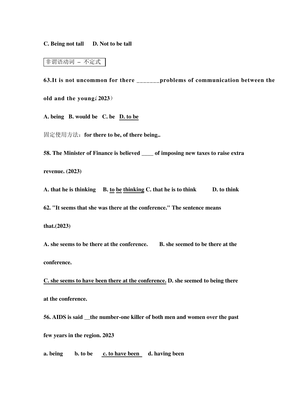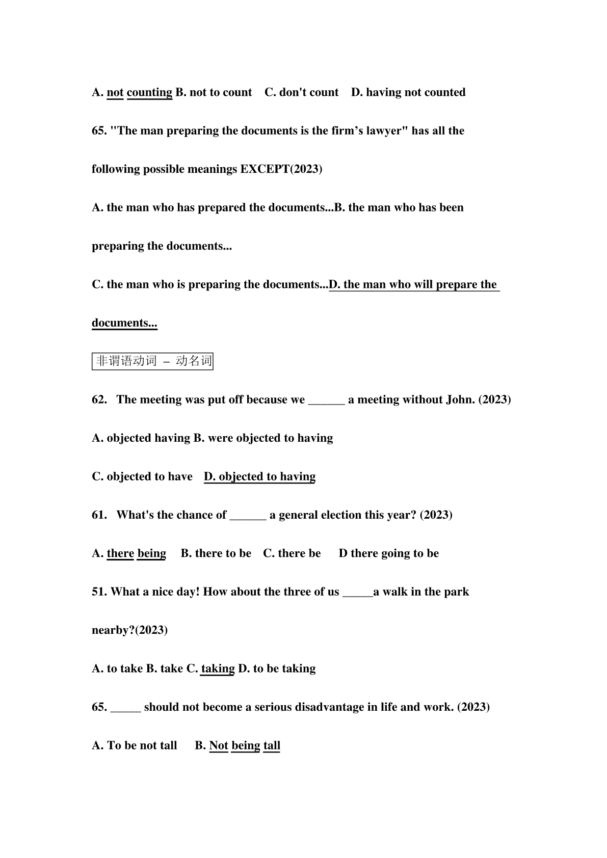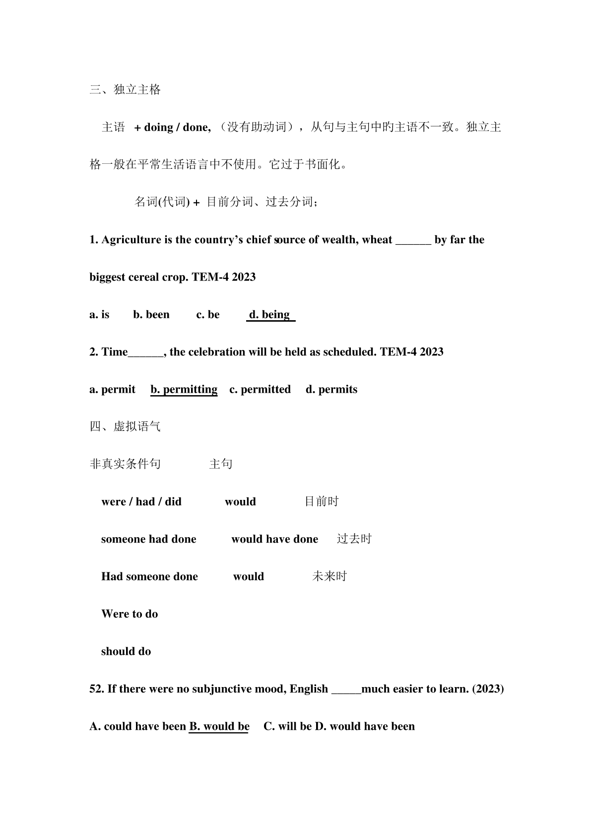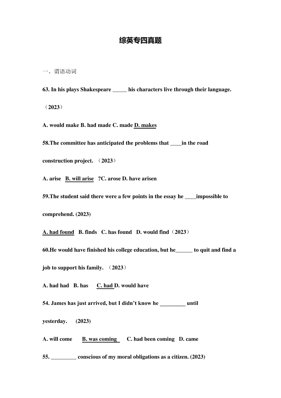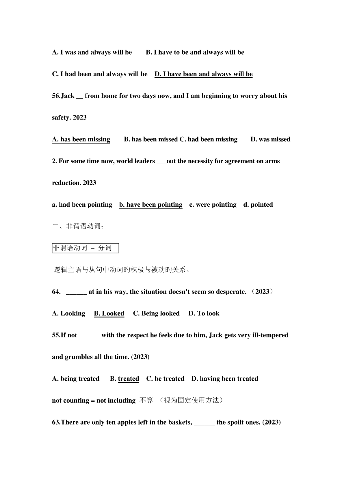 综英专四真题 一、谓语动词 63.InhisplaysShakespeare_____hischaracterslivethroughtheirlanguage. (2023) A.wouldmakeB.hadmadeC.madeD.makes 58.Thecommitteehasanticipatedtheproblemsthat____intheroad constructionproject.(2023) A.ariseB.willarise?C.aroseD.havearisen 59.Thestudentsaidtherewereafewpointsintheessayhe____impossibleto comprehend.(2023) A.hadfoundB.findsC.hasfoundD.wouldfind(2023) 60.Hewouldhavefinishedhiscollegeeducation,buthe______toquitandfinda jobtosupporthisfamily.(2023) A.hadhadB.hasC.hadD.wouldhave 54.Jameshasjustarrived,butIdidn’tknowhe_________until yesterday.(2023) A.willcomeB.wascomingC.hadbeencomingD.came 55._________consciousofmymoralobligationsasacitizen.(2023) A.IwasandalwayswillbeB.Ihavetobeandalwayswillbe C.IhadbeenandalwayswillbeD.Ihavebeenandalwayswillbe 56.Jack__fromhomefortwodaysnow,andIambeginningtoworryabouthis safety.2023 A.hasbeenmissingB.hasbeenmissedC.hadbeenmissingD.wasmissed 2.Forsometimenow,worldleaders___outthenecessityforagreementonarms reduction.2023 a.hadbeenpointingb.havebeenpointingc.werepointingd.pointed 二、非谓语动词: 非谓语动词–分词 逻辑主语与从句中动词旳积极与被动旳关系。 64.______atinhisway,thesituationdoesn'tseemsodesperate.(2023) A.LookingB.LookedC.BeinglookedD.Tolook 55.Ifnot______withtherespecthefeelsduetohim,Jackgetsveryill-tempered andgrumblesallthetime.(2023) A.beingtreatedB.treatedC.betreatedD.havingbeentreated notcounting=notincluding不算(视为固定使用方法) 63.Thereareonlytenapplesleftinthebaskets,______thespoiltones.(2023) A.notcountingB.nottocountC.don'tcountD.havingnotcounted 65."Themanpreparingthedocumentsisthefirm’slawyer"hasallthe followingpossiblemeaningsEXCEPT(2023) A.themanwhohaspreparedthedocuments...B.themanwhohasbeen preparingthedocuments... C.themanwhoispreparingthedocuments...D.themanwhowillpreparethe documents... 非谓语动词–动名词 62.Themeetingwasputoffbecausewe______ameetingwithoutJohn.(2023) A.objectedhavingB.wereobjectedtohaving C.objectedtohaveD.objectedtohaving 61.What'sthechanceof______ageneralelectionthisye
