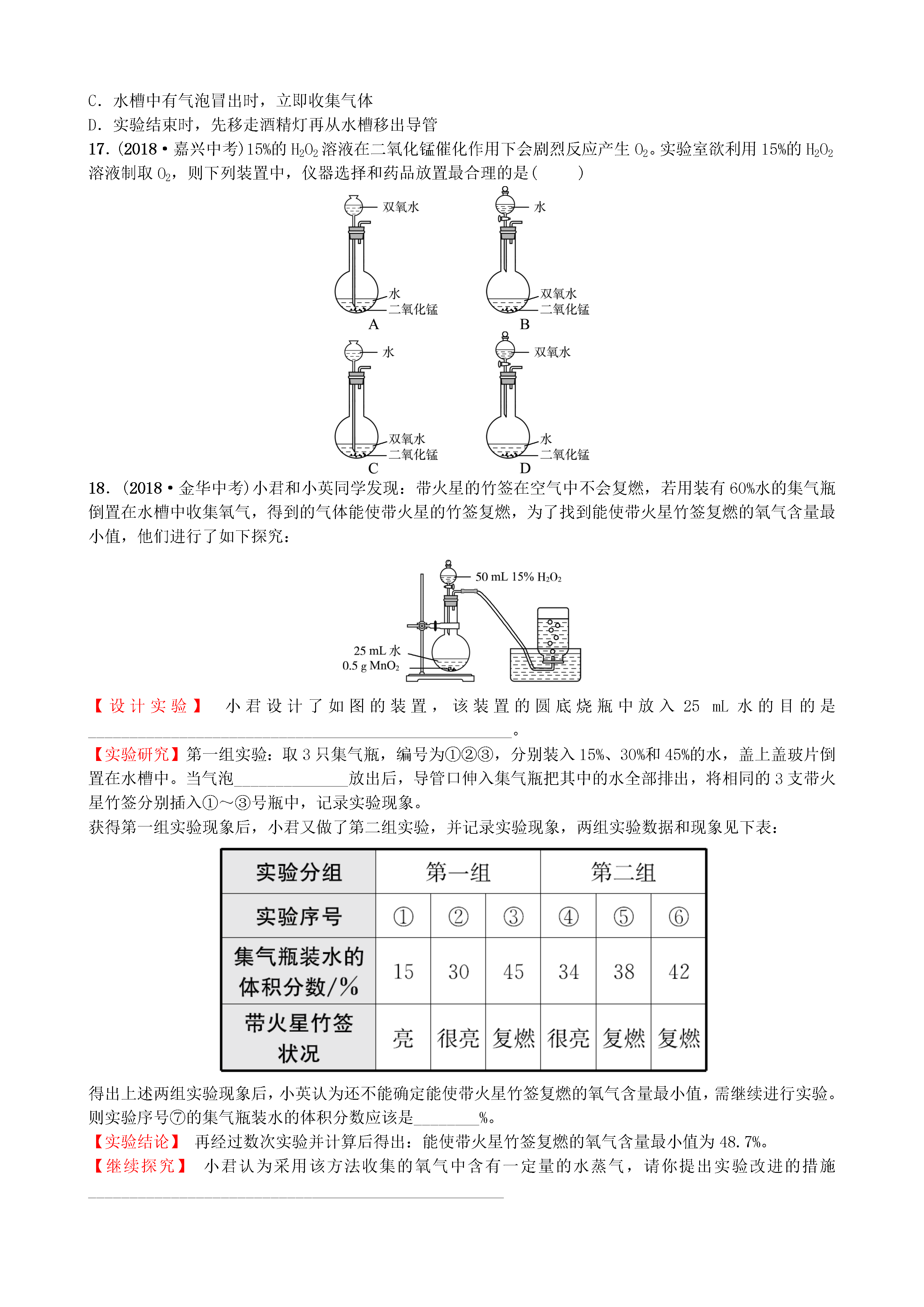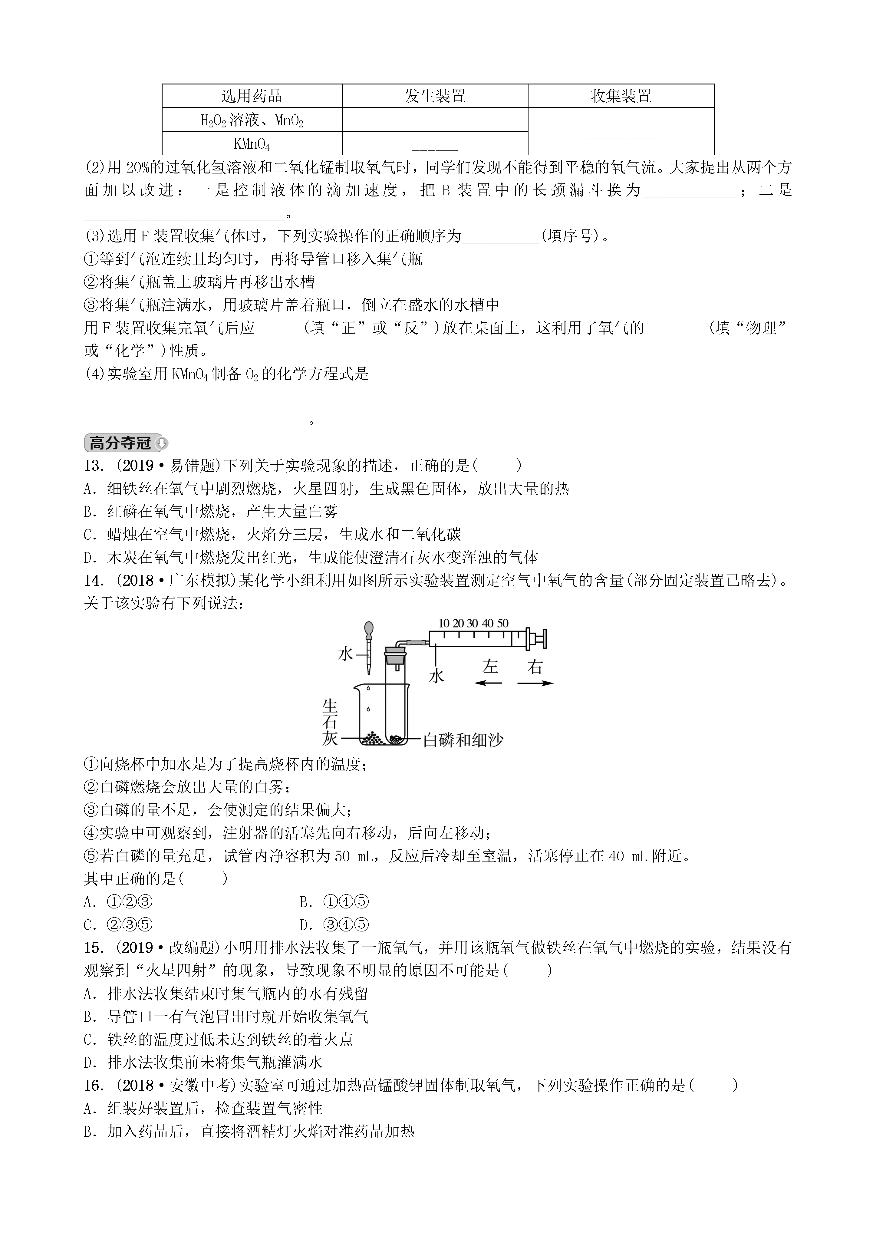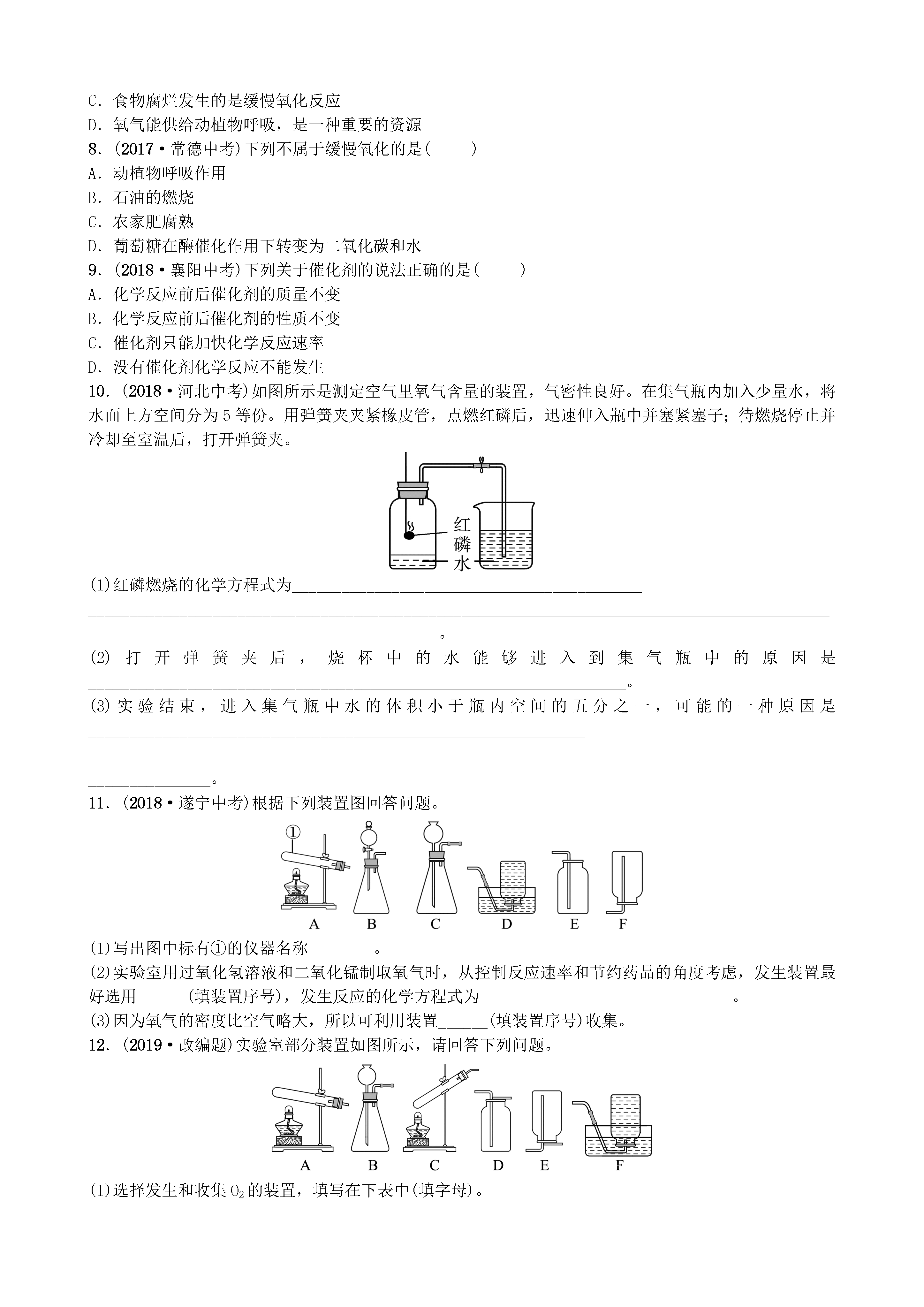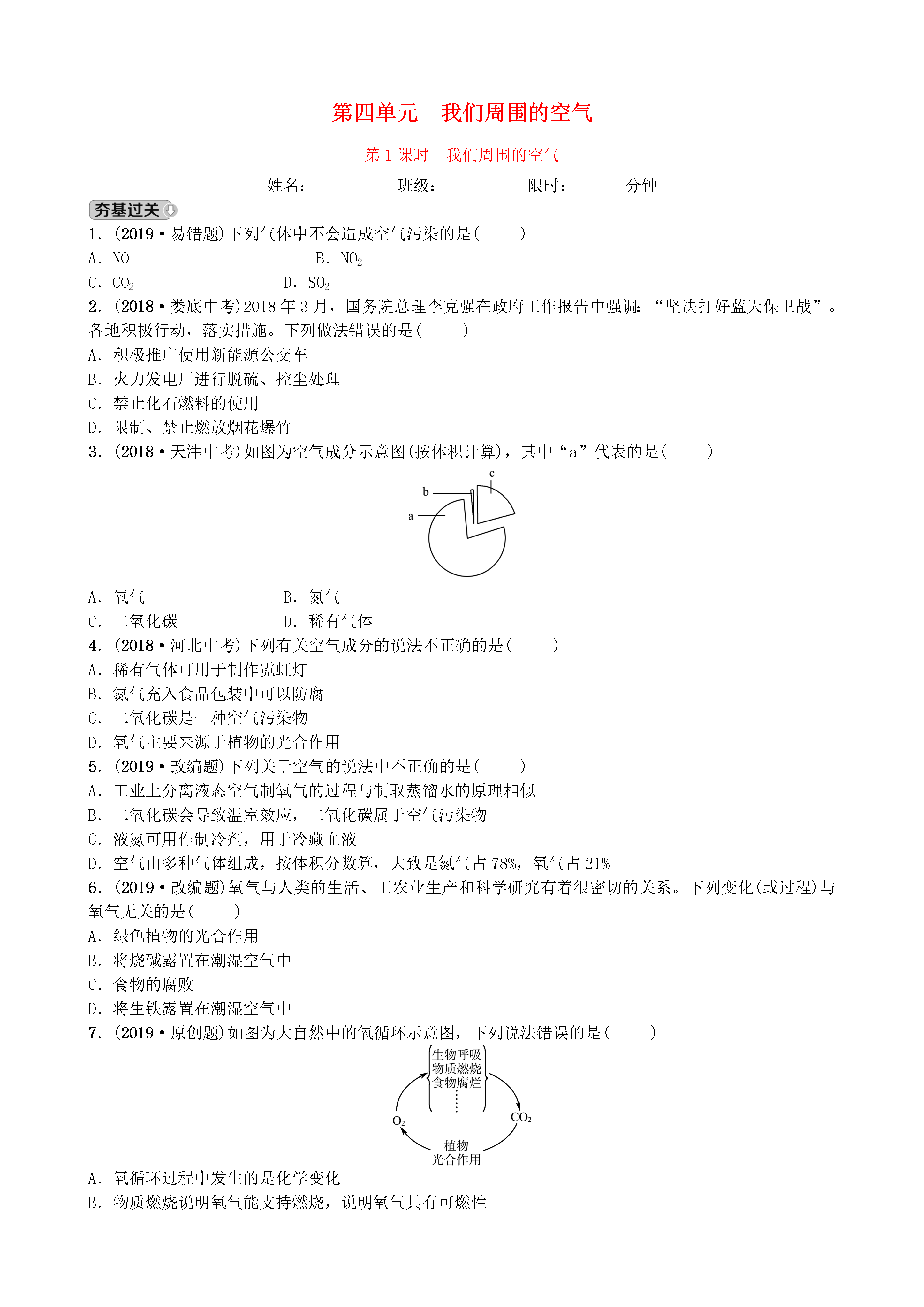 第四单元我们周围的空气第1课时我们周围的空气姓名:________班级:________限时:______分钟1.(2019·易错题)下列气体中不会造成空气污染的是()A.NOB.NO2C.CO2D.SO22.(2018·娄底中考)2018年3月,国务院总理李克强在政府工作报告中强调:“坚决打好蓝天保卫战”。各地积极行动,落实措施。下列做法错误的是()A.积极推广使用新能源公交车B.火力发电厂进行脱硫、控尘处理C.禁止化石燃料的使用D.限制、禁止燃放烟花爆竹3.(2018·天津中考)如图为空气成分示意图(按体积计算),其中“a”代表的是()A.氧气B.氮气C.二氧化碳D.稀有气体4.(2018·河北中考)下列有关空气成分的说法不正确的是()A.稀有气体可用于制作霓虹灯B.氮气充入食品包装中可以防腐C.二氧化碳是一种空气污染物D.氧气主要来源于植物的光合作用5.(2019·改编题)下列关于空气的说法中不正确的是()A.工业上分离液态空气制氧气的过程与制取蒸馏水的原理相似B.二氧化碳会导致温室效应,二氧化碳属于空气污染物C.液氮可用作制冷剂,用于冷藏血液D.空气由多种气体组成,按体积分数算,大致是氮气占78%,氧气占21%6.(2019·改编题)氧气与人类的生活、工农业生产和科学研究有着很密切的关系。下列变化(或过程)与氧气无关的是()A.绿色植物的光合作用B.将烧碱露置在潮湿空气中C.食物的腐败D.将生铁露置在潮湿空气中7.(2019·原创题)如图为大自然中的氧循环示意图,下列说法错误的是()A.氧循环过程中发生的是化学变化B.物质燃烧说明氧气能支持燃烧,说明氧气具有可燃性C.食物腐烂发生的是缓慢氧化反应D.氧气能供给动植物呼吸,是一种重要的资源8.(2017·常德中考)下列不属于缓慢氧化的是()A.动植物呼吸作用B.石油的燃烧C.农家肥腐熟D.葡萄糖在酶催化作用下转变为二氧化碳和水9.(2018·襄阳中考)下列关于催化剂的说法正确的是()A.化学反应前后催化剂的质量不变B.化学反应前后催化剂的性质不变C.催化剂只能加快化学反应速率D.没有催化剂化学反应不能发生10.(2018·河北中考)如图所示是测定空气里氧气含量的装置,气密性良好。在集气瓶内加入少量水,将水面上方空间分为5等份。用弹簧夹夹紧橡皮管,点燃红磷后,迅速伸入瓶中并塞紧塞子;待燃烧停止并冷却至室温后,打开弹簧夹。(1)红磷燃烧的化学方程式为_________________________________________________________________________________________________________________________________________________________________________________。(2)打开弹簧夹后,烧杯中的水能够进入到集气瓶中的原因是__________________________________________________________________。(3)实验结束,进入集气瓶中水的体积小于瓶内空间的五分之一,可能的一种原因是_______________________________________________________________________________________________________________________________________________________________________。11.(2018·遂宁中考)根据下列装置图回答问题。(1)写出图中标有①的仪器名称________。(2)实验室用过氧化氢溶液和二氧化锰制取氧气时,从控制反应速率和节约药品的角度考虑,发生装置最好选用______(填装置序号),发生反应的化学方程式为_______________________________。(3)因为氧气的密度比空气略大,所以可利用装置______(填装置序号)收集。12.(2019·改编题)实验室部分装置如图所示,请回答下列问题。(1)选择发生和收集O2的装置,填写在下表中(填字母)。选用药品发生装置收集装置H2O2溶液、MnO2_______________KMnO4______(2)用20%的过氧化氢溶液和二氧化锰制取氧气时,同学们发现不能得到平稳的氧气流。大家提出从两个方面加以改进:一是控制液体的滴加速度,把B装置中的长颈漏斗换为____________;二是__________________________。(3)选用F装置收集气体时