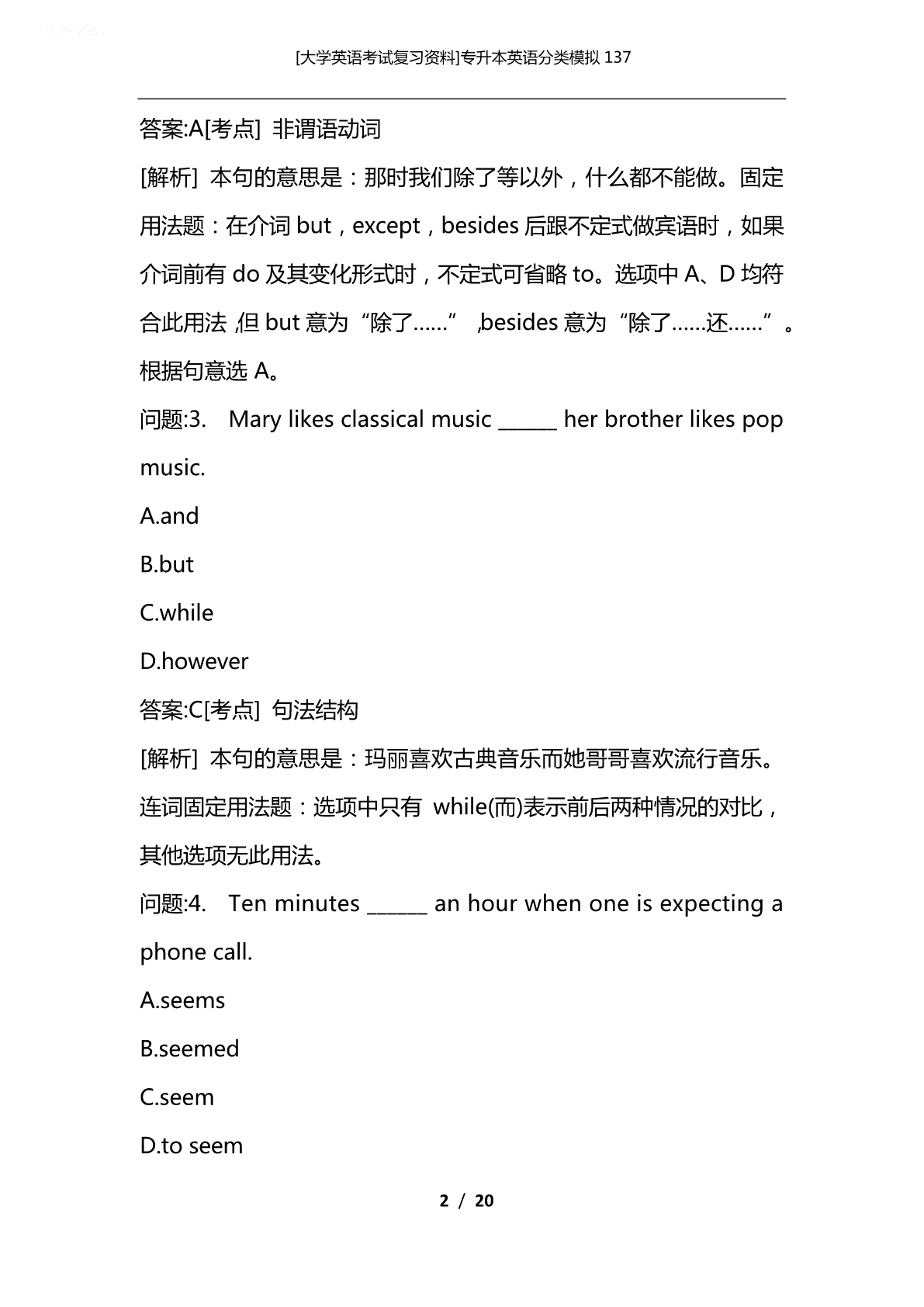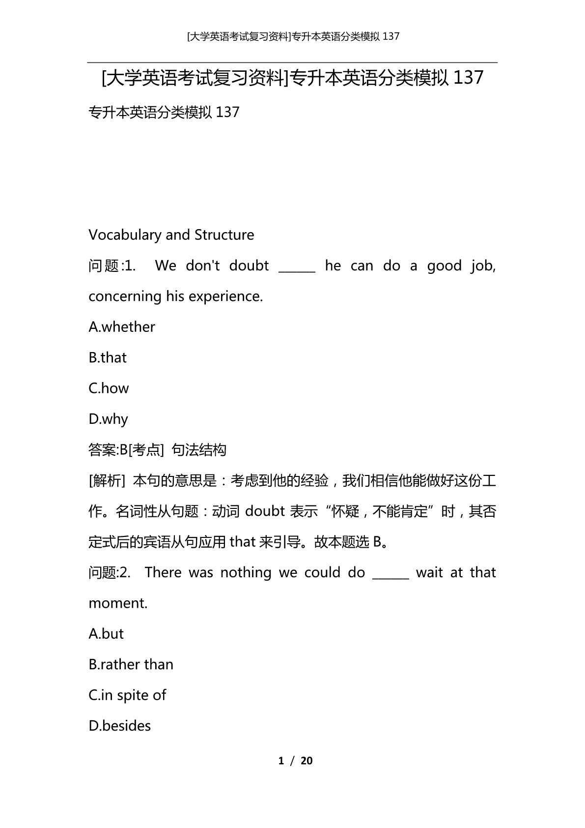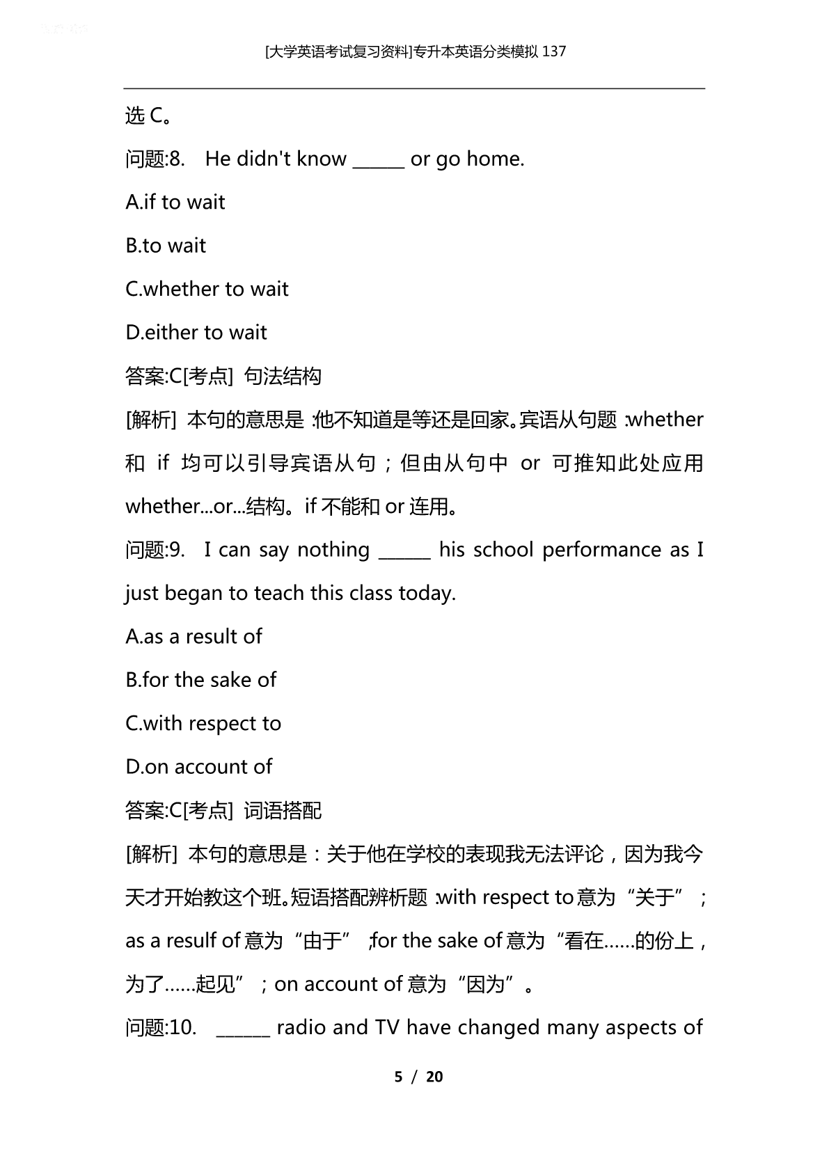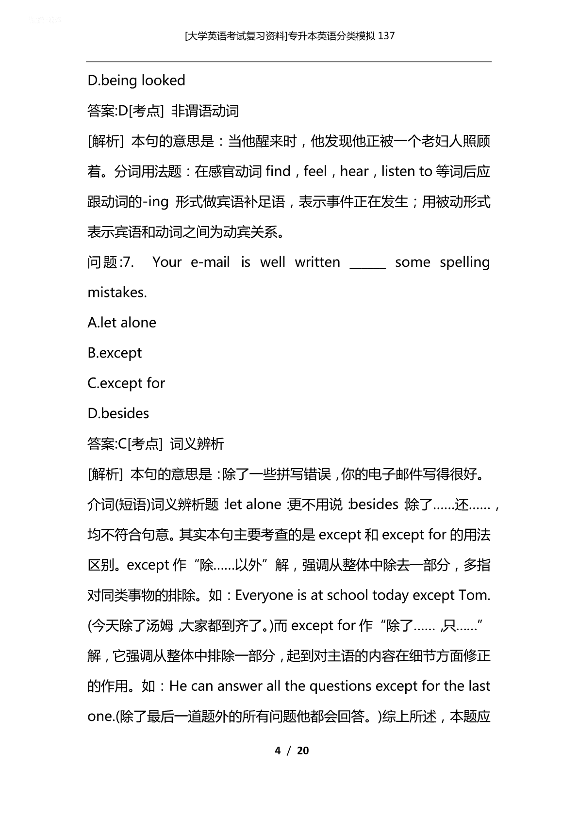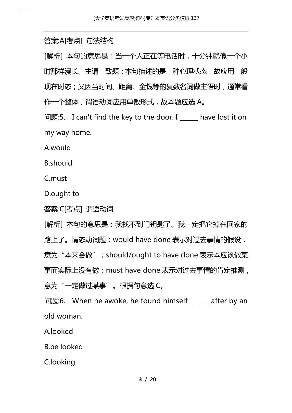 [大学英语考试复习资料]专升本英语分类模拟137 [大学英语考试复习资料]专升本英语分类模拟137 专升本英语分类模拟137 VocabularyandStructure 问题:1.Wedon'tdoubt______hecandoagoodjob, concerninghisexperience. A.whether B.that C.how D.why 答案:B[考点]句法结构 [解析]本句的意思是:考虑到他的经验,我们相信他能做好这份工 作。名词性从句题:动词doubt表示“怀疑,不能肯定”时,其否 定式后的宾语从句应用that来引导。故本题选B。 问题:2.Therewasnothingwecoulddo______waitatthat moment. A.but B.ratherthan C.inspiteof D.besides 1/20 [大学英语考试复习资料]专升本英语分类模拟137 答案:A[考点]非谓语动词 [解析]本句的意思是:那时我们除了等以外,什么都不能做。固定 用法题:在介词but,except,besides后跟不定式做宾语时,如果 介词前有do及其变化形式时,不定式可省略to。选项中A、D均符 合此用法,但but意为“除了……”,besides意为“除了……还……”。 根据句意选A。 问题:3.Marylikesclassicalmusic______herbrotherlikespop music. A.and B.but C.while D.however 答案:C[考点]句法结构 [解析]本句的意思是:玛丽喜欢古典音乐而她哥哥喜欢流行音乐。 连词固定用法题:选项中只有while(而)表示前后两种情况的对比, 其他选项无此用法。 问题:4.Tenminutes______anhourwhenoneisexpectinga phonecall. A.seems B.seemed C.seem D.toseem 2/20 [大学英语考试复习资料]专升本英语分类模拟137 答案:A[考点]句法结构 [解析]本句的意思是:当一个人正在等电话时,十分钟就像一个小 时那样漫长。主谓一致题:本句描述的是一种心理状态,故应用一般 现在时态;又因当时间、距离、金钱等的复数名词做主语时,通常看 作一个整体,谓语动词应用单数形式,故本题应选A。 问题:5.Ican'tfindthekeytothedoor.I______havelostiton mywayhome. A.would B.should C.must D.oughtto 答案:C[考点]谓语动词 [解析]本句的意思是:我找不到门钥匙了。我一定把它掉在回家的 路上了。情态动词题:wouldhavedone表示对过去事情的假设, 意为“本来会做”;should/oughttohavedone表示本应该做某 事而实际上没有做;musthavedone表示对过去事情的肯定推测, 意为“一定做过某事”。根据句意选C。 问题:6.Whenheawoke,hefoundhimself______afterbyan oldwoman. A.looked B.belooked C.looking 3/20 [大学英语考试复习资料]专升本英语分类模拟137 D.beinglooked 答案:D[考点]非谓语动词 [解析]本句的意思是:当他醒来时,他发现他正被一个老妇人照顾 着。分词用法题:在感官动词find,feel,hear,listento等词后应 跟动词的-ing形式做宾语补足语,表示事件正在发生;用被动形式 表示宾语和动词之间为动宾关系。 问题:7.Youre-mailiswellwritten______somespelling mistakes. A.letalone B.except C.exceptfor D.besides 答案:C[考点]词义辨析 [解析]本句的意思是:除了一些拼写错误,你的电子邮件写得很好。 介词(短语)词义辨析题:letalone:更不用说:besides:除了……还……, 均不符合句意。其实本句主要考查的是except和exceptfor的用法 区别。except作“除……以外”解,强调从整体中除去一部分,多指 对同类事物的排除。如:EveryoneisatschooltodayexceptTom. (今天除了汤姆,大家都到齐了。)而exceptfor作“除了……,只……” 解,它强调从整体中排除一部分,起