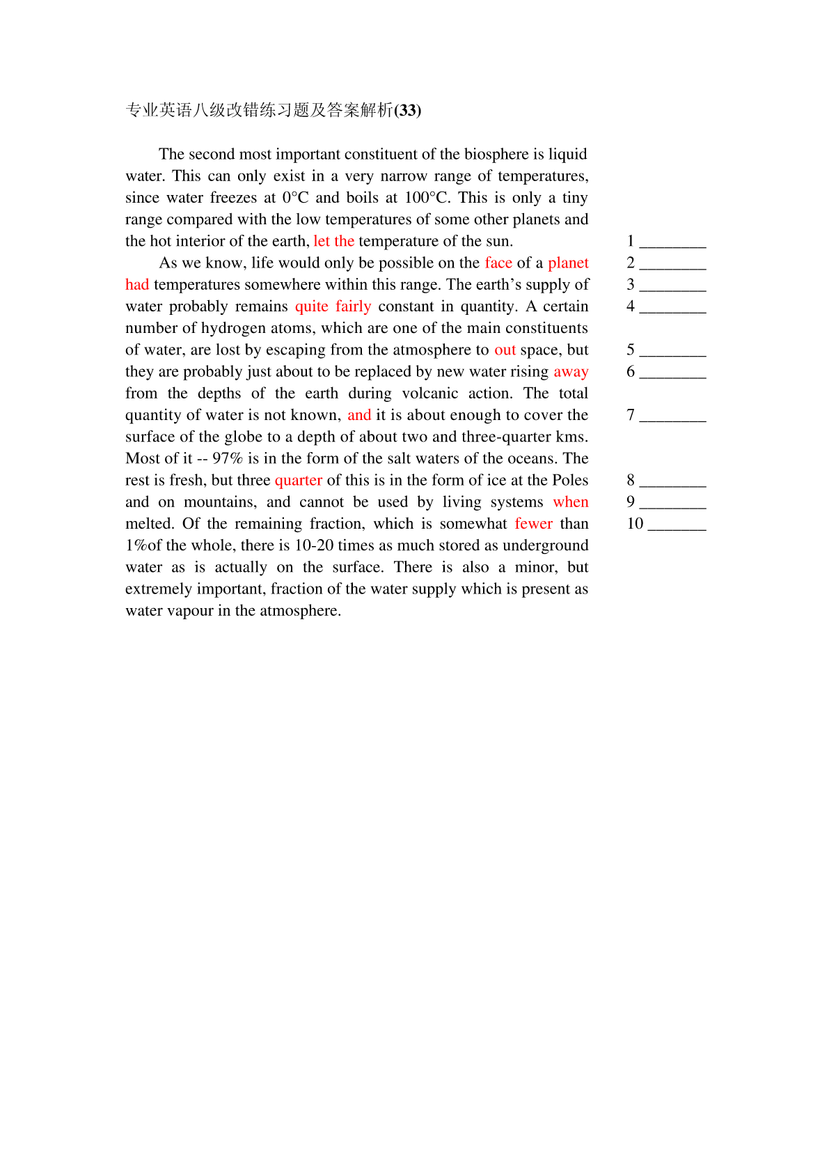 专业英语八级改错练习题及答案解析(33) Thesecondmostimportantconstituentofthebiosphereisliquid water.Thiscanonlyexistinaverynarrowrangeoftemperatures, sincewaterfreezesat0°Candboilsat100°C.Thisisonlyatiny rangecomparedwiththelowtemperaturesofsomeotherplanetsand thehotinterioroftheearth,letthetemperatureofthesun.1________ Asweknow,lifewouldonlybepossibleonthefaceofaplanet2________ hadtemperaturessomewherewithinthisrange.Theearth’ssupplyof3________ waterprobablyremainsquitefairlyconstantinquantity.Acertain4________ numberofhydrogenatoms,whichareoneofthemainconstituents ofwater,arelostbyescapingfromtheatmospheretooutspace,but5________ theyareprobablyjustabouttobereplacedbynewwaterrisingaway6________ fromthedepthsoftheearthduringvolcanicaction.Thetotal quantityofwaterisnotknown,anditisaboutenoughtocoverthe7________ surfaceoftheglobetoadepthofabouttwoandthree-quarterkms. Mostofit--97%isintheformofthesaltwatersoftheoceans.The restisfresh,butthreequarterofthisisintheformoficeatthePoles8________ andonmountains,andcannotbeusedbylivingsystemswhen9________ melted.Oftheremainingfraction,whichissomewhatfewerthan10_______ 1%ofthewhole,thereis10-20timesasmuchstoredasunderground waterasisactuallyonthesurface.Thereisalsoaminor,but extremelyimportant,fractionofthewatersupplywhichispresentas watervapourintheatmosphere. 参考答案及解析: 1.Let^the加入alone。Letalone意为“更不用说”,表示一种让步关系。 2.face-surface。根据上下文理解,应该指地球的表面。 3.planet^had加入which或that。这样使得planet后面的句子成为一个定语从句。 4.去掉fairly或quite。意思重复。 5.out改成outer。这里指外层空间。 6.去掉away。rise后面不接away。 7.and改成but。短文中这里是让步关系,而不是并列关系。 8.quarter改成quarters。英语表达中,当分子是二以上的数时,分母应为复数。 9.when改成until或者unless。根据上下文,这句话的意思应为:除非(冰雪) 融化,否则(地球上的)生命系统就无法利用水。所以when在这里的意思有误。 10.fewer改成less文中的remainingfraction仍指水,因此不能用fewer,要用less。