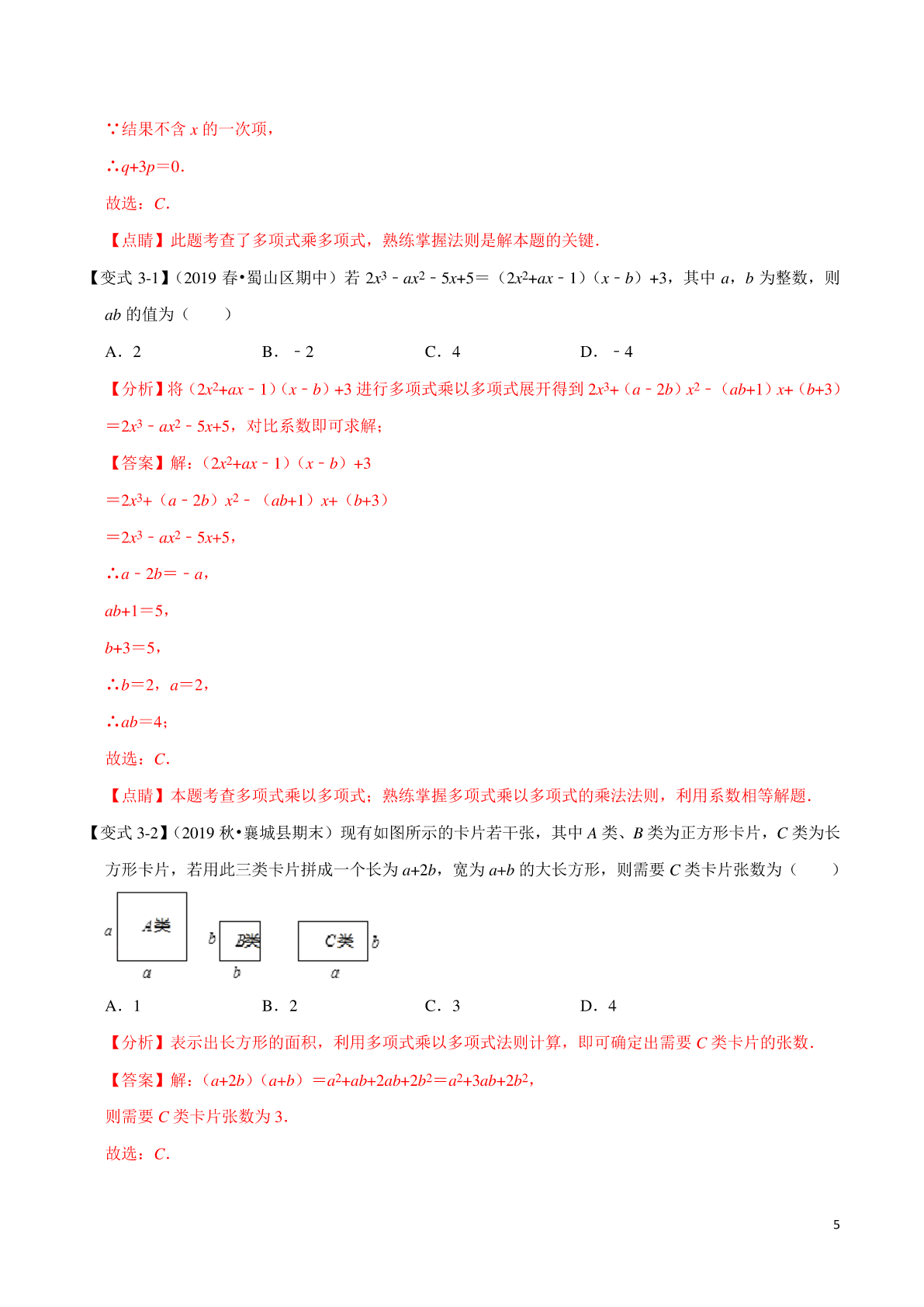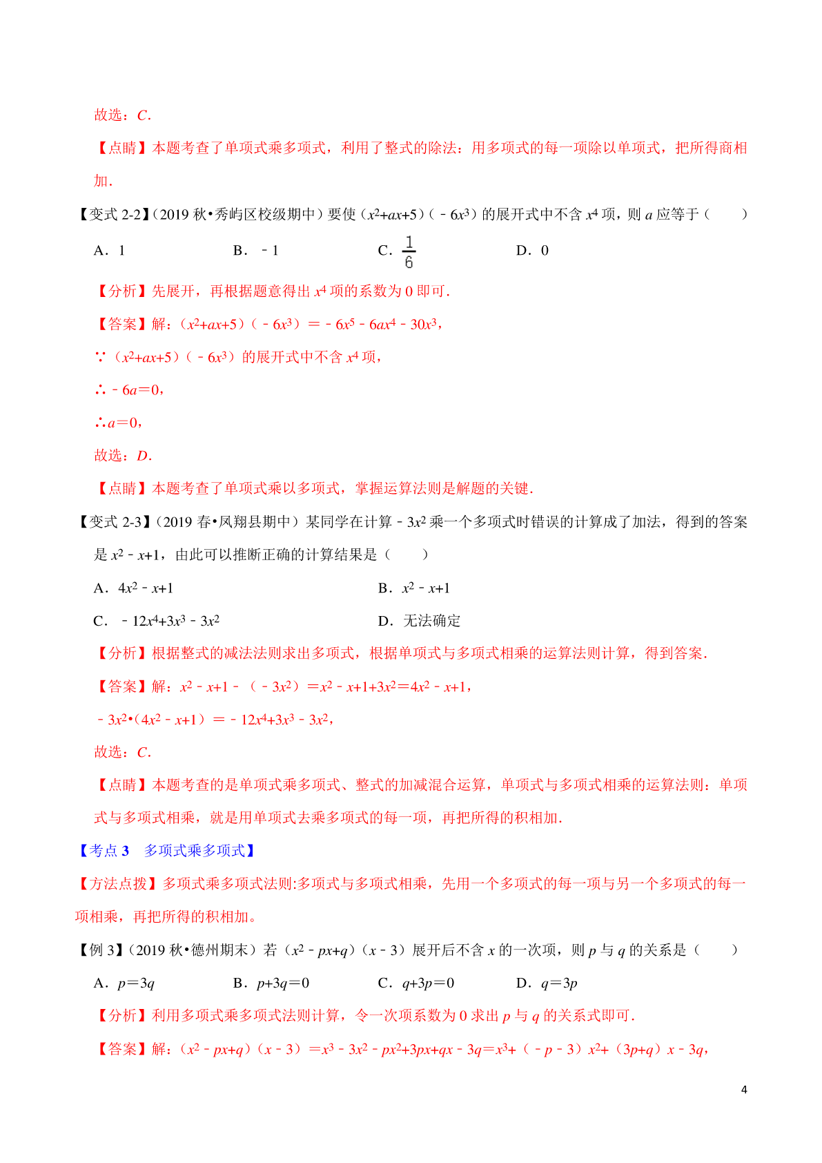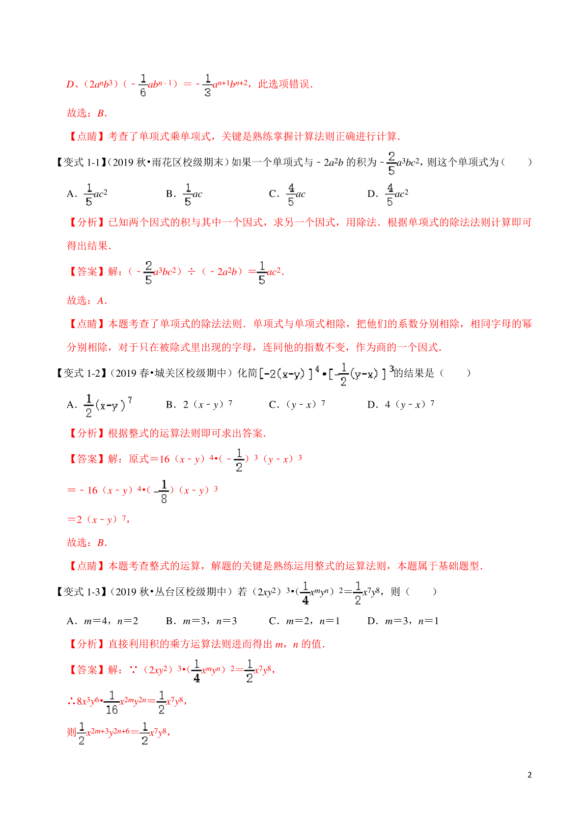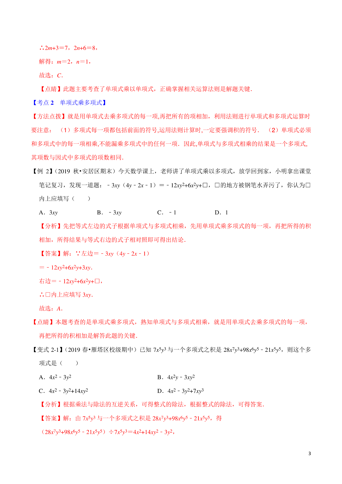 专题1.3整式乘法与因式分解章末重难点题型 【苏科版】 【考点1单项式乘单项式】 【方法点拨】单项式相乘,把它们的系数、相同字母分别相乘,对于只在一个单项式中只含有的字母,则连同它 的指数作为积的一个因式. 【例1】(2019秋•金牛区校级期中)下列各式中,计算正确的是() A.(﹣5an+1b)•(﹣2a)=10an+1b B.(﹣4a2b)•(﹣a2b2)•c C.(﹣3xy)•(﹣x2z)•6xy2=3x3y3z D. 【分析】单项式与单项式相乘,把它们的系数,相同字母分别相乘,对于只在一个单项式里含有的字母, 则连同它的指数作为积的一个因式. 【答案】解:A、(﹣5an+1b)•(﹣2a)=10an+2b,此选项错误; B、(﹣4a2b)•(﹣a2b2)•c,此选项正确; C、(﹣3xy)•(﹣x2z)•6xy2=18x4y3z,此选项错误; 1 D、(2anb3)(﹣abn﹣1)=﹣an+1bn+2,此选项错误. 故选:B. 【点睛】考查了单项式乘单项式,关键是熟练掌握计算法则正确进行计算. 【变式1-1】(2019秋•雨花区校级期末)如果一个单项式与﹣2a2b的积为﹣a3bc2,则这个单项式为() A.ac2B.acC.acD.ac2 【分析】已知两个因式的积与其中一个因式,求另一个因式,用除法.根据单项式的除法法则计算即可 得出结果. 【答案】解:(﹣a3bc2)÷(﹣2a2b)=ac2. 故选:A. 【点睛】本题考查了单项式的除法法则.单项式与单项式相除,把他们的系数分别相除,相同字母的幂 分别相除,对于只在被除式里出现的字母,连同他的指数不变,作为商的一个因式. 【变式1-2】(2019春•城关区校级期中)化简的结果是() A.B.2(x﹣y)7C.(y﹣x)7D.4(y﹣x)7 【分析】根据整式的运算法则即可求出答案. 【答案】解:原式=16(x﹣y)4•(﹣)3(y﹣x)3 =﹣16(x﹣y)4•()(x﹣y)3 =2(x﹣y)7, 故选:B. 【点睛】本题考查整式的运算,解题的关键是熟练运用整式的运算法则,本题属于基础题型. 【变式1-3】(2019秋•丛台区校级期中)若(2xy2)3•(xmyn)2=x7y8,则() A.m=4,n=2B.m=3,n=3C.m=2,n=1D.m=3,n=1 【分析】直接利用积的乘方运算法则进而得出m,n的值. 【答案】解:∵(2xy2)3•(xmyn)2=x7y8, ∴8x3y6•x2my2n=x7y8, 则x2m+3y2n+6=x7y8, 2 ∴2m+3=7,2n+6=8, 解得:m=2,n=1, 故选:C. 【点睛】此题主要考查了单项式乘以单项式,正确掌握相关运算法则是解题关键. 【考点2单项式乘多项式】 【方法点拨】就是用单项式去乘多项式的每一项,再把所有的项相加,利用法则进行单项式和多项式运算时 要注意:(1)多项式每一项都包括前面的符号,运用法则计算时,一定要强调积的符号.(2)单项式必须 和多项式中的每一项相乘,不能漏乘多项式中的任何一项.因此,单项式与多项式相乘的结果是一个多项式, 其项数与因式中多项式的项数相同. 【例2】(2019秋•安居区期末)今天数学课上,老师讲了单项式乘以多项式,放学回到家,小明拿出课堂 笔记复习,发现一道题:﹣3xy(4y﹣2x﹣1)=﹣12xy2+6x2y+□,□的地方被钢笔水弄污了,你认为□ 内上应填写() A.3xyB.﹣3xyC.﹣1D.1 【分析】先把等式左边的式子根据单项式与多项式相乘,先用单项式乘多项式的每一项,再把所得的积 相加,所得结果与等式右边的式子相对照即可得出结论. 【答案】解:∵左边=﹣3xy(4y﹣2x﹣1) =﹣12xy2+6x2y+3xy. 右边=﹣12xy2+6x2y+□, ∴□内上应填写3xy. 故选:A. 【点睛】本题考查的是单项式乘多项式,熟知单项式与多项式相乘,就是用单项式去乘多项式的每一项, 再把所得的积相加是解答此题的关键. 【变式2-1】(2019春•雁塔区校级期中)已知7x5y3与一个多项式之积是28x7y3+98x6y5﹣21x5y5,则这个多 项式是() A.4x2﹣3y2B.4x2y﹣3xy2 C.4x2﹣3y2+14xy2D.4x2﹣3y2+7xy3 【分析】根据乘法与除法的互逆关系,可得整式的除法,根据整式的除法,可得答案. 【答案】解:由7x5y3与一个多项式之积是28x7y3+98x6y5﹣21x5y5,得 (28x7y3+98x6y5﹣21x5y5)÷7x5y3=4x2+14xy2﹣3y2,