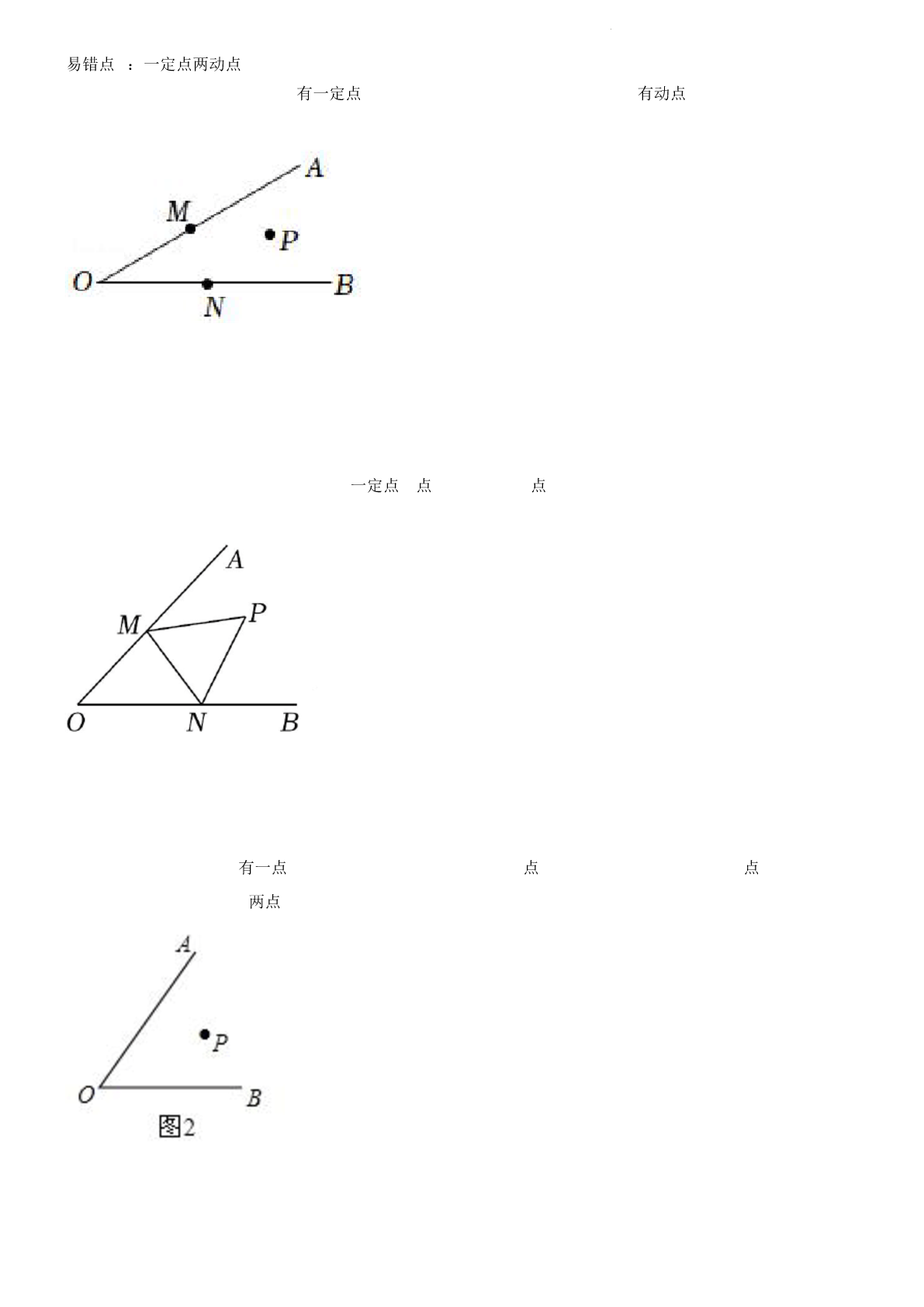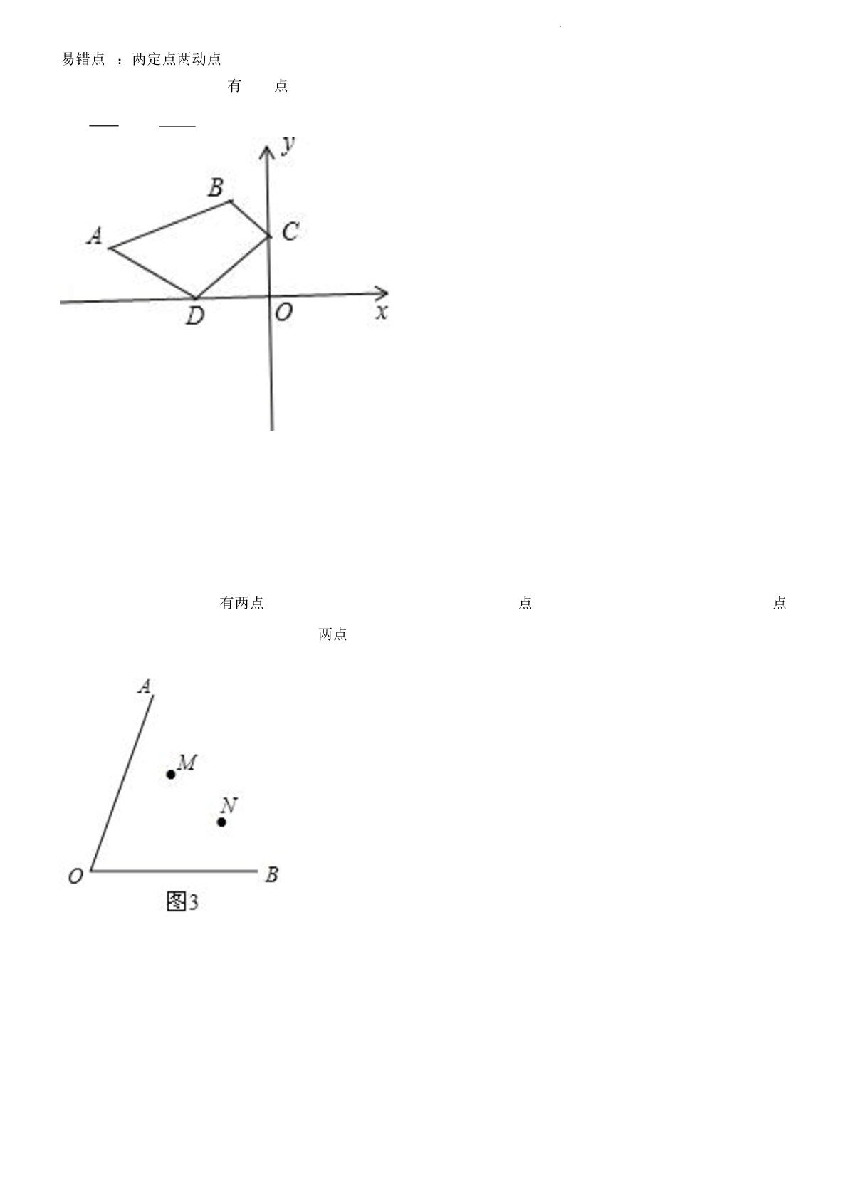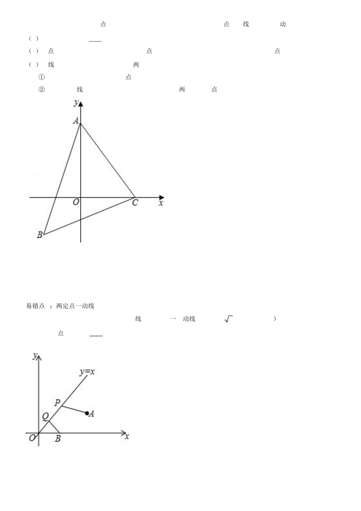 一次函数与将军饮马问题 第一部分:知识点 模型整理(求最小值) 第二部分:易错题突破 易错点1:两定点一动点 2 1.如图,直线yx4与x轴、y轴分别交于点A和点B,点C、D分别为线段AB、OB的中点,点P为OA 3 上一动点,PCPD值最小时点P的坐标为. 1 2.如图,在直角坐标系中有线段AB,AB50,A、B到x轴的距离分别为10和40,B点到y轴的距离为30. (1)求点A的坐标; (2)在x轴上有一动点P,当PAB的周长最短时,求这个周长的最小值. 3.如图1,在AB直线一侧C、D两点,在AB上找一点P,使C、D、P三点组成的三角形的周长最短,找出 此点并说明理由. 2 4.如图,已知ABC三个顶点坐标分别为A(0,4),B(2,2),C(3,0),点P在线段AC上移动. (1)ABC的面积为. (2)当点P坐标为(1,m)时,请在y轴上找点Q,使PQC周长最小,画出图形并求出Q点坐标和PQC周长. (3)直线BP将ABC的面积分成1:n两部分. ①分别求出当n1,n2时P点坐标. ②直接写出直线BP将ABC的面积分成1:n(n2)两部分时P点坐标. 易错点2:两定点一动线 1.如图,已知A(3,1),B(1,0),PQ是直线yx上的一条动线段且PQ2(Q在P的下方),当APPQQB取 最小值时,点Q坐标为. 3 易错点3:一定点两动点 1.如图,AOB30,AOB内有一定点P,且OP15,若在OA、OB上分别有动点M、N,则PMN周长 的最小值是() A.5B.15C.20D.30 2.如图,若AOB44,P为AOB内一定点,点M在OA上,点N在OB上,当PMN的周长取最小值时, MPN的度数为() A.82B.84C.88D.92 3.如图2,在AOB内部有一点P,是否在OA、OB上分别存在点E、F,使得E、F、P三点组成的三角形 的周长最短,找出E、F两点,并说明理由. 4 易错点4:两定点两动点 1.如图,在直角坐标系中有四个点A(6,3),B(2,5),C(0,m),D(n,0),当四边形ABCD周长最短时,则 m,n. 2.如图3,在AOB内部有两点M、N,是否在OA、OB上分别存在点E、F,使得E、F、M、N,四点 组成的四边形的周长最短,找出E、F两点,并说明理由. 5 易错点5:差值最小 1.如图,在平面直角坐标系中,一次函数ykxb(kb0,b0)的图象分别与x轴、y轴和直线x4相交于A、 B、C三点,直线x4与x轴交于点D,四边形OBCD(O是坐标原点)的面积是8,若点B的纵坐标是1. (1)求这个一次函数解析式; (2)E为直线CD上的一点当BCE是以BC为腰的等腰三角形时,求出点E的坐标; (3)若点M在x轴上运动,当M运动到某个位置时,|MBMC|最小,试求出此时点M的坐标; (4)若点G在直线CD上,点H在直线AB上,试问:在(3)条件下,是否存在某个合适的位置,使得MGGH 取得最小值?如果存在请直接写出这个最小值和此时点H的坐标;如果不存在请说明理由. 6