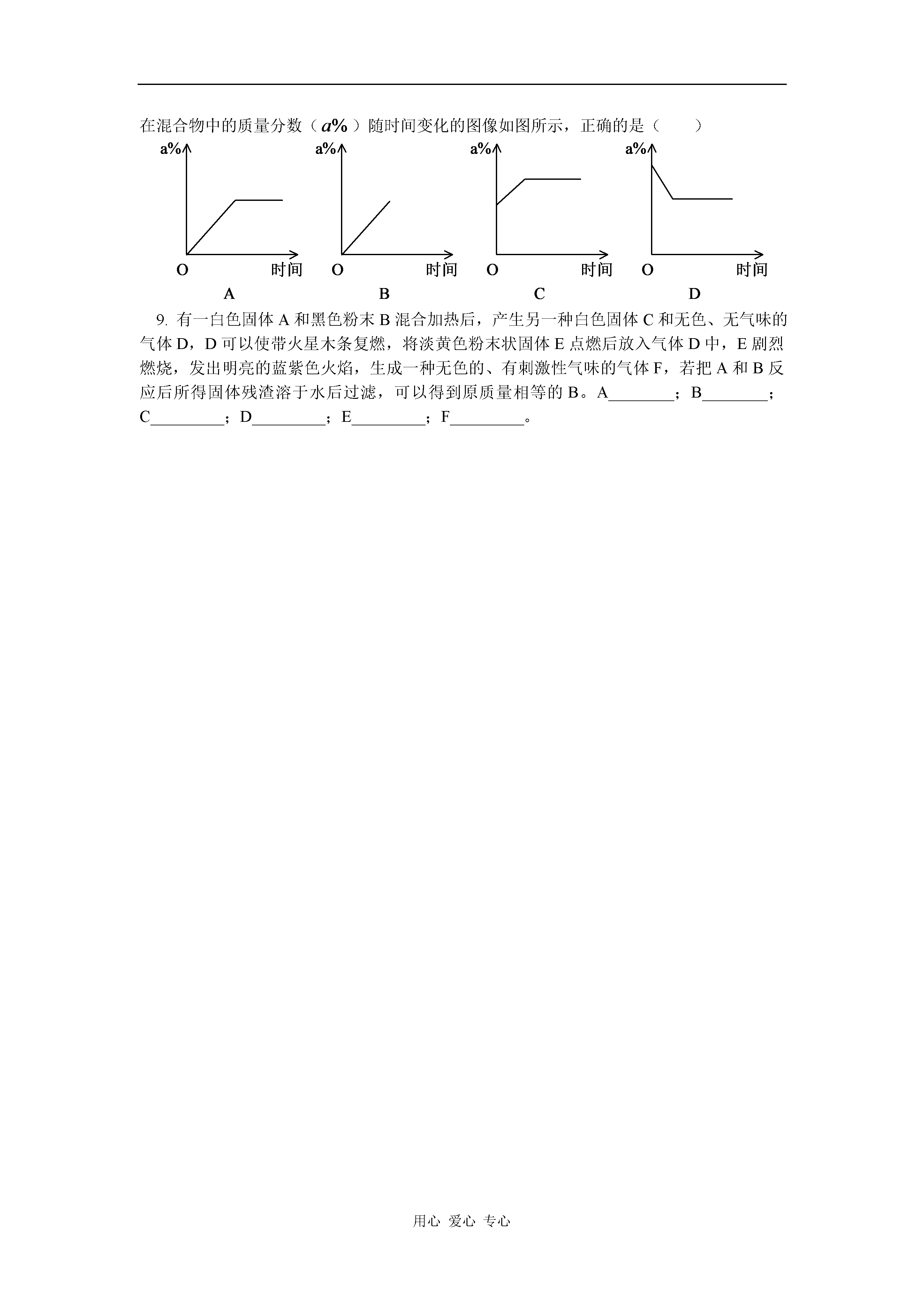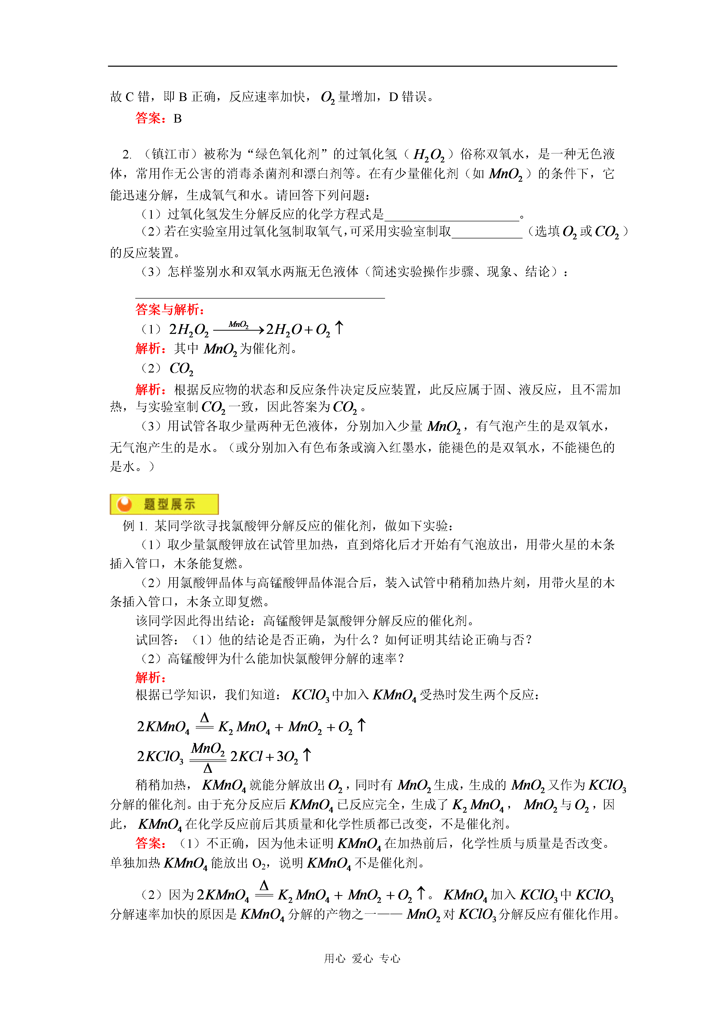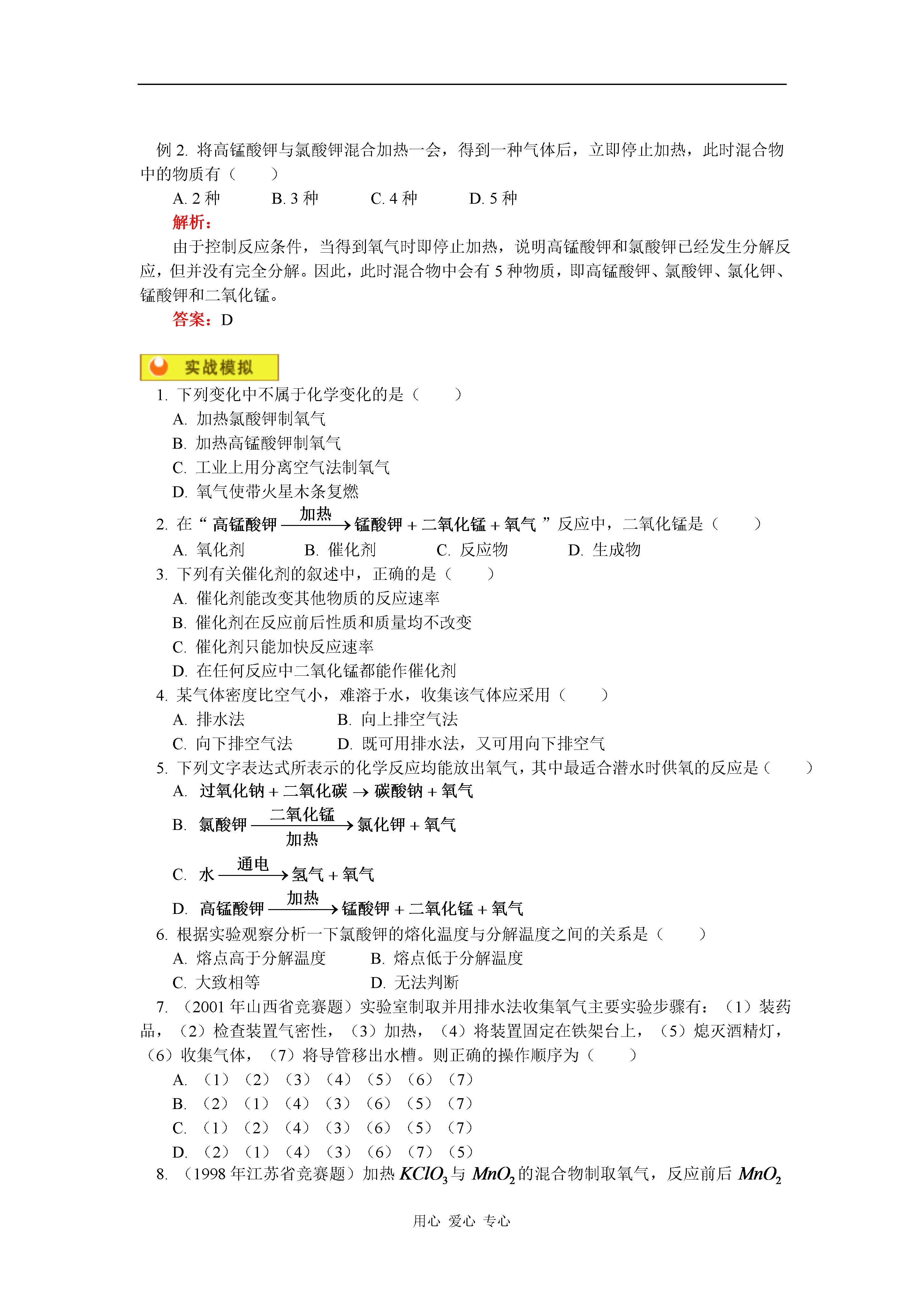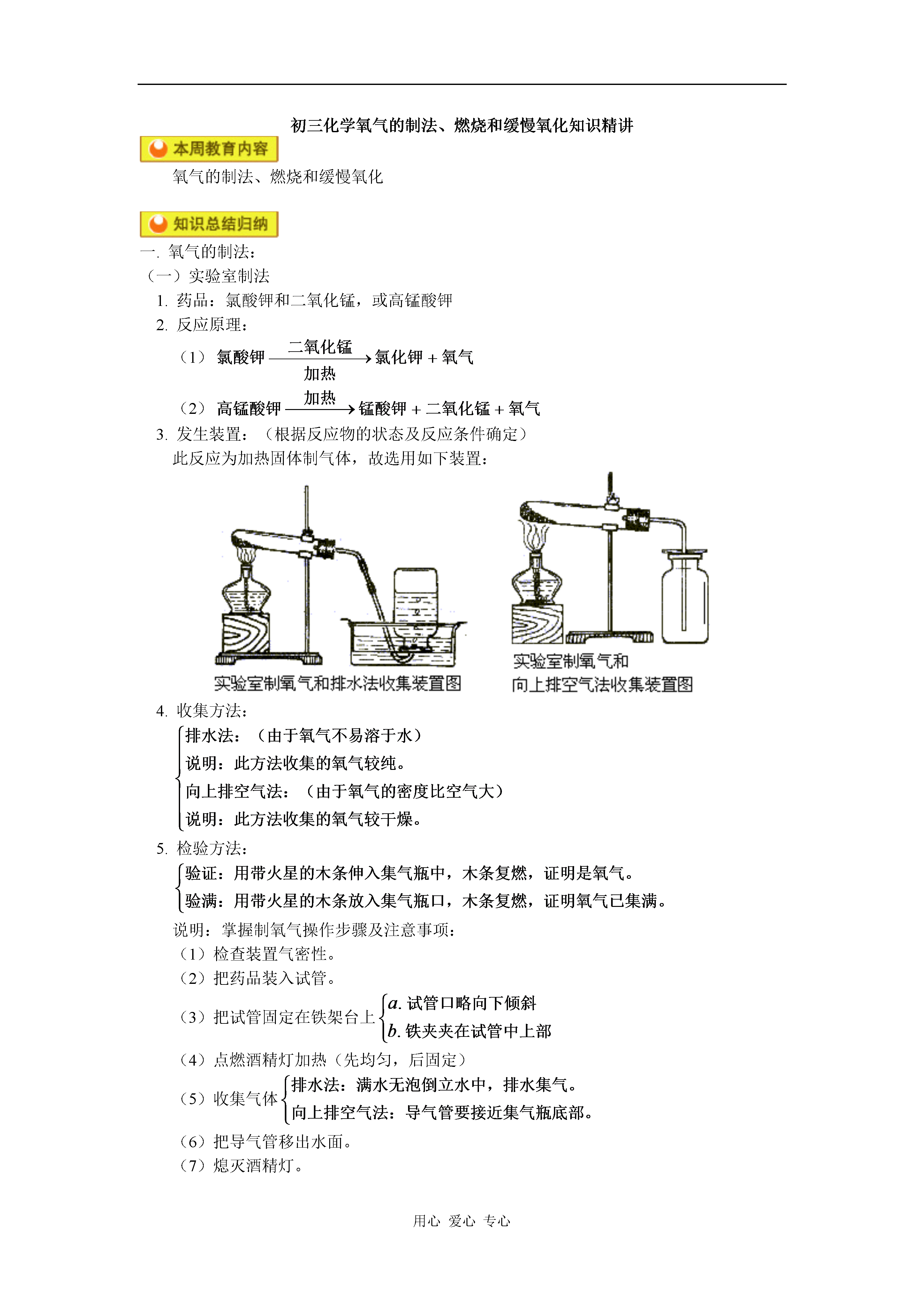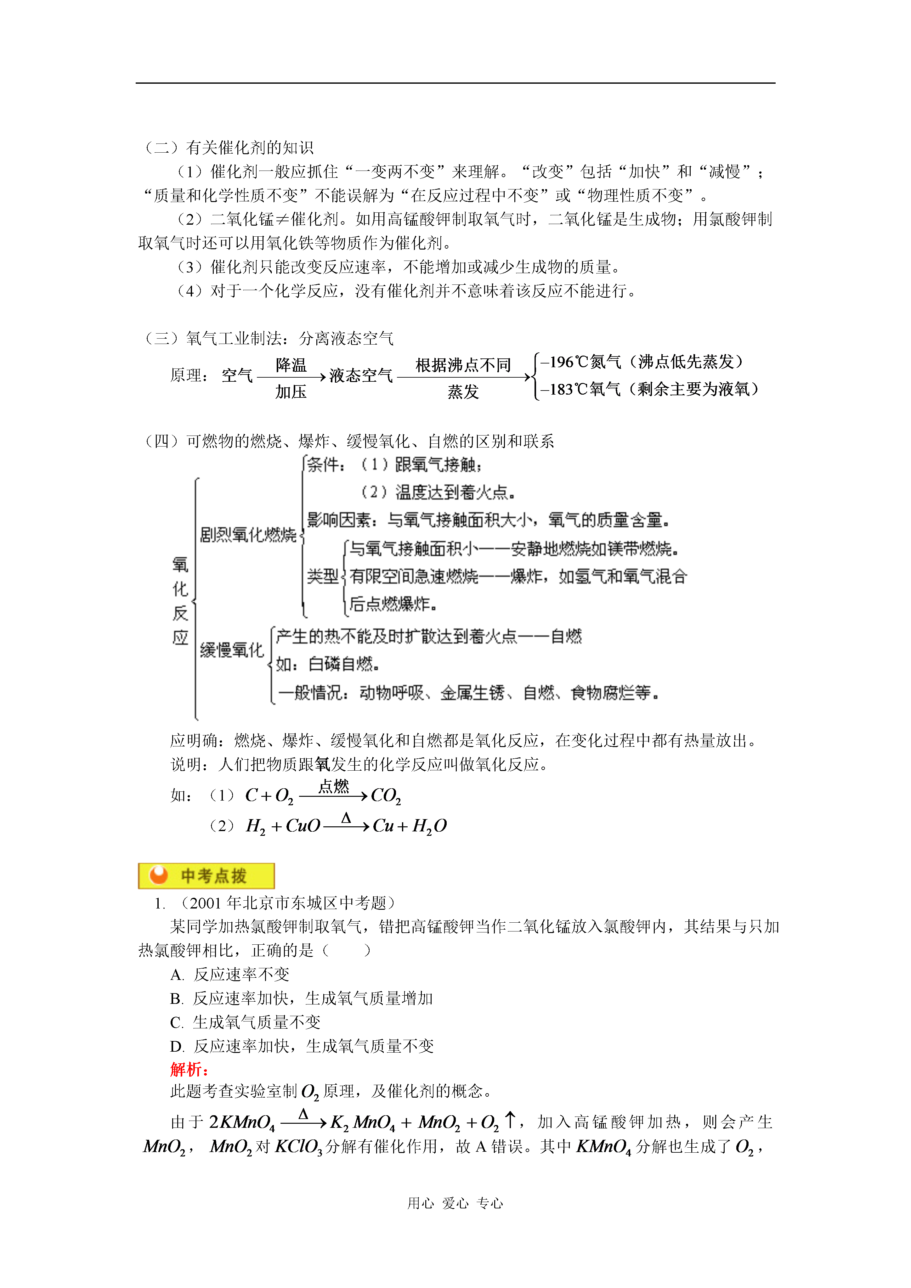 用心爱心专心初三化学氧气的制法、燃烧和缓慢氧化知识精讲氧气的制法、燃烧和缓慢氧化一.氧气的制法:(一)实验室制法1.药品:氯酸钾和二氧化锰,或高锰酸钾2.反应原理:(1)(2)3.发生装置:(根据反应物的状态及反应条件确定)此反应为加热固体制气体,故选用如下装置:4.收集方法:5.检验方法:说明:掌握制氧气操作步骤及注意事项:(1)检查装置气密性。(2)把药品装入试管。(3)把试管固定在铁架台上(4)点燃酒精灯加热(先均匀,后固定)(5)收集气体(6)把导气管移出水面。(7)熄灭酒精灯。(二)有关催化剂的知识(1)催化剂一般应抓住“一变两不变”来理解。“改变”包括“加快”和“减慢”;“质量和化学性质不变”不能误解为“在反应过程中不变”或“物理性质不变”。(2)二氧化锰≠催化剂。如用高锰酸钾制取氧气时,二氧化锰是生成物;用氯酸钾制取氧气时还可以用氧化铁等物质作为催化剂。(3)催化剂只能改变反应速率,不能增加或减少生成物的质量。(4)对于一个化学反应,没有催化剂并不意味着该反应不能进行。(三)氧气工业制法:分离液态空气原理:(四)可燃物的燃烧、爆炸、缓慢氧化、自燃的区别和联系应明确:燃烧、爆炸、缓慢氧化和自燃都是氧化反应,在变化过程中都有热量放出。说明:人们把物质跟氧发生的化学反应叫做氧化反应。如:(1)(2)1.(2001年北京市东城区中考题)某同学加热氯酸钾制取氧气,错把高锰酸钾当作二氧化锰放入氯酸钾内,其结果与只加热氯酸钾相比,正确的是()A.反应速率不变B.反应速率加快,生成氧气质量增加C.生成氧气质量不变D.反应速率加快,生成氧气质量不变解析:此题考查实验室制原理,及催化剂的概念。由于,加入高锰酸钾加热,则会产生,对分解有催化作用,故A错误。其中分解也生成了,故C错,即B正确,反应速率加快,量增加,D错误。答案:B2.(镇江市)被称为“绿色氧化剂”的过氧化氢()俗称双氧水,是一种无色液体,常用作无公害的消毒杀菌剂和漂白剂等。在有少量催化剂(如)的条件下,它能迅速分解,生成氧气和水。请回答下列问题:(1)过氧化氢发生分解反应的化学方程式是_____________________。(2)若在实验室用过氧化氢制取氧气,可采用实验室制取___________(选填或)的反应装置。(3)怎样鉴别水和双氧水两瓶无色液体(简述实验操作步骤、现象、结论):_______________________________________答案与解析:(1)解析:其中为催化剂。(2)解析:根据反应物的状态和反应条件决定反应装置,此反应属于固、液反应,且不需加热,与实验室制一致,因此答案为。(3)用试管各取少量两种无色液体,分别加入少量,有气泡产生的是双氧水,无气泡产生的是水。(或分别加入有色布条或滴入红墨水,能褪色的是双氧水,不能褪色的是水。)例1.某同学欲寻找氯酸钾分解反应的催化剂,做如下实验:(1)取少量氯酸钾放在试管里加热,直到熔化后才开始有气泡放出,用带火星的木条插入管口,木条能复燃。(2)用氯酸钾晶体与高锰酸钾晶体混合后,装入试管中稍稍加热片刻,用带火星的木条插入管口,木条立即复燃。该同学因此得出结论:高锰酸钾是氯酸钾分解反应的催化剂。试回答:(1)他的结论是否正确,为什么?如何证明其结论正确与否?(2)高锰酸钾为什么能加快氯酸钾分解的速率?解析:根据已学知识,我们知道:中加入受热时发生两个反应:稍稍加热,就能分解放出,同时有生成,生成的又作为分解的催化剂。由于充分反应后已反应完全,生成了,与,因此,在化学反应前后其质量和化学性质都已改变,不是催化剂。答案:(1)不正确,因为他未证明在加热前后,化学性质与质量是否改变。单独加热能放出O2,说明不是催化剂。(2)因为。加入中分解速率加快的原因是分解的产物之一——对分解反应有催化作用。例2.将高锰酸钾与氯酸钾混合加热一会,得到一种气体后,立即停止加热,此时混合物中的物质有()A.2种B.3种C.4种D.5种解析:由于控制反应条件,当得到氧气时即停止加热,说明高锰酸钾和氯酸钾已经发生分解反应,但并没有完全分解。因此,此时混合物中会有5种物质,即高锰酸钾、氯酸钾、氯化钾、锰酸钾和二氧化锰。答案:D1.下列变化中不属于化学变化的是()A.加热氯酸钾制氧气B.加热高锰酸钾制氧气C.工业上用分离空气法制氧气D.氧气使带火星木条复燃2.在“”反应中,二氧化锰是()A.氧化剂B.催化剂C.反应物D.生成物3.下列有关催化剂的叙述中,正确的是()A.催化剂能改变其他物质的反应速率B.催化剂在反应前后
