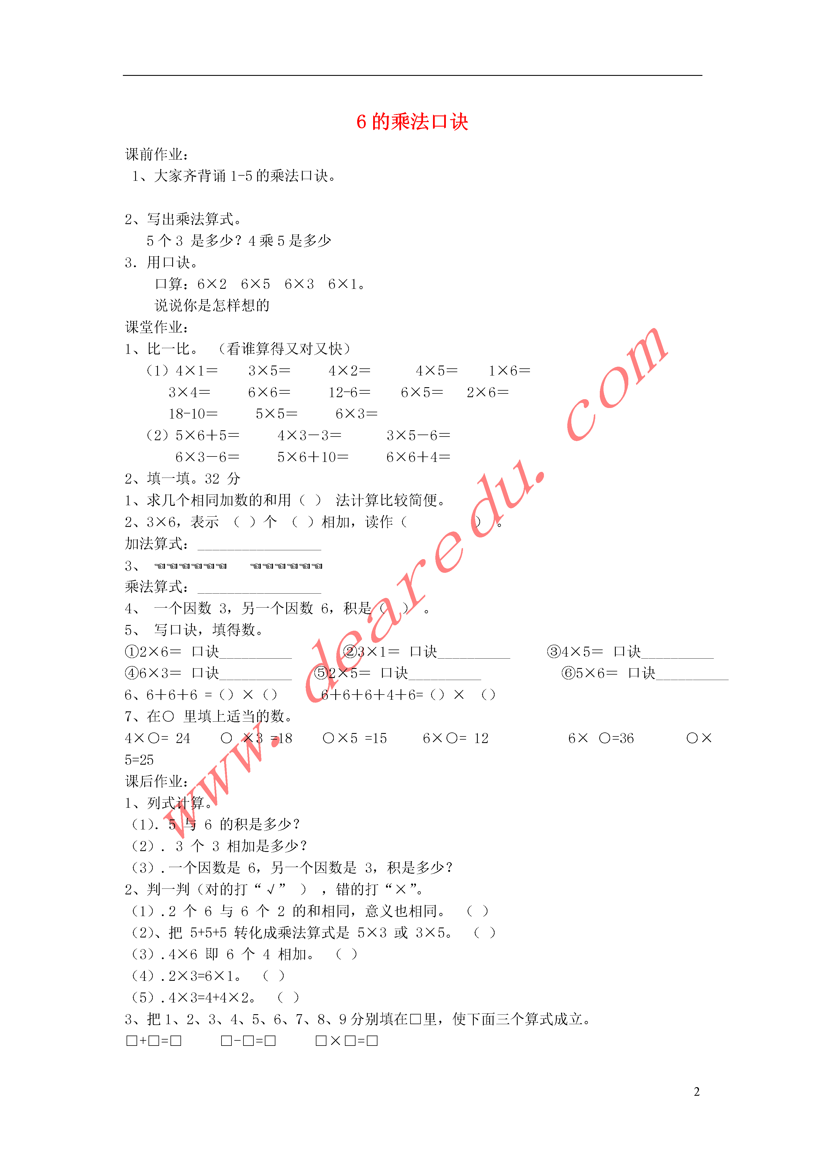 26的乘法口诀课前作业:1、大家齐背诵1-5的乘法口诀。2、写出乘法算式。5个3是多少?4乘5是多少3.用口诀。口算:6×26×56×36×1。说说你是怎样想的课堂作业:比一比。(看谁算得又对又快)(1)4×1=3×5=4×2=4×5=1×6=3×4=6×6=12-6=6×5=2×6=18-10=5×5=6×3=(2)5×6+5=4×3-3=3×5-6=6×3-6=5×6+10=6×6+4=2、填一填。32分1、求几个相同加数的和用()法计算比较简便。2、3×6,表示()个()相加,读作()。加法算式:_________________☜☜☜☜☜☜☜☜☜☜☜☜乘法算式:_________________一个因数3,另一个因数6,积是()。写口诀,填得数。①2×6=口诀__________②3×1=口诀__________③4×5=口诀__________④6×3=口诀__________⑤2×5=口诀__________⑥5×6=口诀__________6、6+6+6=()×()6+6+6+4+6=()×()在○里填上适当的数。4×○=24○×3=18○×5=156×○=126×○=36○×5=25课后作业:1、列式计算。(1).5与6的积是多少?(2).3个3相加是多少?(3).一个因数是6,另一个因数是3,积是多少?2、判一判(对的打“√”),错的打“×”。(1).2个6与6个2的和相同,意义也相同。()(2)、把5+5+5转化成乘法算式是5×3或3×5。()(3).4×6即6个4相加。()(4).2×3=6×1。()(5).4×3=4+4×2。()3、把1、2、3、4、5、6、7、8、9分别填在□里,使下面三个算式成立。□+□=□□-□=□□×□=□