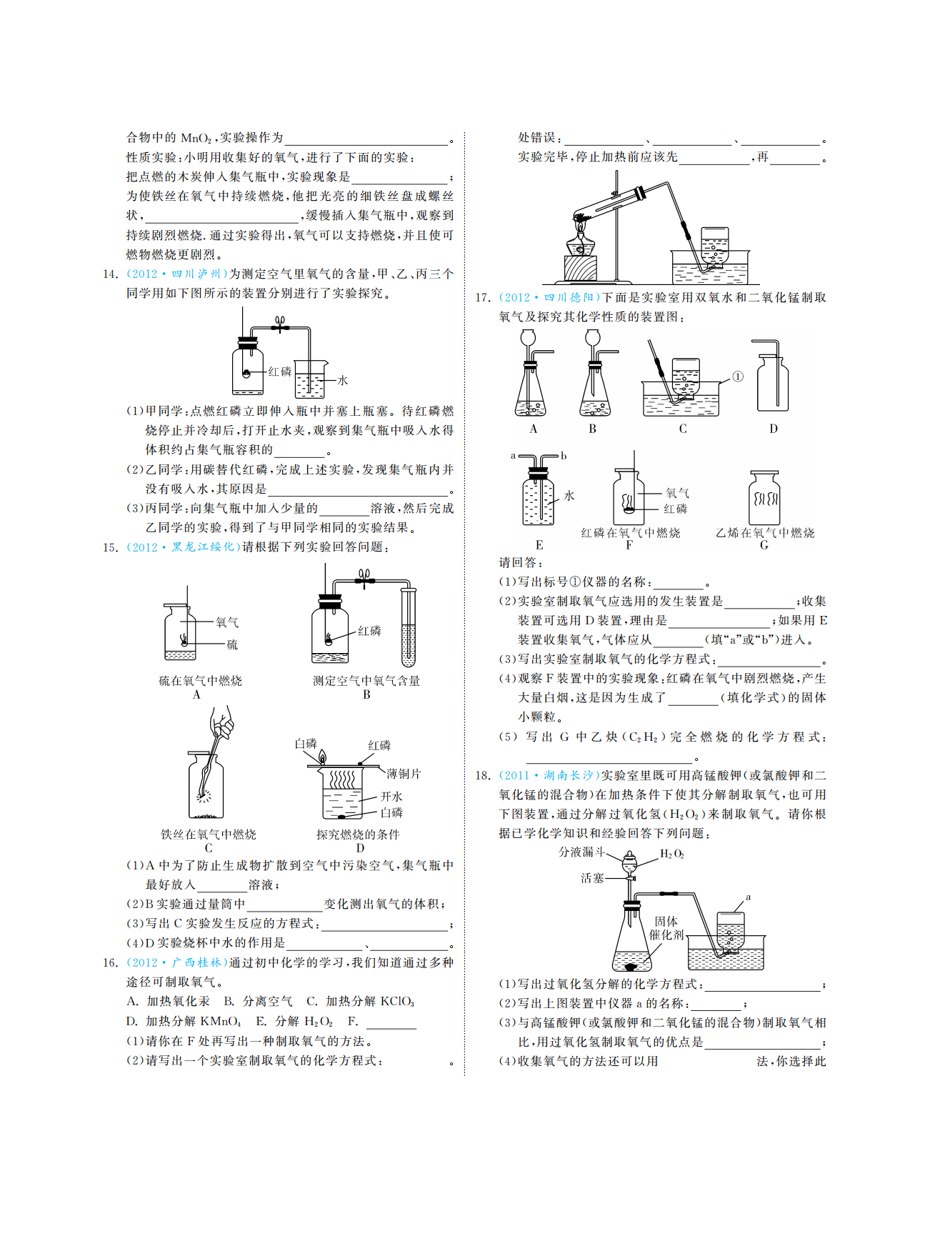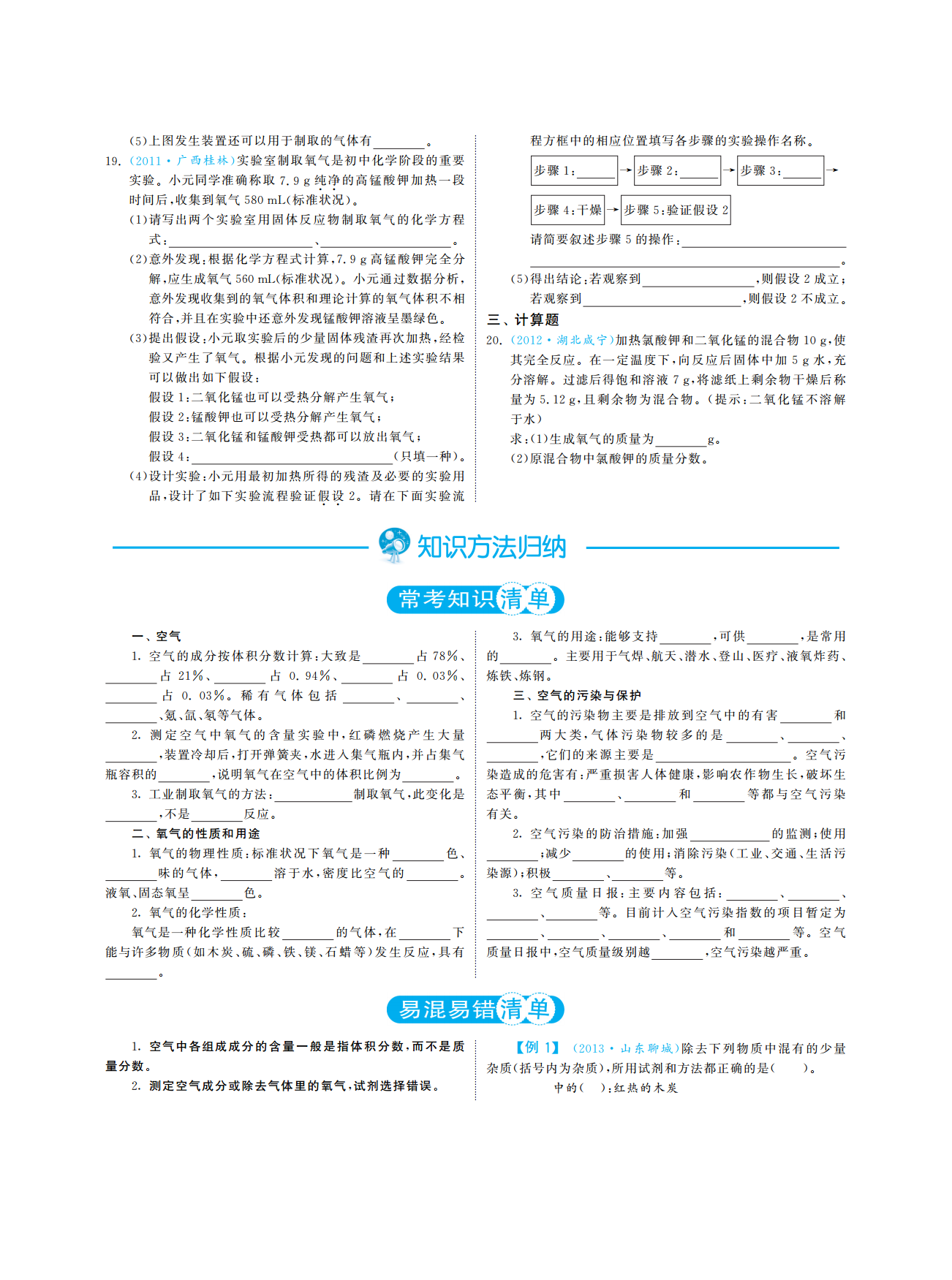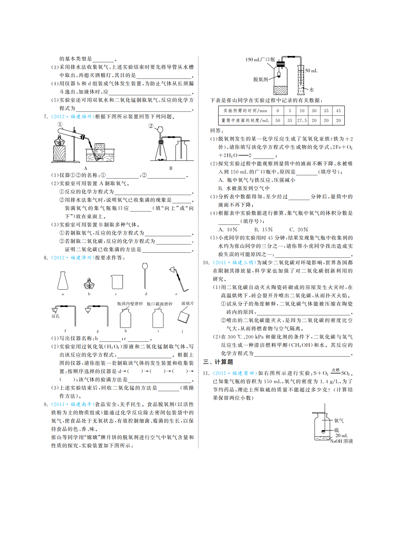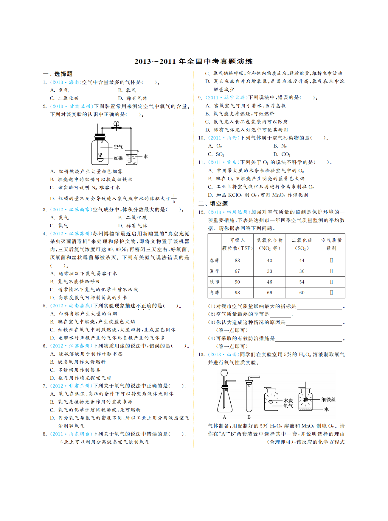 专题一空气氧气考点内容测评要求中考指数知道空气的主要成分及体积分数级说出(1)。Ⅰ()★★空气中氧气体积分数的探究原理级解释说明(2)。Ⅲ(、)★★空气认识空气对人类生活的重要作用级懂得1.(3)。Ⅱ()★污染原因及防治方法级懂得空气污染①。Ⅱ()★★(4)空气质量日报预报级说出列举②、。Ⅰ(、)★★知道氧气的主要性质和用途级能结合实例说明(1)。Ⅲ()★★★用氧气的性质解释一些常见的现象级会解释(2)。Ⅲ()★★★氧气认识氧气能跟许多物质发生氧化反应级能表示懂得2.(3)。Ⅱ(、)★★★氧气的工业制法级说出(4)。Ⅰ()★了解自然界中的氧循环级懂得(5)。Ⅱ()★级知道记住说出列举找到级认识了解看懂识别能表示懂得级理解解释说明区分判断简单计算*Ⅰ:、、、、;Ⅱ:、、、、、;Ⅲ:、、、、、2013~2011年福建省中考真题演练一选择题·福建龙岩下列有关氧气的认识正确的是、4.(2012),()。·福建厦门飞船舱中需提供给人呼吸的气体是可燃物接触氧气就能够燃烧1.(2013)A.通常情况下氧气是无色无味的气体,、()。B.铁丝在氧气中燃烧产生大量白烟氮气氧气C.,A.B.二氧化碳稀有气体鱼虾等能在水中生存是由于氧气易溶于水C.D.D.、,·福建漳州下列化学实验操作正确的是·福建龙岩下列关于物质的性质和用途说法不正确的2.(2013)()。5.(2011)是()。氧气用于火箭发射是利用氧气的可燃性A.,氮气用来保护粮食是利用氮气常温下化学性质稳定,B.稀有气体充入霓虹灯是利用稀有气体通电能发出不同颜C.,色的光二氧化碳用于灭火是利用它的物理性质和化学性质D.,二填空题、·福建南平下列仪器常用于实验室制取气体回答6.(2013),:福建三明·空气成分中体积分数约为的是(),3.201278%仪器的名称是()。(1)d。氧气氮气用高锰酸钾制氧气并使反应发生现有铁架台带铁夹和A.B.(2),()氧碳稀有气体试管还应从上图中选择仪器填序号该反应的基本类型是。采用排水法收集氧气上述实验结束时要先将导管从水槽(),3中取出再熄灭酒精灯其目的是,,。用仪器和组装成气体发生装置为防止气体从长颈漏(4)bd,斗逸出加液体时应,,。实验室还可用双氧水和二氧化锰制取氧气反应的化学方下表是张山同学在实验过程中记录的有关数据(5),:程式为实验所需的时间/。min0510303545·福建福州根据下图所示装置回答下列问题量筒中液面的刻度7.(2012)。/mL503527.5202020回答:脱氧剂发生的某一化学反应生成了氢氧化亚铁铁为(1)(+2价请你填写该化学方程式中生成物的化学式),:22Fe+O+2H2O2;探究实验过程中能观察到量筒中的液面不断下降水被吸(2),入到的广口瓶中原因是填序号仪器的名称150mL,();(1)①②:①,②。瓶中氧气与铁反应压强减小实验室可用装置制取氧气A.,(2)A。水被蒸发到空气中反应的化学方程式为。B.①分析表中数据得知至少经过分钟后量筒中的用排水法集气时说明氧气已收集满的现象是(3),,②,。液面不再下降装满氧气的集气瓶瓶口应填向上或向;(“”“根据表中实验数据进行推算集气瓶中氧气的体积分数是下放在桌面上(4),”)。填序号实验室可用装置制取多种气体();(3)B。若制取氧气反应的化学方程式为A.10%B.15%C.20%①,。小虎同学的实验用时分钟结果发现集气瓶中收集到的若制取二氧化碳反应的化学方程式为(5)45,②,,水约为张山同学的三分之一请你帮小虎同学找出造成实证明二氧化碳已收集满的方法是,。验失误的可能原因之一·福建漳州按要求作答:。8.(2012):福建三明·为减少二氧化碳对环境影响世界各国都(),10.2011在限制其排放量科学家也加强了对二氧化碳创新利用的,研究。用二氧化碳自动灭火陶瓷砖砌成的房屋发生火灾时在(1),高温烘烤下砖会裂开并喷出二氧化碳从而扑灭火焰,,。试从分子的角度解释二氧化碳气体能被压缩在陶瓷①,砖内的原因:。喷出的二氧化碳能灭火是因为二氧化碳的密度比空②,气大从而将燃着物与空气隔离,。在和催化剂的条件下二氧化碳与氢气写出仪器名称():;。(2)300℃、200kPa,1bc实验室用过氧化氢溶液和二氧化锰制取气体写反应生成一种清洁燃料甲醇和水其反应的(3)。(2)(H2O2),CHOH出该反应的化学方程式根据上化学方程式为:。。图的仪器请你组装一套制取该气体的发生装置和收集装三计算题,、点燃置按顺序选择的仪器是·福建莆田如右图所示进行实验:()()()d→→