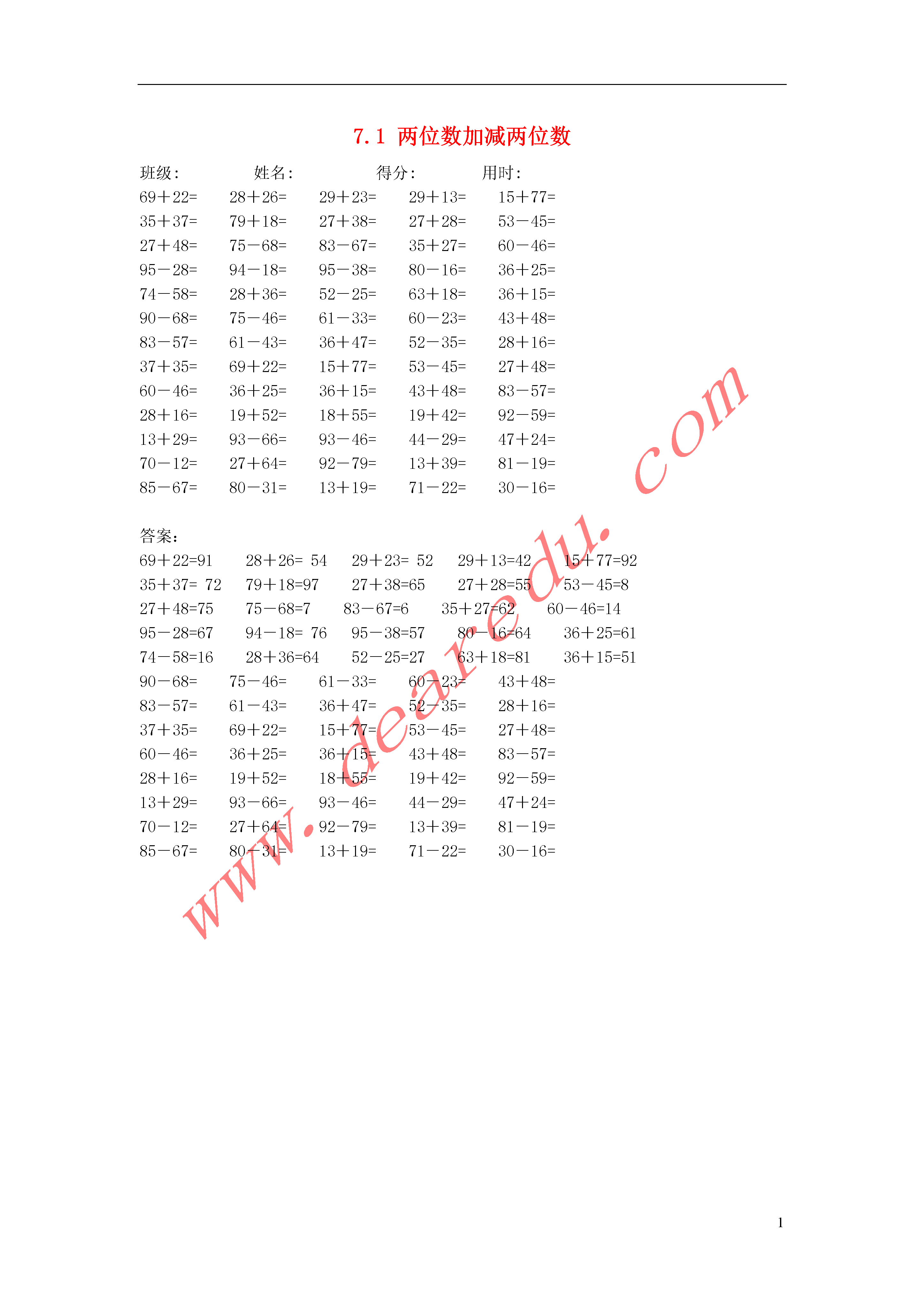 17.1两位数加减两位数班级:姓名:得分:用时:69+22=28+26=29+23=29+13=15+77=35+37=79+18=27+38=27+28=53-45=27+48=75-68=83-67=35+27=60-46=95-28=94-18=95-38=80-16=36+25=74-58=28+36=52-25=63+18=36+15=90-68=75-46=61-33=60-23=43+48=83-57=61-43=36+47=52-35=28+16=37+35=69+22=15+77=53-45=27+48=60-46=36+25=36+15=43+48=83-57=28+16=19+52=18+55=19+42=92-59=13+29=93-66=93-46=44-29=47+24=70-12=27+64=92-79=13+39=81-19=85-67=80-31=13+19=71-22=30-16=答案:69+22=9128+26=5429+23=5229+13=4215+77=9235+37=7279+18=9727+38=6527+28=5553-45=827+48=7575-68=783-67=635+27=6260-46=1495-28=6794-18=7695-38=5780-16=6436+25=6174-58=1628+36=6452-25=2763+18=8136+15=5190-68=75-46=61-33=60-23=43+48=83-57=61-43=36+47=52-35=28+16=37+35=69+22=15+77=53-45=27+48=60-46=36+25=36+15=43+48=83-57=28+16=19+52=18+55=19+42=92-59=13+29=93-66=93-46=44-29=47+24=70-12=27+64=92-79=13+39=81-19=85-67=80-31=13+19=71-22=30-16=