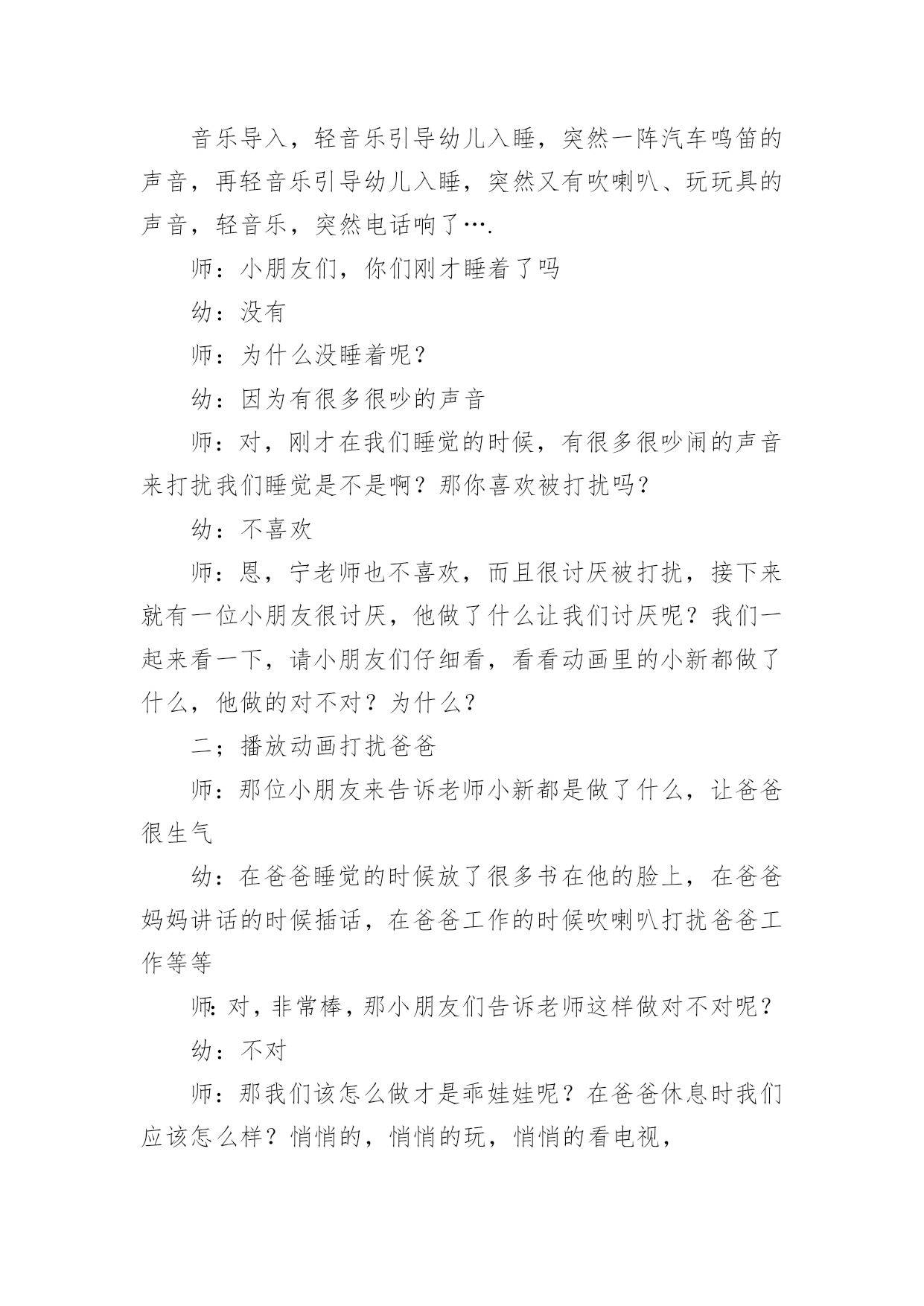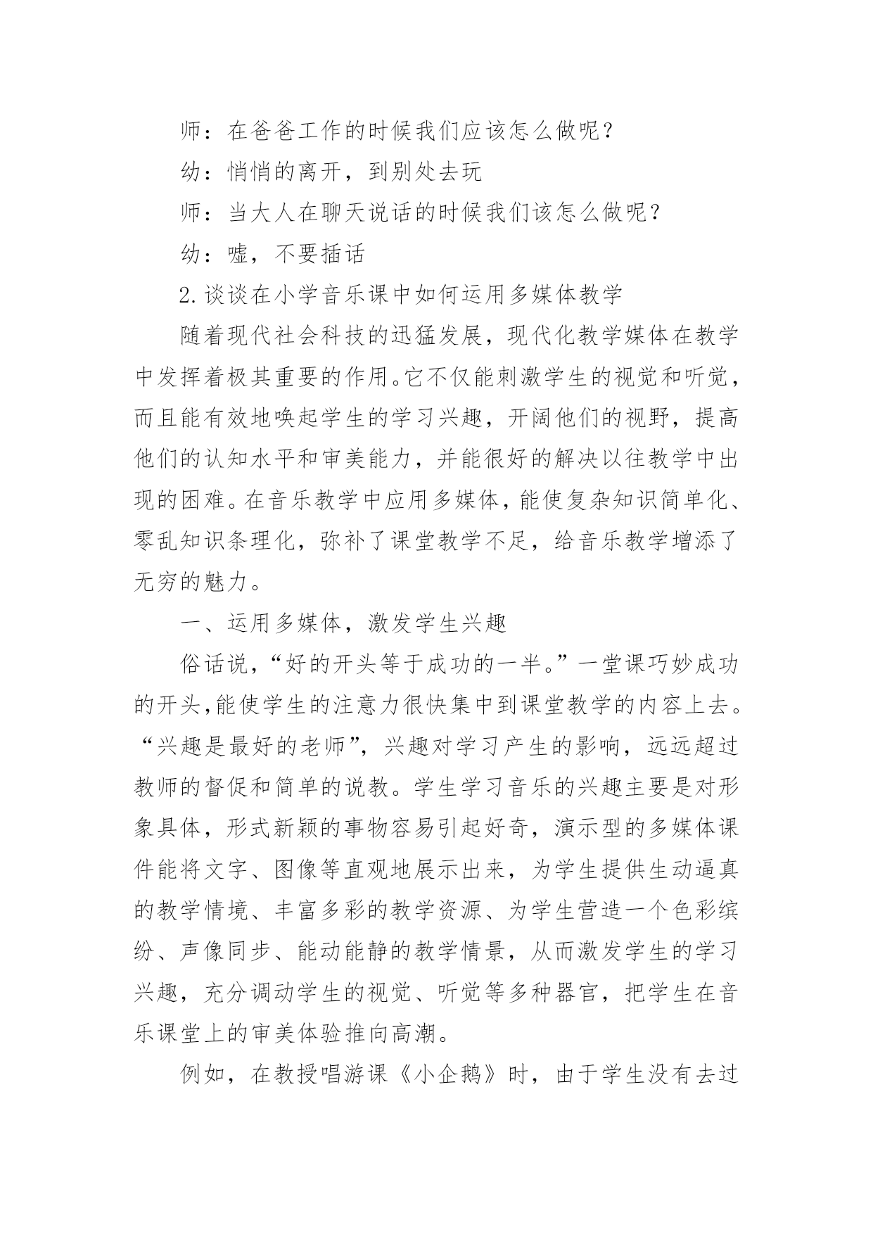 托班的教案 托班的教案作为一名为他人授业解惑的教育工作者,就有可能用到教案,教案是教学活动的依据,有着重要的地位。那么大家知道正规的教案是怎么写的吗?以下是小编整理的托班的教案,欢迎大家借鉴与参考,希望对大家有所帮助。托班的教案1设计意图:现在的孩子,大部分都是独生子女,就会有凡事都以自我为中心,不顾及他人感受的性格,因此根据幼儿的身心特点,让幼儿通过直观的教学,切身体验一下被打扰的感觉,让他们明白这种做法是不对的,逐渐学会尊重别人活动目标:1、让幼儿能注意、观察到别人的情绪,学会体贴、尊重别人2、使幼儿能积极主动的参加游戏3、培养幼儿在情感上的社会适应能力活动准备:音乐、动画、报纸、图片道具活动过程:一:导入音乐导入,轻音乐引导幼儿入睡,突然一阵汽车鸣笛的声音,再轻音乐引导幼儿入睡,突然又有吹喇叭、玩玩具的声音,轻音乐,突然电话响了….师:小朋友们,你们刚才睡着了吗幼:没有师:为什么没睡着呢?幼:因为有很多很吵的声音师:对,刚才在我们睡觉的时候,有很多很吵闹的声音来打扰我们睡觉是不是啊?那你喜欢被打扰吗?幼:不喜欢师:恩,宁老师也不喜欢,而且很讨厌被打扰,接下来就有一位小朋友很讨厌,他做了什么让我们讨厌呢?我们一起来看一下,请小朋友们仔细看,看看动画里的小新都做了什么,他做的对不对?为什么?二;播放动画打扰爸爸师:那位小朋友来告诉老师小新都是做了什么,让爸爸很生气幼:在爸爸睡觉的时候放了很多书在他的脸上,在爸爸妈妈讲话的时候插话,在爸爸工作的时候吹喇叭打扰爸爸工作等等师:对,非常棒,那小朋友们告诉老师这样做对不对呢?幼:不对师:那我们该怎么做才是乖娃娃呢?在爸爸休息时我们应该怎么样?悄悄的,悄悄的玩,悄悄的看电视,师:在爸爸工作的时候我们应该怎么做呢?幼:悄悄的离开,到别处去玩师:当大人在聊天说话的时候我们该怎么做呢?幼:嘘,不要插话2.谈谈在小学音乐课中如何运用多媒体教学随着现代社会科技的迅猛发展,现代化教学媒体在教学中发挥着极其重要的作用。它不仅能刺激学生的视觉和听觉,而且能有效地唤起学生的学习兴趣,开阔他们的视野,提高他们的认知水平和审美能力,并能很好的解决以往教学中出现的困难。在音乐教学中应用多媒体,能使复杂知识简单化、零乱知识条理化,弥补了课堂教学不足,给音乐教学增添了无穷的魅力。一、运用多媒体,激发学生兴趣俗话说,“好的开头等于成功的一半。”一堂课巧妙成功的开头,能使学生的注意力很快集中到课堂教学的内容上去。“兴趣是最好的老师”,兴趣对学习产生的影响,远远超过教师的督促和简单的说教。学生学习音乐的兴趣主要是对形象具体,形式新颖的事物容易引起好奇,演示型的多媒体课件能将文字、图像等直观地展示出来,为学生提供生动逼真的教学情境、丰富多彩的教学资源、为学生营造一个色彩缤纷、声像同步、能动能静的教学情景,从而激发学生的学习兴趣,充分调动学生的视觉、听觉等多种器官,把学生在音乐课堂上的审美体验推向高潮。例如,在教授唱游课《小企鹅》时,由于学生没有去过南极,很少看到过企鹅,为了让他们更好的理解想象歌曲的音乐形象,可将歌曲和有关南极、企鹅的画面剪辑成小影片,课前在大屏幕上循环播放,让学生合着音乐,看着画面进课堂。憨态可掬的企鹅和冰天雪地的南极一下就吸引了学生,使学生情不自禁的萌发了学习这首歌曲的兴趣。学会唱后,可以利用“附件”中的“录音机”将学生的演唱配上伴奏录下来,然后播放,全班欣赏,使学生享受到参与音乐活动的快感,同时也培养了他们的参与意识和表现欲望。二、直观形象,突破难点心理学家认为:动态刺激远大于静态刺激,给人留下的印象也最深刻。教学中,以静态方式存在的教学材料,通过多媒体的手段可恢复其鲜活的面目,使之变得有声有色。采用CAI动态图像演示,利用其文字的闪现、图形的缩放与移动、颜色的变换等手段,容量大、速度快、效果好,不仅能把学生难懂的知识直观的显示出来,而且有较强的刺激作用,有利于促进学生的知识建构。《小乌鸦爱妈妈》是一首两声部的合唱歌曲。此前,学生很少接触过分声部歌曲,为了让学生在演唱时做到声部和谐、音高和节奏准确,可以将高低声部用不同颜色显示在屏幕上,并且用“音频解霸”分别录制两个声部的伴奏。乐理课对于学生来说是枯燥无味的,但又是学生必须掌握的基础课程,在教学中可利用计算机集成化功能制作软件,展示知识形成过程,为学生思维的条理化打下基础。如在教授“八分音符”时,就可通过“小兔分瓜”的画面,在屏幕上演示一个大西瓜平均分成八份的过程,并在每份上标上相应的节奏符号,让学生形象理解全音符、二分音符、四分音符、八分音符的时值、含义,这样一来,学生仿佛在欣赏一则童话美术片,使之眼到、耳到、心到,听得认真,看得仔细,这样建立起来的音符时值概念,印象深刻,记忆牢固。三、优化教学,扩充容量运用多媒体丰富学生的想象能力。一方面使他们