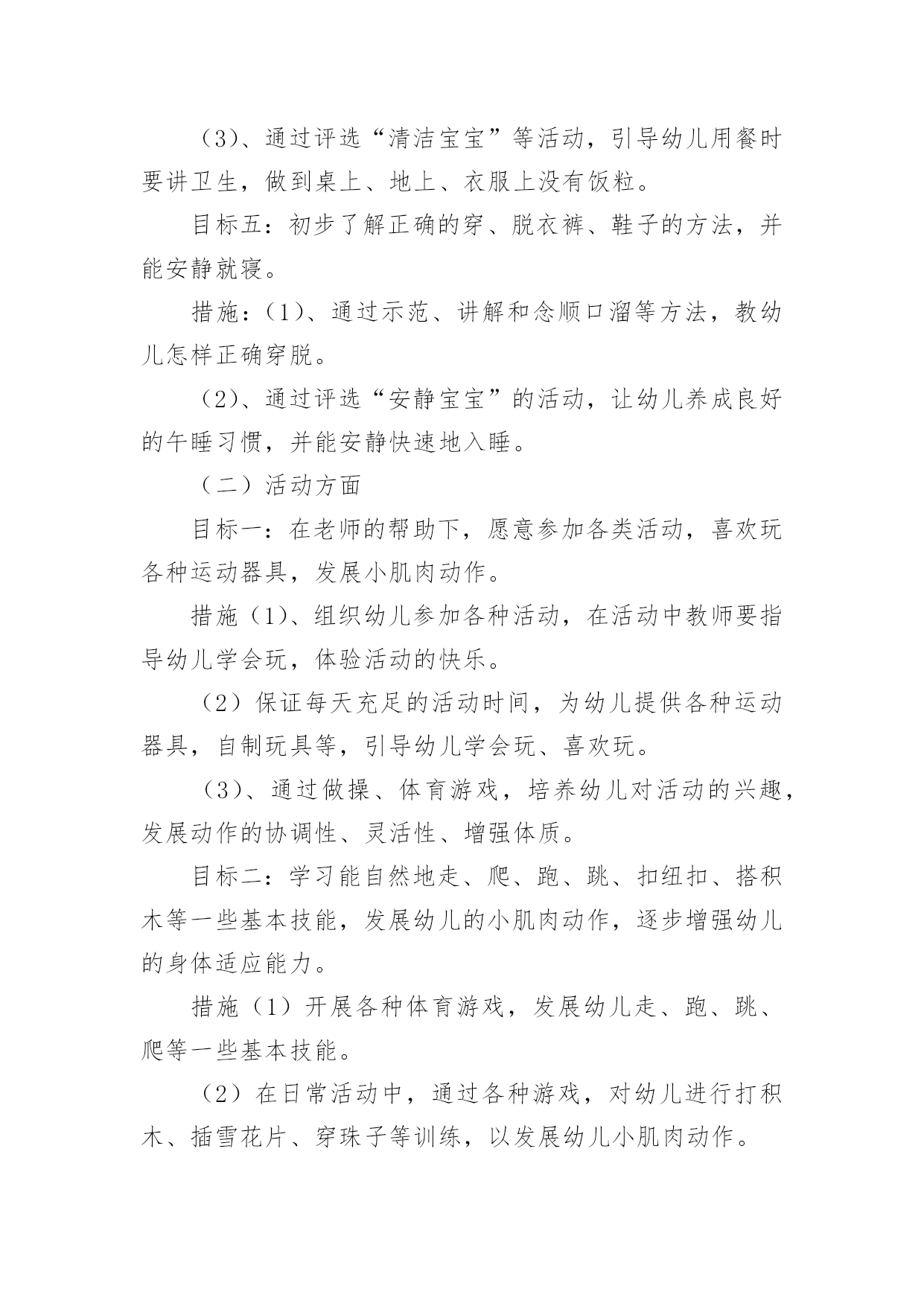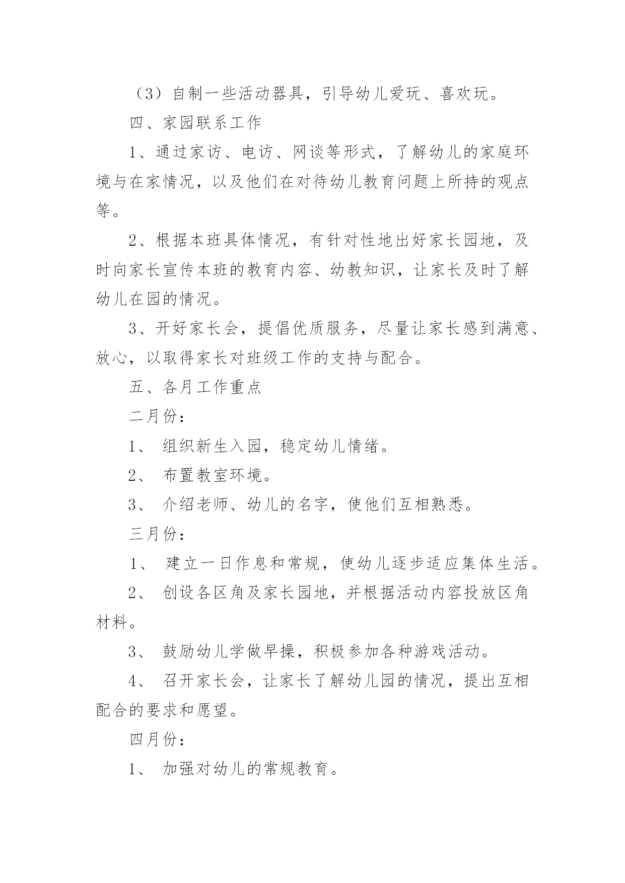 托班第二学期计划 托班第二学期计划范文一、班级情况分析1、总体分析:我班现有幼儿35人,其中男孩20人,女孩15人,有两名幼儿曾经上过幼儿园,其他的都是第一次入园,因此,有很严重的哭闹现象。从家庭状况来看,家长都比较年轻,而且工作都挺忙,把孩子交给爷爷、奶奶、外公、外婆带的比较多,所以孩子们的许多事情都是由大人包办,自理能力很差。他们不会自己穿、脱衣裤,不会自己大小便,有的还要尿裤子,进餐习惯也不好,有的边吃饭边跑边玩,有的需要大人一口一口喂着吃或把饭含在嘴里,有许多幼儿有严重的挑食现象。幼儿在家中有午睡的习惯,但是花样百出,有的要大人搂着睡,有的要含着奶嘴睡,有的喜欢咬被子,含手指睡;幼儿与同伴之间不会友好相处,不合群,有争夺玩具、打闹的现象;集体活动的意识较差,所以要适应幼儿园的生活和作息常规有待一段时间的培养和教育。2、个别幼儿情况:(1)佳佳、洋洋、凯凯经常随意离开集体,以为他们从未有过集体生活的经验,在家中是大人听他们的,跟随他们的,所以不知道在集体中要跟着老师。因此,老师们要经常将他们带在身边一起活动,使他们愿意并逐步适应集体生活。(2)溥溥小朋友个性过于内向,不愿意开口,总是在一边看着别的幼儿游戏和活动,遇到问题总是哭泣。因为在家中由外婆抚养,无论什么事不用开口就能满足其要求,所以在集体中要多多关注这样的幼儿,不断地鼓励并创设让他与同伴、老师交流的机会,使他逐步有开口的欲望。(3)酉酉的脾气很暴躁,一不满意就大喊大叫,拳打脚踢。因为在家中父母、长辈都特别溺爱孩子,幼儿平时在家中是个“小皇帝”,什么事都依着他,在大人们那里他已经习惯了使用“暴力”来解决问题,所以他把这一倾向也带到了幼儿园。那么老师要在班里树立好的榜样,特别是言行方面。其实老师的言行幼儿学得特别快,也影响着其今后的发展。另外,要多和家长交流,来共同帮助他改掉不良习惯,逐步适应集体的生活。二、班级工作重点建立融洽的师幼关系,家园关系,以培养幼儿的生活自理能力和动手能力为重点,使他们喜欢上幼儿园,喜欢老师,喜欢同伴,在集体中健康、活泼地成长。三、具体工作目标与措施(一)生活方面目标一:逐步适应幼儿园的集体生活,愿意上幼儿园,家长离开时不哭闹,能与老师和同伴一起玩耍。措施:(1)、教师为幼儿创设良好的游戏活动环境,提供丰富的游戏活动材料来吸引幼儿,使幼儿乐意来园,乐意玩耍,并能主动地参加各类游戏活动。(2)、指导幼儿在来园和离园时会使用简单的礼貌用语。目标二:懂得要爱护幼儿园的各种东西。措施:(1)、在老师的提醒下,会轻拿、轻放椅子、玩具、图书等。(2)、通过生活活动、教育活动,引导幼儿与同伴之间要共同友好相处,不争抢玩具,不随便把幼儿园的玩具带回家。目标三:学习正确的洗手和擦脸的方法,知道有尿意的时候要及时并在指定的地方拉大、小便。措施:(1)、通过平时的生活活动,让幼儿熟悉自己的毛巾、茶杯等,能用自己的毛巾擦手、擦脸,用自己的茶杯喝水。(2)、在点心和进餐前后、大小便后及手脏时,让幼儿学习正确的洗手和擦脸的方法。(3)、通过故事、儿歌等形式,培养幼儿养成及时洗干净小手的良好卫生习惯。(4)、通过故事“小猪尿床”,教幼儿要及时大小便,并逐步教会他们自理。目标四:愉快地用餐,正确使用调羹,初步懂得就餐卫生,培养要爱惜粮食的良好品质。措施:(1)、在餐前向幼儿介绍菜名,引起幼儿进餐的欲望。(2)、在区域活动中开设“给小动物喂食”,帮助幼儿正确使用调羹。(3)、通过评选“清洁宝宝”等活动,引导幼儿用餐时要讲卫生,做到桌上、地上、衣服上没有饭粒。目标五:初步了解正确的穿、脱衣裤、鞋子的方法,并能安静就寝。措施:(1)、通过示范、讲解和念顺口溜等方法,教幼儿怎样正确穿脱。(2)、通过评选“安静宝宝”的活动,让幼儿养成良好的午睡习惯,并能安静快速地入睡。(二)活动方面目标一:在老师的帮助下,愿意参加各类活动,喜欢玩各种运动器具,发展小肌肉动作。措施(1)、组织幼儿参加各种活动,在活动中教师要指导幼儿学会玩,体验活动的快乐。(2)保证每天充足的活动时间,为幼儿提供各种运动器具,自制玩具等,引导幼儿学会玩、喜欢玩。(3)、通过做操、体育游戏,培养幼儿对活动的兴趣,发展动作的协调性、灵活性、增强体质。目标二:学习能自然地走、爬、跑、跳、扣纽扣、搭积木等一些基本技能,发展幼儿的小肌肉动作,逐步增强幼儿的身体适应能力。措施(1)开展各种体育游戏,发展幼儿走、跑、跳、爬等一些基本技能。(2)在日常活动中,通过各种游戏,对幼儿进行打积木、插雪花片、穿珠子等训练,以发展幼儿小肌肉动作。(3)自制一些活动器具,引导幼儿爱玩、喜欢玩。四、家园联系工作1、通过家访、电访、网谈等形式,了解幼儿的家庭环境与在家情况,以及他们在对待幼儿教育问题上所持的观点等。2、根据本班具体情况,有针对性地
