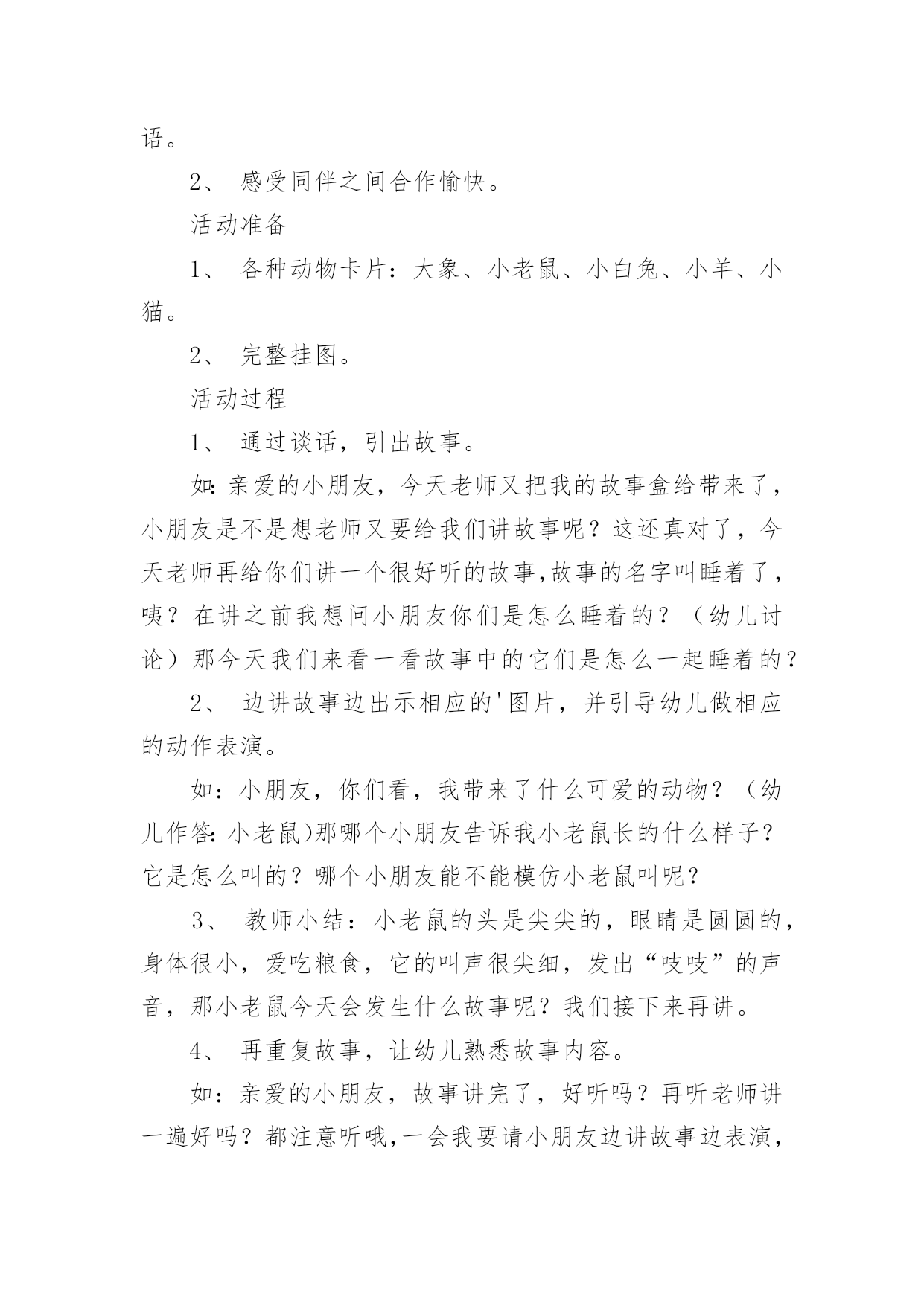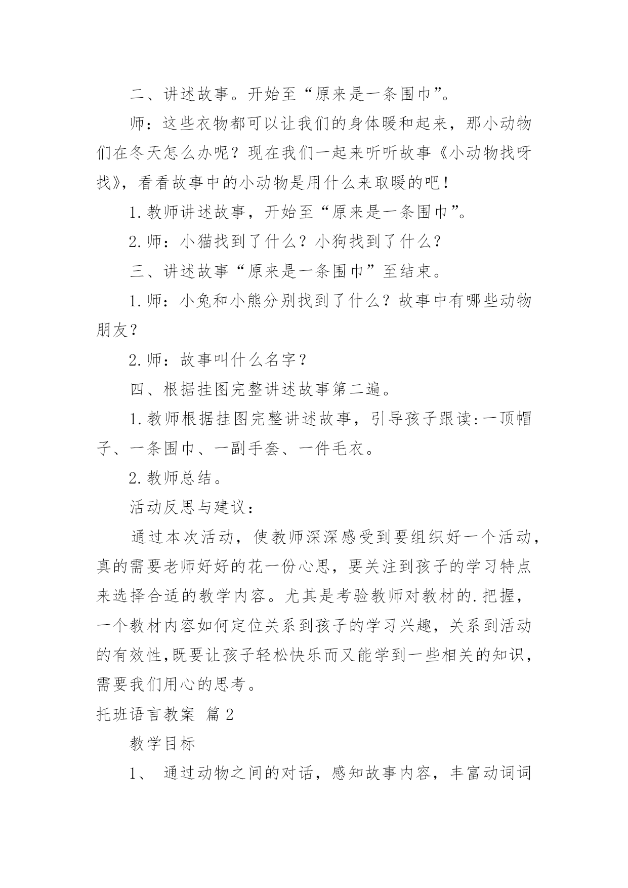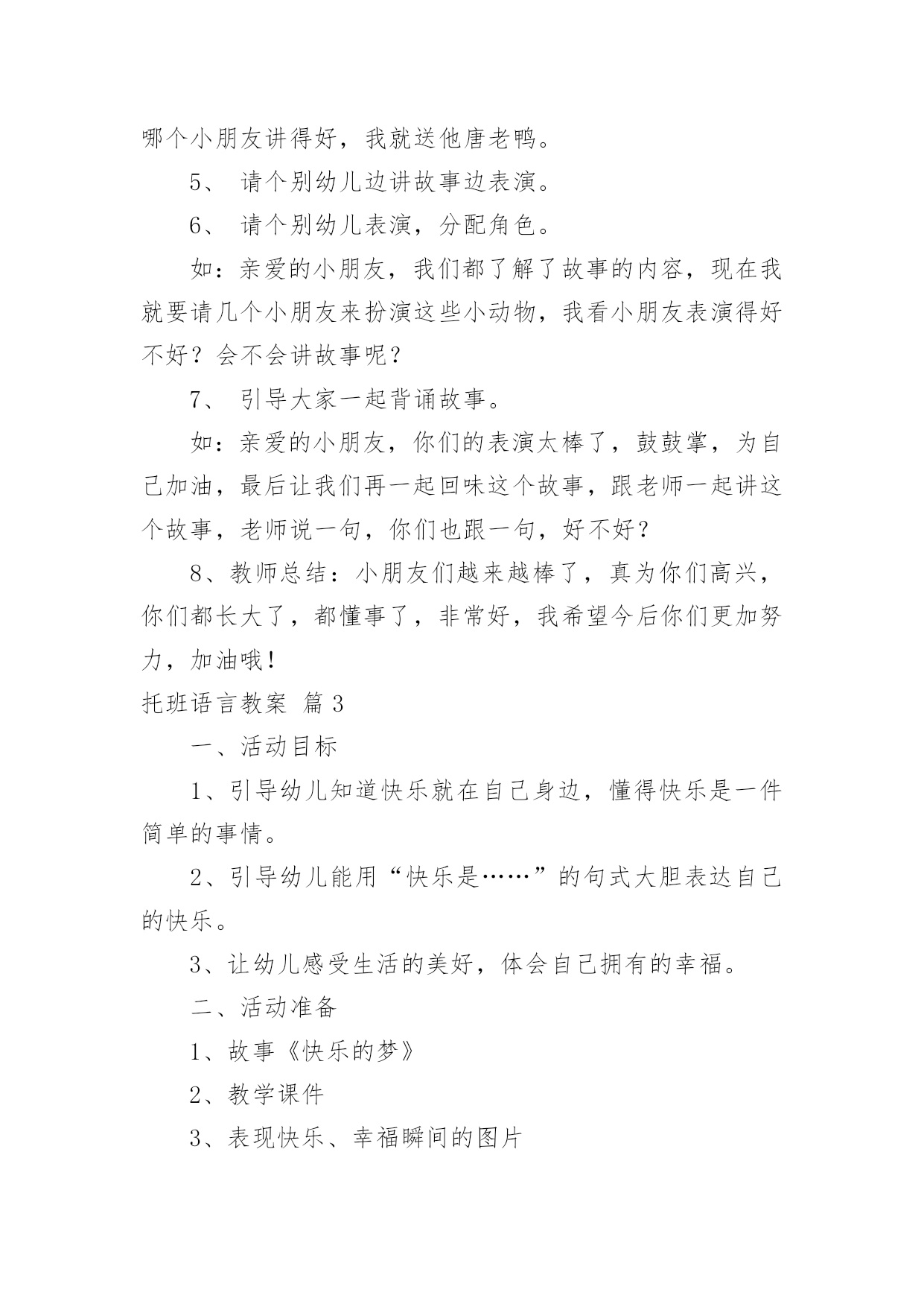 托班语言教案 托班语言教案模板10篇作为一位杰出的老师,很有必要精心设计一份教案,教案是实施教学的主要依据,有着至关重要的作用。来参考自己需要的教案吧!以下是小编精心整理的托班语言教案10篇,欢迎阅读与收藏。托班语言教案篇1活动目标:1.通过活动引发幼儿的好奇心,激发幼儿的探索欲望。2.帮助幼儿积累相关的认知经验,鼓励幼儿开口说。活动准备:1.图谱。2.小狗小猫等卡片。活动过程:一、教师与幼儿自由交流经验师:小朋友们有没有发现今天啊班里多了许多的客人老师,他们啊是来瞧瞧托(2)班小朋友表现的棒不棒,小朋友们棒不棒啊?1.谈话导入。师:小朋友们现在是冬天,冬天会刮风,下雪,天气非常冷。所以小朋友的爸爸妈妈会给你们穿什么呀?手上戴上什么?脖子上围上什么?头上戴什么?二、讲述故事。开始至“原来是一条围巾”。师:这些衣物都可以让我们的身体暖和起来,那小动物们在冬天怎么办呢?现在我们一起来听听故事《小动物找呀找》,看看故事中的小动物是用什么来取暖的吧!1.教师讲述故事,开始至“原来是一条围巾”。2.师:小猫找到了什么?小狗找到了什么?三、讲述故事“原来是一条围巾”至结束。1.师:小兔和小熊分别找到了什么?故事中有哪些动物朋友?2.师:故事叫什么名字?四、根据挂图完整讲述故事第二遍。1.教师根据挂图完整讲述故事,引导孩子跟读:一顶帽子、一条围巾、一副手套、一件毛衣。2.教师总结。活动反思与建议:通过本次活动,使教师深深感受到要组织好一个活动,真的需要老师好好的花一份心思,要关注到孩子的学习特点来选择合适的教学内容。尤其是考验教师对教材的.把握,一个教材内容如何定位关系到孩子的学习兴趣,关系到活动的有效性,既要让孩子轻松快乐而又能学到一些相关的知识,需要我们用心的思考。托班语言教案篇2教学目标1、通过动物之间的对话,感知故事内容,丰富动词词语。2、感受同伴之间合作愉快。活动准备1、各种动物卡片:大象、小老鼠、小白兔、小羊、小猫。2、完整挂图。活动过程1、通过谈话,引出故事。如:亲爱的小朋友,今天老师又把我的故事盒给带来了,小朋友是不是想老师又要给我们讲故事呢?这还真对了,今天老师再给你们讲一个很好听的故事,故事的名字叫睡着了,咦?在讲之前我想问小朋友你们是怎么睡着的?(幼儿讨论)那今天我们来看一看故事中的它们是怎么一起睡着的?2、边讲故事边出示相应的'图片,并引导幼儿做相应的动作表演。如:小朋友,你们看,我带来了什么可爱的动物?(幼儿作答:小老鼠)那哪个小朋友告诉我小老鼠长的什么样子?它是怎么叫的?哪个小朋友能不能模仿小老鼠叫呢?3、教师小结:小老鼠的头是尖尖的,眼睛是圆圆的,身体很小,爱吃粮食,它的叫声很尖细,发出“吱吱”的声音,那小老鼠今天会发生什么故事呢?我们接下来再讲。4、再重复故事,让幼儿熟悉故事内容。如:亲爱的小朋友,故事讲完了,好听吗?再听老师讲一遍好吗?都注意听哦,一会我要请小朋友边讲故事边表演,哪个小朋友讲得好,我就送他唐老鸭。5、请个别幼儿边讲故事边表演。6、请个别幼儿表演,分配角色。如:亲爱的小朋友,我们都了解了故事的内容,现在我就要请几个小朋友来扮演这些小动物,我看小朋友表演得好不好?会不会讲故事呢?7、引导大家一起背诵故事。如:亲爱的小朋友,你们的表演太棒了,鼓鼓掌,为自己加油,最后让我们再一起回味这个故事,跟老师一起讲这个故事,老师说一句,你们也跟一句,好不好?8、教师总结:小朋友们越来越棒了,真为你们高兴,你们都长大了,都懂事了,非常好,我希望今后你们更加努力,加油哦!托班语言教案篇3一、活动目标1、引导幼儿知道快乐就在自己身边,懂得快乐是一件简单的事情。2、引导幼儿能用“快乐是……”的句式大胆表达自己的快乐。3、让幼儿感受生活的美好,体会自己拥有的幸福。二、活动准备1、故事《快乐的梦》2、教学课件3、表现快乐、幸福瞬间的图片三、活动过程1、教师讲故事《快乐的梦》,激发幼儿参与活动的兴趣。(1)熊妈妈梦到了什么?(2)在梦里,她为什么会感到快乐呢?熊妈妈之所以会感到快乐,是因为在她的梦里,她最爱的人,熊宝宝一直陪伴在她身边。2、启发幼儿思考让自己感到快乐的事情,初步感知幸福。(1)什么事情会让你感到快乐?(2)和谁在一起会让你感到快乐?3、教师出示教学课件,进入情商彩虹桥环节,引导幼儿观察、描述画面、体会他人感到快乐的原因。教师提问:看看画面中的人物,他认为的`快乐是什么呢?4、鼓励幼儿用“快乐是……”的句式大胆表达自己的快乐,感受生活的美好。(1)你们认为快乐是什么?(2)你快乐的时候,是什么样子的?快乐其实是一件很简单的事情,我们的生活里出处拥有着快乐。比如,快乐是家人的关爱和陪伴,快乐是幼儿园里有许多可爱的伙伴,快乐是家里的小狗一起玩耍,快乐是拥有自己喜欢的玩具,快乐是吃到自己爱吃的食物等等。四、活动延
