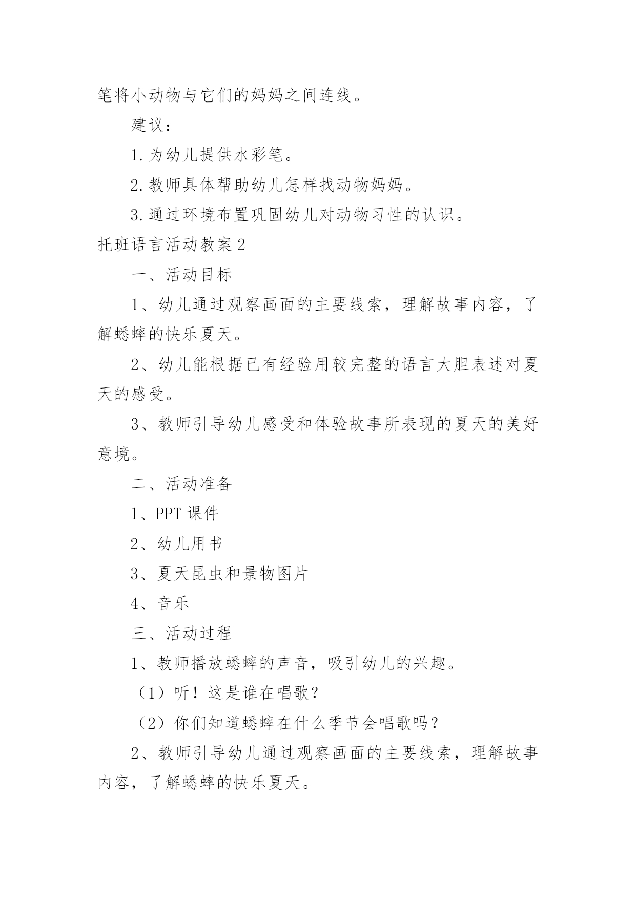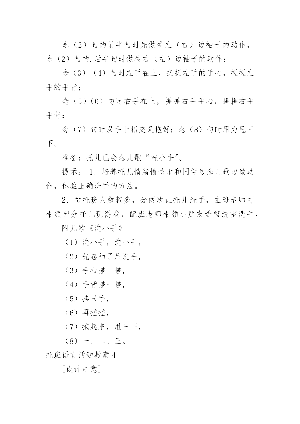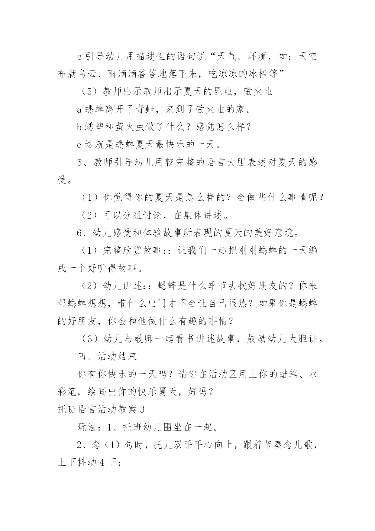 托班语言活动教案 托班语言活动教案作为一位无私奉献的人民教师,就不得不需要编写教案,教案是保证教学取得成功、提高教学质量的基本条件。那么优秀的教案是什么样的呢?下面是小编整理的托班语言活动教案,希望对大家有所帮助。托班语言活动教案1名称二:动物宝宝找妈妈目标:感知简单的对应关系材料:动物头饰过程:1.指出这是些什么动物。2.模仿这些动物的'叫声。3.教师戴头饰分别扮演书中动物的妈妈,小朋友做小动物。――“谁是我的宝宝?”4.幼儿要根据教师头戴何物,确定自己是谁家的孩子。如:教师戴羊妈妈头饰问:“谁是我的宝宝?”幼儿答:“我是羊妈妈的孩子。”5.教师演示其中一则内容,帮动物宝宝找妈妈,幼儿用笔将小动物与它们的妈妈之间连线。建议:1.为幼儿提供水彩笔。2.教师具体帮助幼儿怎样找动物妈妈。3.通过环境布置巩固幼儿对动物习性的认识。托班语言活动教案2一、活动目标1、幼儿通过观察画面的主要线索,理解故事内容,了解蟋蟀的快乐夏天。2、幼儿能根据已有经验用较完整的语言大胆表述对夏天的感受。3、教师引导幼儿感受和体验故事所表现的夏天的美好意境。二、活动准备1、PPT课件2、幼儿用书3、夏天昆虫和景物图片4、音乐三、活动过程1、教师播放蟋蟀的声音,吸引幼儿的兴趣。(1)听!这是谁在唱歌?(2)你们知道蟋蟀在什么季节会唱歌吗?2、教师引导幼儿通过观察画面的主要线索,理解故事内容,了解蟋蟀的快乐夏天。(1)幼儿欣赏故事开端,播放课件,知道蟋蟀带的礼物是三朵向日葵。(2)有一天,蟋蟀觉得很无聊,他决定去拜访好朋友,你瞧!他的手里拿着什么?(3)幼儿讲述“三朵美丽的向日葵”,引导幼儿数一数。于是,蟋蟀开始出发啦!3、幼儿自由阅读幼儿用书《夏天》。(1)蟋蟀要去找好朋友,他的好朋友是谁?(2)蟋蟀带了什么礼物给她的好朋友?(3)他找了三个好朋友,分别是禅先生、青蛙、萤火虫;礼物是三朵美丽的向日葵。4、能根据已有经验用较完整的语言大胆表述对夏天的感受。(1)教师和幼儿一起讲述故事《夏天》。重点出示三幅图片,与幼儿一起观察讲述。(2)你喜欢哪一幅?谁愿意来介绍一下?(3)教师出示夏天的昆虫,蝉先生的家。a他找的`第一个朋友是谁?一起在做什么?b蟋蟀和蝉先生一起觉得怎么样?为什么?c蟋蟀走呀走呀,你看!他的向日葵怎么了?(4)教师出示夏天的景物和动物,荷花池里的青蛙。a离开蝉先生的家,蟋蟀来到了哪里?b请你用你的小眼睛看一看这一幅美丽的画面。你看到了什么?又好听完整的话来说说。c引导幼儿用描述性的语句说“天气、环境,如:天空布满乌云、雨滴滴答答地落下来,吃凉凉的冰棒等”(5)教师出示教师出示夏天的昆虫,萤火虫a蟋蟀离开了青蛙,来到了萤火虫的家。b蟋蟀和萤火虫做了什么?感觉怎么样?c这就是蟋蟀夏天最快乐的一天。5、教师引导幼儿用较完整的语言大胆表述对夏天的感受。(1)你觉得你的夏天是怎么样的?会做些什么事情呢?(2)可以分组讨论,在集体讲述。6、幼儿感受和体验故事所表现的夏天的美好意境。(1)完整欣赏故事::让我们一起把刚刚蟋蟀的一天编成一个好听得故事。(2)幼儿讲述::蟋蟀是什么季节去找好朋友的?你来帮蟋蟀想想,带什么出门才不会让自己很热?如果你是蟋蟀的好朋友,你会和他做什么有趣的事情?(3)幼儿与教师一起看书讲述故事,鼓励幼儿大胆讲。四、活动结束你有你快乐的一天吗?请你在活动区用上你的蜡笔、水彩笔,绘画出你的快乐夏天,好吗?托班语言活动教案3玩法:1、托班幼儿围坐在一起。2、念(1)句时,托儿双手手心向上,跟着节奏念儿歌,上下抖动4下;念(2)句的前半句时先做卷左(右)边袖子的动作,念(2)句的.后半句时做卷右(左)边袖子的动作;念(3)、(4)句时左手在上,搓搓左手的手心,搓搓左手的手背;念(5)(6)句时右手在上,搓搓右手手心,搓搓右手手背;念(7)句时双手十指交叉抱好;念(8)句时用力甩三下。准备:托儿已会念儿歌“洗小手”。提示:1.培养托儿情绪愉快地和同伴边念儿歌边做动作,体验正确洗手的方法。2.如托班人数较多,分两次让托儿洗手,主班老师可带领部分托儿玩游戏,配班老师带领小朋友进盥洗室洗手。附儿歌《洗小手》(1)洗小手,洗小手,(2)先卷袖子后洗手,(3)手心搓一搓,(4)手背搓一搓,(5)换只手,(6)再搓搓,(7)抱起来,甩三下,(8)一、二、三。托班语言活动教案4[设计用意]小幼儿园小班的小孩年纪小,他们離開形影不离的父亲、母亲、祖父、祖母,到生疏的环境——幼儿园,难免有焦躁、不安的心情,爸爸妈妈们也反映小孩回家常讲孩子不同他玩。要稳定孩子的心情,最好的方法之一是让孩子擁有自个儿的伙伴。所以,我设计“小鸭子找伙伴”的教学,希望通过这一个教学让孩子明白有伙伴是愉快的,体会到有伙伴的欣喜心情。[教学目标]1、通过教学让孩子初步明白有伙伴是愉快的。