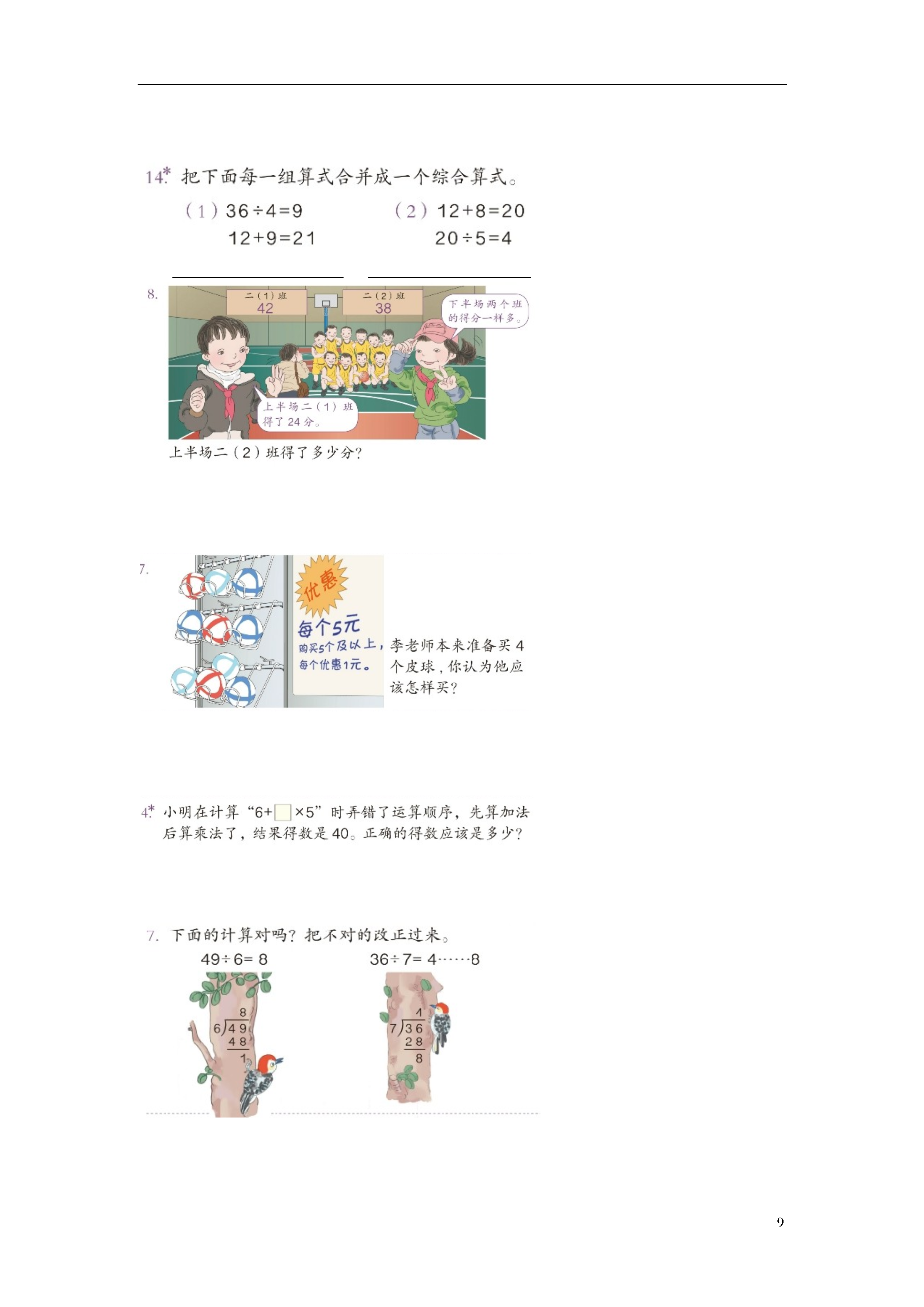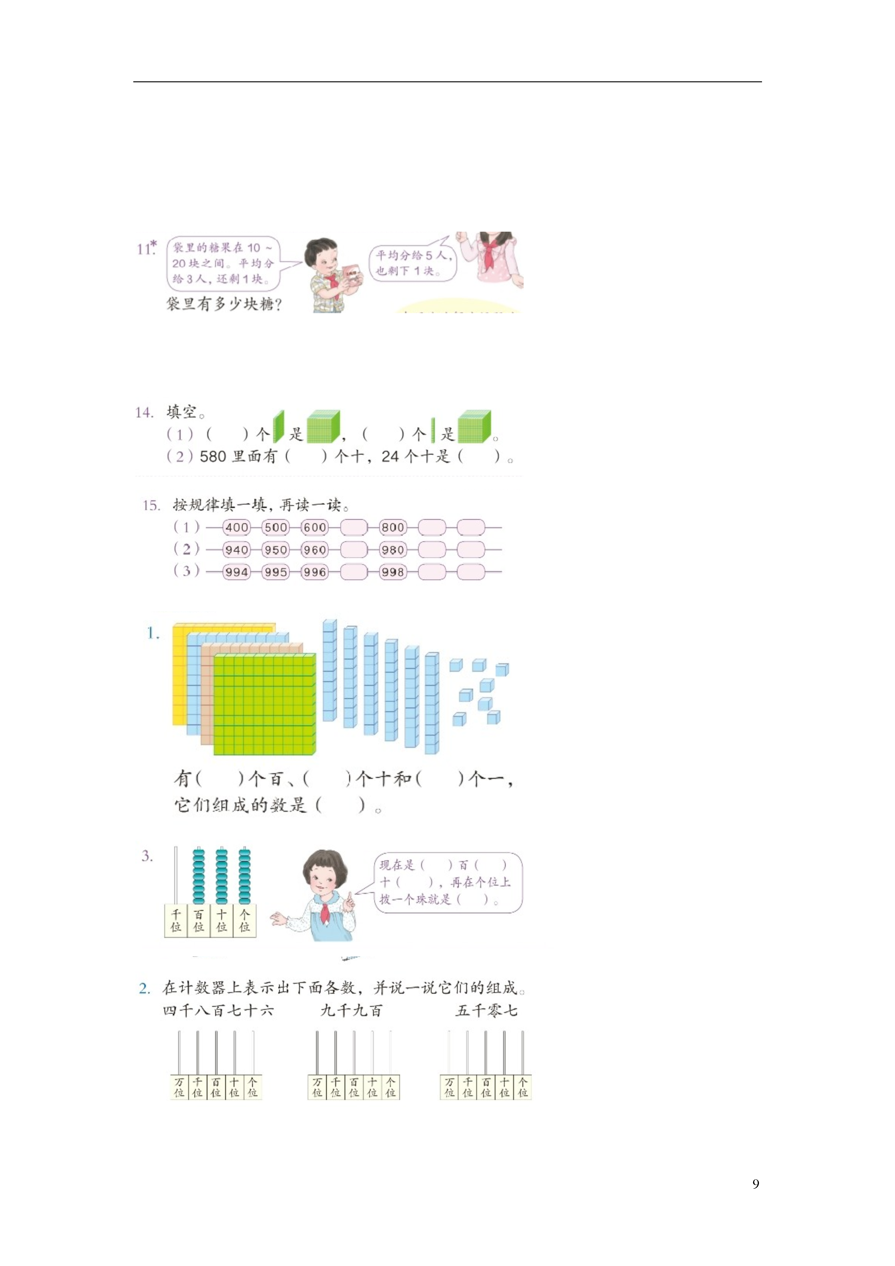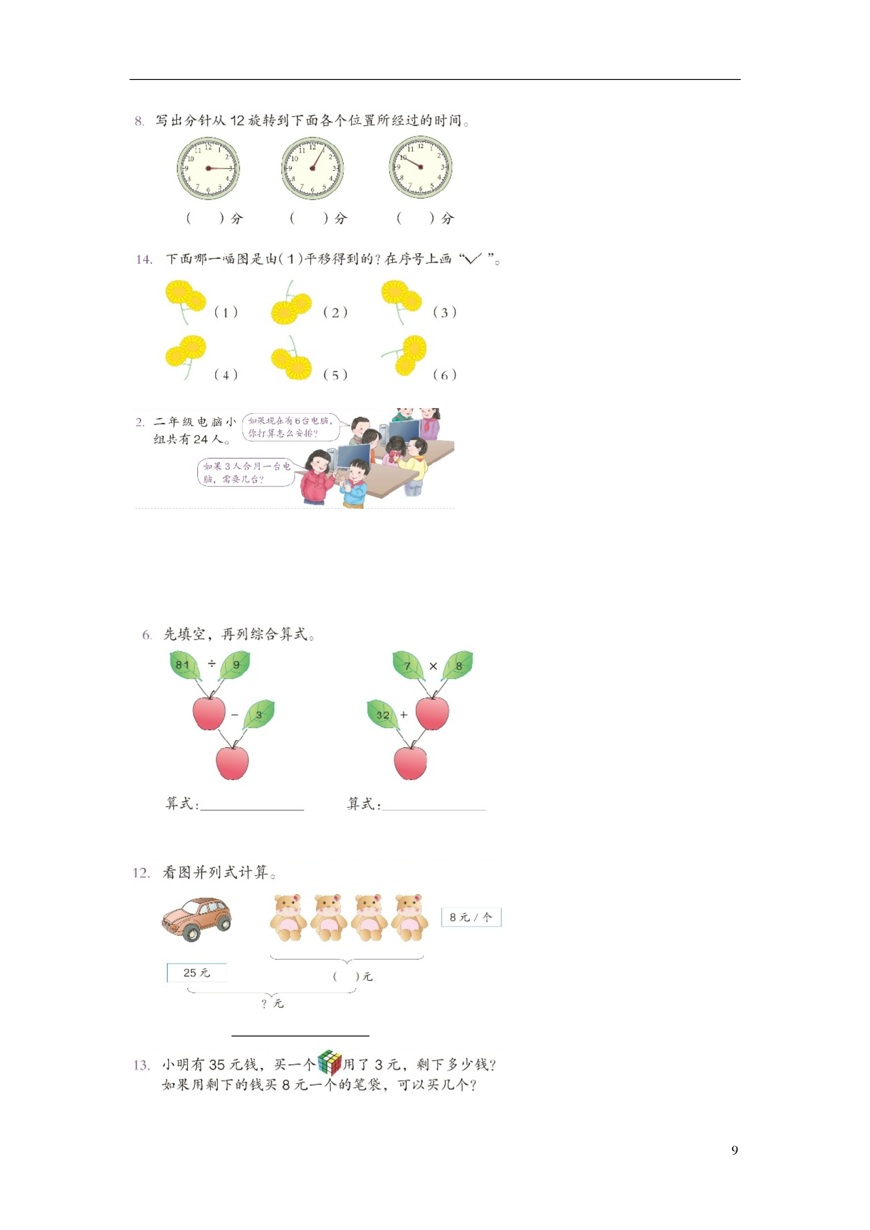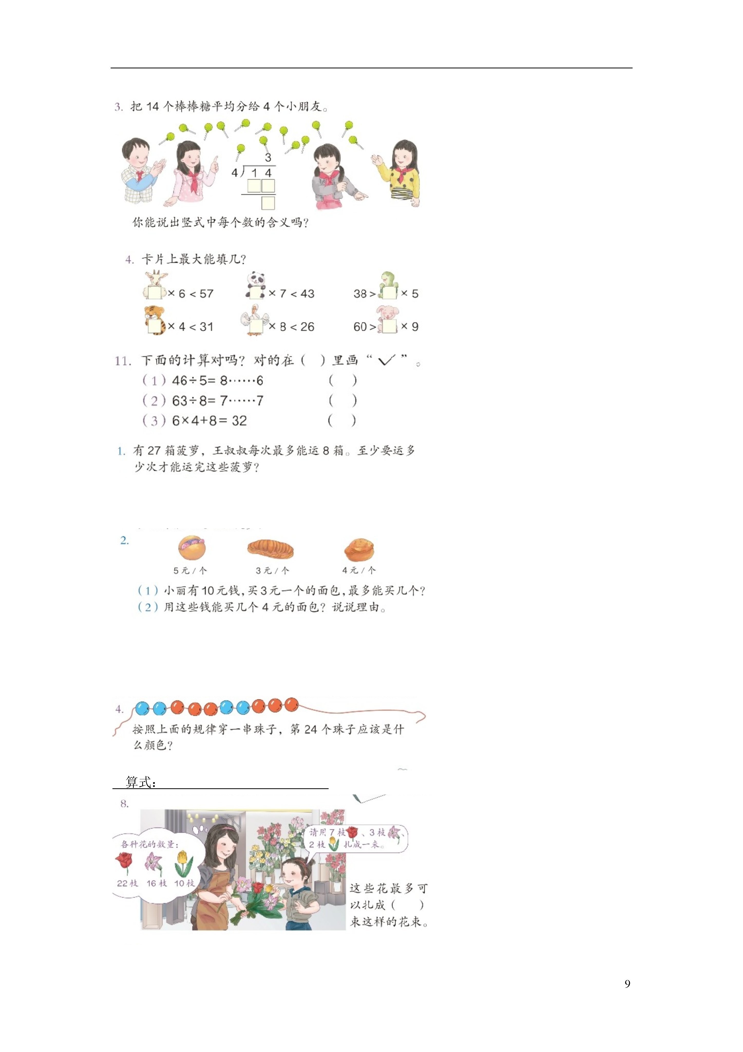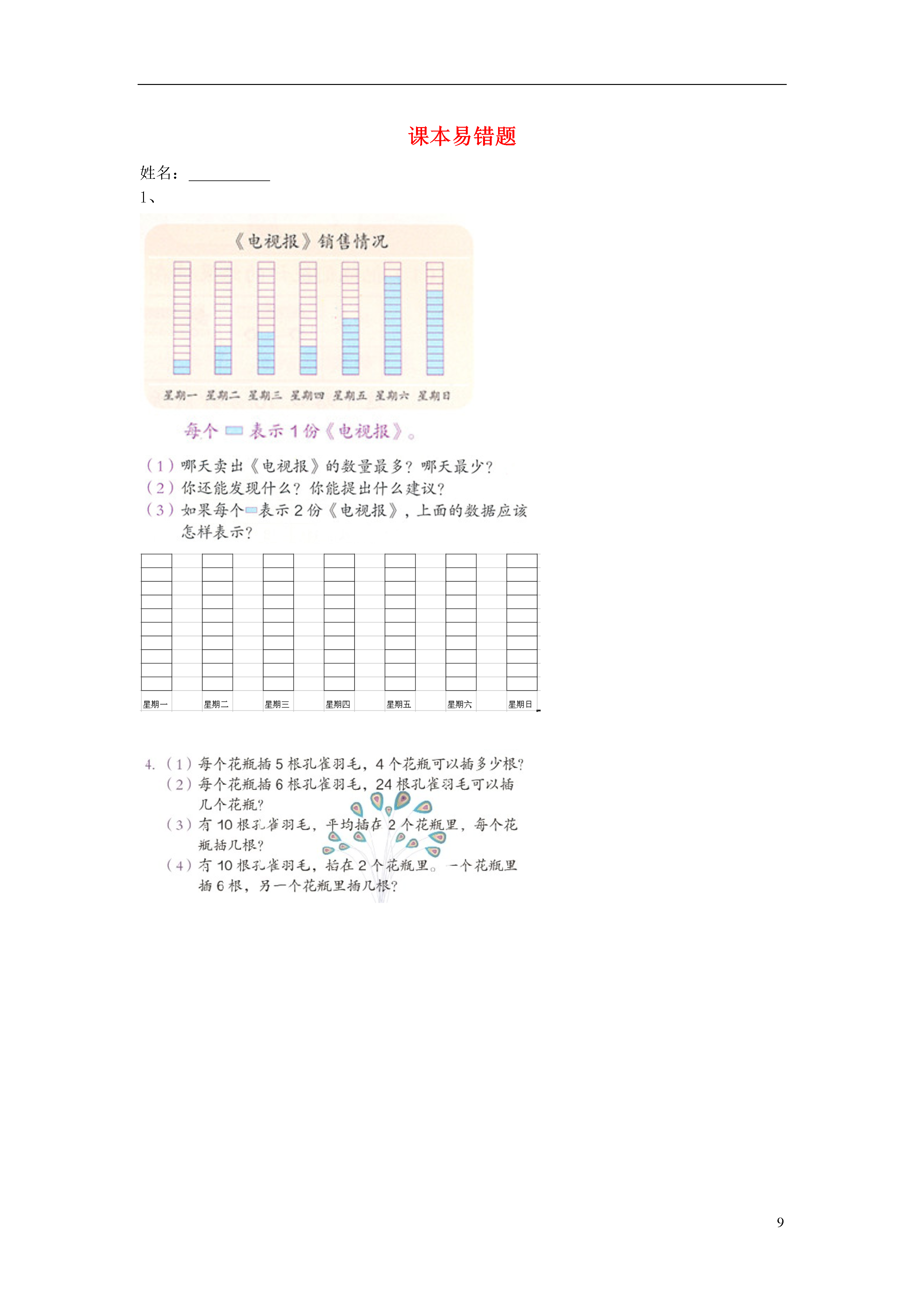 9课本易错题姓名:1、算式:(1)(2)(3)(1)(2)请写出来:买4千克西瓜多少钱?妈妈花了多少钱?小女孩花了多少钱?列式:列式;用0、0、3、5组成的只读一个零的四位数是(、),一个零都不读的四位数是()。在()里填上合适的单位。填合适的单位名称:一个乒乓球重1()。一袋洗衣粉重1()。一管牙膏重100()。一只鸡重2()。一位小朋友重23()。一个西瓜重3()。1、一共有40人划船。小船限乘4人,大船限乘6人。租6只大船,还需要再租几只小船?(分步列式计算)2、除数是8,商是4,余数是5,被除数是多少?3、小红从第1棵树跑到第9棵树,她一共跑了48米。每相邻两棵树之间相距多少米?