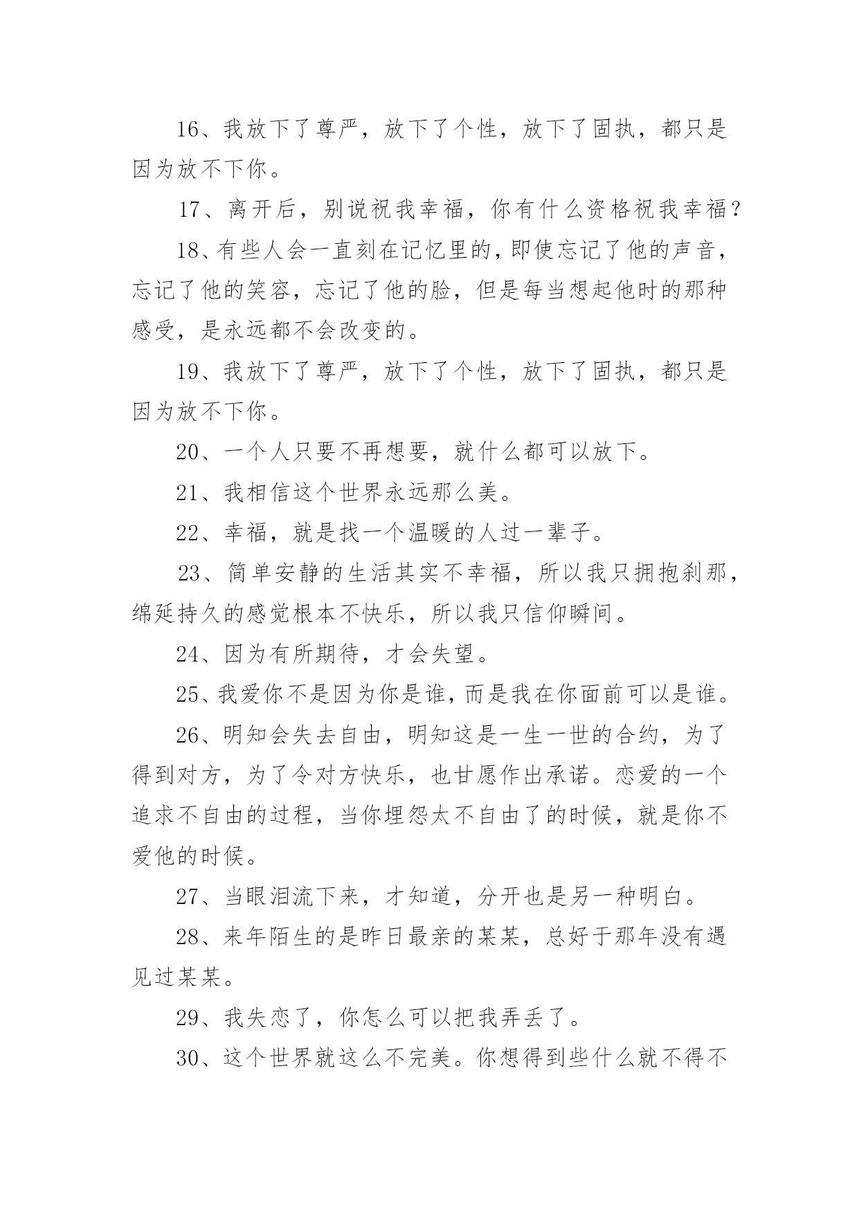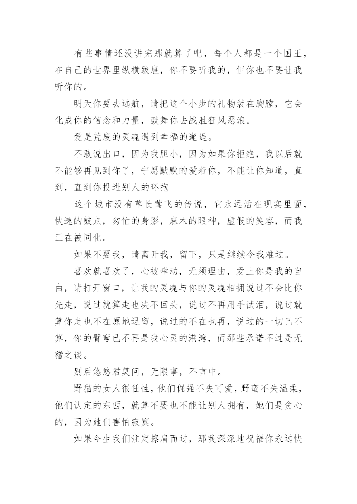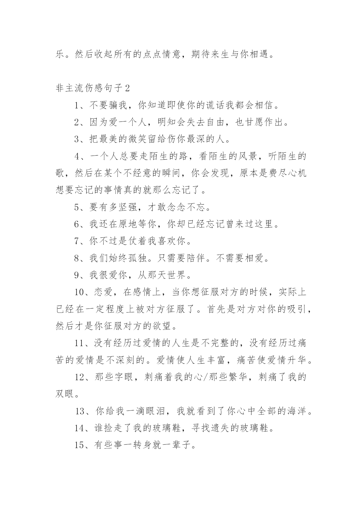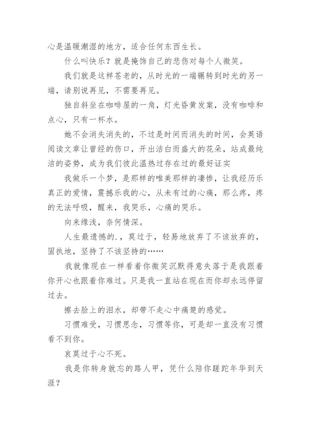 非主流伤感句子 【精】非主流伤感句子在平日的学习、工作和生活里,大家肯定对各类句子都很熟悉吧,借助句子,我们可以更好地表达。句子的类型多样,你所见过的句子是什么样的呢?以下是小编为大家整理的非主流伤感句子,仅供参考,大家一起来看看吧。非主流伤感句子1我没有月亮这个月亮是很多人的,但不是俺的。年轻时我们放弃,以为那只是一段感情,后来才知道,那其实是一生。离别伤,痛生根,默等一年复一年,烟柳飘渺独守愁,雾里清泪遮半容;红尘事,随风逝,静坐石凳是枯等,秋雨绵绵梦魂牵,丁花落尽人犹在。当快乐结束,冷漠开始,没有原因,不需要任何理由,大家都默默的遵守;单薄透明的玻璃,隔着两方世界,没有人反抗,没有人逃走。有点寂寞,有点痛,有点张扬,有点不知所措,有点需要安慰那么,点开它,有点美有些事一转身就一辈子。我喜欢现在的自己,我怀念过去的我们。伤口就像我一样,是个倔强的孩子,不肯愈合,因为内心是温暖潮湿的地方,适合任何东西生长。什么叫快乐?就是掩饰自己的悲伤对每个人微笑。我们就是这样苍老的,从时光的一端辗转到时光的另一端,请别说再见,不需要再见。独自斜坐在咖啡屋的一角,灯光昏黄发案,没有咖啡和点心,只有一杯水。她不会消失消失的,不过是时间而消失的时间,会英语阅读文章让曾经的伤口,开出洁白而盛大的花朵,站成最纯洁的姿势,成为我们彼此温热过存在过的最好证实我做乐一个梦,是那样的唯美那样的凄惨,让我经历乐真正的爱情,震撼乐我的心,从未有过的心痛,那么疼,疼的无法呼吸,醒来,我哭乐,心痛的哭乐。向来缘浅,奈何情深。人生最遗憾的.,莫过于,轻易地放弃了不该放弃的,固执地,坚持了不该坚持的……我就像现在一样看着你微笑沉默得意失落于是我跟着你开心也跟着你难过。只是我一直站在现在而你却永远停留过去。擦去脸上的泪水,却带不走心中痛楚的感觉。习惯难受,习惯思念,习惯等你,可是却一直没有习惯看不到你。哀莫过于心不死。我是你转身就忘的路人甲,凭什么陪你蹉跎年华到天涯?有些事情还没讲完那就算了吧,每个人都是一个国王,在自己的世界里纵横跋扈,你不要听我的,但你也不要让我听你的。明天你要去远航,请把这个小步的礼物装在胸膛,它会化成你的信念和力量,鼓舞你去战胜狂风恶浪。爱是荒废的灵魂遇到幸福的邂逅。不敢说出口,因为我胆小,因为如果你拒绝,我以后就不能够再见到你了,宁愿默默的爱着你,不能让你知道,直到,直到你投进别人的环抱这个城市没有草长莺飞的传说,它永远活在现实里面,快速的鼓点,匆忙的身影,麻木的眼神,虚假的笑容,而我正在被同化。如果不要我,请离开我,留下,只是继续令我难过。喜欢就喜欢了,心被牵动,无须理由,爱上你是我的自由,请打开窗口,让我的灵魂与你的灵魂相拥说过不会比你先走,说过就算走也决不回头,说过不再用手试泪,说过就算你走也不在原地逗留,说过的不在也再,说过的一切已不算,你的臂弯已不再是我心灵的港湾,而那些承诺不过是无稽之谈。别后悠悠君莫问,无限事,不言中。野猫的女人很任性,他们倔强不失可爱,野蛮不失温柔,他们认定的东西,就算不要也不能让别人拥有,她们是贪心的,因为她们害怕寂寞。如果今生我们注定擦肩而过,那我深深地祝福你永远快乐。然后收起所有的点点情意,期待来生与你相遇。非主流伤感句子21、不要骗我,你知道即使你的谎话我都会相信。2、因为爱一个人,明知会失去自由,也甘愿作出。3、把最美的微笑留给伤你最深的人。4、一个人总要走陌生的路,看陌生的风景,听陌生的歌,然后在某个不经意的瞬间,你会发现,原本是费尽心机想要忘记的事情真的就那么忘记了。5、要有多坚强,才敢念念不忘。6、我还在原地等你,你却已经忘记曾来过这里。7、你不过是仗着我喜欢你。8、我们始终孤独。只需要陪伴。不需要相爱。9、我很爱你,从那天世界。10、恋爱,在感情上,当你想征服对方的时候,实际上已经在一定程度上被对方征服了。首先是对方对你的吸引,然后才是你征服对方的欲望。11、没有经历过爱情的人生是不完整的,没有经历过痛苦的爱情是不深刻的。爱情使人生丰富,痛苦使爱情升华。12、那些字眼,刺痛着我的心/那些繁华,刺痛了我的双眼。13、你给我一滴眼泪,我就看到了你心中全部的海洋。14、谁捡走了我的玻璃鞋,寻找遗失的玻璃鞋。15、有些事一转身就一辈子。16、我放下了尊严,放下了个性,放下了固执,都只是因为放不下你。17、离开后,别说祝我幸福,你有什么资格祝我幸福?18、有些人会一直刻在记忆里的,即使忘记了他的声音,忘记了他的笑容,忘记了他的脸,但是每当想起他时的那种感受,是永远都不会改变的。19、我放下了尊严,放下了个性,放下了固执,都只是因为放不下你。20、一个人只要不再想要,就什么都可以放下。21、我相信这个世界永远那么美。22、幸福,就是找一个温暖的人过一辈子。23、简单安静的生活其实不幸福,所以我只拥抱刹那,