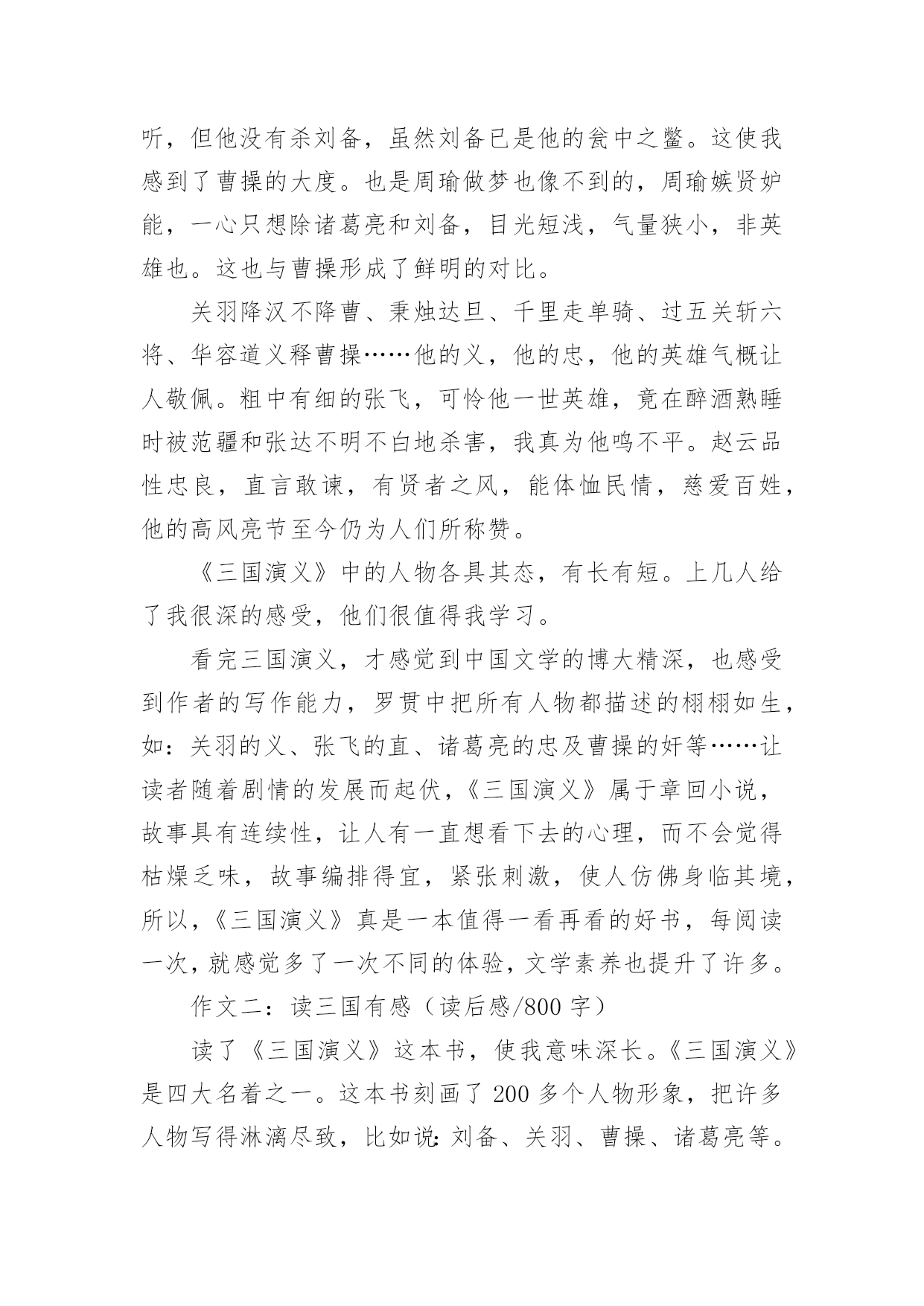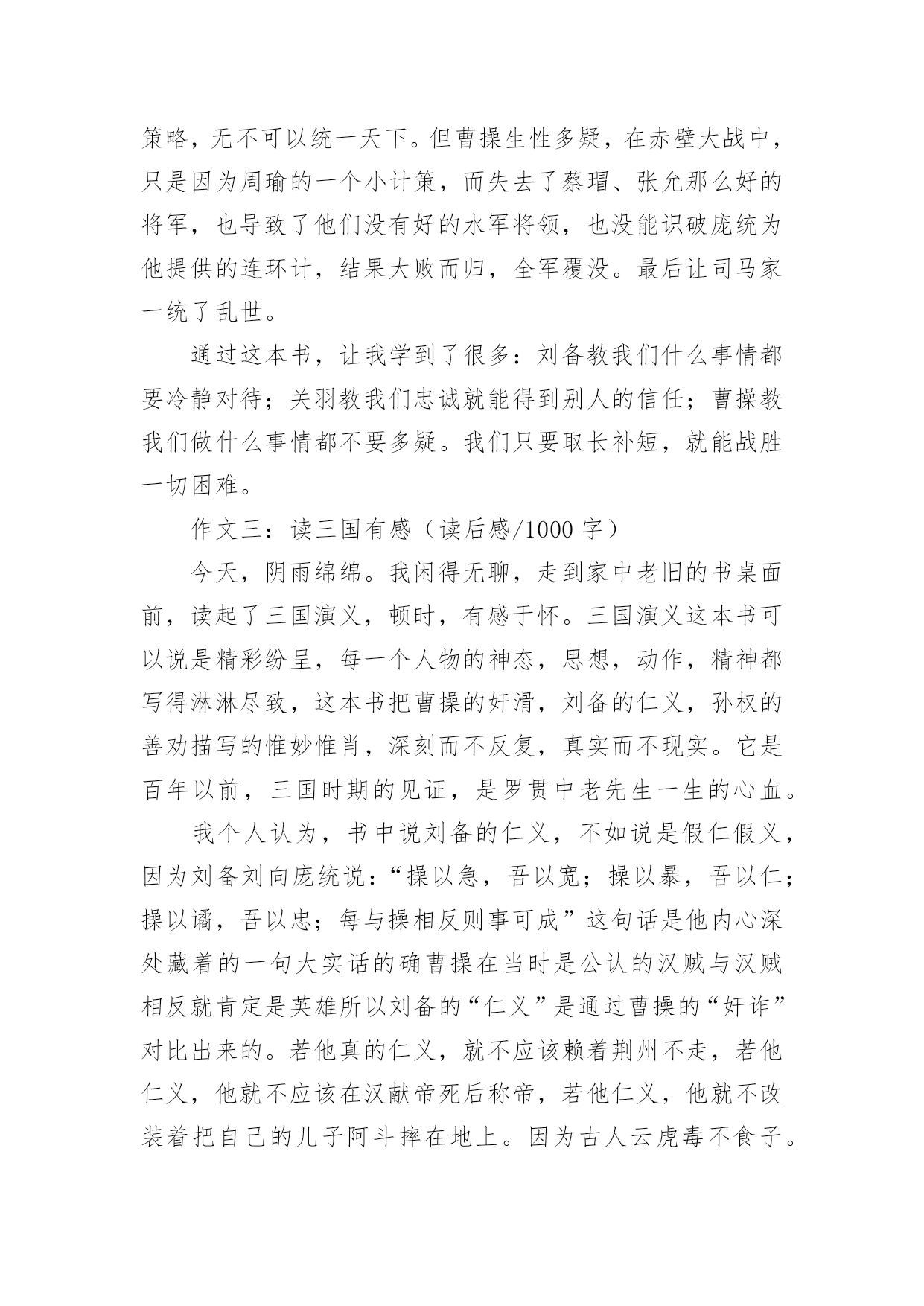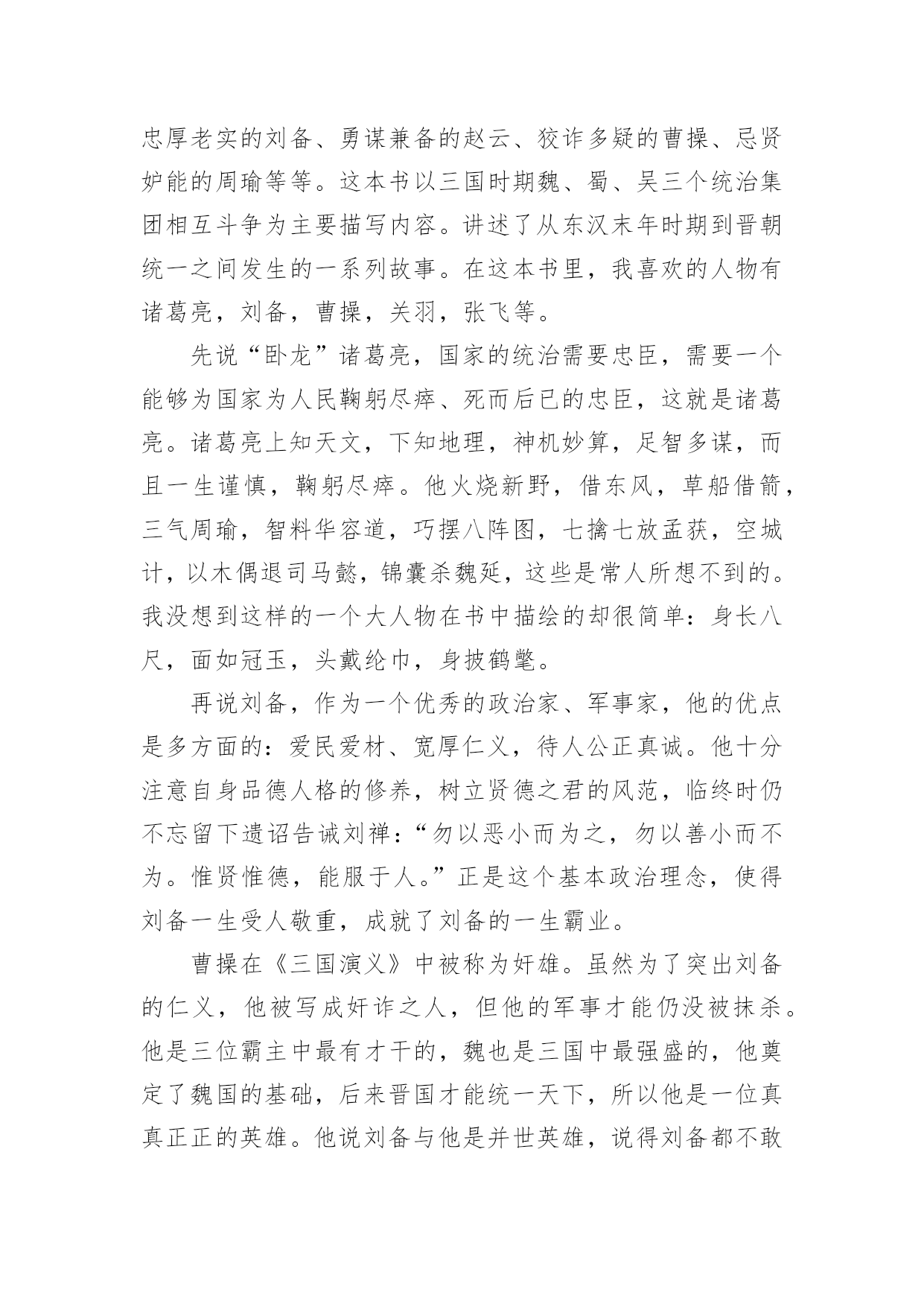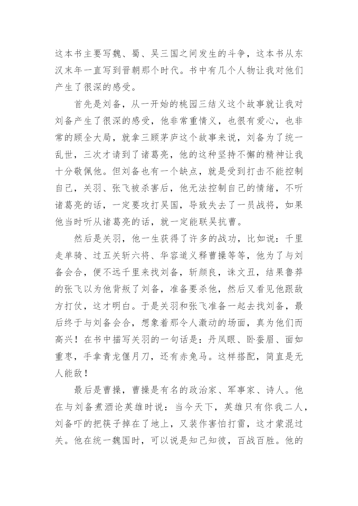 最新读三国有感作文 最新读三国有感作文编者按:如果大家觉得内容不错,记得分享给你的小伙伴们哦!内容简介:“滚滚长江东逝水,浪花淘尽英雄。是非成败转头空。青山依旧在,几度夕阳红。白发渔樵江渚上,惯看秋月春风...有兴趣就读继续看完以下内容吧!以下是由小编推荐的《最新读三国有感作文》,欢迎大家阅读交流!作文一:读三国有感(读后感/1000字)“滚滚长江东逝水,浪花淘尽英雄。是非成败转头空。青山依旧在,几度夕阳红。白发渔樵江渚上,惯看秋月春风。一壶浊酒喜相逢。古今多少事,都付笑谈中。”提起这首词,人们都会想到四大名着之一的《三国演义》。《三国演义》,全名是《三国志通俗演义》,是明代文学家罗贯中编着而成的。由题目可知,这部小说是依据《三国志》写的,但是不像正史那样庄重,而是古代的白话文小说。长长的假期终于让我再一次啃完了它——罗贯中的《三国演义》,虽然在小学时就已看过它一两遍,但都是粗略的阅读,没有细细品味,自然也就没什么收获,现在细细地品味文章内容,觉得这真是一本值得一看再看的好书。《三国演义》刻划了近200个人物形象,其中最为成功的有足智多谋的诸葛亮、义胆忠肝的关羽、粗中有细的张飞、忠厚老实的刘备、勇谋兼备的赵云、狡诈多疑的曹操、忌贤妒能的周瑜等等。这本书以三国时期魏、蜀、吴三个统治集团相互斗争为主要描写内容。讲述了从东汉末年时期到晋朝统一之间发生的一系列故事。在这本书里,我喜欢的人物有诸葛亮,刘备,曹操,关羽,张飞等。先说“卧龙”诸葛亮,国家的统治需要忠臣,需要一个能够为国家为人民鞠躬尽瘁、死而后已的忠臣,这就是诸葛亮。诸葛亮上知天文,下知地理,神机妙算,足智多谋,而且一生谨慎,鞠躬尽瘁。他火烧新野,借东风,草船借箭,三气周瑜,智料华容道,巧摆八阵图,七擒七放孟获,空城计,以木偶退司马懿,锦囊杀魏延,这些是常人所想不到的。我没想到这样的一个大人物在书中描绘的却很简单:身长八尺,面如冠玉,头戴纶巾,身披鹤氅。再说刘备,作为一个优秀的政治家、军事家,他的优点是多方面的:爱民爱材、宽厚仁义,待人公正真诚。他十分注意自身品德人格的修养,树立贤德之君的风范,临终时仍不忘留下遗诏告诫刘禅:“勿以恶小而为之,勿以善小而不为。惟贤惟德,能服于人。”正是这个基本政治理念,使得刘备一生受人敬重,成就了刘备的一生霸业。曹操在《三国演义》中被称为奸雄。虽然为了突出刘备的仁义,他被写成奸诈之人,但他的军事才能仍没被抹杀。他是三位霸主中最有才干的,魏也是三国中最强盛的,他奠定了魏国的基础,后来晋国才能统一天下,所以他是一位真真正正的英雄。他说刘备与他是并世英雄,说得刘备都不敢听,但他没有杀刘备,虽然刘备已是他的瓮中之鳖。这使我感到了曹操的大度。也是周瑜做梦也像不到的,周瑜嫉贤妒能,一心只想除诸葛亮和刘备,目光短浅,气量狭小,非英雄也。这也与曹操形成了鲜明的对比。关羽降汉不降曹、秉烛达旦、千里走单骑、过五关斩六将、华容道义释曹操……他的义,他的忠,他的英雄气概让人敬佩。粗中有细的张飞,可怜他一世英雄,竟在醉酒熟睡时被范疆和张达不明不白地杀害,我真为他鸣不平。赵云品性忠良,直言敢谏,有贤者之风,能体恤民情,慈爱百姓,他的高风亮节至今仍为人们所称赞。《三国演义》中的人物各具其态,有长有短。上几人给了我很深的感受,他们很值得我学习。看完三国演义,才感觉到中国文学的博大精深,也感受到作者的写作能力,罗贯中把所有人物都描述的栩栩如生,如:关羽的义、张飞的直、诸葛亮的忠及曹操的奸等……让读者随着剧情的发展而起伏,《三国演义》属于章回小说,故事具有连续性,让人有一直想看下去的心理,而不会觉得枯燥乏味,故事编排得宜,紧张刺激,使人仿佛身临其境,所以,《三国演义》真是一本值得一看再看的好书,每阅读一次,就感觉多了一次不同的体验,文学素养也提升了许多。作文二:读三国有感(读后感/800字)读了《三国演义》这本书,使我意味深长。《三国演义》是四大名着之一。这本书刻画了200多个人物形象,把许多人物写得淋漓尽致,比如说:刘备、关羽、曹操、诸葛亮等。这本书主要写魏、蜀、吴三国之间发生的斗争,这本书从东汉末年一直写到晋朝那个时代。书中有几个人物让我对他们产生了很深的感受。首先是刘备,从一开始的桃园三结义这个故事就让我对刘备产生了很深的感受,他非常重情义,也很有爱心,也非常的顾全大局,就拿三顾茅庐这个故事来说,刘备为了统一乱世,三次才请到了诸葛亮,他的这种坚持不懈的精神让我十分敬佩他。但刘备也有一个缺点,就是受到打击不能控制自己,关羽、张飞被杀害后,他无法控制自己的情绪,不听诸葛亮的话,一定要攻打吴国,导致失去了一员战将,如果他当时听从诸葛亮的话,就一定能联吴抗曹。然后是关羽,他一生获得了许多的战功,比如说:千里走单骑、过五关斩六将、华容道义释曹操等等,他为了与刘备会合,便不远千里来找