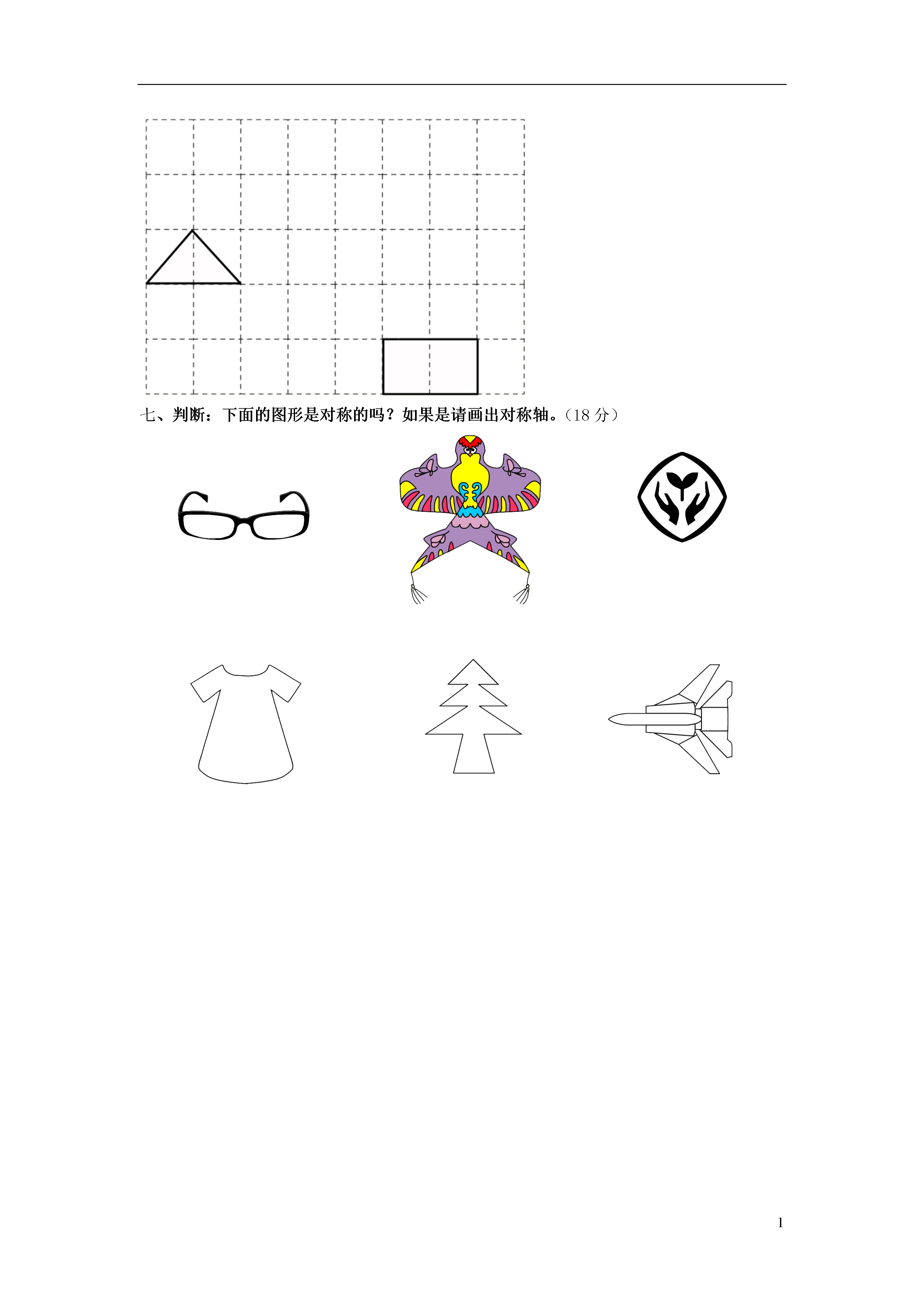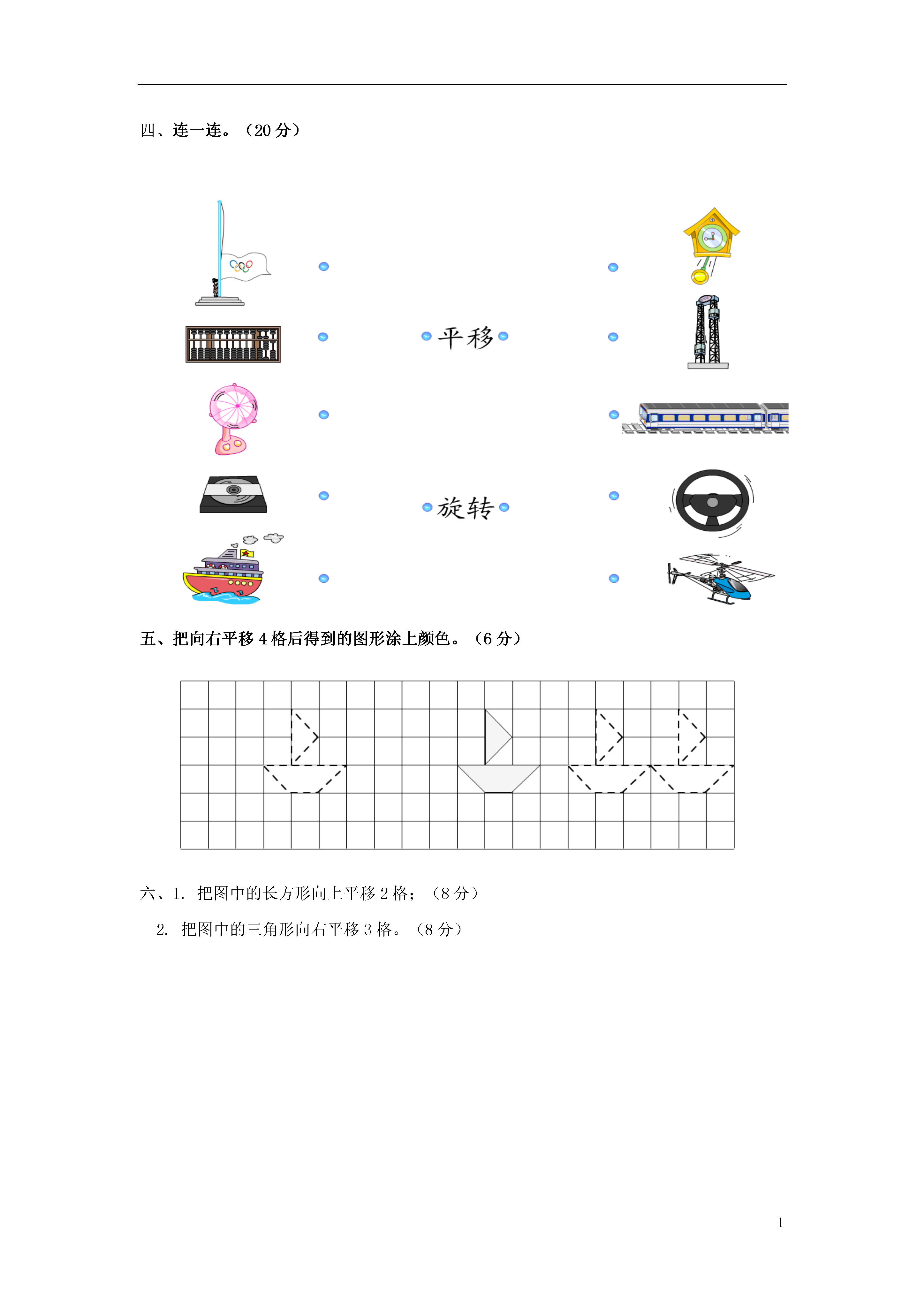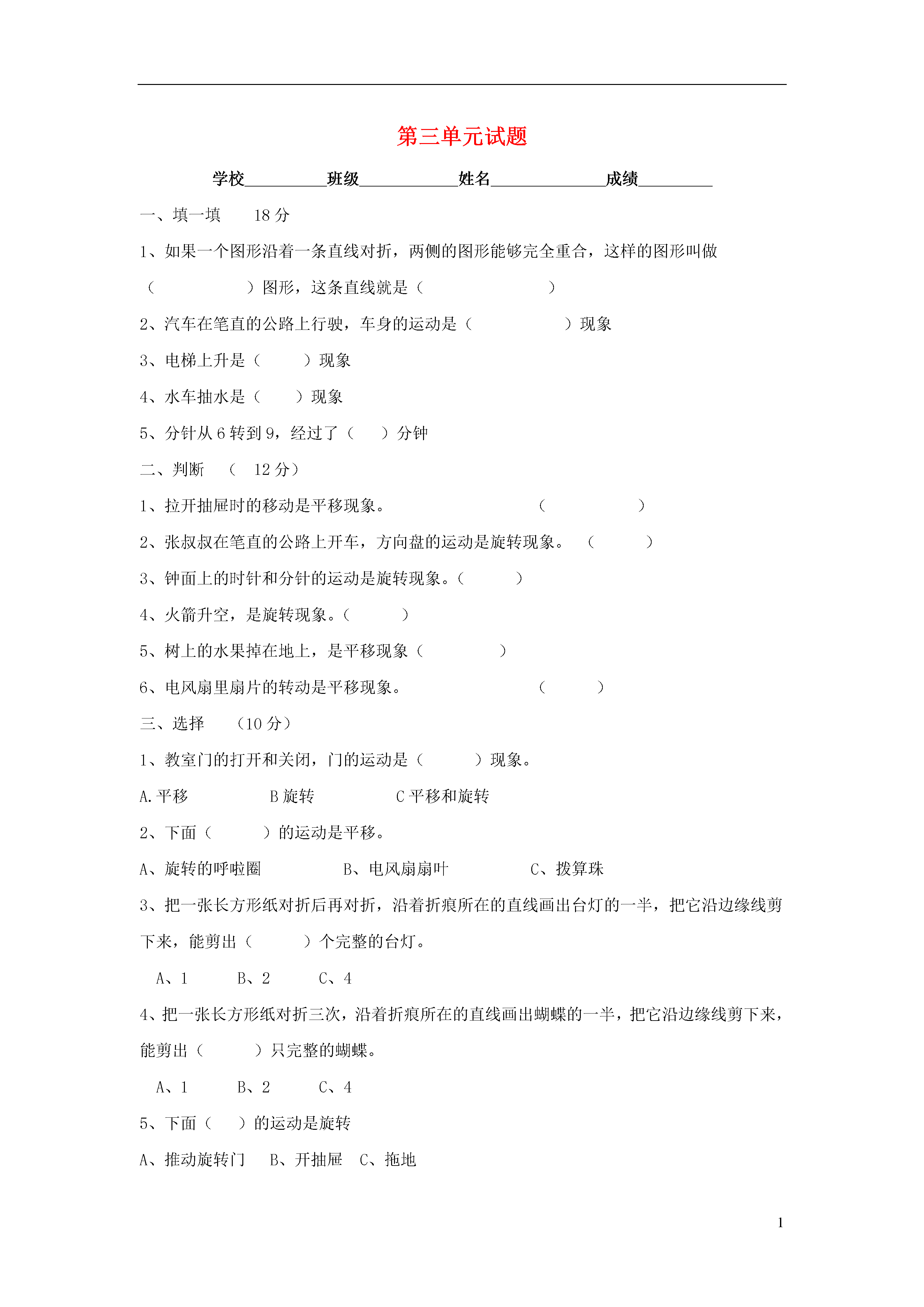 1第三单元试题学校__________班级____________姓名______________成绩_________一、填一填18分1、如果一个图形沿着一条直线对折,两侧的图形能够完全重合,这样的图形叫做()图形,这条直线就是()2、汽车在笔直的公路上行驶,车身的运动是()现象3、电梯上升是()现象4、水车抽水是()现象5、分针从6转到9,经过了()分钟二、判断(12分)1、拉开抽屉时的移动是平移现象。()2、张叔叔在笔直的公路上开车,方向盘的运动是旋转现象。()3、钟面上的时针和分针的运动是旋转现象。()4、火箭升空,是旋转现象。()5、树上的水果掉在地上,是平移现象()6、电风扇里扇片的转动是平移现象。()三、选择(10分)1、教室门的打开和关闭,门的运动是()现象。A.平移B旋转C平移和旋转2、下面()的运动是平移。A、旋转的呼啦圈B、电风扇扇叶C、拨算珠3、把一张长方形纸对折后再对折,沿着折痕所在的直线画出台灯的一半,把它沿边缘线剪下来,能剪出()个完整的台灯。A、1B、2C、44、把一张长方形纸对折三次,沿着折痕所在的直线画出蝴蝶的一半,把它沿边缘线剪下来,能剪出()只完整的蝴蝶。A、1B、2C、45、下面()的运动是旋转A、推动旋转门B、开抽屉C、拖地四、连一连。(20分)五、把向右平移4格后得到的图形涂上颜色。(6分)六、1.把图中的长方形向上平移2格;(8分)2.把图中的三角形向右平移3格。(8分)七、判断:下面的图形是对称的吗?如果是请画出对称轴。(18分)