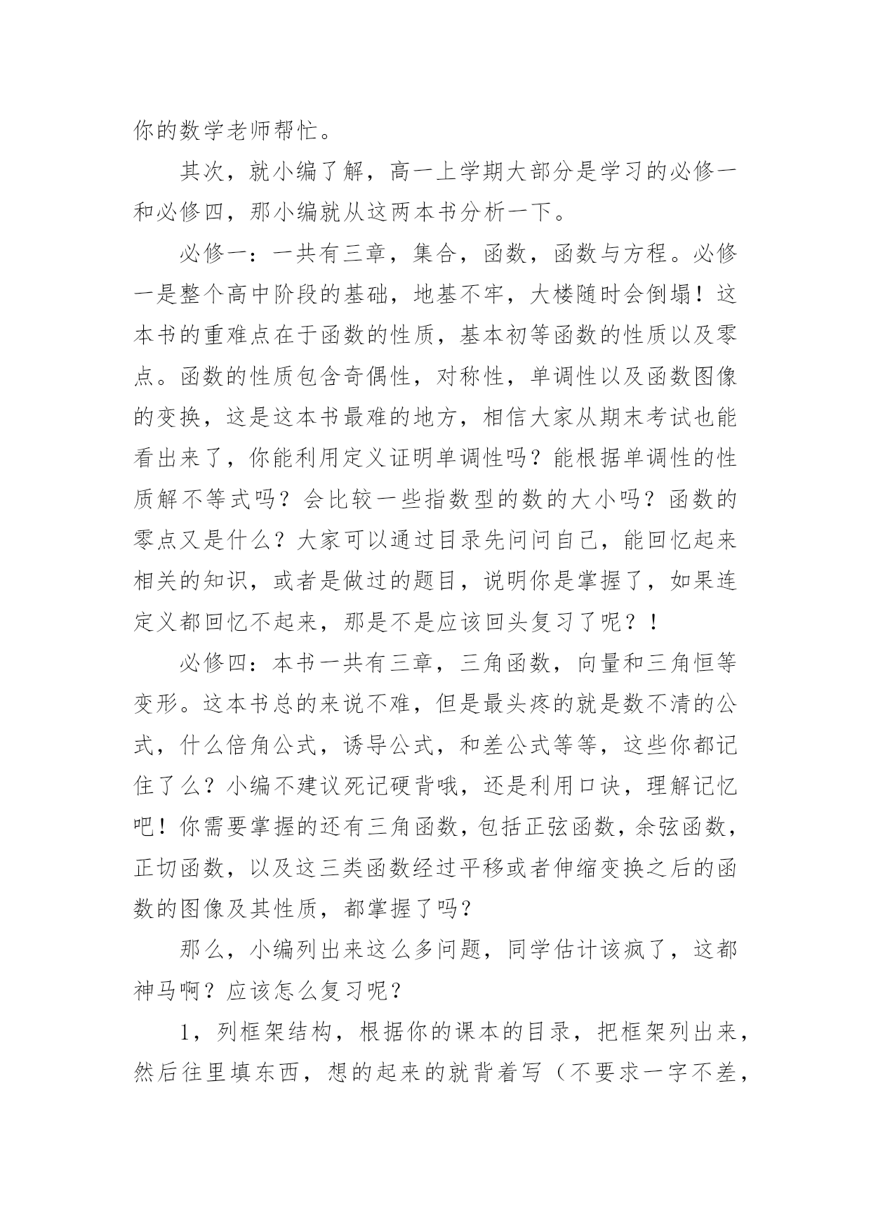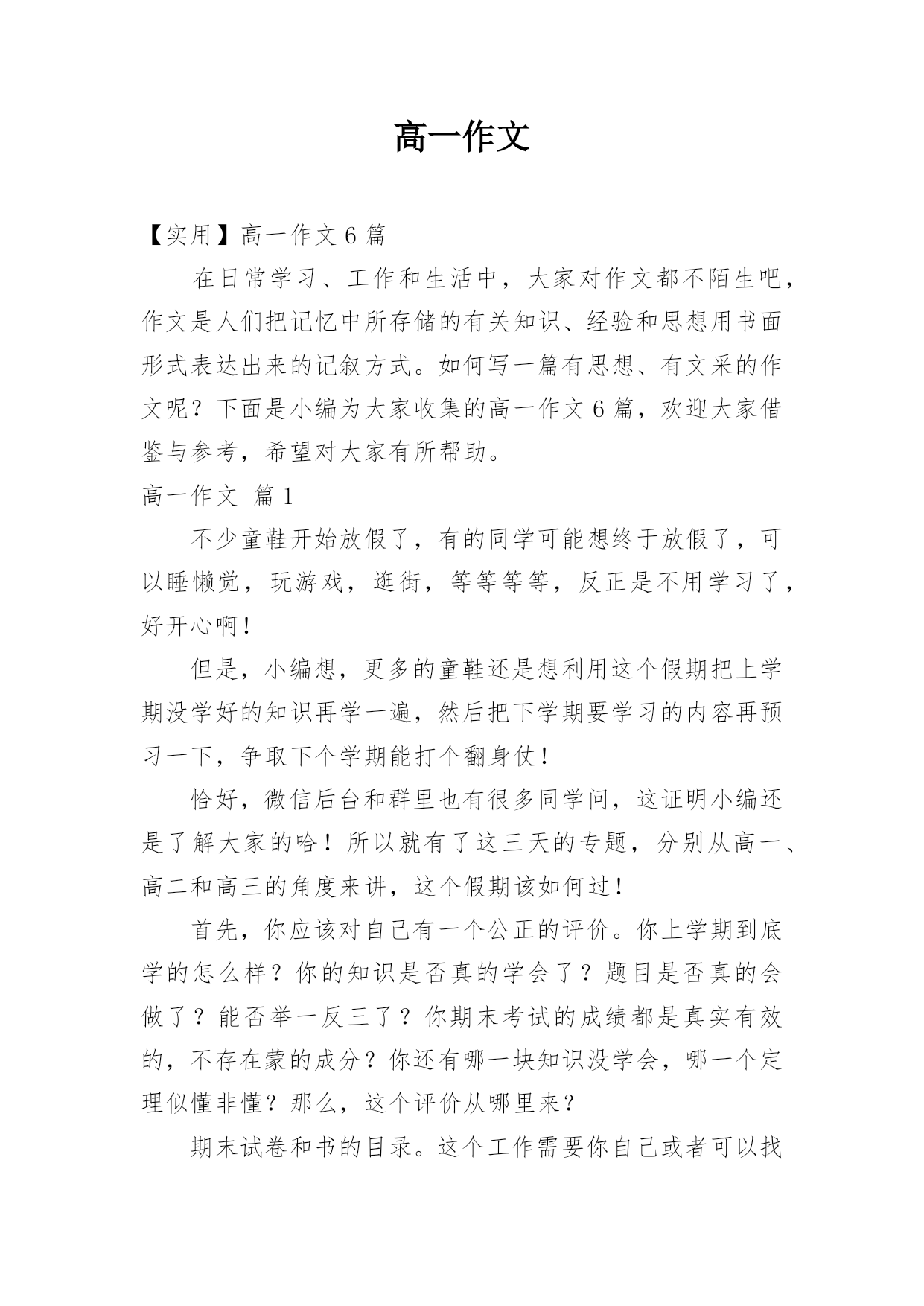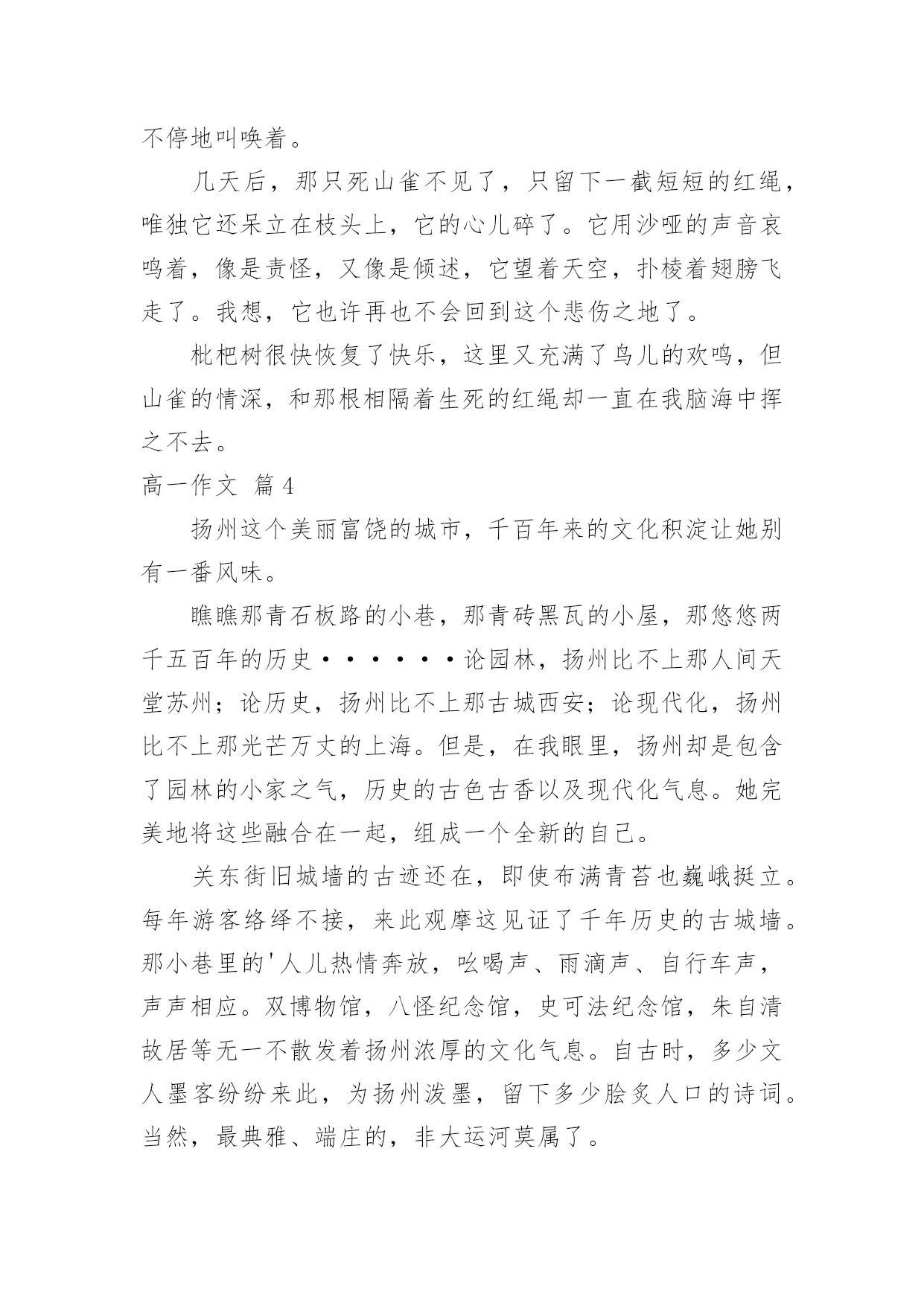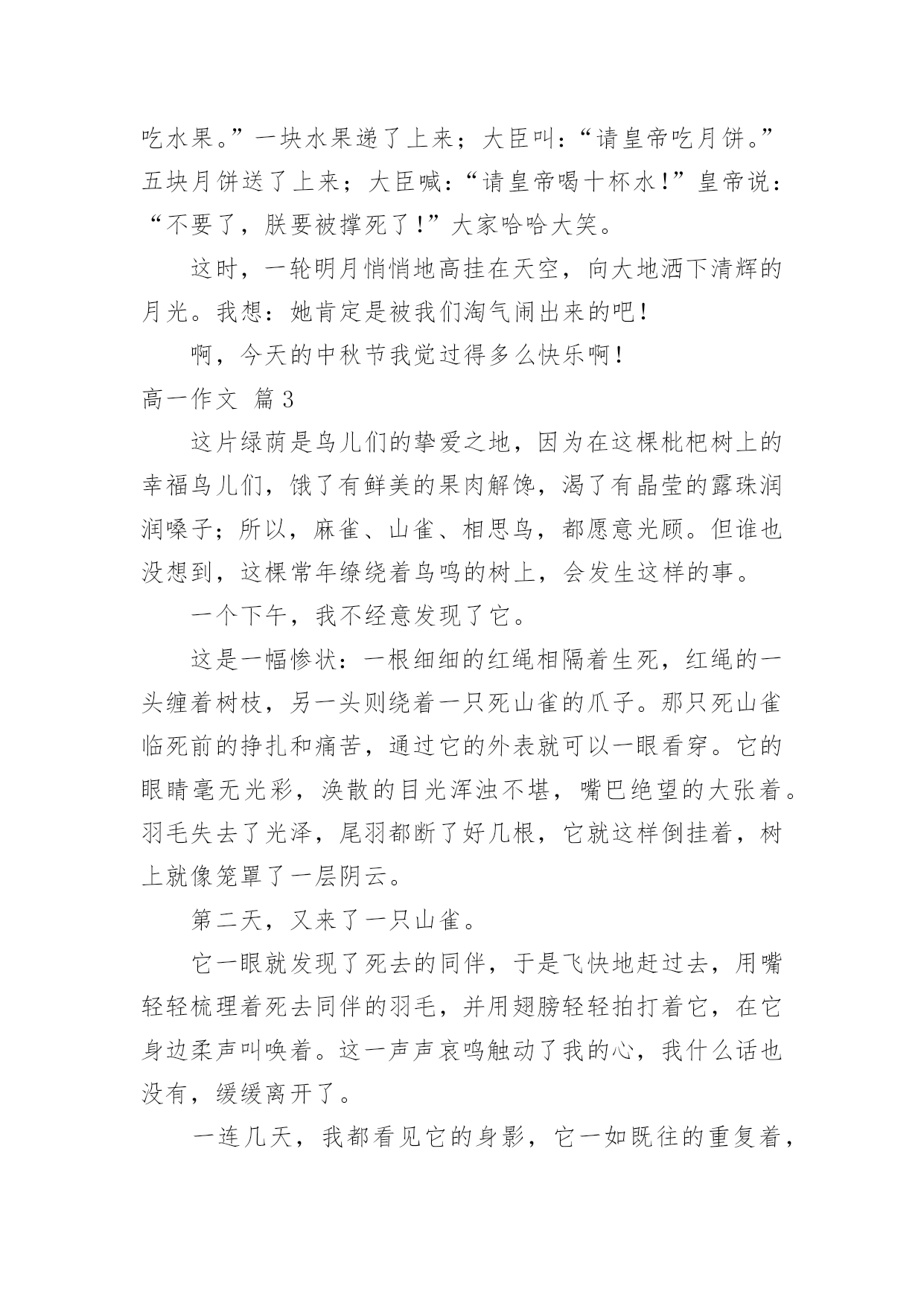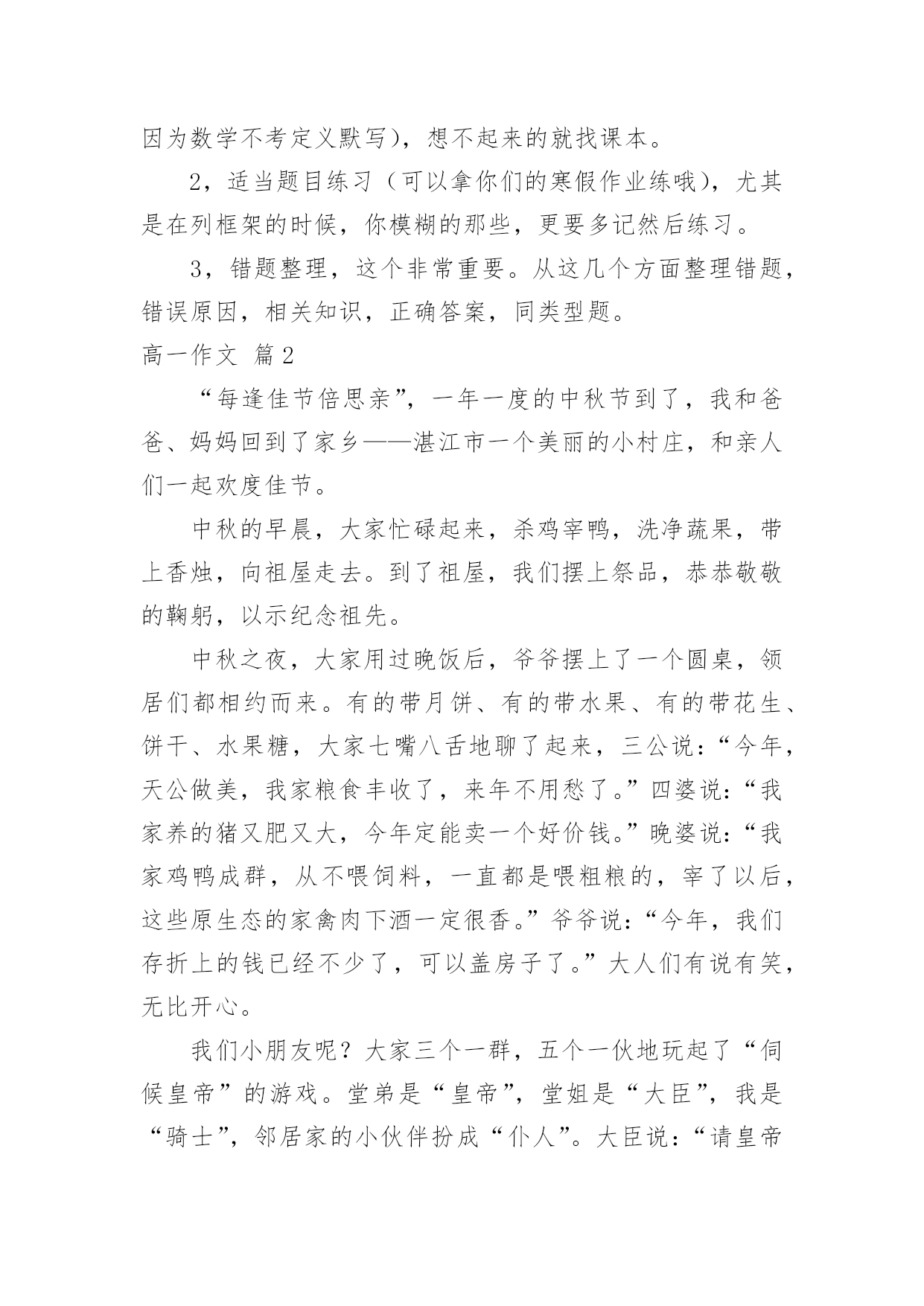 高一作文 【实用】高一作文6篇在日常学习、工作和生活中,大家对作文都不陌生吧,作文是人们把记忆中所存储的有关知识、经验和思想用书面形式表达出来的记叙方式。如何写一篇有思想、有文采的作文呢?下面是小编为大家收集的高一作文6篇,欢迎大家借鉴与参考,希望对大家有所帮助。高一作文篇1不少童鞋开始放假了,有的同学可能想终于放假了,可以睡懒觉,玩游戏,逛街,等等等等,反正是不用学习了,好开心啊!但是,小编想,更多的童鞋还是想利用这个假期把上学期没学好的知识再学一遍,然后把下学期要学习的内容再预习一下,争取下个学期能打个翻身仗!恰好,微信后台和群里也有很多同学问,这证明小编还是了解大家的哈!所以就有了这三天的专题,分别从高一、高二和高三的角度来讲,这个假期该如何过!首先,你应该对自己有一个公正的评价。你上学期到底学的怎么样?你的知识是否真的学会了?题目是否真的会做了?能否举一反三了?你期末考试的成绩都是真实有效的,不存在蒙的成分?你还有哪一块知识没学会,哪一个定理似懂非懂?那么,这个评价从哪里来?期末试卷和书的目录。这个工作需要你自己或者可以找你的数学老师帮忙。其次,就小编了解,高一上学期大部分是学习的必修一和必修四,那小编就从这两本书分析一下。必修一:一共有三章,集合,函数,函数与方程。必修一是整个高中阶段的基础,地基不牢,大楼随时会倒塌!这本书的重难点在于函数的性质,基本初等函数的性质以及零点。函数的性质包含奇偶性,对称性,单调性以及函数图像的变换,这是这本书最难的地方,相信大家从期末考试也能看出来了,你能利用定义证明单调性吗?能根据单调性的性质解不等式吗?会比较一些指数型的数的大小吗?函数的零点又是什么?大家可以通过目录先问问自己,能回忆起来相关的知识,或者是做过的题目,说明你是掌握了,如果连定义都回忆不起来,那是不是应该回头复习了呢?!必修四:本书一共有三章,三角函数,向量和三角恒等变形。这本书总的来说不难,但是最头疼的就是数不清的公式,什么倍角公式,诱导公式,和差公式等等,这些你都记住了么?小编不建议死记硬背哦,还是利用口诀,理解记忆吧!你需要掌握的还有三角函数,包括正弦函数,余弦函数,正切函数,以及这三类函数经过平移或者伸缩变换之后的函数的图像及其性质,都掌握了吗?那么,小编列出来这么多问题,同学估计该疯了,这都神马啊?应该怎么复习呢?1,列框架结构,根据你的课本的目录,把框架列出来,然后往里填东西,想的起来的就背着写(不要求一字不差,因为数学不考定义默写),想不起来的就找课本。2,适当题目练习(可以拿你们的寒假作业练哦),尤其是在列框架的时候,你模糊的那些,更要多记然后练习。3,错题整理,这个非常重要。从这几个方面整理错题,错误原因,相关知识,正确答案,同类型题。高一作文篇2“每逢佳节倍思亲”,一年一度的中秋节到了,我和爸爸、妈妈回到了家乡——湛江市一个美丽的小村庄,和亲人们一起欢度佳节。中秋的早晨,大家忙碌起来,杀鸡宰鸭,洗净蔬果,带上香烛,向祖屋走去。到了祖屋,我们摆上祭品,恭恭敬敬的鞠躬,以示纪念祖先。中秋之夜,大家用过晚饭后,爷爷摆上了一个圆桌,领居们都相约而来。有的带月饼、有的带水果、有的带花生、饼干、水果糖,大家七嘴八舌地聊了起来,三公说:“今年,天公做美,我家粮食丰收了,来年不用愁了。”四婆说:“我家养的猪又肥又大,今年定能卖一个好价钱。”晚婆说:“我家鸡鸭成群,从不喂饲料,一直都是喂粗粮的,宰了以后,这些原生态的家禽肉下酒一定很香。”爷爷说:“今年,我们存折上的钱已经不少了,可以盖房子了。”大人们有说有笑,无比开心。我们小朋友呢?大家三个一群,五个一伙地玩起了“伺候皇帝”的游戏。堂弟是“皇帝”,堂姐是“大臣”,我是“骑士”,邻居家的小伙伴扮成“仆人”。大臣说:“请皇帝吃水果。”一块水果递了上来;大臣叫:“请皇帝吃月饼。”五块月饼送了上来;大臣喊:“请皇帝喝十杯水!”皇帝说:“不要了,朕要被撑死了!”大家哈哈大笑。这时,一轮明月悄悄地高挂在天空,向大地洒下清辉的月光。我想:她肯定是被我们淘气闹出来的吧!啊,今天的中秋节我觉过得多么快乐啊!高一作文篇3这片绿荫是鸟儿们的挚爱之地,因为在这棵枇杷树上的幸福鸟儿们,饿了有鲜美的果肉解馋,渴了有晶莹的露珠润润嗓子;所以,麻雀、山雀、相思鸟,都愿意光顾。但谁也没想到,这棵常年缭绕着鸟鸣的树上,会发生这样的事。一个下午,我不经意发现了它。这是一幅惨状:一根细细的红绳相隔着生死,红绳的一头缠着树枝,另一头则绕着一只死山雀的爪子。那只死山雀临死前的挣扎和痛苦,通过它的外表就可以一眼看穿。它的眼睛毫无光彩,涣散的目光浑浊不堪,嘴巴绝望的大张着。羽毛失去了光泽,尾羽都断了好几根,它就这样倒挂着,树上就像笼罩了一层阴云。第二天,又来了一只山雀。它一眼就发现了死去的同伴,于是飞快地赶过