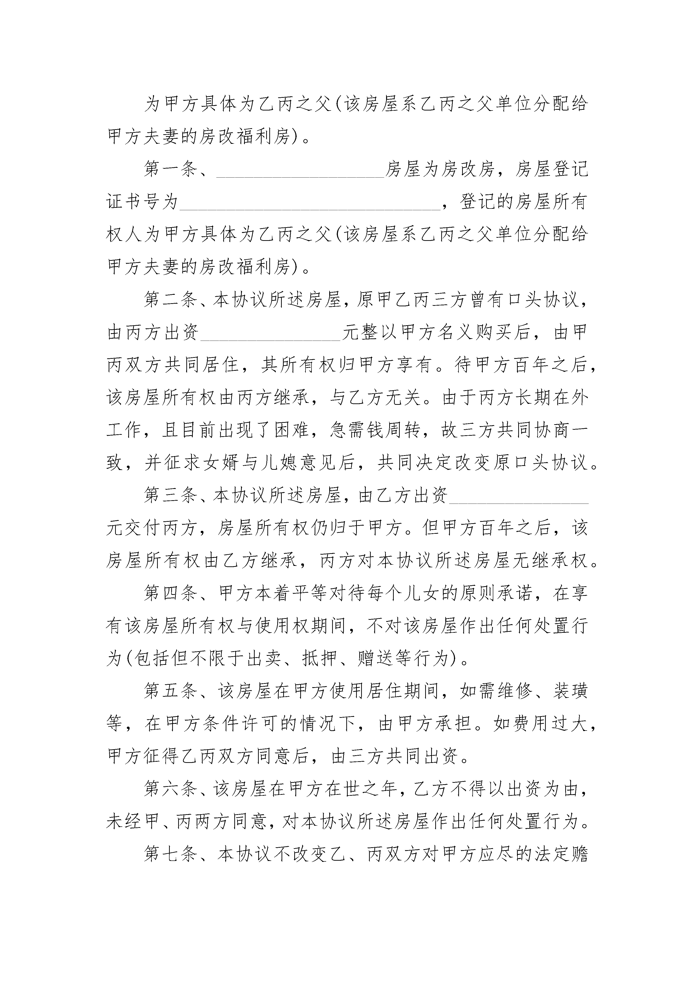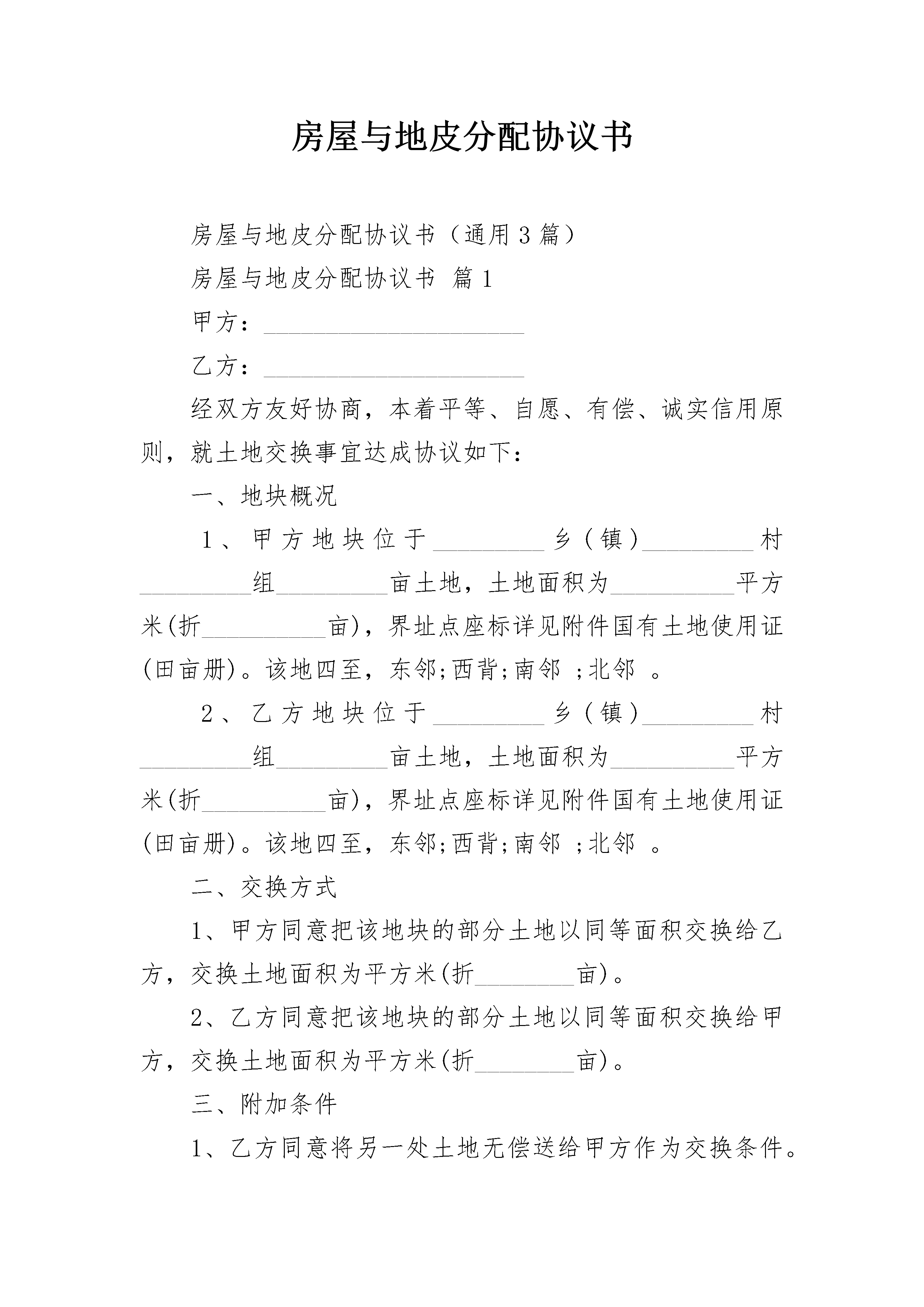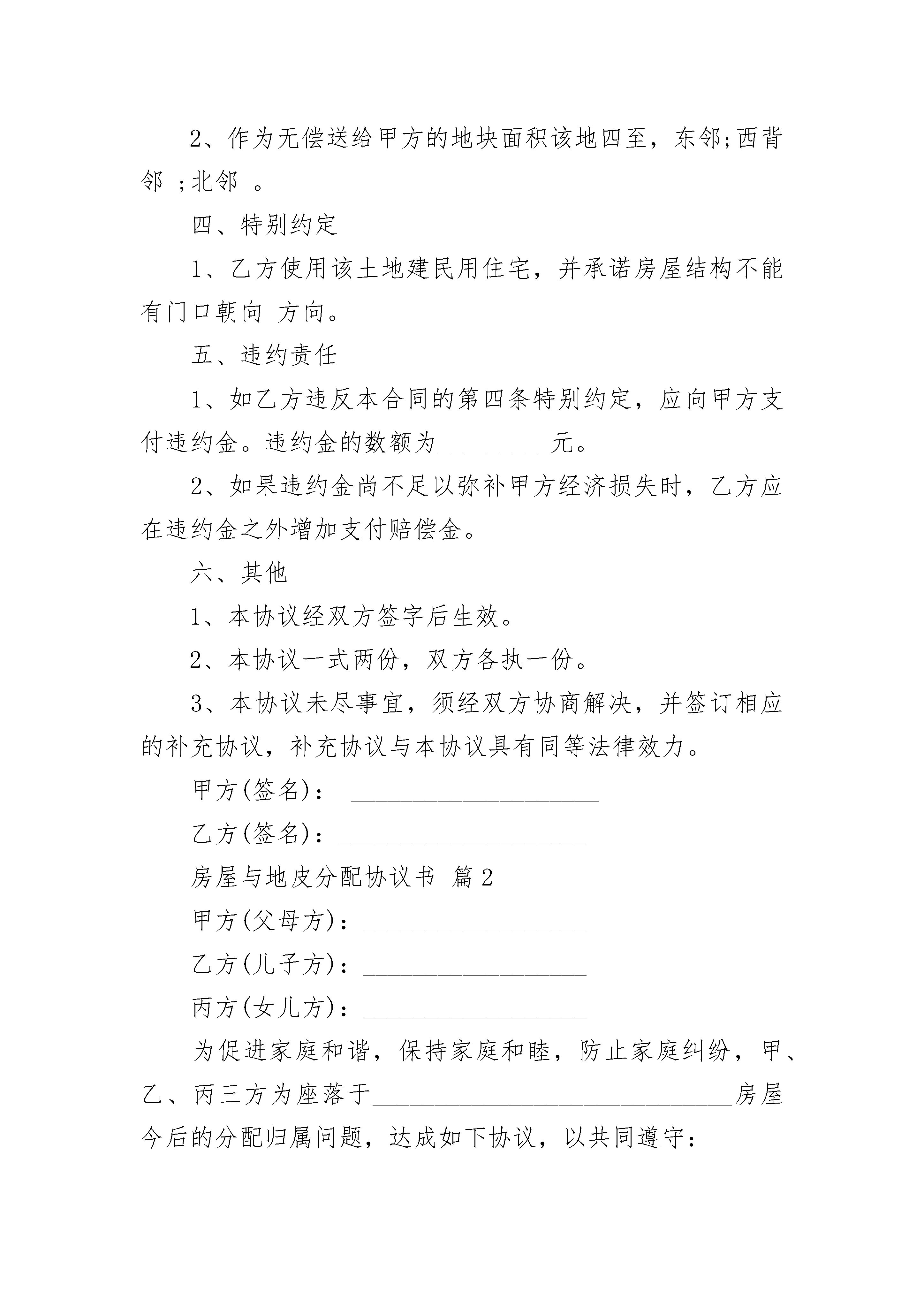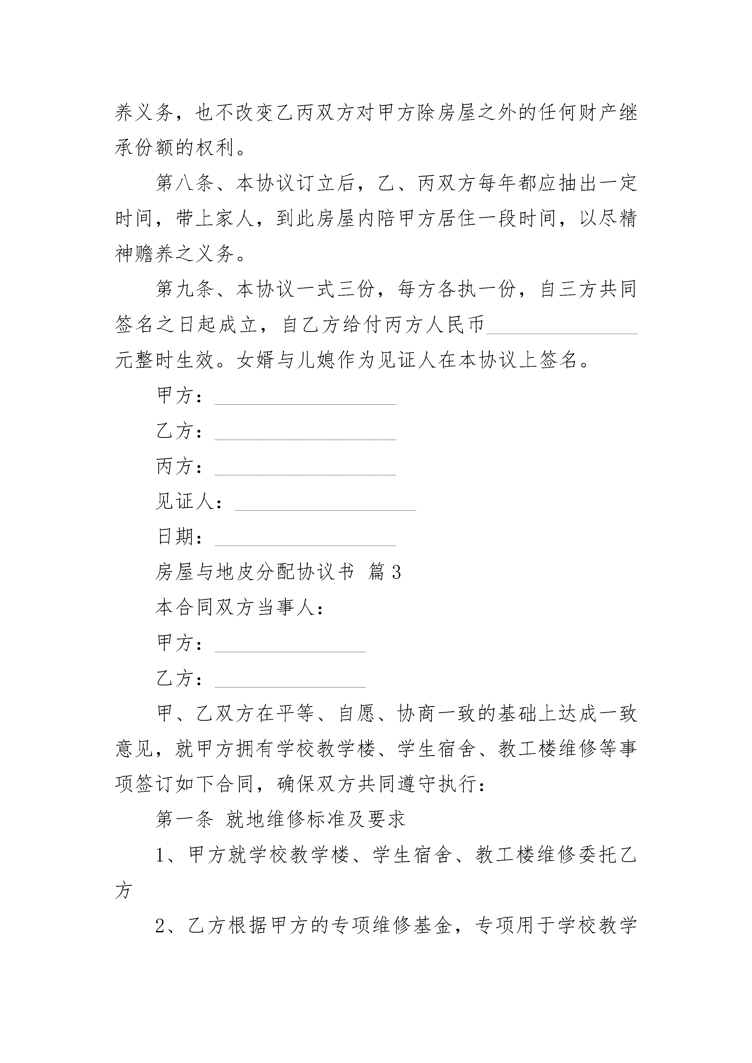 房屋与地皮分配协议书房屋与地皮分配协议书(通用3篇)房屋与地皮分配协议书篇1甲方:_____________________乙方:_____________________经双方友好协商,本着平等、自愿、有偿、诚实信用原则,就土地交换事宜达成协议如下:一、地块概况1、甲方地块位于_________乡(镇)_________村_________组_________亩土地,土地面积为__________平方米(折__________亩),界址点座标详见附件国有土地使用证(田亩册)。该地四至,东邻;西背;南邻;北邻。2、乙方地块位于_________乡(镇)_________村_________组_________亩土地,土地面积为__________平方米(折__________亩),界址点座标详见附件国有土地使用证(田亩册)。该地四至,东邻;西背;南邻;北邻。二、交换方式1、甲方同意把该地块的部分土地以同等面积交换给乙方,交换土地面积为平方米(折________亩)。2、乙方同意把该地块的部分土地以同等面积交换给甲方,交换土地面积为平方米(折________亩)。三、附加条件1、乙方同意将另一处土地无偿送给甲方作为交换条件。2、作为无偿送给甲方的地块面积该地四至,东邻;西背邻;北邻。四、特别约定1、乙方使用该土地建民用住宅,并承诺房屋结构不能有门口朝向方向。五、违约责任1、如乙方违反本合同的第四条特别约定,应向甲方支付违约金。违约金的数额为_________元。2、如果违约金尚不足以弥补甲方经济损失时,乙方应在违约金之外增加支付赔偿金。六、其他1、本协议经双方签字后生效。2、本协议一式两份,双方各执一份。3、本协议未尽事宜,须经双方协商解决,并签订相应的补充协议,补充协议与本协议具有同等法律效力。甲方(签名):____________________乙方(签名):____________________房屋与地皮分配协议书篇2甲方(父母方):__________________乙方(儿子方):__________________丙方(女儿方):__________________为促进家庭和谐,保持家庭和睦,防止家庭纠纷,甲、乙、丙三方为座落于_____________________________房屋今后的分配归属问题,达成如下协议,以共同遵守:为甲方具体为乙丙之父(该房屋系乙丙之父单位分配给甲方夫妻的房改福利房)。第一条、__________________房屋为房改房,房屋登记证书号为____________________________,登记的房屋所有权人为甲方具体为乙丙之父(该房屋系乙丙之父单位分配给甲方夫妻的房改福利房)。第二条、本协议所述房屋,原甲乙丙三方曾有口头协议,由丙方出资_______________元整以甲方名义购买后,由甲丙双方共同居住,其所有权归甲方享有。待甲方百年之后,该房屋所有权由丙方继承,与乙方无关。由于丙方长期在外工作,且目前出现了困难,急需钱周转,故三方共同协商一致,并征求女婿与儿媳意见后,共同决定改变原口头协议。第三条、本协议所述房屋,由乙方出资_______________元交付丙方,房屋所有权仍归于甲方。但甲方百年之后,该房屋所有权由乙方继承,丙方对本协议所述房屋无继承权。第四条、甲方本着平等对待每个儿女的原则承诺,在享有该房屋所有权与使用权期间,不对该房屋作出任何处置行为(包括但不限于出卖、抵押、赠送等行为)。第五条、该房屋在甲方使用居住期间,如需维修、装璜等,在甲方条件许可的情况下,由甲方承担。如费用过大,甲方征得乙丙双方同意后,由三方共同出资。第六条、该房屋在甲方在世之年,乙方不得以出资为由,未经甲、丙两方同意,对本协议所述房屋作出任何处置行为。第七条、本协议不改变乙、丙双方对甲方应尽的法定赡养义务,也不改变乙丙双方对甲方除房屋之外的任何财产继承份额的权利。第八条、本协议订立后,乙、丙双方每年都应抽出一定时间,带上家人,到此房屋内陪甲方居住一段时间,以尽精神赡养之义务。第九条、本协议一式三份,每方各执一份,自三方共同签名之日起成立,自乙方给付丙方人民币_______________元整时生效。女婿与儿媳作为见证人在本协议上签名。甲方:__________________乙方:__________________丙方:__________________见证人:__________________日期:__________________房屋与地皮分配协议书篇3本合同双方当事人:甲方:_______________乙方:_______________甲、乙双方在平等、自愿、协商一致的基础上达成一致意见,就甲方拥有学校教学楼、学生宿舍、教工楼维修等事项签订如下合同,确保双方共