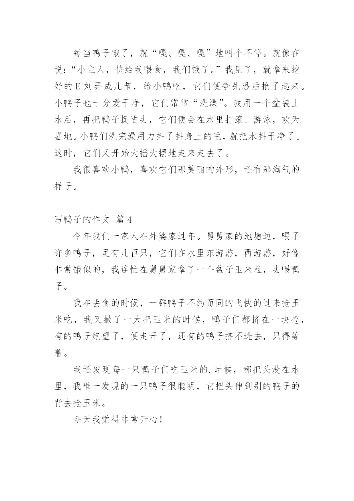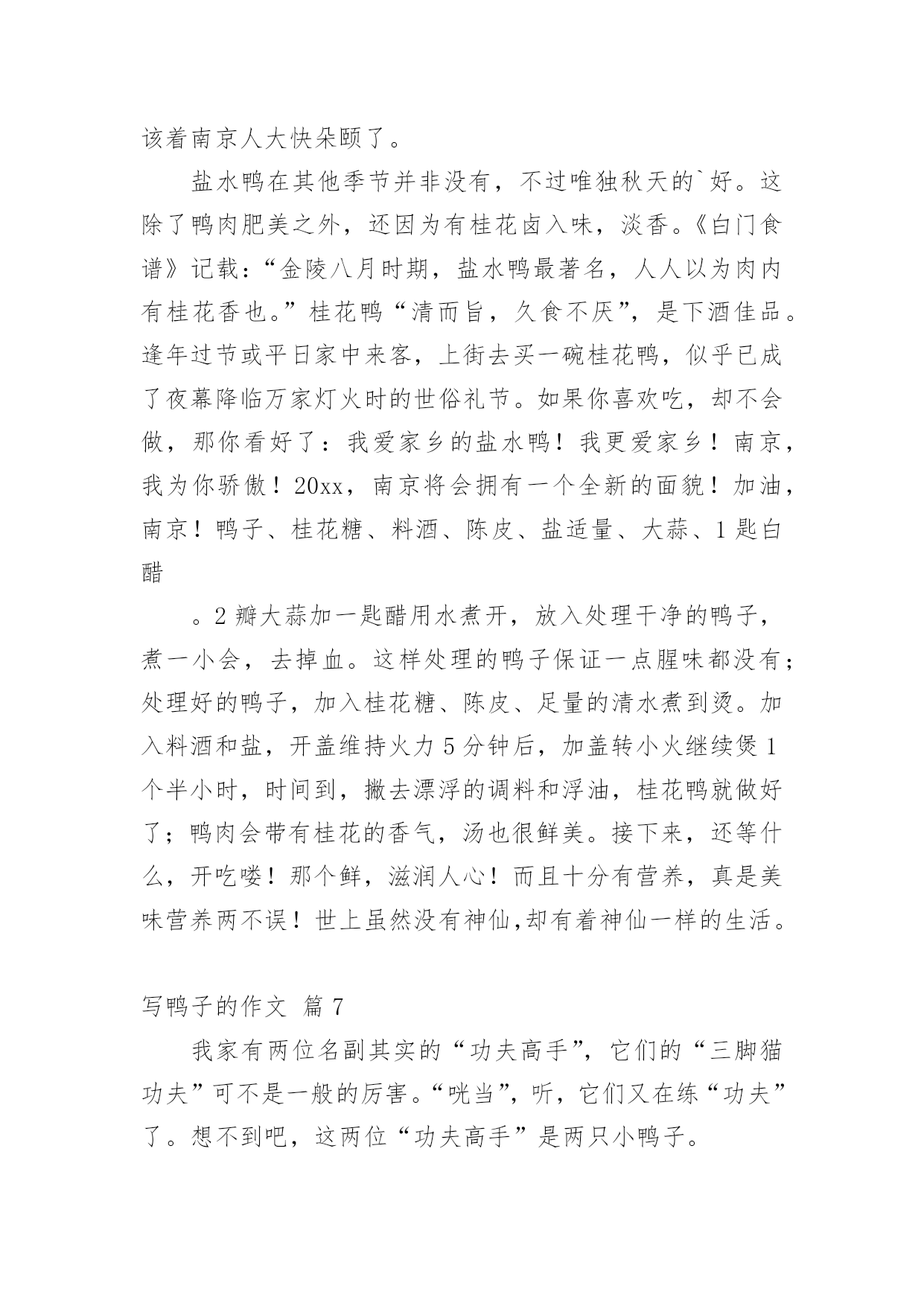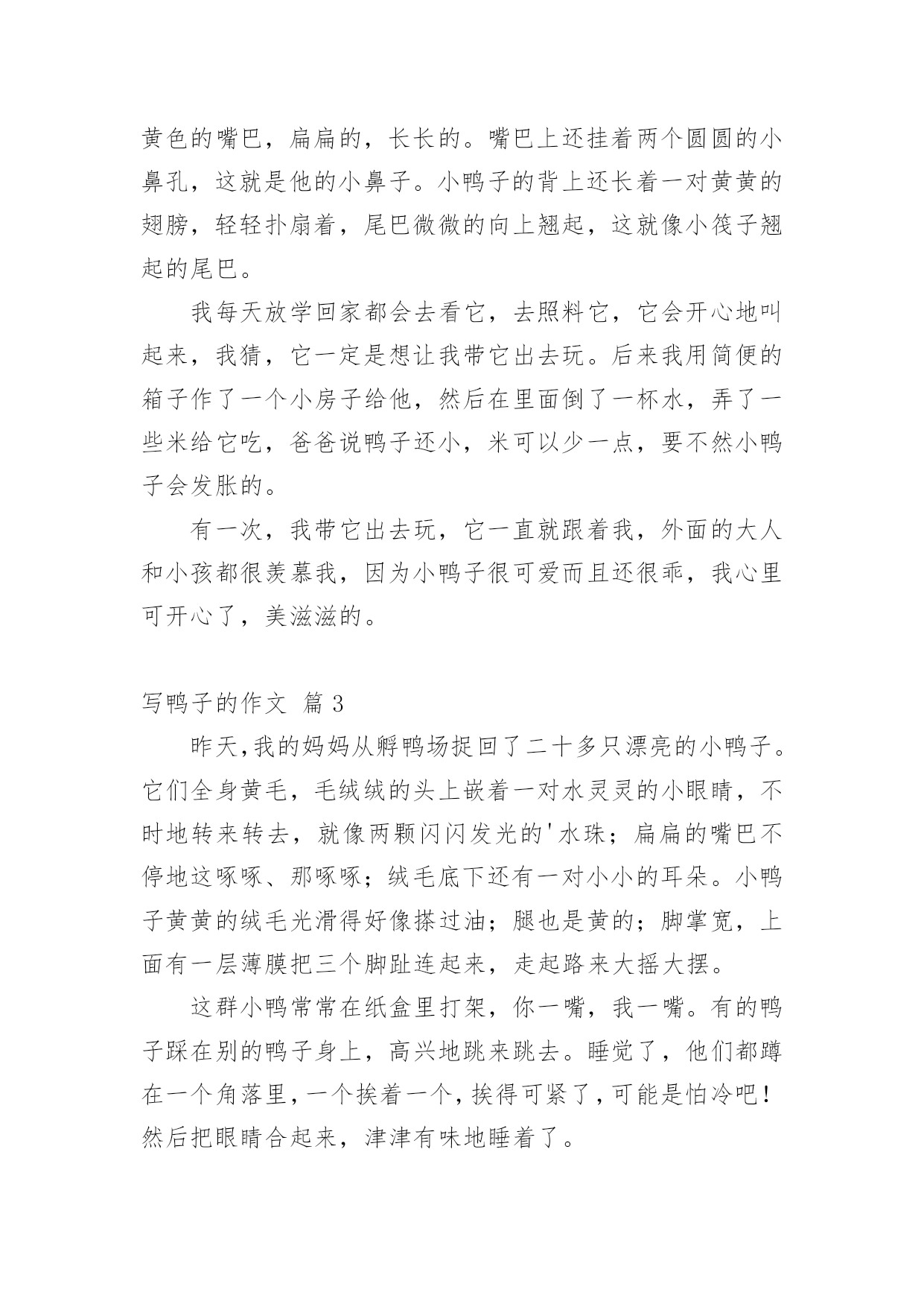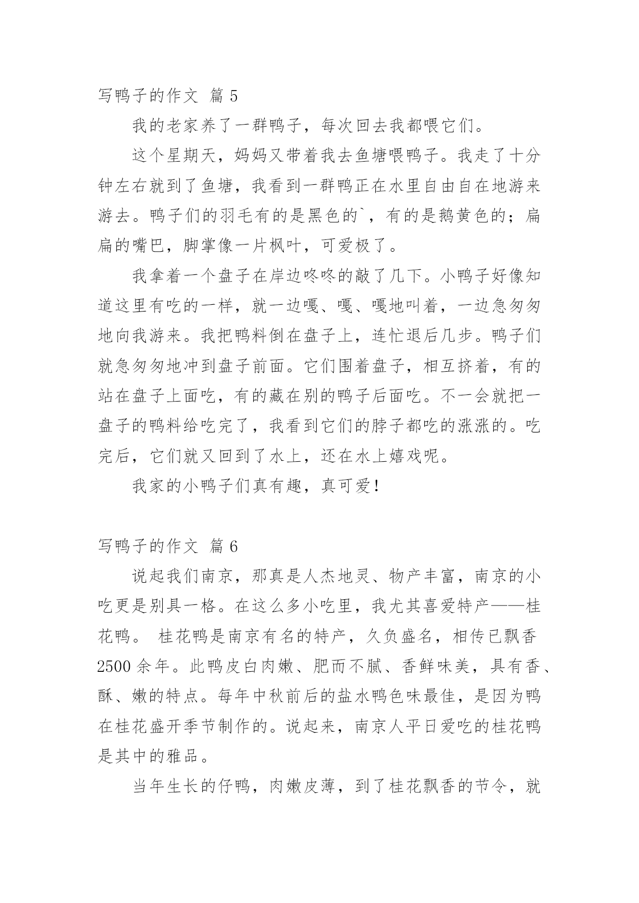 写鸭子的作文 精选写鸭子的作文合集十篇在平时的学习、工作或生活中,大家都不可避免地会接触到作文吧,作文是从内部言语向外部言语的过渡,即从经过压缩的简要的、自己能明白的语言,向开展的、具有规范语法结构的、能为他人所理解的外部语言形式的转化。相信写作文是一个让许多人都头痛的问题,以下是小编精心整理的写鸭子的作文10篇,仅供参考,欢迎大家阅读。写鸭子的作文篇1今天早上,我起床的时候看见我的'小鸭子死了。它脖子扭在一起了,眼睛睁大没有了神气,一动不动的躺在箱子里面。我的小鸭子死了,我很伤心,我将它埋在土地里,给它做了一个墓碑。如果下一次可以再养一只小动物,我发誓,我会好好的关心它和照顾它。写鸭子的作文篇2我有一只可爱的鸭子,这只鸭子是我的同学在我的生日的时候送给我的。它浑身上上下下都长着浅黄色的羽毛,圆圆的头上长着一对又圆又狭长的眼睛,炯炯有神。可爱的'头上还长着橘黄色的嘴巴,扁扁的,长长的。嘴巴上还挂着两个圆圆的小鼻孔,这就是他的小鼻子。小鸭子的背上还长着一对黄黄的翅膀,轻轻扑扇着,尾巴微微的向上翘起,这就像小筏子翘起的尾巴。我每天放学回家都会去看它,去照料它,它会开心地叫起来,我猜,它一定是想让我带它出去玩。后来我用简便的箱子作了一个小房子给他,然后在里面倒了一杯水,弄了一些米给它吃,爸爸说鸭子还小,米可以少一点,要不然小鸭子会发胀的。有一次,我带它出去玩,它一直就跟着我,外面的大人和小孩都很羡慕我,因为小鸭子很可爱而且还很乖,我心里可开心了,美滋滋的。写鸭子的作文篇3昨天,我的妈妈从孵鸭场捉回了二十多只漂亮的小鸭子。它们全身黄毛,毛绒绒的头上嵌着一对水灵灵的小眼睛,不时地转来转去,就像两颗闪闪发光的'水珠;扁扁的嘴巴不停地这啄啄、那啄啄;绒毛底下还有一对小小的耳朵。小鸭子黄黄的绒毛光滑得好像搽过油;腿也是黄的;脚掌宽,上面有一层薄膜把三个脚趾连起来,走起路来大摇大摆。这群小鸭常常在纸盒里打架,你一嘴,我一嘴。有的鸭子踩在别的鸭子身上,高兴地跳来跳去。睡觉了,他们都蹲在一个角落里,一个挨着一个,挨得可紧了,可能是怕冷吧!然后把眼睛合起来,津津有味地睡着了。每当鸭子饿了,就“嘎、嘎、嘎”地叫个不停。就像在说:“小主人,快给我喂食,我们饿了。”我见了,就拿来挖好的E刘弄成几节,给小鸭吃,它们便争先恐后抢了起来。小鸭子也十分爱干净,它们常常“洗澡”。我用一个盆装上水后,再把鸭子捉进去,它们便会在水里打滚、游泳,欢天喜地。小鸭们洗完澡用力抖了抖身上的毛,就把水抖干净了。这时,它们又开始大摇大摆地走来走去了。我很喜欢小鸭,喜欢它们那美丽的外形,还有那淘气的样子。写鸭子的作文篇4今年我们一家人在外婆家过年。舅舅家的池塘边,喂了许多鸭子,足有几百只,它们在水里东游游,西游游,好像非常饿似的,我连忙在舅舅家拿了一个盆子玉米粒,去喂鸭子。我在丢食的时候,一群鸭子不约而同的飞快的过来抢玉米吃,我又撒了一大把玉米的时候,鸭子们都挤在一块抢,有的鸭子绝望了,便走开了,还有的鸭子挤不进去,只得等着。我还发现每一只鸭子们吃玉米的.时候,都把头没在水里,我唯一发现的一只鸭子很聪明,它把头伸到别的鸭子的背去抢玉米。今天我觉得非常开心!写鸭子的作文篇5我的老家养了一群鸭子,每次回去我都喂它们。这个星期天,妈妈又带着我去鱼塘喂鸭子。我走了十分钟左右就到了鱼塘,我看到一群鸭正在水里自由自在地游来游去。鸭子们的羽毛有的是黑色的`,有的是鹅黄色的;扁扁的嘴巴,脚掌像一片枫叶,可爱极了。我拿着一个盘子在岸边咚咚的敲了几下。小鸭子好像知道这里有吃的一样,就一边嘎、嘎、嘎地叫着,一边急匆匆地向我游来。我把鸭料倒在盘子上,连忙退后几步。鸭子们就急匆匆地冲到盘子前面。它们围着盘子,相互挤着,有的站在盘子上面吃,有的藏在别的鸭子后面吃。不一会就把一盘子的鸭料给吃完了,我看到它们的脖子都吃的涨涨的。吃完后,它们就又回到了水上,还在水上嬉戏呢。我家的小鸭子们真有趣,真可爱!写鸭子的作文篇6说起我们南京,那真是人杰地灵、物产丰富,南京的小吃更是别具一格。在这么多小吃里,我尤其喜爱特产——桂花鸭。桂花鸭是南京有名的特产,久负盛名,相传已飘香2500余年。此鸭皮白肉嫩、肥而不腻、香鲜味美,具有香、酥、嫩的特点。每年中秋前后的盐水鸭色味最佳,是因为鸭在桂花盛开季节制作的。说起来,南京人平日爱吃的桂花鸭是其中的雅品。当年生长的仔鸭,肉嫩皮薄,到了桂花飘香的节令,就该着南京人大快朵颐了。盐水鸭在其他季节并非没有,不过唯独秋天的`好。这除了鸭肉肥美之外,还因为有桂花卤入味,淡香。《白门食谱》记载:“金陵八月时期,盐水鸭最著名,人人以为肉内有桂花香也。”桂花鸭“清而旨,久食不厌”,是下酒佳品。逢年过节或平日家中来客,上街去买一碗桂花鸭,似乎已成了夜幕降临万家灯火时的世俗礼节。如果你喜欢吃,却不会做,那