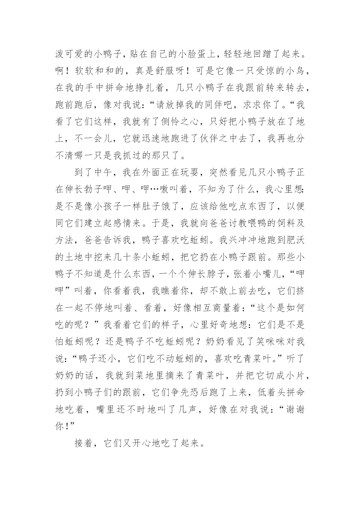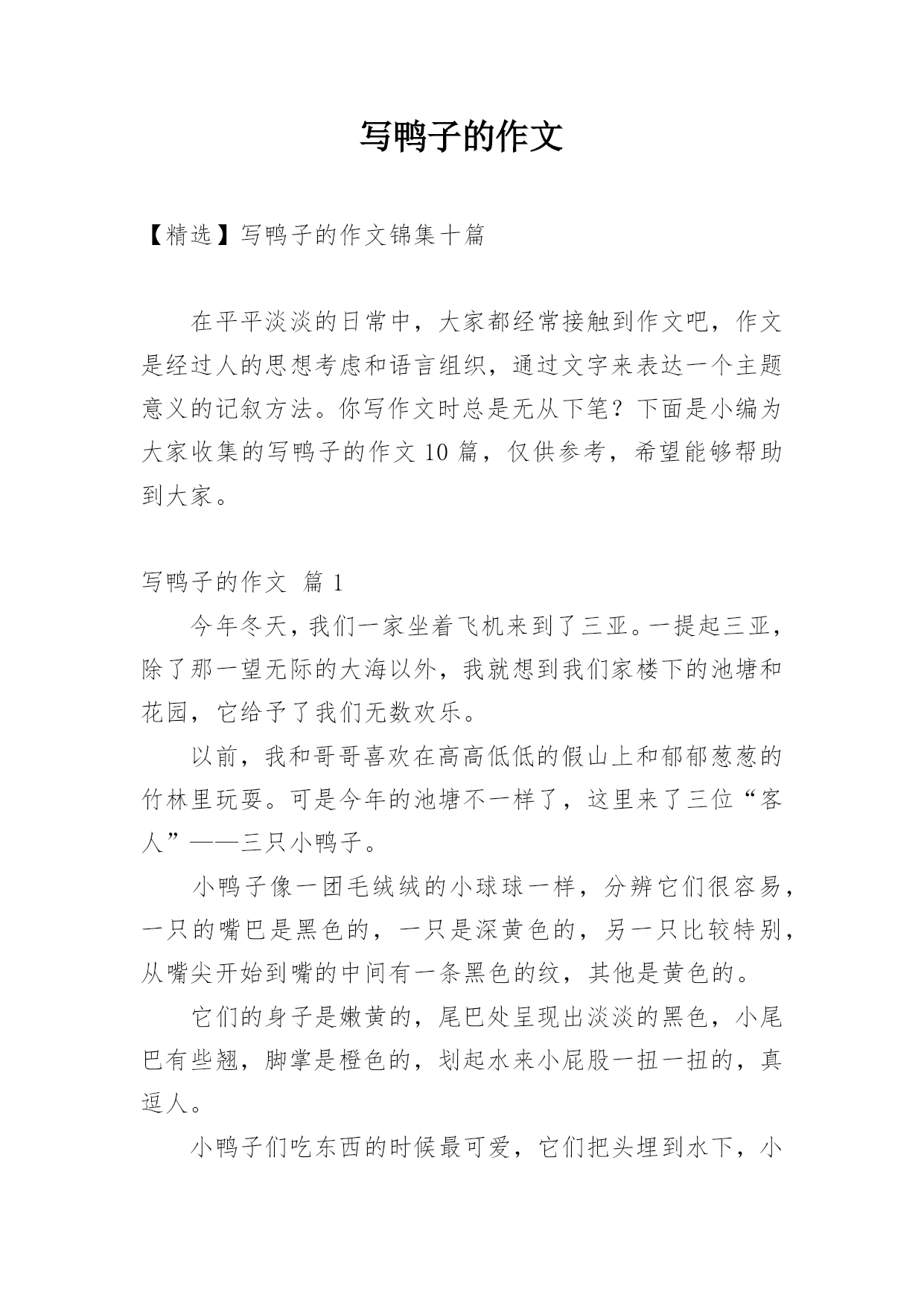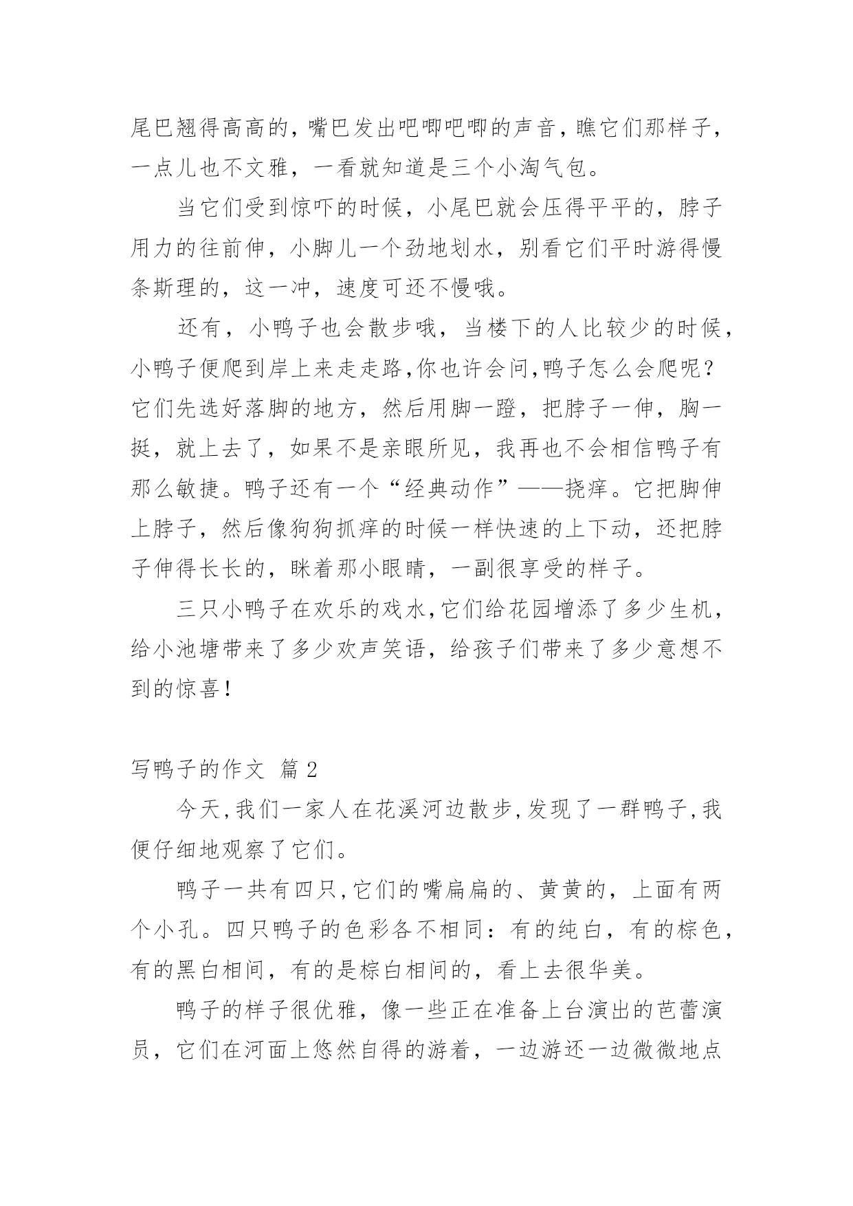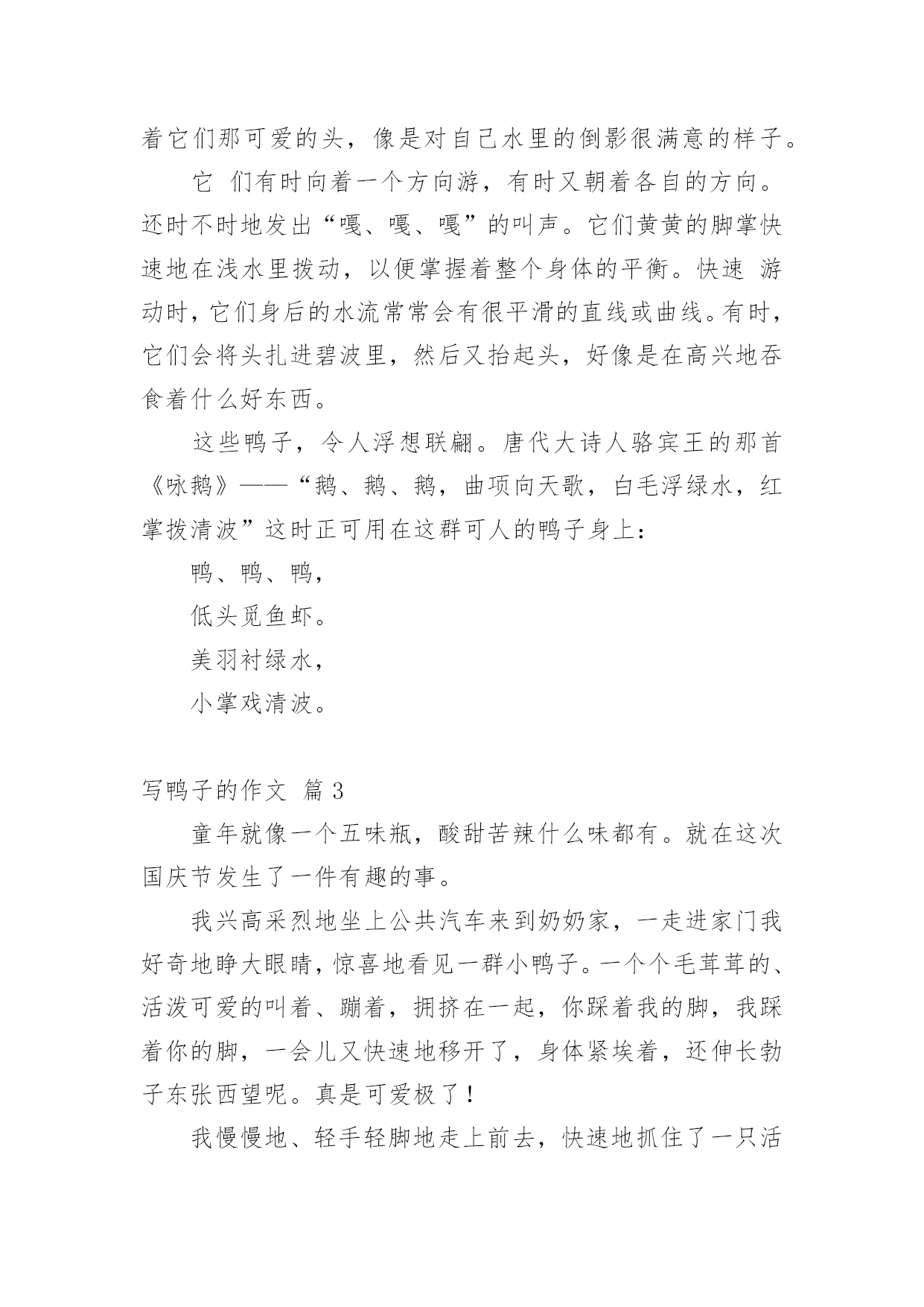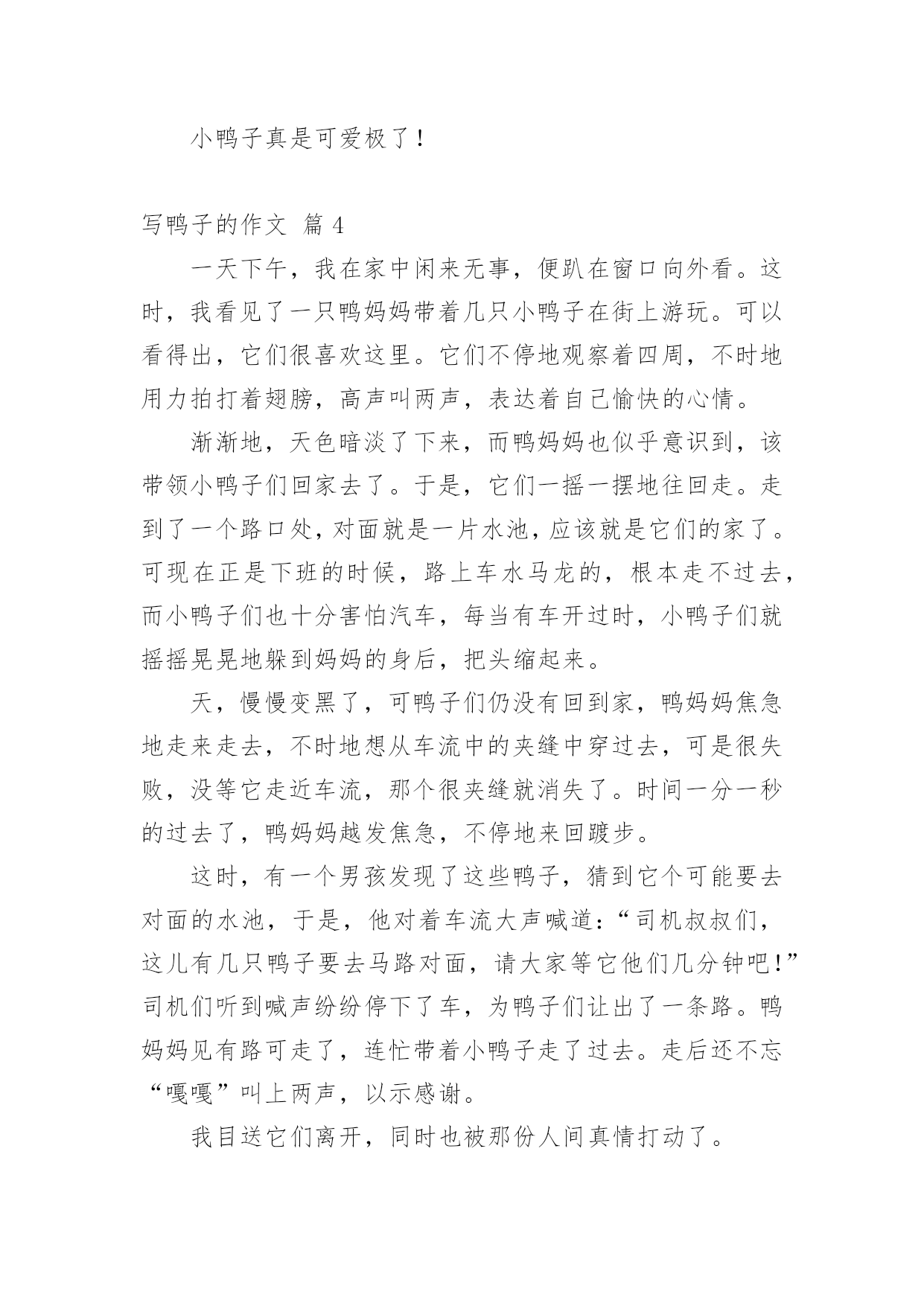 写鸭子的作文 【精选】写鸭子的作文锦集十篇在平平淡淡的日常中,大家都经常接触到作文吧,作文是经过人的思想考虑和语言组织,通过文字来表达一个主题意义的记叙方法。你写作文时总是无从下笔?下面是小编为大家收集的写鸭子的作文10篇,仅供参考,希望能够帮助到大家。写鸭子的作文篇1今年冬天,我们一家坐着飞机来到了三亚。一提起三亚,除了那一望无际的大海以外,我就想到我们家楼下的池塘和花园,它给予了我们无数欢乐。以前,我和哥哥喜欢在高高低低的假山上和郁郁葱葱的竹林里玩耍。可是今年的池塘不一样了,这里来了三位“客人”——三只小鸭子。小鸭子像一团毛绒绒的小球球一样,分辨它们很容易,一只的嘴巴是黑色的,一只是深黄色的,另一只比较特别,从嘴尖开始到嘴的中间有一条黑色的纹,其他是黄色的。它们的身子是嫩黄的,尾巴处呈现出淡淡的黑色,小尾巴有些翘,脚掌是橙色的,划起水来小屁股一扭一扭的,真逗人。小鸭子们吃东西的时候最可爱,它们把头埋到水下,小尾巴翘得高高的,嘴巴发出吧唧吧唧的声音,瞧它们那样子,一点儿也不文雅,一看就知道是三个小淘气包。当它们受到惊吓的时候,小尾巴就会压得平平的,脖子用力的往前伸,小脚儿一个劲地划水,别看它们平时游得慢条斯理的,这一冲,速度可还不慢哦。还有,小鸭子也会散步哦,当楼下的人比较少的时候,小鸭子便爬到岸上来走走路,你也许会问,鸭子怎么会爬呢?它们先选好落脚的地方,然后用脚一蹬,把脖子一伸,胸一挺,就上去了,如果不是亲眼所见,我再也不会相信鸭子有那么敏捷。鸭子还有一个“经典动作”——挠痒。它把脚伸上脖子,然后像狗狗抓痒的时候一样快速的上下动,还把脖子伸得长长的,眯着那小眼睛,一副很享受的样子。三只小鸭子在欢乐的戏水,它们给花园增添了多少生机,给小池塘带来了多少欢声笑语,给孩子们带来了多少意想不到的惊喜!写鸭子的作文篇2今天,我们一家人在花溪河边散步,发现了一群鸭子,我便仔细地观察了它们。鸭子一共有四只,它们的嘴扁扁的、黄黄的,上面有两个小孔。四只鸭子的色彩各不相同:有的纯白,有的棕色,有的黑白相间,有的是棕白相间的,看上去很华美。鸭子的样子很优雅,像一些正在准备上台演出的芭蕾演员,它们在河面上悠然自得的游着,一边游还一边微微地点着它们那可爱的头,像是对自己水里的倒影很满意的样子。它们有时向着一个方向游,有时又朝着各自的方向。还时不时地发出“嘎、嘎、嘎”的叫声。它们黄黄的脚掌快速地在浅水里拨动,以便掌握着整个身体的平衡。快速游动时,它们身后的水流常常会有很平滑的直线或曲线。有时,它们会将头扎进碧波里,然后又抬起头,好像是在高兴地吞食着什么好东西。这些鸭子,令人浮想联翩。唐代大诗人骆宾王的那首《咏鹅》——“鹅、鹅、鹅,曲项向天歌,白毛浮绿水,红掌拨清波”这时正可用在这群可人的鸭子身上:鸭、鸭、鸭,低头觅鱼虾。美羽衬绿水,小掌戏清波。写鸭子的作文篇3童年就像一个五味瓶,酸甜苦辣什么味都有。就在这次国庆节发生了一件有趣的事。我兴高采烈地坐上公共汽车来到奶奶家,一走进家门我好奇地睁大眼睛,惊喜地看见一群小鸭子。一个个毛茸茸的、活泼可爱的叫着、蹦着,拥挤在一起,你踩着我的脚,我踩着你的脚,一会儿又快速地移开了,身体紧埃着,还伸长勃子东张西望呢。真是可爱极了!我慢慢地、轻手轻脚地走上前去,快速地抓住了一只活泼可爱的小鸭子,贴在自己的小脸蛋上,轻轻地回蹭了起来。啊!软软和和的,真是舒服呀!可是它像一只受惊的小鸟,在我的手中拼命地挣扎着,几只小鸭子在我跟前转来转去,跑前跑后,像对我说:“请放掉我的同伴吧,求求你了。“我看了它们这样,我就有了侧怜之心,只好把小鸭子放在了地上,不一会儿,它就迅速地跑进了伙伴之中去了,我再也分不清哪一只是我抓过的那只了。到了中午,我在外面正在玩耍,突然看见几只小鸭子正在伸长勃子呷、呷、呷…嗷叫着,不知为了什么,我心里想:是不是像小孩子一样肚子饿了,应该给他吃点东西了,以便同它们建立起感情来。于是,我就向爸爸讨教喂鸭的饲料及方法,爸爸告诉我,鸭子喜欢吃蚯蚓。我兴冲冲地跑到肥沃的土地中挖来几十条小蚯蚓,把它扔在小鸭子跟前。那些小鸭子不知道是什么东西,一个个伸长脖子,张着小嘴儿,“呷呷”叫着,你看着我,我瞧着你,却不敢上前去吃,它们挤在一起不停地叫着、看着,好像相互商量着:“这个是如何吃的呢?”我看着它们的样子,心里好奇地想:它们是不是怕蚯蚓呢?还是鸭子不吃蚯蚓呢?奶奶看见了笑咪咪对我说:“鸭子还小,它们吃不动蚯蚓的,喜欢吃青菜叶。”听了奶奶的话,我就到菜地里摘来了青菜叶,并把它切成小片,扔到小鸭子们的跟前,它们争先恐后跑了上来,低着头拼命地吃着,嘴里还不时地叫了几声,好像在对我说:“谢谢你!”接着,它们又开心地吃了起来。小鸭子真是可爱极了!写鸭子的作文篇4一天下午,我在家中闲来无事,便趴在窗口向外看。这时,我看见了一只鸭妈妈
