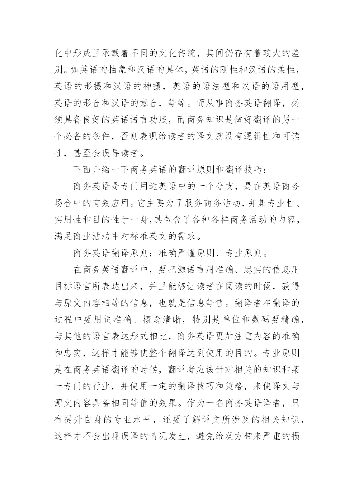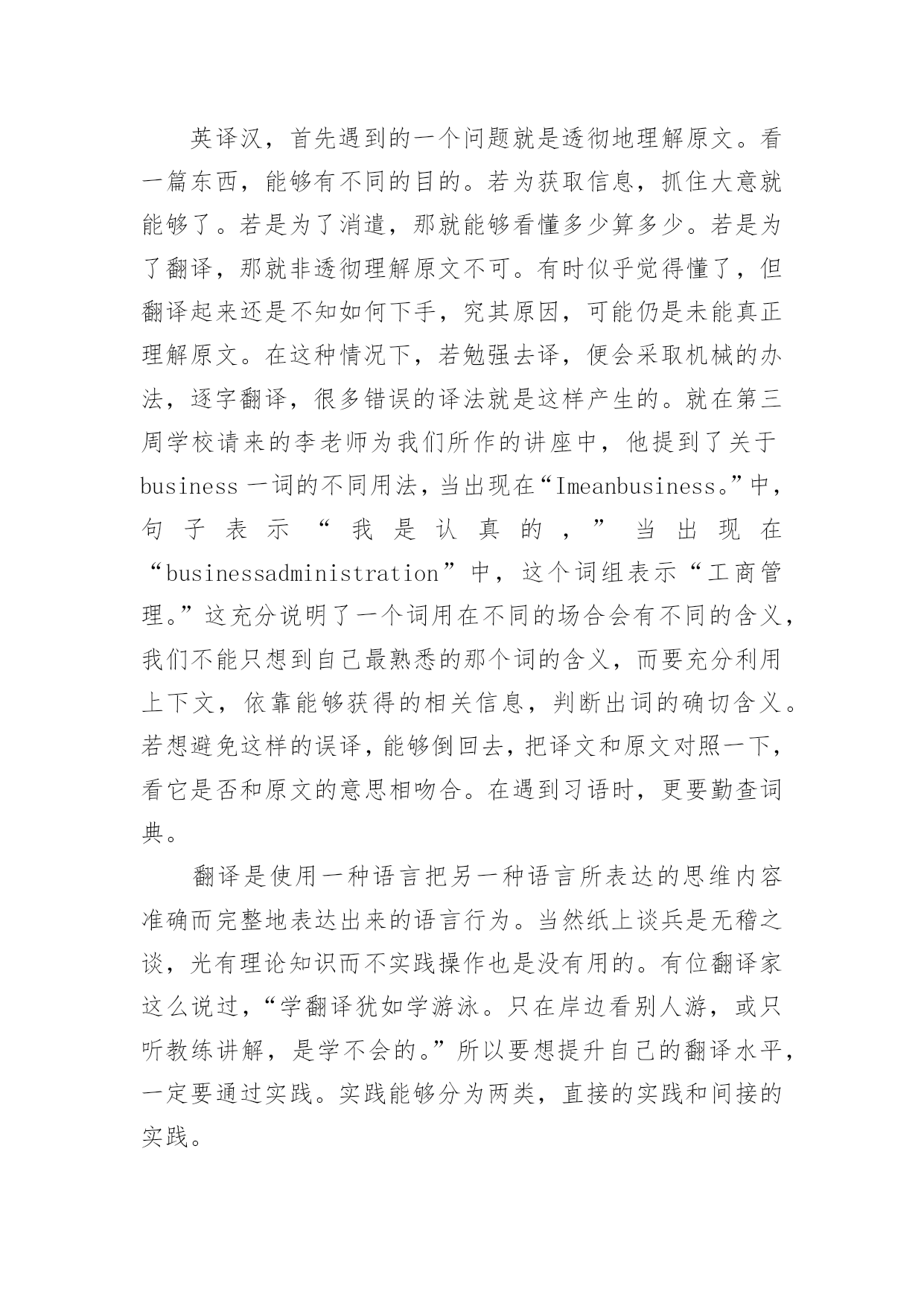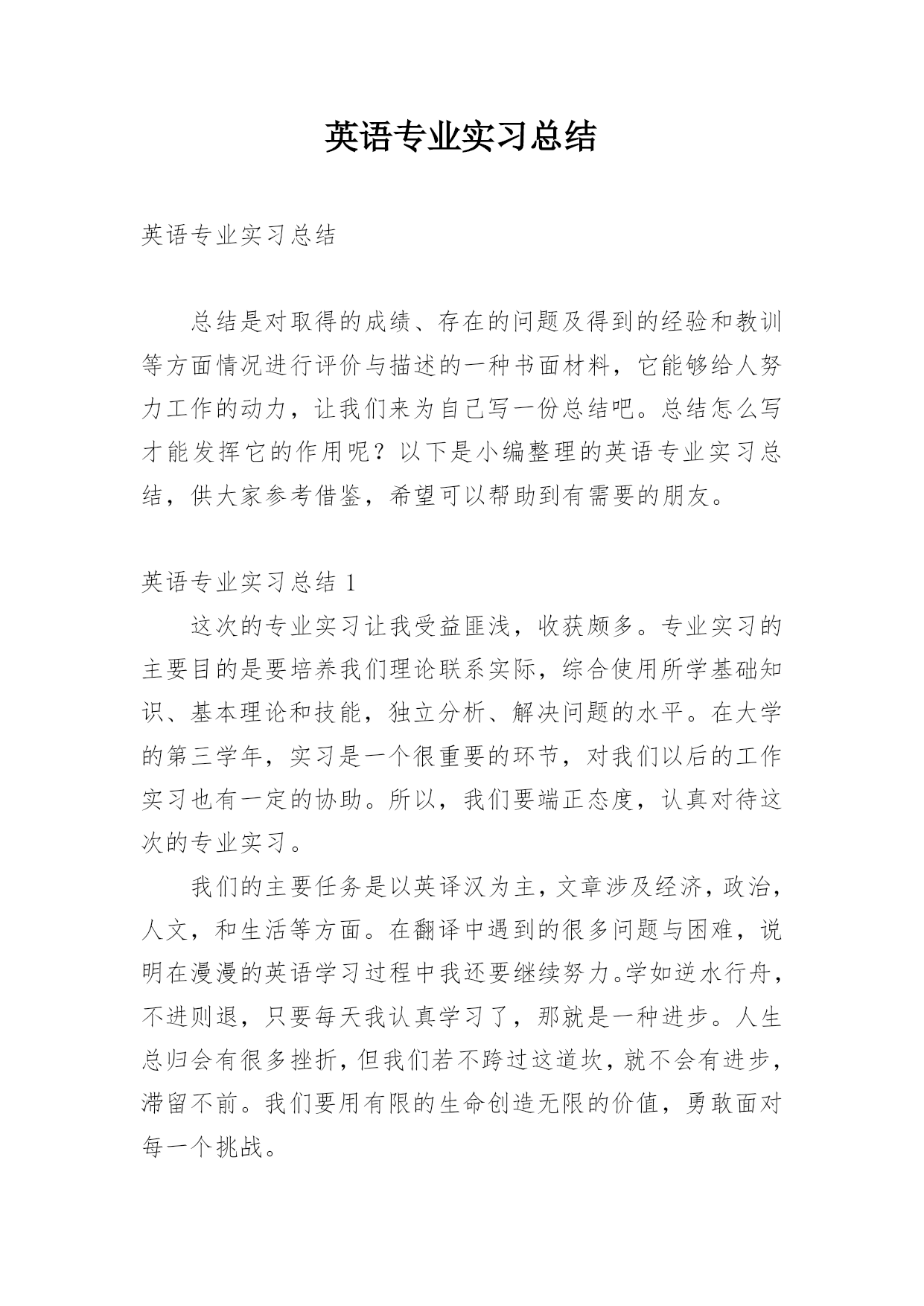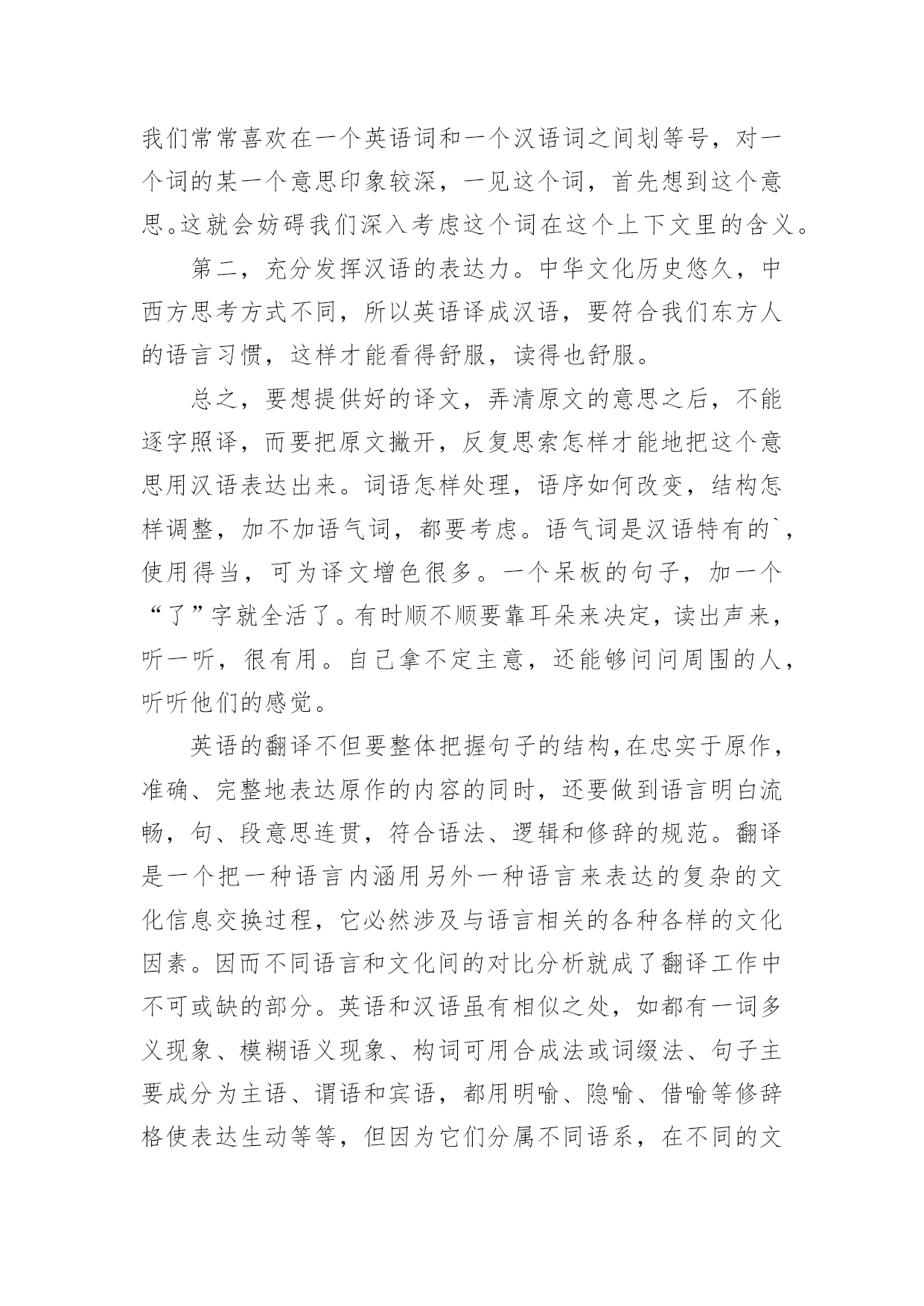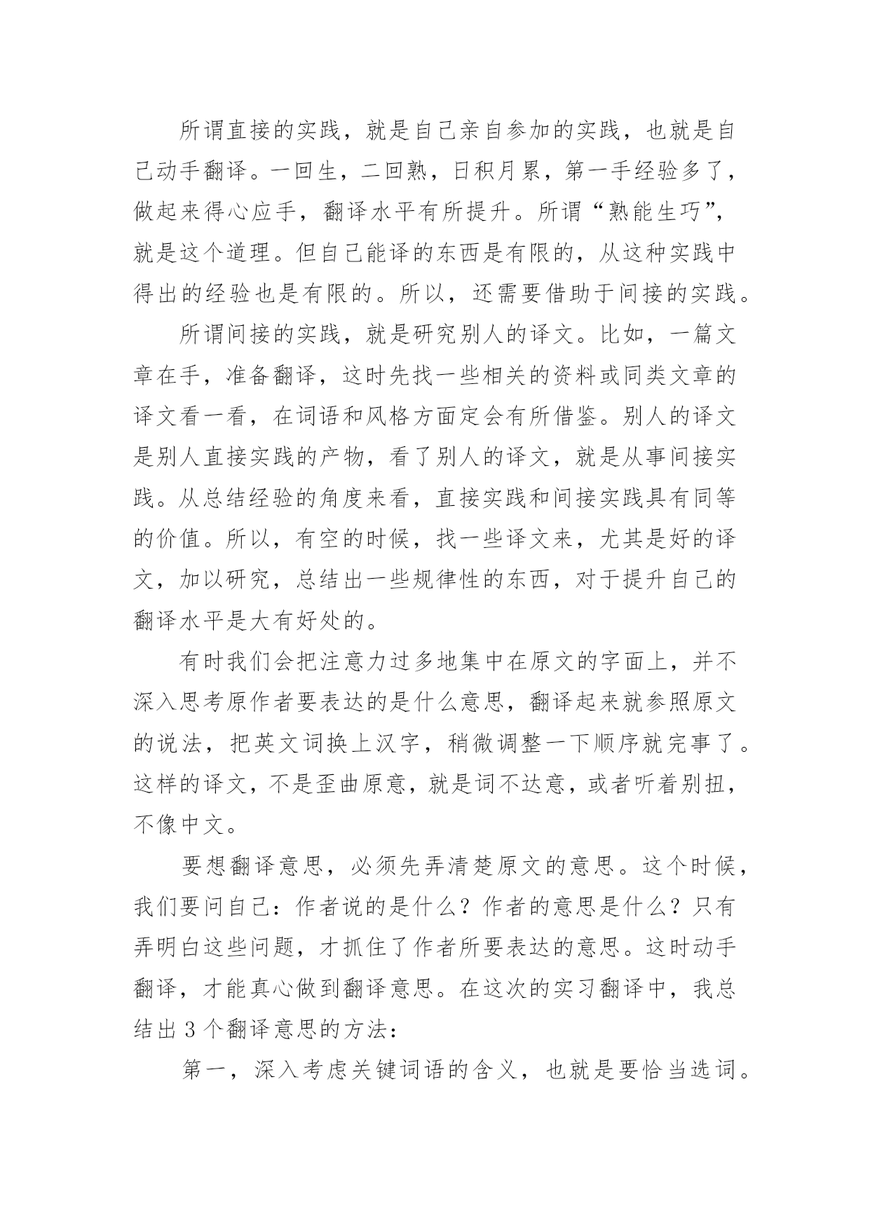 英语专业实习总结 英语专业实习总结总结是对取得的成绩、存在的问题及得到的经验和教训等方面情况进行评价与描述的一种书面材料,它能够给人努力工作的动力,让我们来为自己写一份总结吧。总结怎么写才能发挥它的作用呢?以下是小编整理的英语专业实习总结,供大家参考借鉴,希望可以帮助到有需要的朋友。英语专业实习总结1这次的专业实习让我受益匪浅,收获颇多。专业实习的主要目的是要培养我们理论联系实际,综合使用所学基础知识、基本理论和技能,独立分析、解决问题的水平。在大学的第三学年,实习是一个很重要的环节,对我们以后的工作实习也有一定的协助。所以,我们要端正态度,认真对待这次的专业实习。我们的主要任务是以英译汉为主,文章涉及经济,政治,人文,和生活等方面。在翻译中遇到的很多问题与困难,说明在漫漫的英语学习过程中我还要继续努力。学如逆水行舟,不进则退,只要每天我认真学习了,那就是一种进步。人生总归会有很多挫折,但我们若不跨过这道坎,就不会有进步,滞留不前。我们要用有限的生命创造无限的价值,勇敢面对每一个挑战。英译汉,首先遇到的一个问题就是透彻地理解原文。看一篇东西,能够有不同的目的。若为获取信息,抓住大意就能够了。若是为了消遣,那就能够看懂多少算多少。若是为了翻译,那就非透彻理解原文不可。有时似乎觉得懂了,但翻译起来还是不知如何下手,究其原因,可能仍是未能真正理解原文。在这种情况下,若勉强去译,便会采取机械的办法,逐字翻译,很多错误的译法就是这样产生的。就在第三周学校请来的李老师为我们所作的讲座中,他提到了关于business一词的不同用法,当出现在“Imeanbusiness。”中,句子表示“我是认真的,”当出现在“businessadministration”中,这个词组表示“工商管理。”这充分说明了一个词用在不同的场合会有不同的含义,我们不能只想到自己最熟悉的那个词的含义,而要充分利用上下文,依靠能够获得的相关信息,判断出词的确切含义。若想避免这样的误译,能够倒回去,把译文和原文对照一下,看它是否和原文的意思相吻合。在遇到习语时,更要勤查词典。翻译是使用一种语言把另一种语言所表达的思维内容准确而完整地表达出来的语言行为。当然纸上谈兵是无稽之谈,光有理论知识而不实践操作也是没有用的。有位翻译家这么说过,“学翻译犹如学游泳。只在岸边看别人游,或只听教练讲解,是学不会的。”所以要想提升自己的翻译水平,一定要通过实践。实践能够分为两类,直接的实践和间接的实践。所谓直接的实践,就是自己亲自参加的实践,也就是自己动手翻译。一回生,二回熟,日积月累,第一手经验多了,做起来得心应手,翻译水平有所提升。所谓“熟能生巧”,就是这个道理。但自己能译的东西是有限的,从这种实践中得出的经验也是有限的。所以,还需要借助于间接的实践。所谓间接的实践,就是研究别人的译文。比如,一篇文章在手,准备翻译,这时先找一些相关的资料或同类文章的译文看一看,在词语和风格方面定会有所借鉴。别人的译文是别人直接实践的产物,看了别人的译文,就是从事间接实践。从总结经验的角度来看,直接实践和间接实践具有同等的价值。所以,有空的时候,找一些译文来,尤其是好的译文,加以研究,总结出一些规律性的东西,对于提升自己的翻译水平是大有好处的。有时我们会把注意力过多地集中在原文的字面上,并不深入思考原作者要表达的是什么意思,翻译起来就参照原文的说法,把英文词换上汉字,稍微调整一下顺序就完事了。这样的译文,不是歪曲原意,就是词不达意,或者听着别扭,不像中文。要想翻译意思,必须先弄清楚原文的意思。这个时候,我们要问自己:作者说的是什么?作者的意思是什么?只有弄明白这些问题,才抓住了作者所要表达的意思。这时动手翻译,才能真心做到翻译意思。在这次的实习翻译中,我总结出3个翻译意思的方法:第一,深入考虑关键词语的含义,也就是要恰当选词。我们常常喜欢在一个英语词和一个汉语词之间划等号,对一个词的某一个意思印象较深,一见这个词,首先想到这个意思。这就会妨碍我们深入考虑这个词在这个上下文里的含义。第二,充分发挥汉语的表达力。中华文化历史悠久,中西方思考方式不同,所以英语译成汉语,要符合我们东方人的语言习惯,这样才能看得舒服,读得也舒服。总之,要想提供好的译文,弄清原文的意思之后,不能逐字照译,而要把原文撇开,反复思索怎样才能地把这个意思用汉语表达出来。词语怎样处理,语序如何改变,结构怎样调整,加不加语气词,都要考虑。语气词是汉语特有的`,使用得当,可为译文增色很多。一个呆板的句子,加一个“了”字就全活了。有时顺不顺要靠耳朵来决定,读出声来,听一听,很有用。自己拿不定主意,还能够问问周围的人,听听他们的感觉。英语的翻译不但要整体把握句子的结构,在忠实于原作,准确、完整地表达原作的内容的同时,还要做到语言明白流畅,句、段意思连