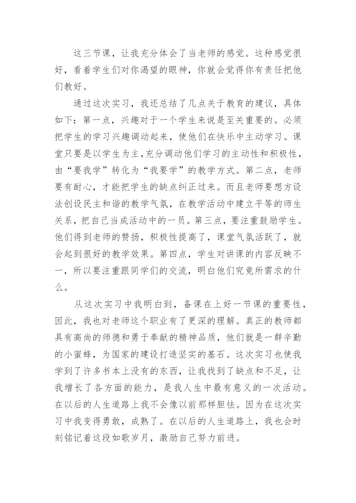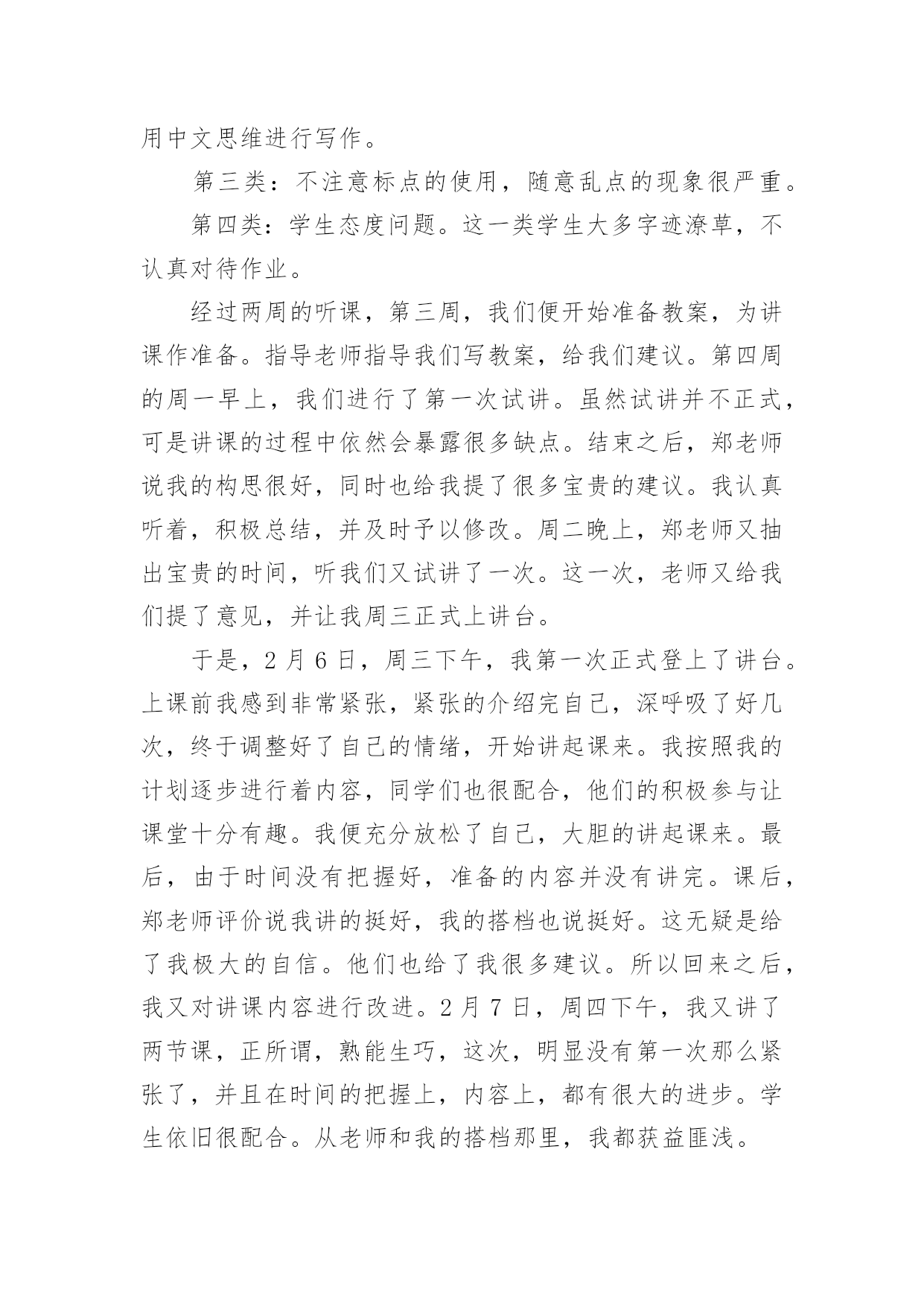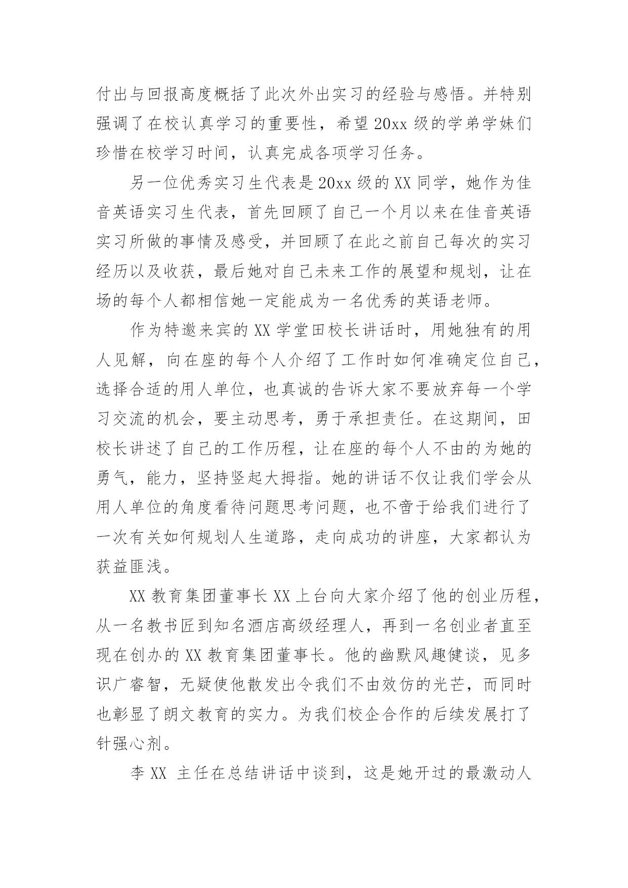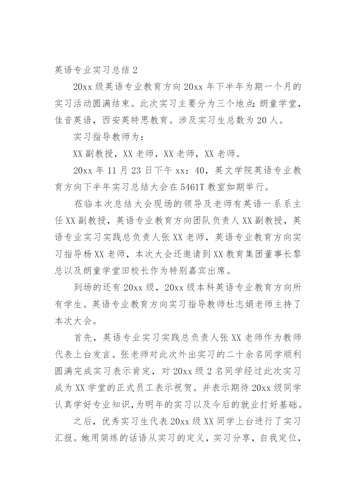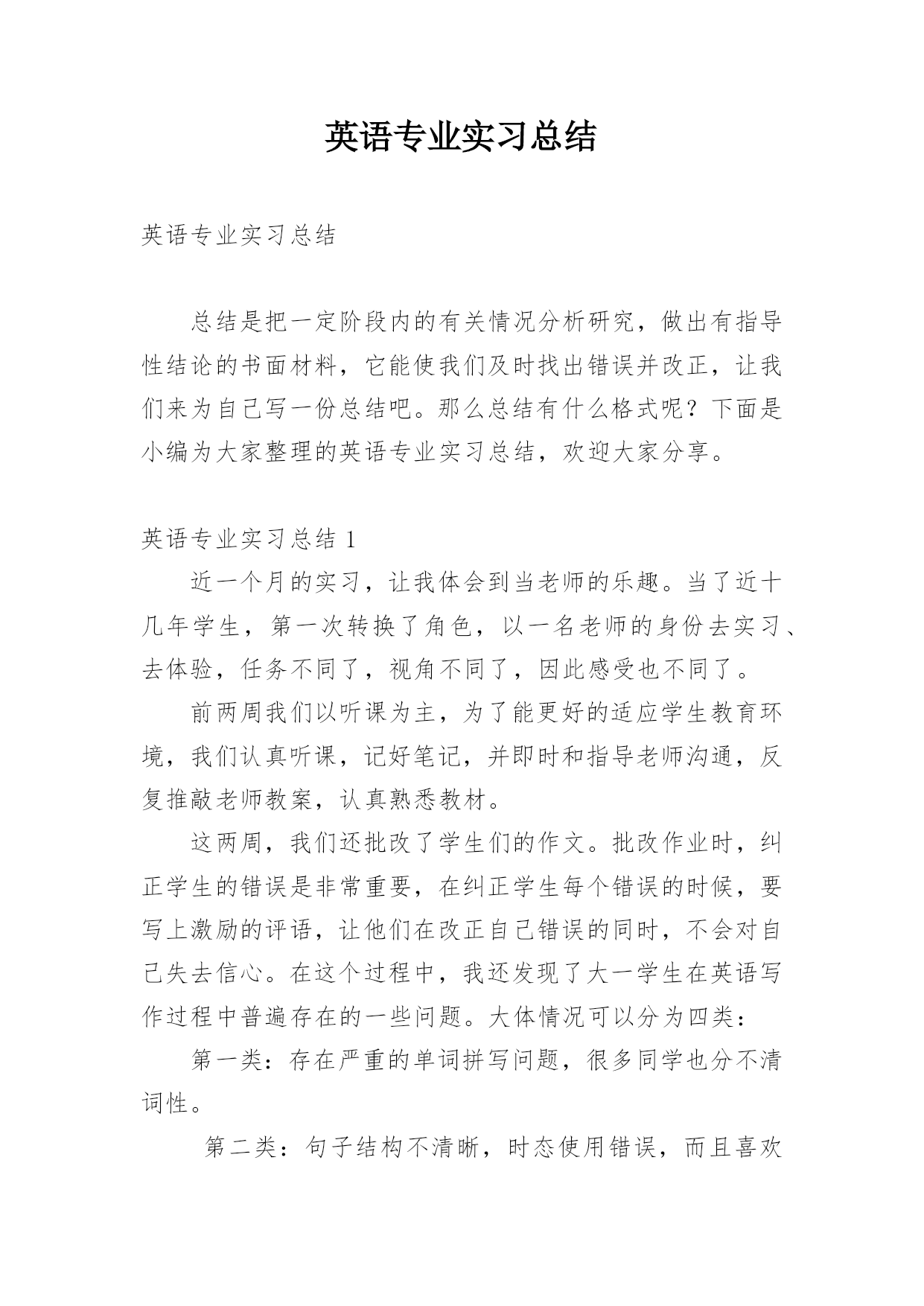 英语专业实习总结 英语专业实习总结总结是把一定阶段内的有关情况分析研究,做出有指导性结论的书面材料,它能使我们及时找出错误并改正,让我们来为自己写一份总结吧。那么总结有什么格式呢?下面是小编为大家整理的英语专业实习总结,欢迎大家分享。英语专业实习总结1近一个月的实习,让我体会到当老师的乐趣。当了近十几年学生,第一次转换了角色,以一名老师的身份去实习、去体验,任务不同了,视角不同了,因此感受也不同了。前两周我们以听课为主,为了能更好的适应学生教育环境,我们认真听课,记好笔记,并即时和指导老师沟通,反复推敲老师教案,认真熟悉教材。这两周,我们还批改了学生们的作文。批改作业时,纠正学生的错误是非常重要,在纠正学生每个错误的时候,要写上激励的评语,让他们在改正自己错误的同时,不会对自己失去信心。在这个过程中,我还发现了大一学生在英语写作过程中普遍存在的一些问题。大体情况可以分为四类:第一类:存在严重的单词拼写问题,很多同学也分不清词性。第二类:句子结构不清晰,时态使用错误,而且喜欢用中文思维进行写作。第三类:不注意标点的使用,随意乱点的现象很严重。第四类:学生态度问题。这一类学生大多字迹潦草,不认真对待作业。经过两周的听课,第三周,我们便开始准备教案,为讲课作准备。指导老师指导我们写教案,给我们建议。第四周的周一早上,我们进行了第一次试讲。虽然试讲并不正式,可是讲课的过程中依然会暴露很多缺点。结束之后,郑老师说我的构思很好,同时也给我提了很多宝贵的建议。我认真听着,积极总结,并及时予以修改。周二晚上,郑老师又抽出宝贵的时间,听我们又试讲了一次。这一次,老师又给我们提了意见,并让我周三正式上讲台。于是,2月6日,周三下午,我第一次正式登上了讲台。上课前我感到非常紧张,紧张的介绍完自己,深呼吸了好几次,终于调整好了自己的情绪,开始讲起课来。我按照我的计划逐步进行着内容,同学们也很配合,他们的积极参与让课堂十分有趣。我便充分放松了自己,大胆的讲起课来。最后,由于时间没有把握好,准备的内容并没有讲完。课后,郑老师评价说我讲的挺好,我的搭档也说挺好。这无疑是给了我极大的自信。他们也给了我很多建议。所以回来之后,我又对讲课内容进行改进。2月7日,周四下午,我又讲了两节课,正所谓,熟能生巧,这次,明显没有第一次那么紧张了,并且在时间的把握上,内容上,都有很大的进步。学生依旧很配合。从老师和我的搭档那里,我都获益匪浅。这三节课,让我充分体会了当老师的感觉。这种感觉很好,看着学生们对你渴望的眼神,你就会觉得你有责任把他们教好。通过这次实习,我还总结了几点关于教育的建议,具体如下:第一点,兴趣对于一个学生来说是至关重要的。必须把学生的学习兴趣调动起来,使他们在快乐中主动学习。课堂只要是以学生为主,充分调动他们学习的主动性和积极性,由“要我学”转化为“我要学”的教学方式。第二点,老师要有耐心,才能把学生的缺点纠正过来。而且老师要想方设法创设民主和谐的教学气氛,在教学活动中建立平等的师生关系,把自己当成活动中的一员。第三点,要注重鼓励学生。他们得到老师的赞扬,积极性提高了,课堂气氛活跃了,就会起到很好的教学效果。第四点,学生对讲课的内容反映不一,所以要注重跟同学们的交流,明白他们究竟所需求的什么。从这次实习中我明白到,备课在上好一节课的重要性,因此,我也对老师这个职业有了更深的理解。真正的教师都具有高尚的师德和勇于奉献的精神品质,他们就是一群辛勤的小蜜蜂,为国家的建设打造坚实的基石。这次实习也使我学到了许多书本上没有的东西,让我找到了缺点和不足,让我增长了各方面的能力,是我人生中最有意义的一次活动。在以后的人生道路上我不会像以前那样胆怯。因为在这次实习中我变得勇敢,成熟了。在以后的人生道路上,我也会时刻铭记着这段如歌岁月,激励自己努力前进。英语专业实习总结220xx级英语专业教育方向20xx年下半年为期一个月的实习活动圆满结束。此次实习主要分为三个地点:朗童学堂,佳音英语,西安英特思教育。涉及实习生总数为20人。实习指导教师为:XX副教授,XX老师,XX老师,XX老师。20xx年11月23日下午xx:40,英文学院英语专业教育方向下半年实习总结大会在5461T教室如期举行。莅临本次总结大会现场的领导及老师有英语一系系主任XX副教授,英语专业教育方向团队负责人XX副教授,英语专业实习实践总负责人张XX老师,英语专业教育方向实习指导杨XX老师,本次大会还邀请到XX教育集团董事长黎总以及朗童学堂田校长作为特别嘉宾出席。到场的还有20xx级,20xx级本科英语专业教育方向所有学生。英语专业教育方向实习指导教师杜志娟老师主持了本次大会。首先,英语专业实习实践总负责人张XX老师作为教师代表上台发言。张老师对此次外出实习的二十余名同学顺利圆满完成实习表示肯定,对20xx