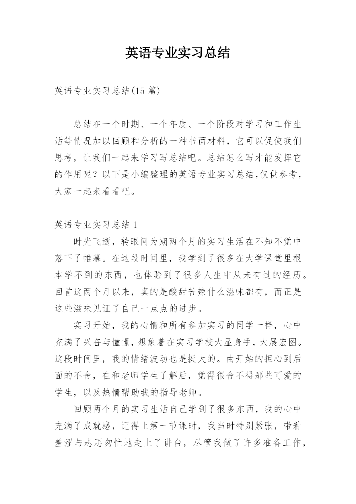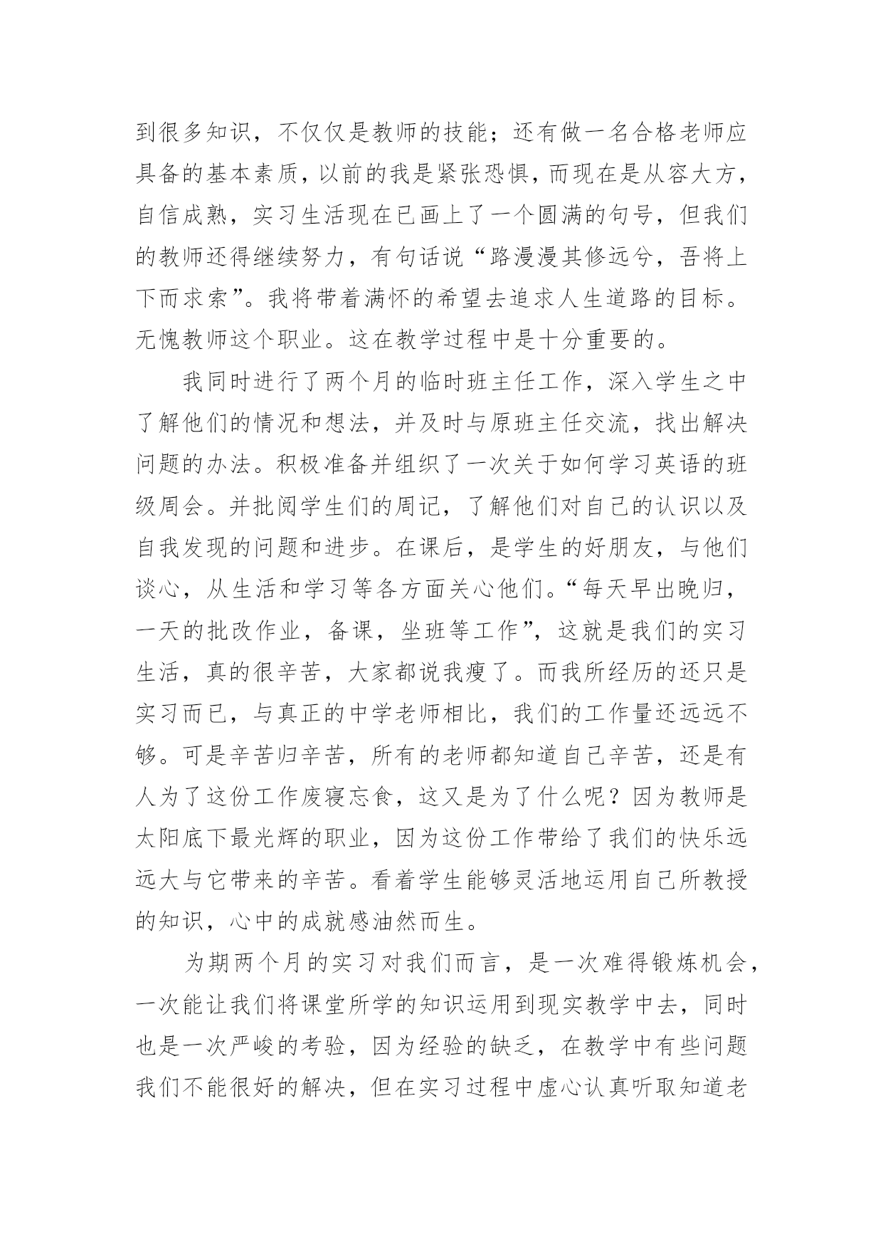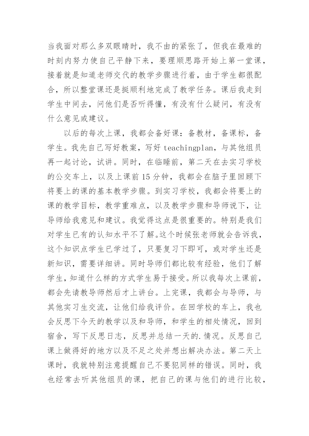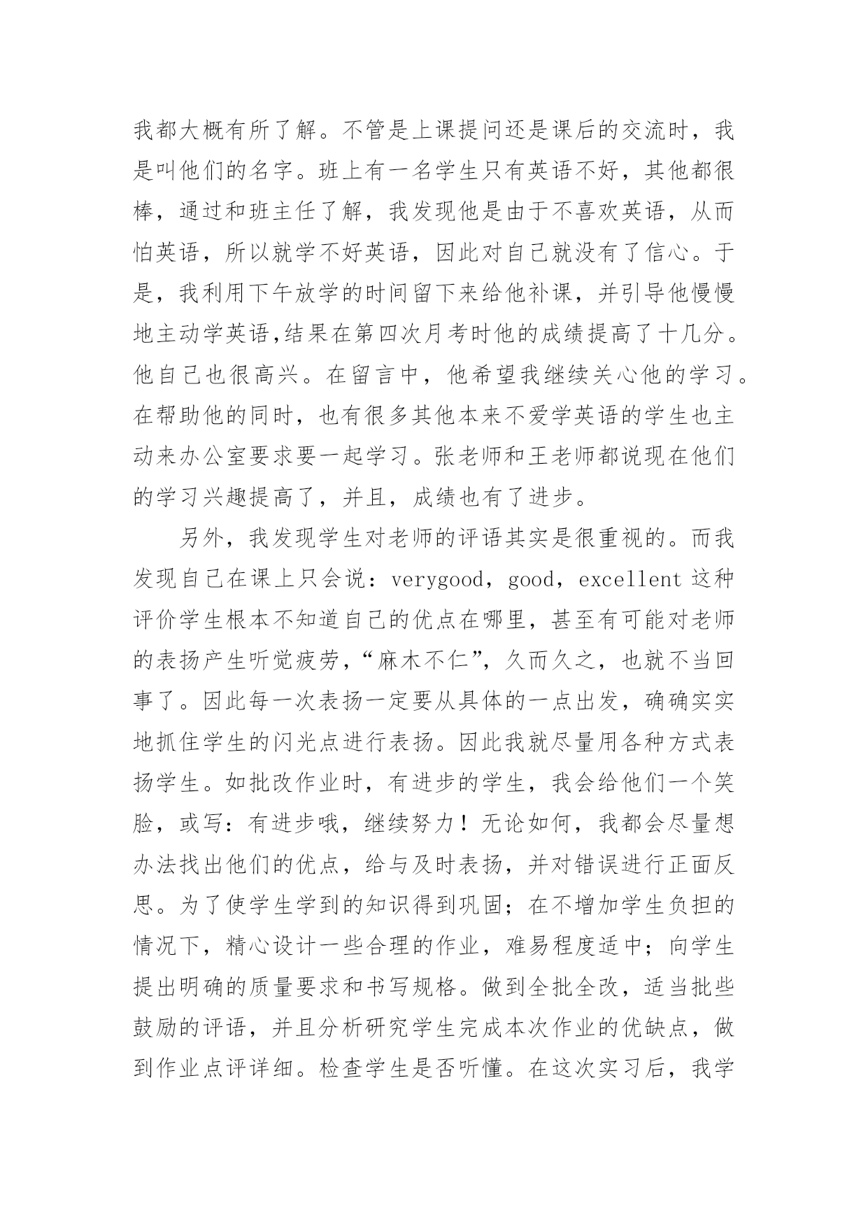 英语专业实习总结 英语专业实习总结(15篇)总结在一个时期、一个年度、一个阶段对学习和工作生活等情况加以回顾和分析的一种书面材料,它可以促使我们思考,让我们一起来学习写总结吧。总结怎么写才能发挥它的作用呢?以下是小编整理的英语专业实习总结,仅供参考,大家一起来看看吧。英语专业实习总结1时光飞逝,转眼间为期两个月的实习生活在不知不觉中落下了帷幕。在这段时间里,我学到了很多在大学课堂里根本学不到的东西,也体验到了很多人生中从未有过的经历。回首这两个月以来,真的是酸甜苦辣什么滋味都有,而正是这些滋味见证了自己一点点的进步。实习开始,我的心情和所有参加实习的同学一样,心中充满了兴奋与憧憬,想象着在实习学校大显身手,大展宏图。这段时间里,我的情绪波动也是挺大的。由开始的担心到后面的不舍,在和老师学生了解后,觉得很舍不得那些可爱的学生,以及热情帮助我的指导老师。回顾两个月的实习生活自己学到了很多东西,我的心中充满了成就感,记得上第一节课时,我当时特别紧张,带着羞涩与忐忑匆忙地走上了讲台,尽管我做了许多准备工作,当我面对那么多双眼睛时,我不由的紧张了,但我在最难的时刻内努力使自己平静下来,要理顺思路开始上第一堂课,接着就是知道老师交代的教学步骤进行着,由于学生都很配合,所以整堂课还是挺顺利地完成了教学任务。课后我走到学生中间去,问他们是否听得懂,有没有什么疑问,有没有什么意见或建议。以后的每次上课,我都会备好课:备教材,备课标,备学生。我先自己写好教案,写好teachingplan,与其他组员再一起讨论,试讲。同时,在临睡前,第二天在去实习学校的公交车上,以及上课前15分钟,我都会在脑子里回顾下将要上的课的基本教学步骤。到实习学校,我都会将要上的课的教学目标,教学重难点,以及教学步骤和导师说下,让导师给我意见和建议。我觉得这点是很重要的。特别是我们对学生已有的认知水平不了解。这个时候张老师就会告诉我,这个知识点学生已学过了,只要复习下即可,或对学生还是新知识,需要详细讲。同时导师们都比较有经验,他们了解学生,知道什么样的方式学生易于接受。所以我每次上课前,都会先请教导师然后才上讲台。上完课,我都会与导师,与其他实习生交流,让他们给我评价。在回学校的车上,我也会反思下今天的教学以及和导师,和学生的相处情况,回到宿舍,写下反思日志,反思并总结一天的.情况。反思自己课上做得好的地方以及不足之处并想出解决办法。第二天上课时,我就特别注意提醒自己不要犯同样的错误。同时,我也经常去听其他组员的课,把自己的课与他们的进行比较,找出值得自己学习的地方。此外,我也积极参加了英语组的集体备课活动。在备课过程中,我也积极发表了自己的一些设计想法。有些想法也得到了导师们的认可与采纳。导师们还说不愧是陈老师带出来的啊,我听了也觉得很自豪。当然在与导师的交流中,有时也会出现自己的想法和导师的发生问题。这时,我就会仔细分析问题的根源,分析导师的观点,然后尽量把两者的精华相结合。如,在上Unit6备课时,课文中出现了wool,cook,foot,wood,look,bookcool等单词时,尤其是字母“oo”这个发音,在什么情况下读长音/u:/,什么情况下读短音/u/;张老师说讲的不是很清楚,这时我想出了一条好的记忆方法,就是“毛厨师踩着木头看书”,除此之外都读长音/u:/,在讲课的时候学生都感觉记起来很容易;张老师听完课说讲的还不错。张老师经常都会强调板书设计。他说因为学生只有了解了教师的习惯之后,才能更快地吸收知识。记得有两天,我因为事太忙了,备课不充分,上课时出现了一些错误,张老师很严肃地给我指出来,从那以后我每次上课前就是熬夜,也要把课准备充分之后才休息。总之,对于导师的意见,我都会虚心接受的,我从来没有表现出厌烦或不满的情绪。因为,我牢记陈老师在动员大会上说的:别人给你提意见是你的幸运,是想帮助你。我觉得这句话很有道理。同时,在教学过程中,我会刻意地去记住每个学生的名字,并叫出他们的名字,因为学生会觉得如果老师能记住他们的名字说明老师重视他们。而且对每个学生的性格、特点我都大概有所了解。不管是上课提问还是课后的交流时,我是叫他们的名字。班上有一名学生只有英语不好,其他都很棒,通过和班主任了解,我发现他是由于不喜欢英语,从而怕英语,所以就学不好英语,因此对自己就没有了信心。于是,我利用下午放学的时间留下来给他补课,并引导他慢慢地主动学英语,结果在第四次月考时他的成绩提高了十几分。他自己也很高兴。在留言中,他希望我继续关心他的学习。在帮助他的同时,也有很多其他本来不爱学英语的学生也主动来办公室要求要一起学习。张老师和王老师都说现在他们的学习兴趣提高了,并且,成绩也有了进步。另外,我发现学生对老师的评语其实是很重视的。而我发现自己在课上只会说:verygood,go