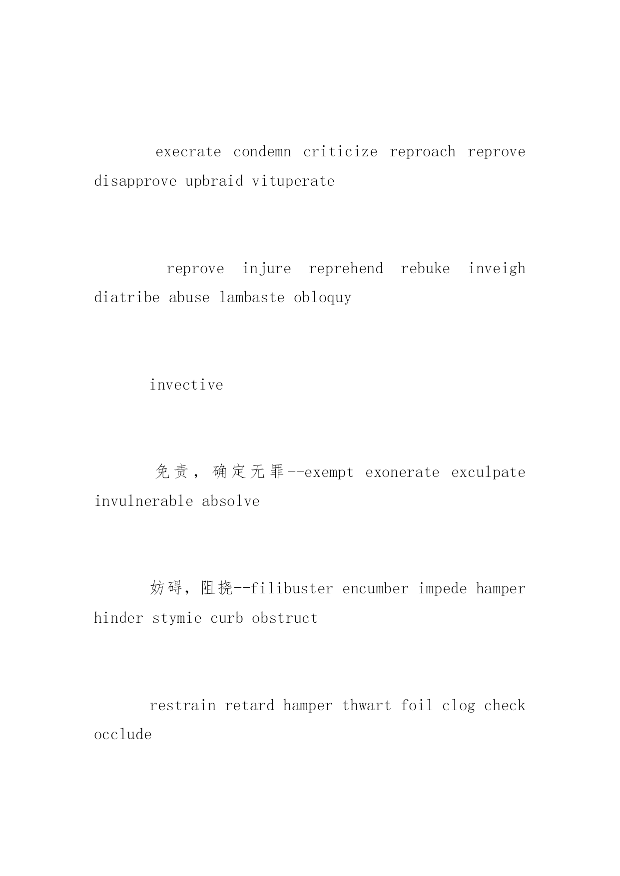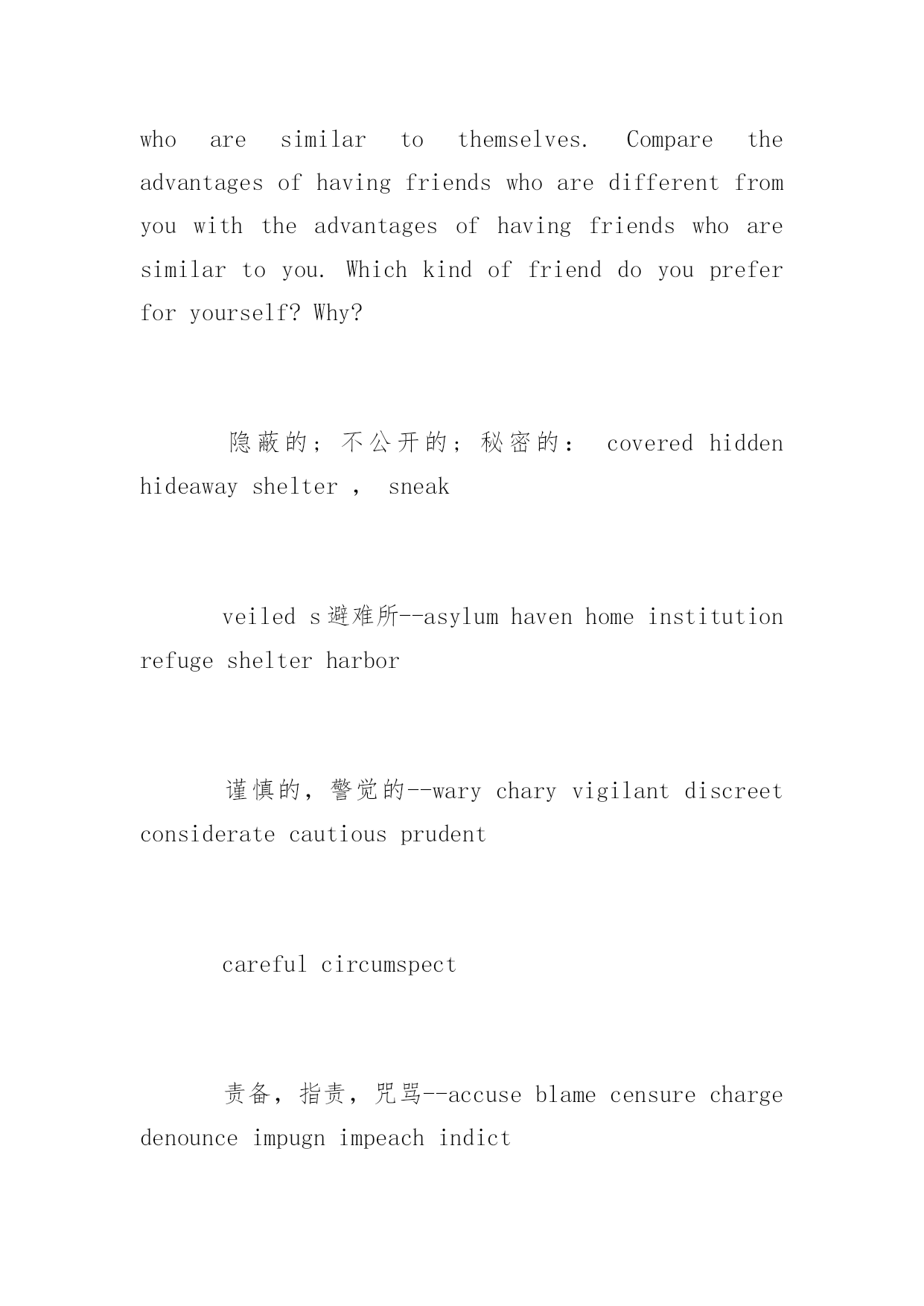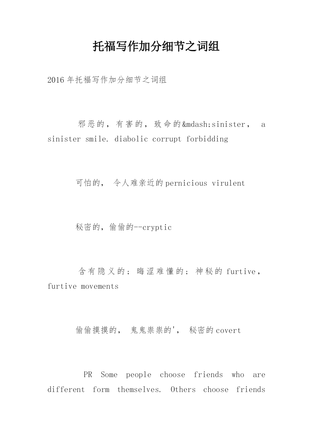 托福写作加分细节之词组 2016年托福写作加分细节之词组 邪恶的,有害的,致命的—sinister,asinistersmile.diaboliccorruptforbidding 可怕的,令人难亲近的perniciousvirulent 秘密的,偷偷的--cryptic 含有隐义的;晦涩难懂的;神秘的furtive,furtivemovements 偷偷摸摸的,鬼鬼祟祟的',秘密的covert PRSomepeoplechoosefriendswhoaredifferentformthemselves.Otherschoosefriendswhoaresimilartothemselves.Comparetheadvantagesofhavingfriendswhoaredifferentfromyouwiththeadvantagesofhavingfriendswhoaresimilartoyou.Whichkindoffrienddoyoupreferforyourself?Why? 隐蔽的;不公开的;秘密的:coveredhiddenhideawayshelter,sneak veileds避难所--asylumhavenhomeinstitutionrefugeshelterharbor 谨慎的,警觉的--warycharyvigilantdiscreetconsideratecautiousprudent carefulcircumspect 责备,指责,咒骂--accuseblamecensurechargedenounceimpugnimpeachindict execratecondemncriticizereproachreprovedisapproveupbraidvituperate reproveinjurereprehendrebukeinveighdiatribeabuselambasteobloquy invective 免责,确定无罪--exemptexonerateexculpateinvulnerableabsolve 妨碍,阻挠--filibusterencumberimpedehamperhinderstymiecurbobstruct restrainretardhamperthwartfoilclogcheckocclude