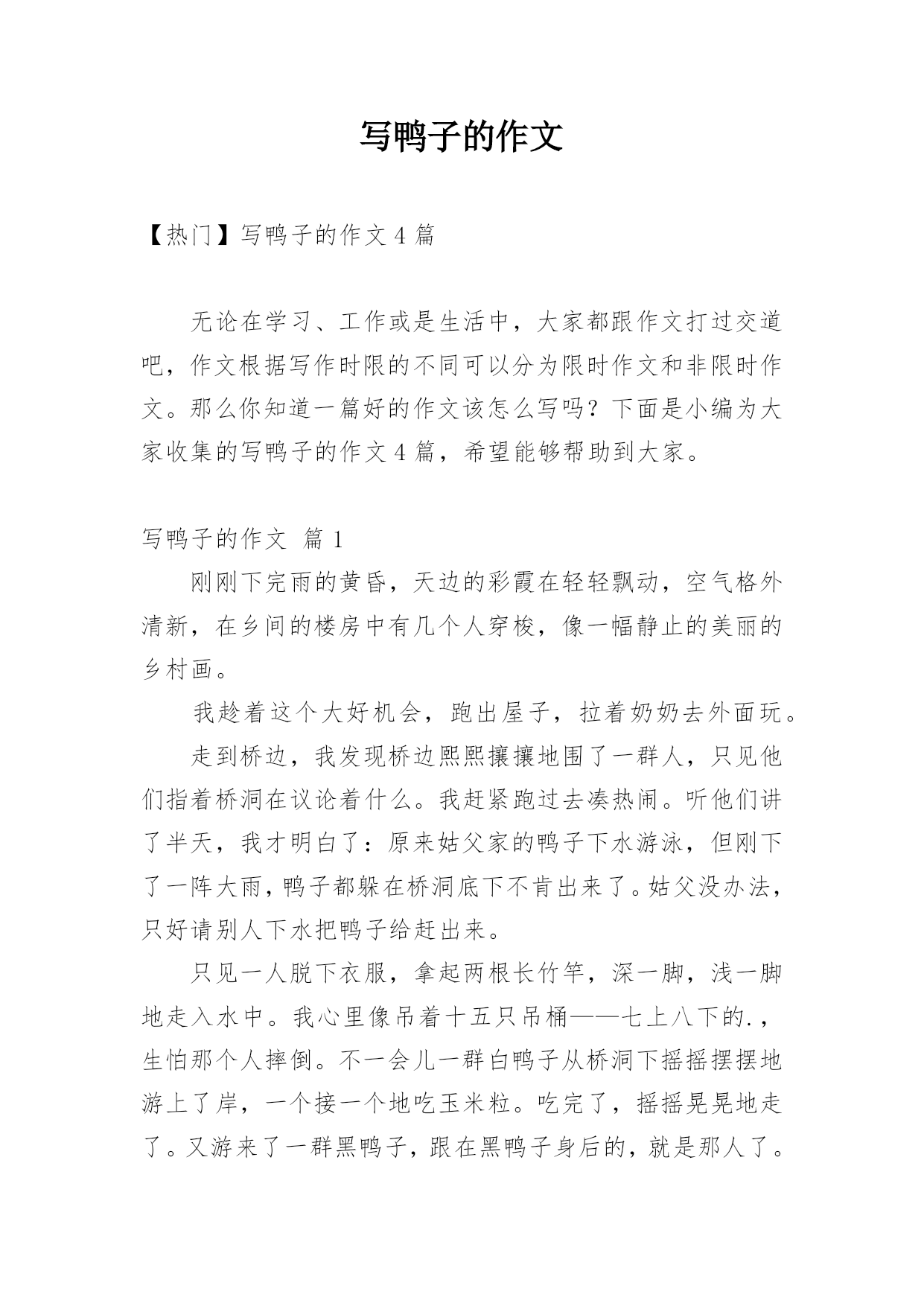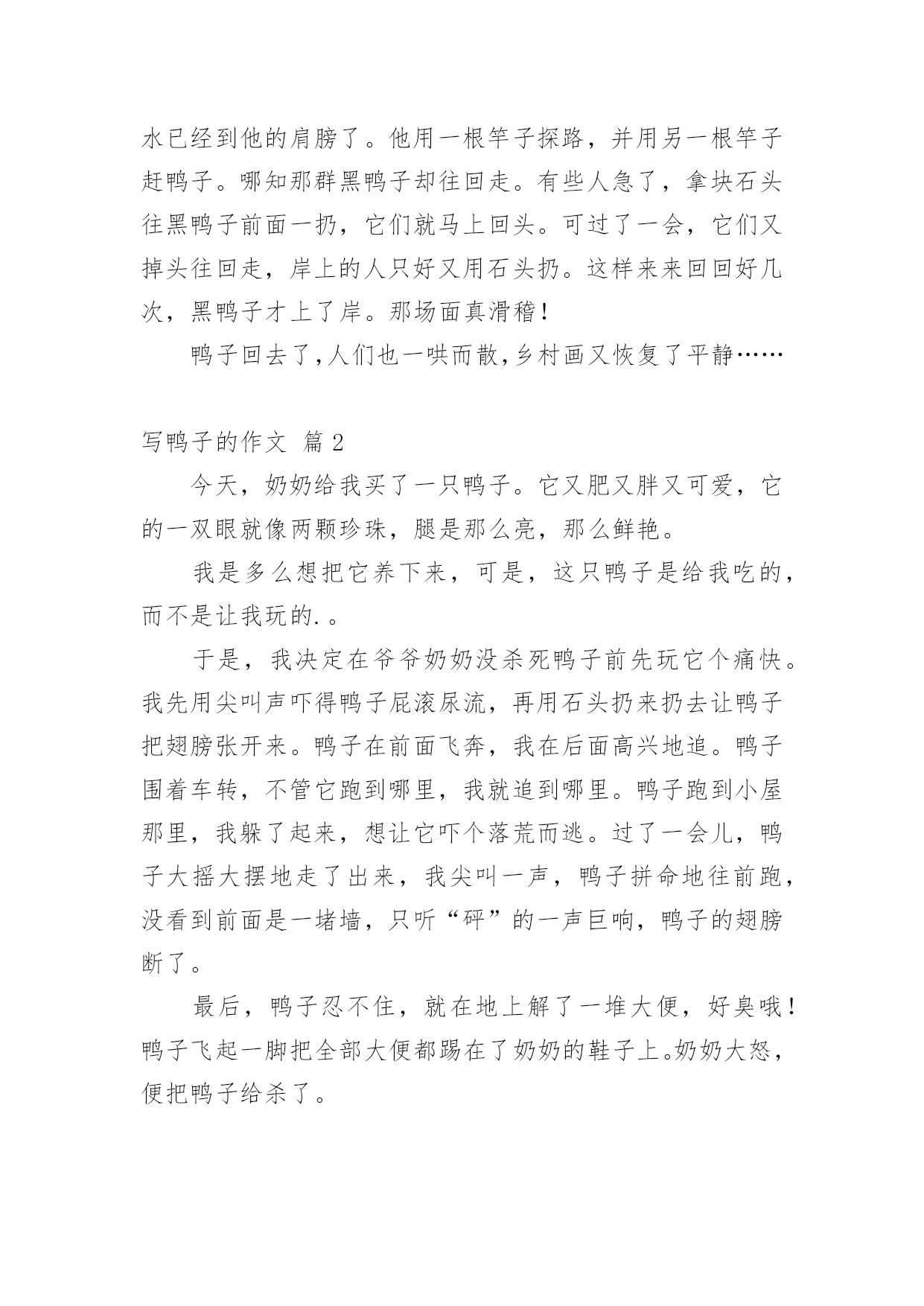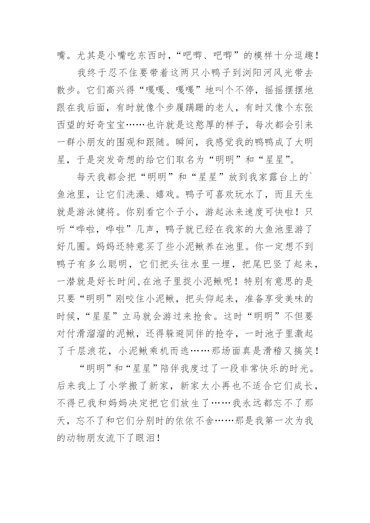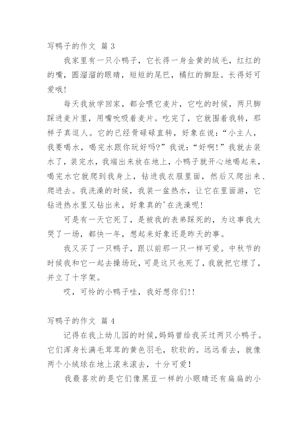 写鸭子的作文 【热门】写鸭子的作文4篇无论在学习、工作或是生活中,大家都跟作文打过交道吧,作文根据写作时限的不同可以分为限时作文和非限时作文。那么你知道一篇好的作文该怎么写吗?下面是小编为大家收集的写鸭子的作文4篇,希望能够帮助到大家。写鸭子的作文篇1刚刚下完雨的黄昏,天边的彩霞在轻轻飘动,空气格外清新,在乡间的楼房中有几个人穿梭,像一幅静止的美丽的乡村画。我趁着这个大好机会,跑出屋子,拉着奶奶去外面玩。走到桥边,我发现桥边熙熙攘攘地围了一群人,只见他们指着桥洞在议论着什么。我赶紧跑过去凑热闹。听他们讲了半天,我才明白了:原来姑父家的鸭子下水游泳,但刚下了一阵大雨,鸭子都躲在桥洞底下不肯出来了。姑父没办法,只好请别人下水把鸭子给赶出来。只见一人脱下衣服,拿起两根长竹竿,深一脚,浅一脚地走入水中。我心里像吊着十五只吊桶——七上八下的.,生怕那个人摔倒。不一会儿一群白鸭子从桥洞下摇摇摆摆地游上了岸,一个接一个地吃玉米粒。吃完了,摇摇晃晃地走了。又游来了一群黑鸭子,跟在黑鸭子身后的,就是那人了。水已经到他的肩膀了。他用一根竿子探路,并用另一根竿子赶鸭子。哪知那群黑鸭子却往回走。有些人急了,拿块石头往黑鸭子前面一扔,它们就马上回头。可过了一会,它们又掉头往回走,岸上的人只好又用石头扔。这样来来回回好几次,黑鸭子才上了岸。那场面真滑稽!鸭子回去了,人们也一哄而散,乡村画又恢复了平静……写鸭子的作文篇2今天,奶奶给我买了一只鸭子。它又肥又胖又可爱,它的一双眼就像两颗珍珠,腿是那么亮,那么鲜艳。我是多么想把它养下来,可是,这只鸭子是给我吃的,而不是让我玩的.。于是,我决定在爷爷奶奶没杀死鸭子前先玩它个痛快。我先用尖叫声吓得鸭子屁滚尿流,再用石头扔来扔去让鸭子把翅膀张开来。鸭子在前面飞奔,我在后面高兴地追。鸭子围着车转,不管它跑到哪里,我就追到哪里。鸭子跑到小屋那里,我躲了起来,想让它吓个落荒而逃。过了一会儿,鸭子大摇大摆地走了出来,我尖叫一声,鸭子拼命地往前跑,没看到前面是一堵墙,只听“砰”的一声巨响,鸭子的翅膀断了。最后,鸭子忍不住,就在地上解了一堆大便,好臭哦!鸭子飞起一脚把全部大便都踢在了奶奶的鞋子上。奶奶大怒,便把鸭子给杀了。写鸭子的作文篇3我家里有一只小鸭子,它长得一身金黄的绒毛,红红的的嘴,圆溜溜的眼睛,短短的尾巴,橘红的脚趾。长得好可爱哦!每天我放学回家,都会喂它麦片,它吃的时候,两只脚踩进麦片里,用嘴吮吸着麦片。吃完了,它就围着我转,那样子真逗人。它的已经骨碌碌直转,好象在说:“小主人,我要喝水,喝完水跟你玩好吗?”我说:“好啊!”我就去装水了,装完水,我端出来放在地上,小鸭子就开心地喝起来,喝完水它就爬到我身上,钻进我衣服里面,然后又爬出来、爬进去。我洗澡的时候,我装一盆热水,让它在里面游,它钻进热水里又钻出来,好象真的'在洗澡呢!可是有一天它死了,是被我的表弟踩死的,为这事我大哭了一场,都快一年,想起来好象还是昨天的事。我又买了一只鸭子,跟以前那一只一样可爱。中秋节的时候我和它一起去操场玩,可是这只也死了,我就把它埋了,并立了十字架。哎,可怜的小鸭子哇,我好想你们!!写鸭子的作文篇4记得在我上幼儿园的时候,妈妈曾给我买过两只小鸭子。它们浑身长满毛茸茸的黄色羽毛,软软的。远远看去,就像两个小绒球在地上滚来滚去,十分可爱!我最喜欢的是它们像黑豆一样的小眼睛还有扁扁的小嘴。尤其是小嘴吃东西时,“吧唧、吧唧”的模样十分逗趣!我终于忍不住要带着这两只小鸭子到浏阳河风光带去散步。它们高兴得“嘎嘎、嘎嘎”地叫个不停,摇摇摆摆地跟在我后面,有时就像个步履蹒跚的老人,有时又像个东张西望的好奇宝宝……也许就是这憨厚的样子,每次都会引来一群小朋友的围观和跟随。瞬间,我感觉我的鸭鸭成了大明星,于是突发奇想的给它们取名为“明明”和“星星”。每天我都会把“明明”和“星星”放到我家露台上的`鱼池里,让它们洗澡、嬉戏。鸭子可喜欢玩水了,而且天生就是游泳健将。你别看它个子小,游起泳来速度可快啦!只听“哗啦,哗啦”几声,鸭子就已经在我家的大鱼池里游了好几圈。妈妈还特意买了些小泥鳅养在池里。你一定想不到鸭子有多么聪明,它们把头往水里一埋,把尾巴竖了起来,一潜就是好长时间,在池子里捉小泥鳅呢!特别有意思的是只要“明明”刚咬住小泥鳅,把头仰起来,准备享受美味的时候,“星星”立马就会游过来抢食。这时“明明”不但要对付滑溜溜的泥鳅,还得躲避同伴的抢夺,一时池子里激起了千层浪花,小泥鳅乘机而逃……那场面真是滑稽又搞笑!“明明”和“星星”陪伴我度过了一段非常快乐的时光。后来我上了小学搬了新家,新家太小再也不适合它们成长,不得已我和妈妈决定把它们放生了……我永远都忘不了那天,忘不了和它们分别时的依依不舍……那是我第一次为我的动物朋友流下了眼泪!