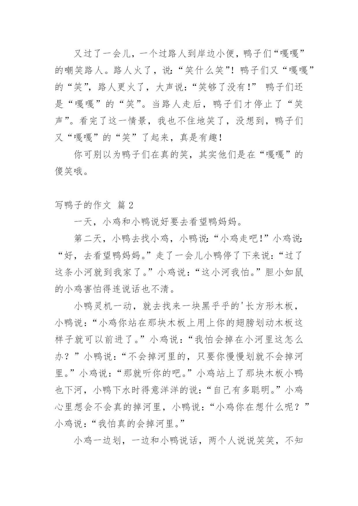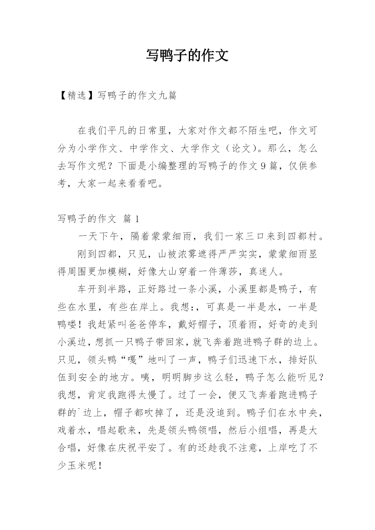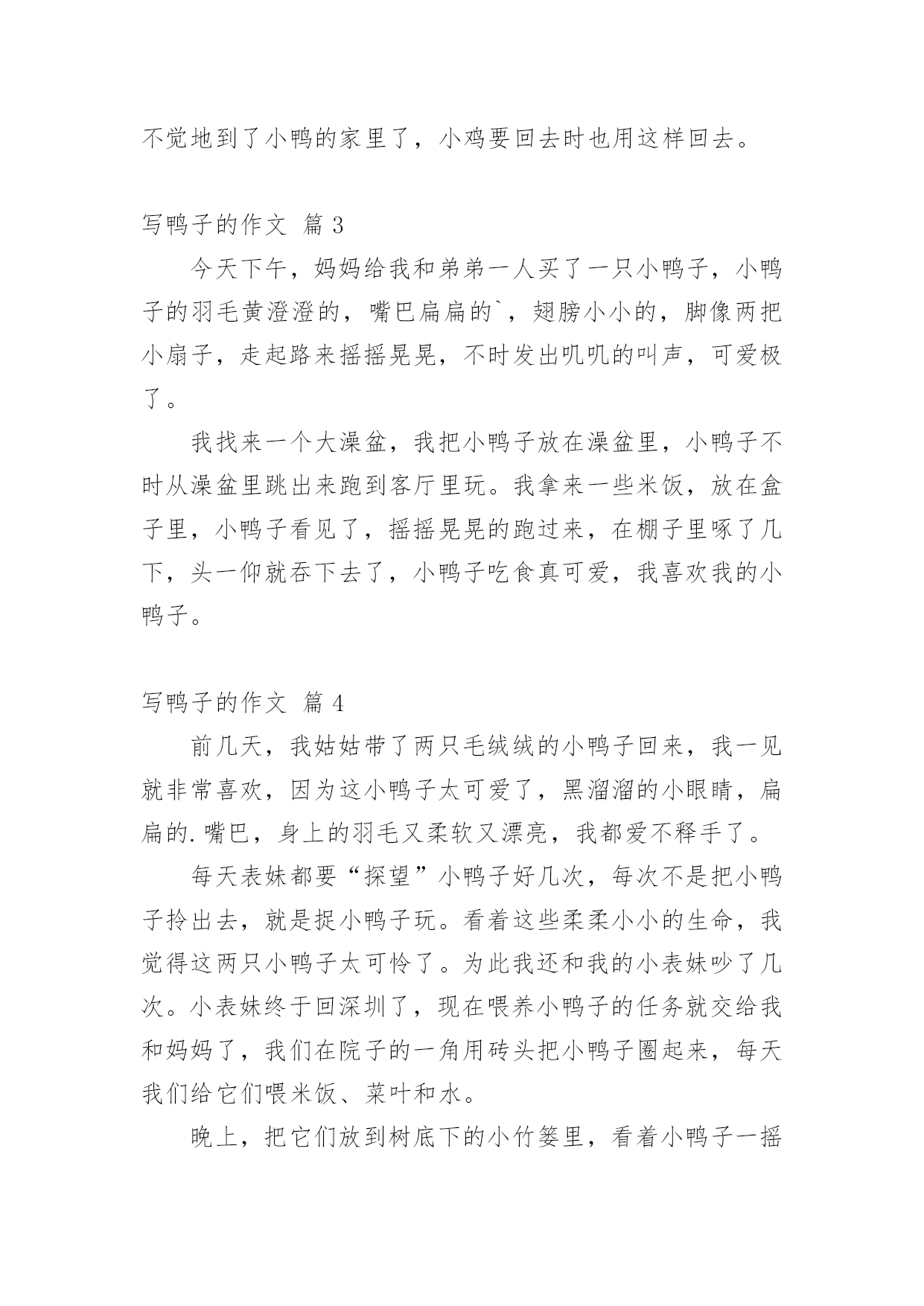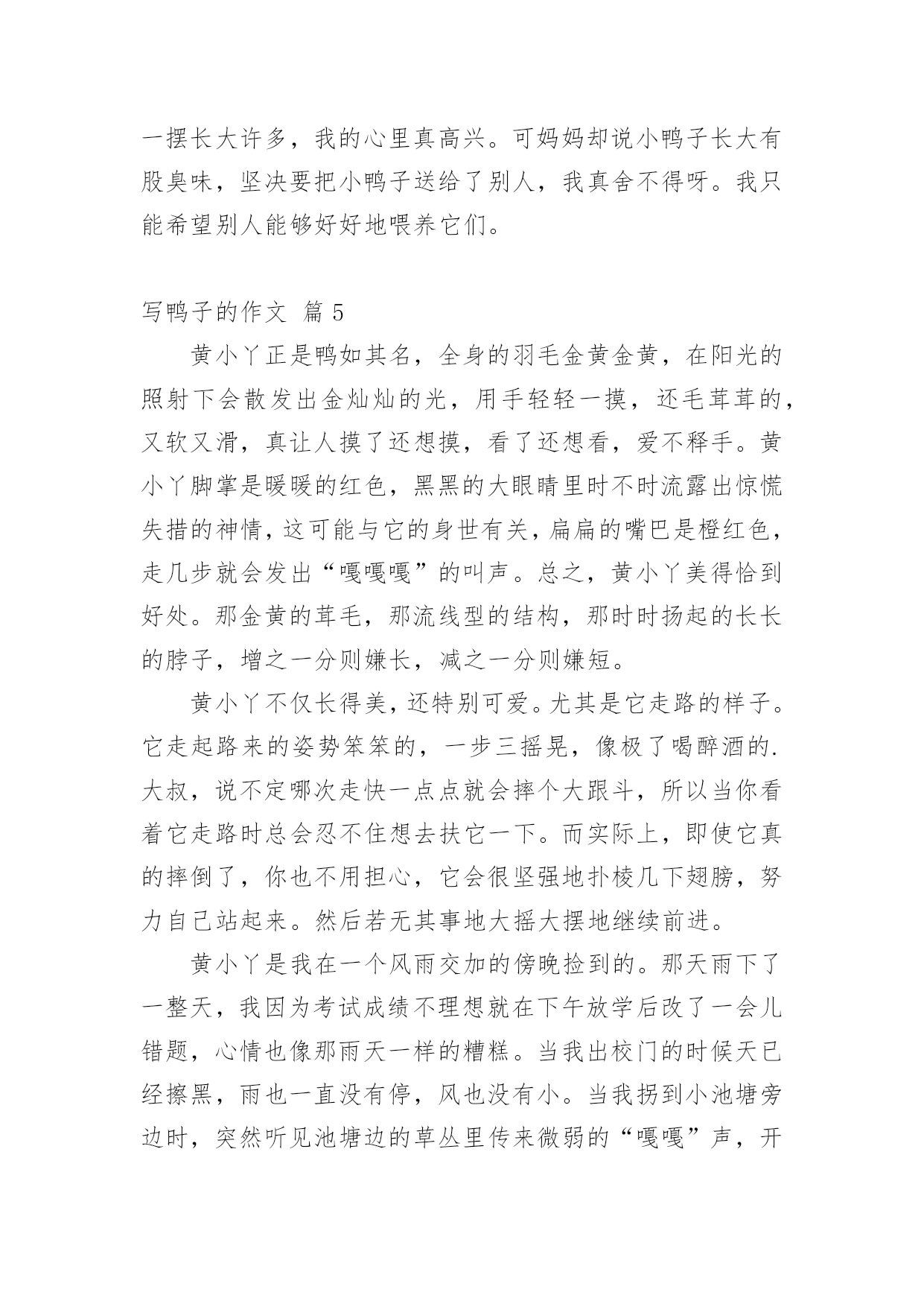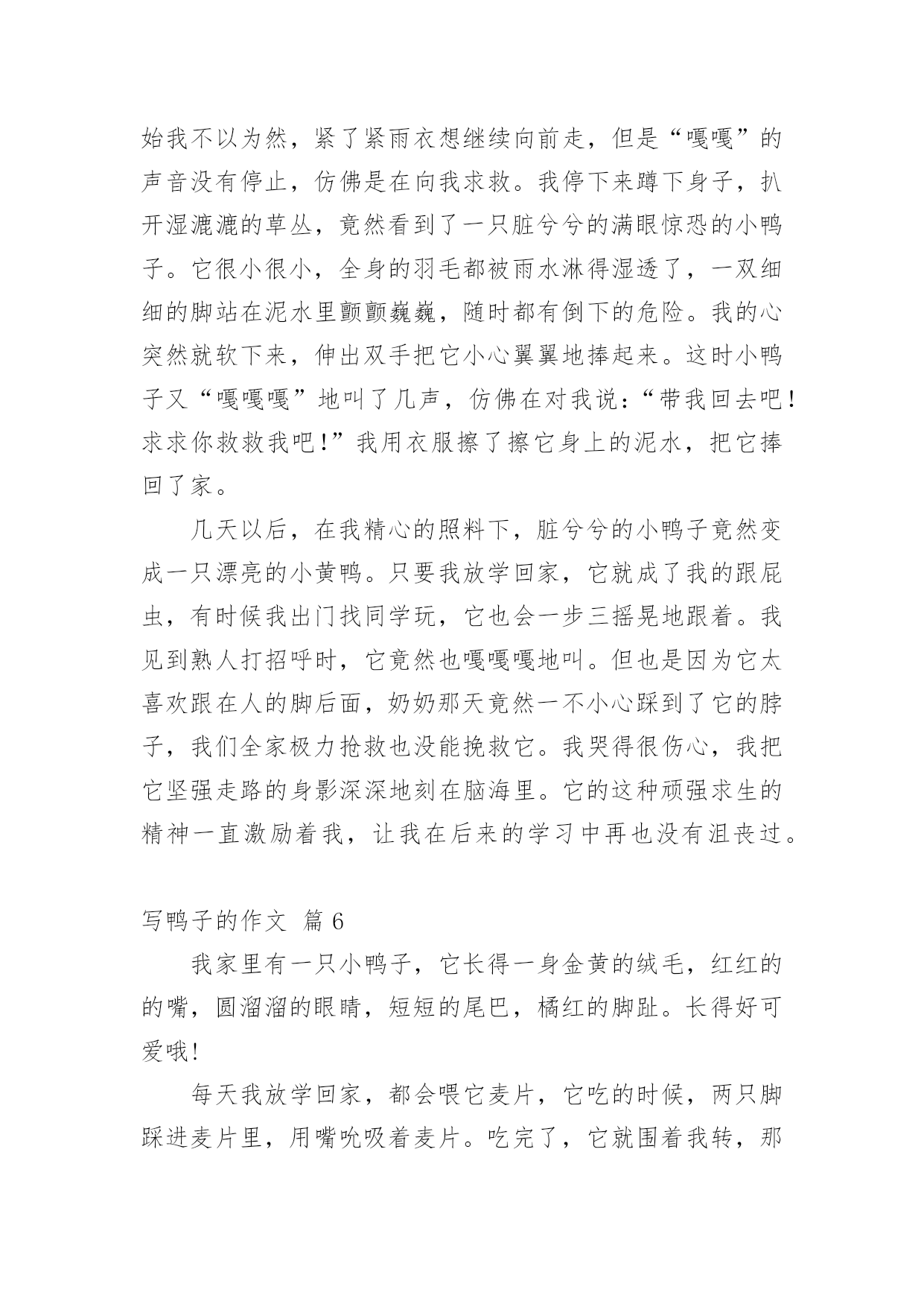写鸭子的作文 【精选】写鸭子的作文九篇在我们平凡的日常里,大家对作文都不陌生吧,作文可分为小学作文、中学作文、大学作文(论文)。那么,怎么去写作文呢?下面是小编整理的写鸭子的作文9篇,仅供参考,大家一起来看看吧。写鸭子的作文篇1一天下午,隔着蒙蒙细雨,我们一家三口来到四都村。刚到四都,只见,山被浓雾遮得严严实实,蒙蒙细雨显得周围更加模糊,好像大山穿着一件薄莎,真迷人。车开到半路,正好路过一条小溪,小溪里都是鸭子,有些在水里,有些在岸上。我想:,可真是一半是水,一半是鸭喽!我赶紧叫爸爸停车,戴好帽子,顶着雨,好奇的走到小溪边,想抓一只鸭子带回家,就飞奔着跑进鸭子群的边上。只见,领头鸭“嘎”地叫了一声,鸭子们迅速下水,排好队伍到安全的地方。咦,明明脚步这么轻,鸭子怎么能听见?我想,肯定我跑得太慢了。过了一会,便又飞奔着跑进鸭子群的`边上,帽子都吹掉了,还是没追到。鸭子们在水中央,戏着水,唱起歌来,先是领头鸭领唱,然后小组唱,再是大合唱,好像在庆祝平安了。有的还趁我不注意,上岸吃了不少玉米呢!又过了一会儿,一个过路人到岸边小便,鸭子们“嘎嘎”的嘲笑路人。路人火了,说:“笑什么笑”!鸭子们又“嘎嘎”的“笑”,路人更火了,大声说:“笑够了没有!”鸭子们还是“嘎嘎”的“笑”。当路人走后,鸭子们才停止了“笑声”。看完了这一情景,我也不住地笑了,没想到,鸭子们又“嘎嘎”的“笑”了起来,真是有趣!你可别以为鸭子们在真的笑,其实他们是在“嘎嘎”的傻笑哦。写鸭子的作文篇2一天,小鸡和小鸭说好要去看望鸭妈妈。第二天,小鸭去找小鸡,小鸭说:“小鸡走吧!”小鸡说:“好,去看望鸭妈妈。”走了一会儿小鸭停了下来说:“过了这条小河就到我家了。”小鸡说:“这小河我怕。”胆小如鼠的小鸡害怕得连说话也不清。小鸭灵机一动,就去找来一块黑乎乎的'长方形木板,小鸭说:“小鸡你站在那块木板上用上你的翅膀划动木板这样子就可以前进了。”小鸡说:“我怕会掉在小河里这怎么办?”小鸭说:“不会掉河里的,只要你慢慢划就不会掉河里。”小鸡说:“那就听你的吧。”小鸡站上了那块木板小鸭也下河,小鸭下水时得意洋洋的说:“自己有多聪明。”小鸡心里想会不会真的掉河里,小鸭说:“小鸡你在想什么呢?”小鸡说:“我怕真的会掉河里。”小鸡一边划,一边和小鸭说话,两个人说说笑笑,不知不觉地到了小鸭的家里了,小鸡要回去时也用这样回去。写鸭子的作文篇3今天下午,妈妈给我和弟弟一人买了一只小鸭子,小鸭子的羽毛黄澄澄的,嘴巴扁扁的`,翅膀小小的,脚像两把小扇子,走起路来摇摇晃晃,不时发出叽叽的叫声,可爱极了。我找来一个大澡盆,我把小鸭子放在澡盆里,小鸭子不时从澡盆里跳出来跑到客厅里玩。我拿来一些米饭,放在盒子里,小鸭子看见了,摇摇晃晃的跑过来,在棚子里啄了几下,头一仰就吞下去了,小鸭子吃食真可爱,我喜欢我的小鸭子。写鸭子的作文篇4前几天,我姑姑带了两只毛绒绒的小鸭子回来,我一见就非常喜欢,因为这小鸭子太可爱了,黑溜溜的小眼睛,扁扁的.嘴巴,身上的羽毛又柔软又漂亮,我都爱不释手了。每天表妹都要“探望”小鸭子好几次,每次不是把小鸭子拎出去,就是捉小鸭子玩。看着这些柔柔小小的生命,我觉得这两只小鸭子太可怜了。为此我还和我的小表妹吵了几次。小表妹终于回深圳了,现在喂养小鸭子的任务就交给我和妈妈了,我们在院子的一角用砖头把小鸭子圈起来,每天我们给它们喂米饭、菜叶和水。晚上,把它们放到树底下的小竹篓里,看着小鸭子一摇一摆长大许多,我的心里真高兴。可妈妈却说小鸭子长大有股臭味,坚决要把小鸭子送给了别人,我真舍不得呀。我只能希望别人能够好好地喂养它们。写鸭子的作文篇5黄小丫正是鸭如其名,全身的羽毛金黄金黄,在阳光的照射下会散发出金灿灿的光,用手轻轻一摸,还毛茸茸的,又软又滑,真让人摸了还想摸,看了还想看,爱不释手。黄小丫脚掌是暖暖的红色,黑黑的大眼睛里时不时流露出惊慌失措的神情,这可能与它的身世有关,扁扁的嘴巴是橙红色,走几步就会发出“嘎嘎嘎”的叫声。总之,黄小丫美得恰到好处。那金黄的茸毛,那流线型的结构,那时时扬起的长长的脖子,增之一分则嫌长,减之一分则嫌短。黄小丫不仅长得美,还特别可爱。尤其是它走路的样子。它走起路来的姿势笨笨的,一步三摇晃,像极了喝醉酒的.大叔,说不定哪次走快一点点就会摔个大跟斗,所以当你看着它走路时总会忍不住想去扶它一下。而实际上,即使它真的摔倒了,你也不用担心,它会很坚强地扑棱几下翅膀,努力自己站起来。然后若无其事地大摇大摆地继续前进。黄小丫是我在一个风雨交加的傍晚捡到的。那天雨下了一整天,我因为考试成绩不理想就在下午放学后改了一会儿错题,心情也像那雨天一样的糟糕。当我出校门的时候天已经擦黑,雨也一直没有停,风也没有小。当我拐到小池塘旁边时,突然听见池塘边的草丛里传来微弱的“嘎嘎”声,开始我不以为然,紧