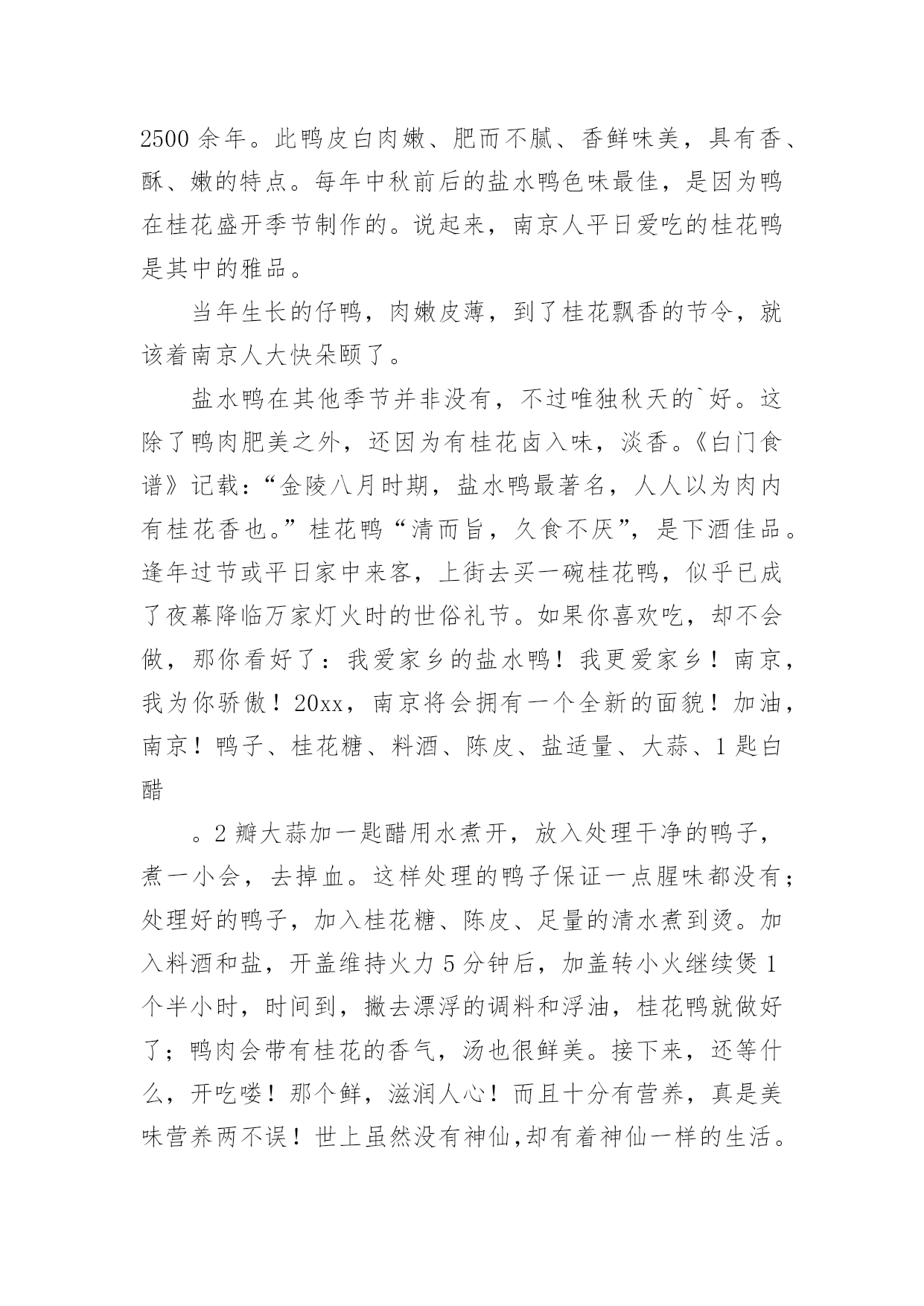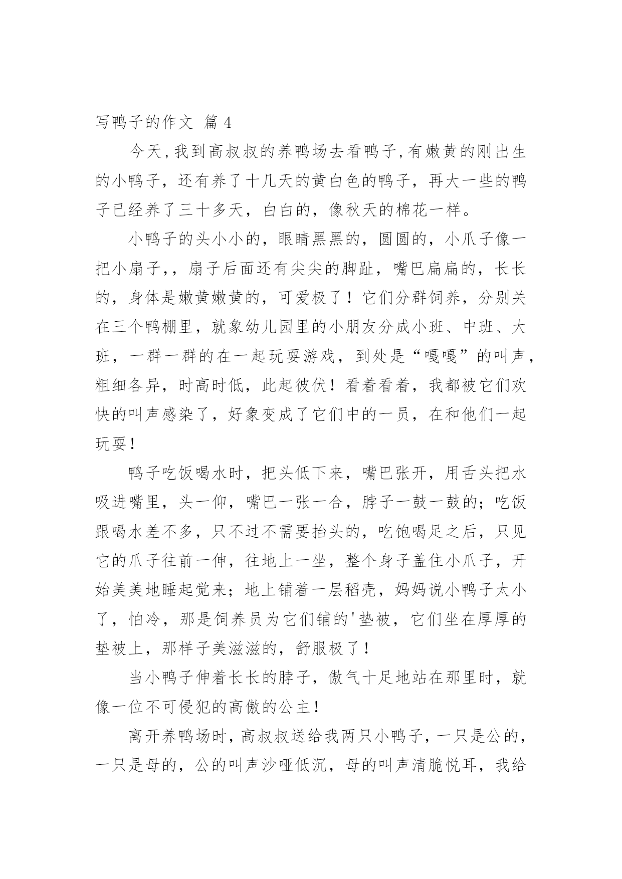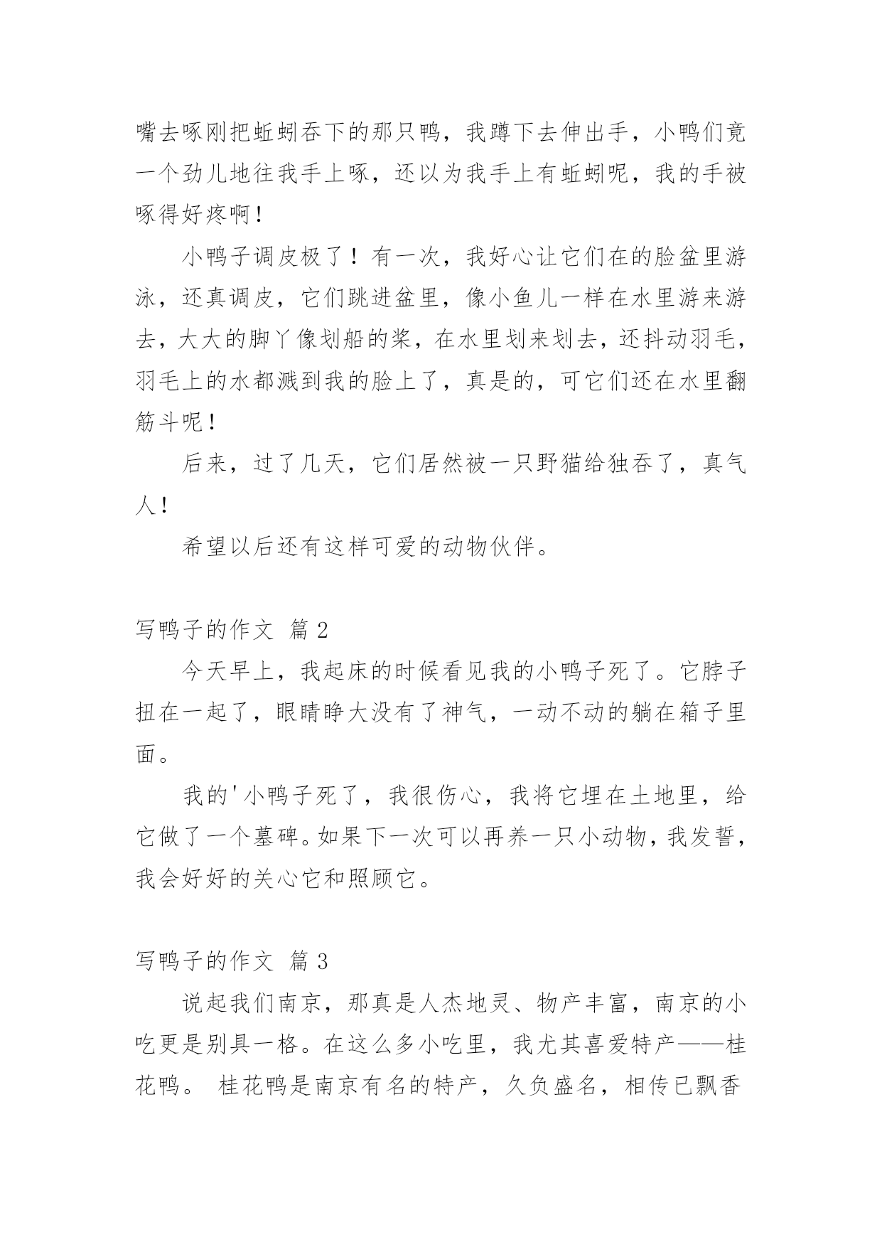 写鸭子的作文 【实用】写鸭子的作文汇编九篇在学习、工作乃至生活中,许多人都有过写作文的经历,对作文都不陌生吧,写作文是培养人们的观察力、联想力、想象力、思考力和记忆力的重要手段。你知道作文怎样写才规范吗?以下是小编精心整理的写鸭子的作文9篇,仅供参考,大家一起来看看吧。写鸭子的作文篇1有一次,妈妈给我买来了三只小鸭子,它们非常可爱,也很调皮。小鸭长着半圆形的嘴,上面还有两个小鼻孔,我觉得这应该是它的呼吸的地方了。它的眼睛非常迷人,小小的、圆圆的,眼珠子黑黑的好像一颗黑宝石。它的尾巴短短的、尖尖的。它们全身披着黄色的羽毛,我摸着羽毛感觉又软又滑,摸了还想摸。它们的脚大大的,鸭子游泳时可全靠它。小鸭子爱吃米,也爱吃草,最爱吃的是一些小蚯蚓,你猜我是怎么知道他爱吃什么食物的?是查资料?不,不,不,是有一次我带小鸭们到楼下去玩,它们不时地吃着路边的'小草,突然,它们你追我赶,我奇怪地看过去,原来是一只小蚯蚓引起了小鸭的注意,抢先吃到蚯蚓的小鸭喜滋滋的,还东张西望,似乎还不解谗,而没吃到蚯蚓的小鸭竟然用小嘴去啄刚把蚯蚓吞下的那只鸭,我蹲下去伸出手,小鸭们竟一个劲儿地往我手上啄,还以为我手上有蚯蚓呢,我的手被啄得好疼啊!小鸭子调皮极了!有一次,我好心让它们在的脸盆里游泳,还真调皮,它们跳进盆里,像小鱼儿一样在水里游来游去,大大的脚丫像划船的桨,在水里划来划去,还抖动羽毛,羽毛上的水都溅到我的脸上了,真是的,可它们还在水里翻筋斗呢!后来,过了几天,它们居然被一只野猫给独吞了,真气人!希望以后还有这样可爱的动物伙伴。写鸭子的作文篇2今天早上,我起床的时候看见我的小鸭子死了。它脖子扭在一起了,眼睛睁大没有了神气,一动不动的躺在箱子里面。我的'小鸭子死了,我很伤心,我将它埋在土地里,给它做了一个墓碑。如果下一次可以再养一只小动物,我发誓,我会好好的关心它和照顾它。写鸭子的作文篇3说起我们南京,那真是人杰地灵、物产丰富,南京的小吃更是别具一格。在这么多小吃里,我尤其喜爱特产——桂花鸭。桂花鸭是南京有名的特产,久负盛名,相传已飘香2500余年。此鸭皮白肉嫩、肥而不腻、香鲜味美,具有香、酥、嫩的特点。每年中秋前后的盐水鸭色味最佳,是因为鸭在桂花盛开季节制作的。说起来,南京人平日爱吃的桂花鸭是其中的雅品。当年生长的仔鸭,肉嫩皮薄,到了桂花飘香的节令,就该着南京人大快朵颐了。盐水鸭在其他季节并非没有,不过唯独秋天的`好。这除了鸭肉肥美之外,还因为有桂花卤入味,淡香。《白门食谱》记载:“金陵八月时期,盐水鸭最著名,人人以为肉内有桂花香也。”桂花鸭“清而旨,久食不厌”,是下酒佳品。逢年过节或平日家中来客,上街去买一碗桂花鸭,似乎已成了夜幕降临万家灯火时的世俗礼节。如果你喜欢吃,却不会做,那你看好了:我爱家乡的盐水鸭!我更爱家乡!南京,我为你骄傲!20xx,南京将会拥有一个全新的面貌!加油,南京!鸭子、桂花糖、料酒、陈皮、盐适量、大蒜、1匙白醋。2瓣大蒜加一匙醋用水煮开,放入处理干净的鸭子,煮一小会,去掉血。这样处理的鸭子保证一点腥味都没有;处理好的鸭子,加入桂花糖、陈皮、足量的清水煮到烫。加入料酒和盐,开盖维持火力5分钟后,加盖转小火继续煲1个半小时,时间到,撇去漂浮的调料和浮油,桂花鸭就做好了;鸭肉会带有桂花的香气,汤也很鲜美。接下来,还等什么,开吃喽!那个鲜,滋润人心!而且十分有营养,真是美味营养两不误!世上虽然没有神仙,却有着神仙一样的生活。写鸭子的作文篇4今天,我到高叔叔的养鸭场去看鸭子,有嫩黄的刚出生的小鸭子,还有养了十几天的黄白色的鸭子,再大一些的鸭子已经养了三十多天,白白的,像秋天的棉花一样。小鸭子的头小小的,眼睛黑黑的,圆圆的,小爪子像一把小扇子,,扇子后面还有尖尖的脚趾,嘴巴扁扁的,长长的,身体是嫩黄嫩黄的,可爱极了!它们分群饲养,分别关在三个鸭棚里,就象幼儿园里的小朋友分成小班、中班、大班,一群一群的在一起玩耍游戏,到处是“嘎嘎”的叫声,粗细各异,时高时低,此起彼伏!看着看着,我都被它们欢快的叫声感染了,好象变成了它们中的一员,在和他们一起玩耍!鸭子吃饭喝水时,把头低下来,嘴巴张开,用舌头把水吸进嘴里,头一仰,嘴巴一张一合,脖子一鼓一鼓的;吃饭跟喝水差不多,只不过不需要抬头的,吃饱喝足之后,只见它的爪子往前一伸,往地上一坐,整个身子盖住小爪子,开始美美地睡起觉来;地上铺着一层稻壳,妈妈说小鸭子太小了,怕冷,那是饲养员为它们铺的'垫被,它们坐在厚厚的垫被上,那样子美滋滋的,舒服极了!当小鸭子伸着长长的脖子,傲气十足地站在那里时,就像一位不可侵犯的高傲的公主!离开养鸭场时,高叔叔送给我两只小鸭子,一只是公的,一只是母的,公的叫声沙哑低沉,母的叫声清脆悦耳,我给他们各取了一个名字,母的叫“公主”,公的叫“王子”,在返回的车上,“公主”和“王子”