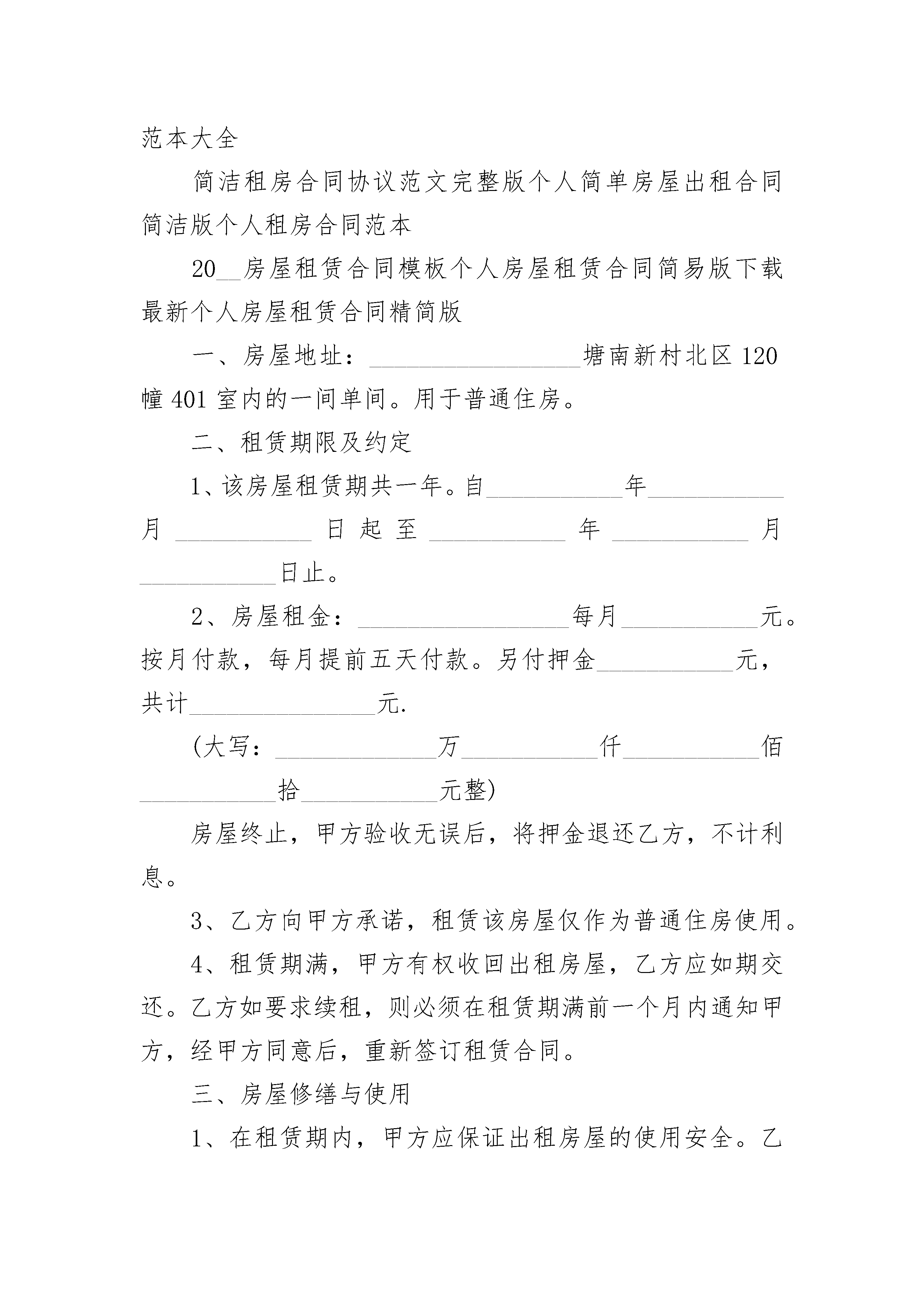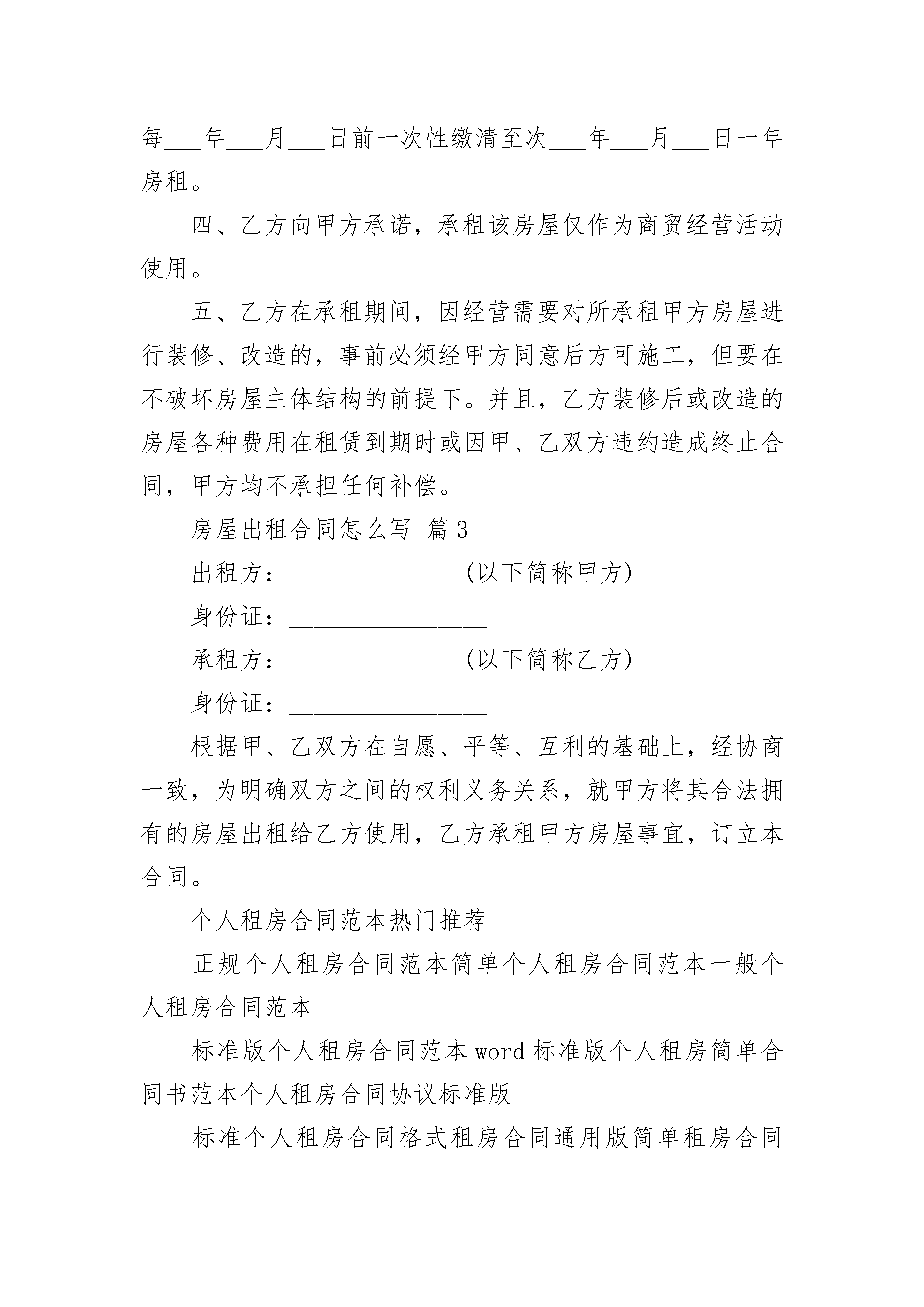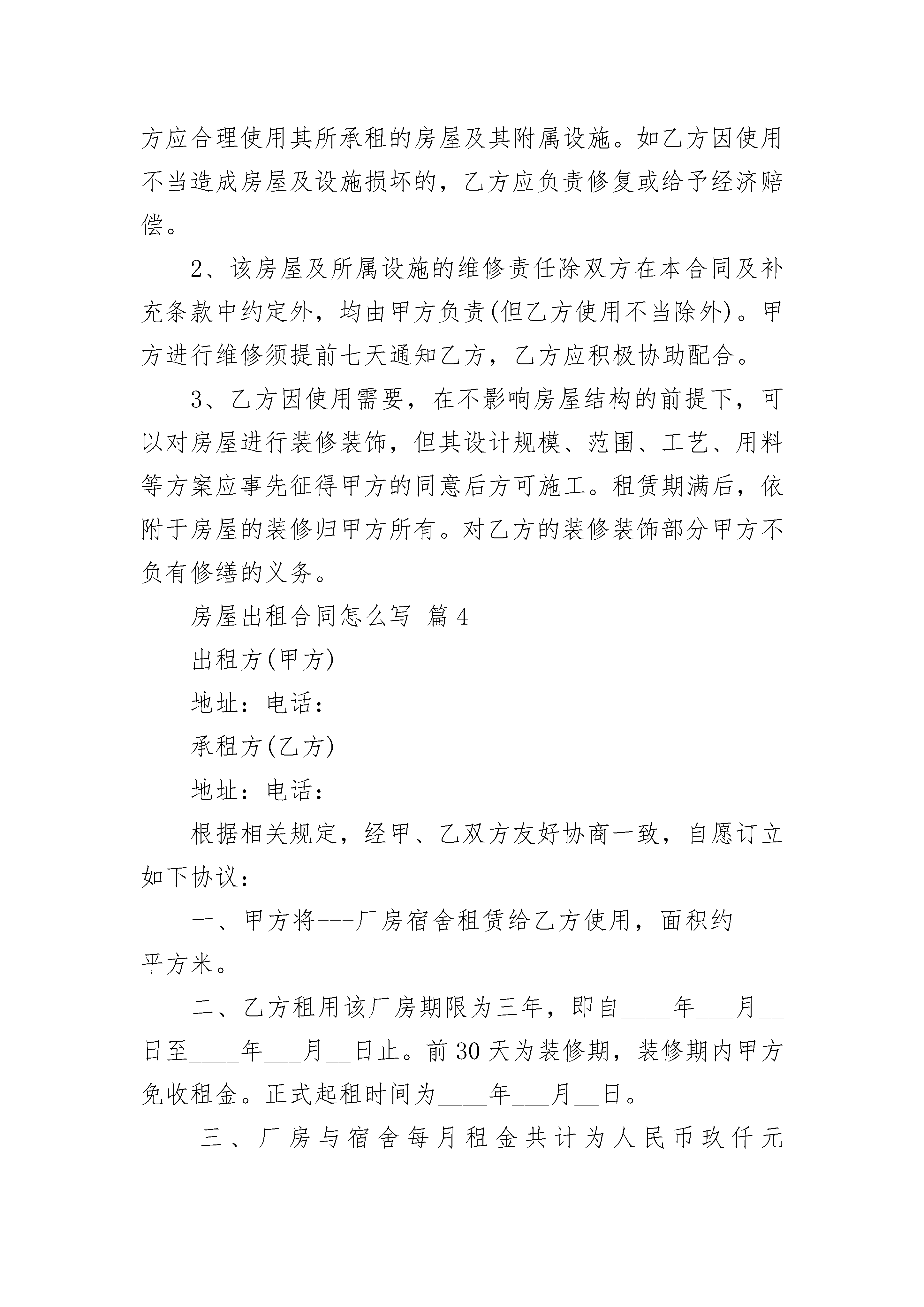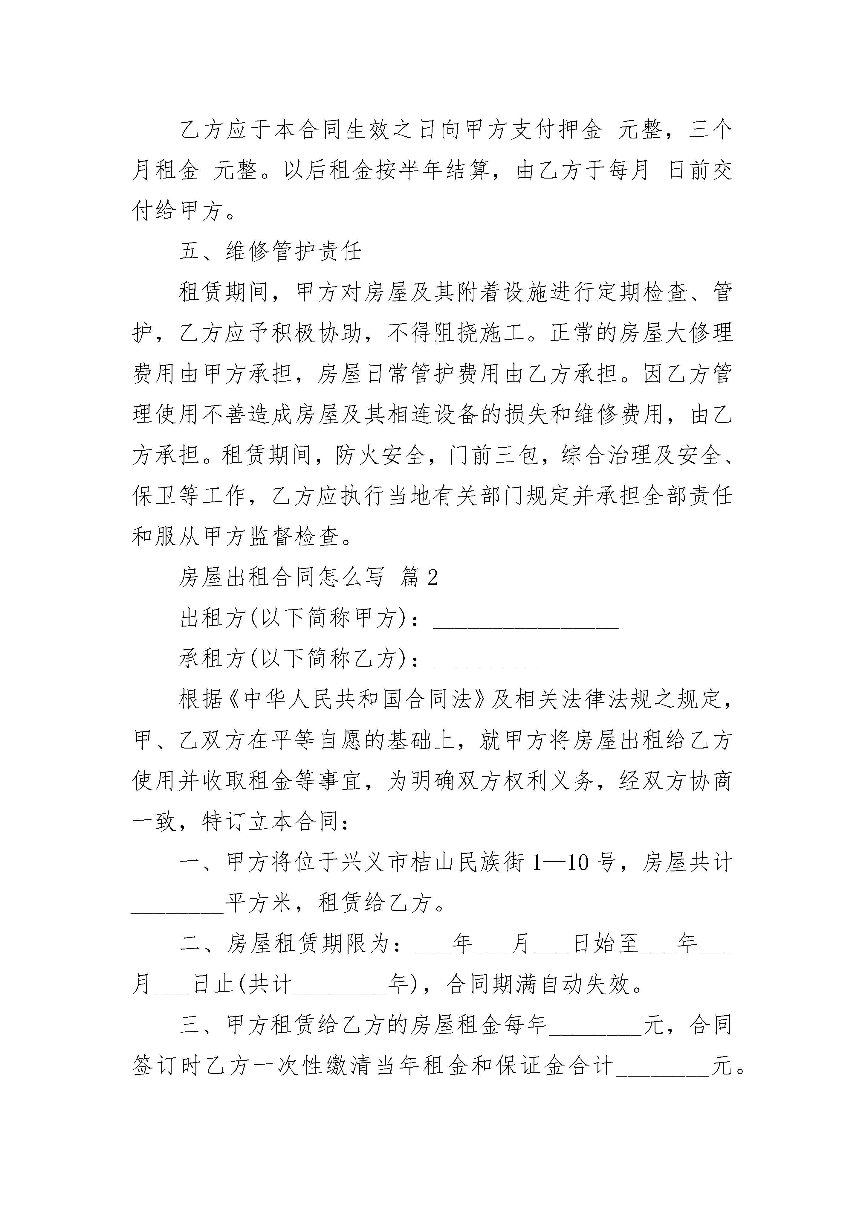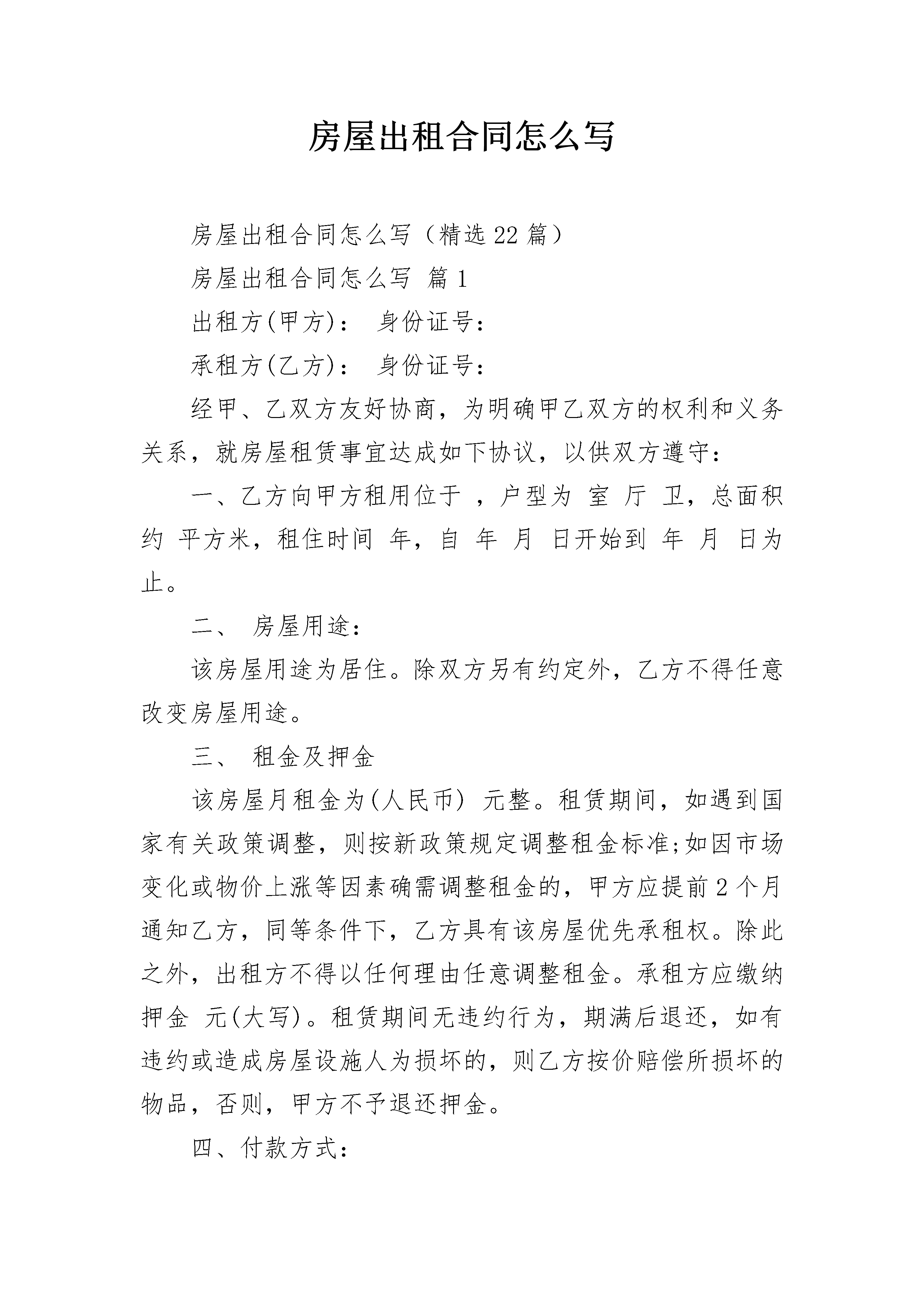 房屋出租合同怎么写房屋出租合同怎么写(精选22篇)房屋出租合同怎么写篇1出租方(甲方):身份证号:承租方(乙方):身份证号:经甲、乙双方友好协商,为明确甲乙双方的权利和义务关系,就房屋租赁事宜达成如下协议,以供双方遵守:一、乙方向甲方租用位于,户型为室厅卫,总面积约平方米,租住时间年,自年月日开始到年月日为止。二、房屋用途:该房屋用途为居住。除双方另有约定外,乙方不得任意改变房屋用途。三、租金及押金该房屋月租金为(人民币)元整。租赁期间,如遇到国家有关政策调整,则按新政策规定调整租金标准;如因市场变化或物价上涨等因素确需调整租金的,甲方应提前2个月通知乙方,同等条件下,乙方具有该房屋优先承租权。除此之外,出租方不得以任何理由任意调整租金。承租方应缴纳押金元(大写)。租赁期间无违约行为,期满后退还,如有违约或造成房屋设施人为损坏的,则乙方按价赔偿所损坏的物品,否则,甲方不予退还押金。四、付款方式:乙方应于本合同生效之日向甲方支付押金元整,三个月租金元整。以后租金按半年结算,由乙方于每月日前交付给甲方。五、维修管护责任租赁期间,甲方对房屋及其附着设施进行定期检查、管护,乙方应予积极协助,不得阻挠施工。正常的房屋大修理费用由甲方承担,房屋日常管护费用由乙方承担。因乙方管理使用不善造成房屋及其相连设备的损失和维修费用,由乙方承担。租赁期间,防火安全,门前三包,综合治理及安全、保卫等工作,乙方应执行当地有关部门规定并承担全部责任和服从甲方监督检查。房屋出租合同怎么写篇2出租方(以下简称甲方):________________承租方(以下简称乙方):_________根据《中华人民共和国合同法》及相关法律法规之规定,甲、乙双方在平等自愿的基础上,就甲方将房屋出租给乙方使用并收取租金等事宜,为明确双方权利义务,经双方协商一致,特订立本合同:一、甲方将位于兴义市桔山民族街1—10号,房屋共计________平方米,租赁给乙方。二、房屋租赁期限为:___年___月___日始至___年___月___日止(共计________年),合同期满自动失效。三、甲方租赁给乙方的房屋租金每年________元,合同签订时乙方一次性缴清当年租金和保证金合计________元。每___年___月___日前一次性缴清至次___年___月___日一年房租。四、乙方向甲方承诺,承租该房屋仅作为商贸经营活动使用。五、乙方在承租期间,因经营需要对所承租甲方房屋进行装修、改造的,事前必须经甲方同意后方可施工,但要在不破坏房屋主体结构的前提下。并且,乙方装修后或改造的房屋各种费用在租赁到期时或因甲、乙双方违约造成终止合同,甲方均不承担任何补偿。房屋出租合同怎么写篇3出租方:______________(以下简称甲方)身份证:________________承租方:______________(以下简称乙方)身份证:________________根据甲、乙双方在自愿、平等、互利的基础上,经协商一致,为明确双方之间的权利义务关系,就甲方将其合法拥有的房屋出租给乙方使用,乙方承租甲方房屋事宜,订立本合同。个人租房合同范本热门推荐正规个人租房合同范本简单个人租房合同范本一般个人租房合同范本标准版个人租房合同范本word标准版个人租房简单合同书范本个人租房合同协议标准版标准个人租房合同格式租房合同通用版简单租房合同范本大全简洁租房合同协议范文完整版个人简单房屋出租合同简洁版个人租房合同范本20__房屋租赁合同模板个人房屋租赁合同简易版下载最新个人房屋租赁合同精简版一、房屋地址:_________________塘南新村北区120幢401室内的一间单间。用于普通住房。二、租赁期限及约定1、该房屋租赁期共一年。自___________年___________月___________日起至___________年___________月___________日止。2、房屋租金:_________________每月___________元。按月付款,每月提前五天付款。另付押金___________元,共计_______________元.(大写:_____________万___________仟___________佰___________拾___________元整)房屋终止,甲方验收无误后,将押金退还乙方,不计利息。3、乙方向甲方承诺,租赁该房屋仅作为普通住房使用。4、租赁期满,甲方有权收回出租房屋,乙方应如期交还。乙方如要求续租,则必须在租赁期满前一个月内通知甲方,经甲方同意后,重新签订租赁合同。三、房屋修缮与使用1、在租赁期内,甲方应保证出租房屋的使用安全。乙方应合理使用其所承租的房屋及其附属设施。如乙方因使用不当造成房屋及设施损坏的,乙方应负责修复或给予经济赔偿。2、该房屋