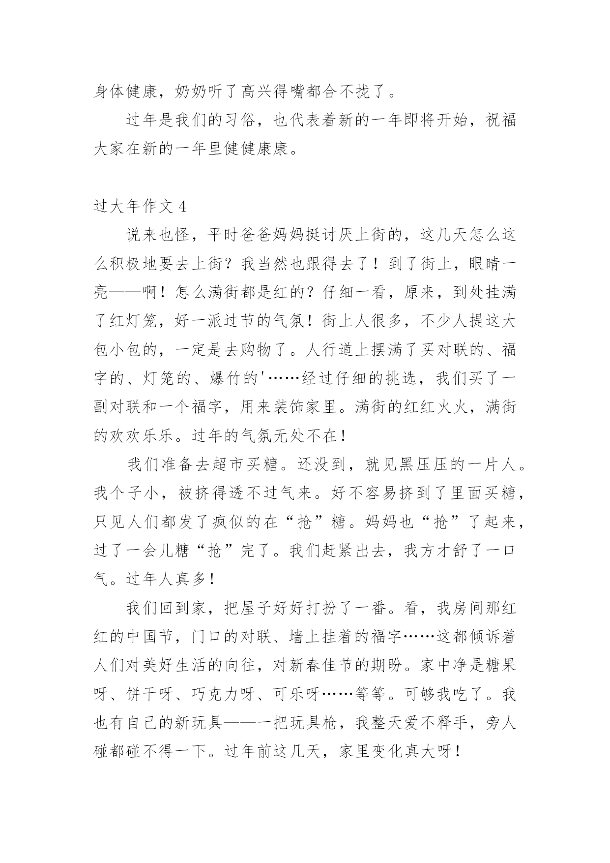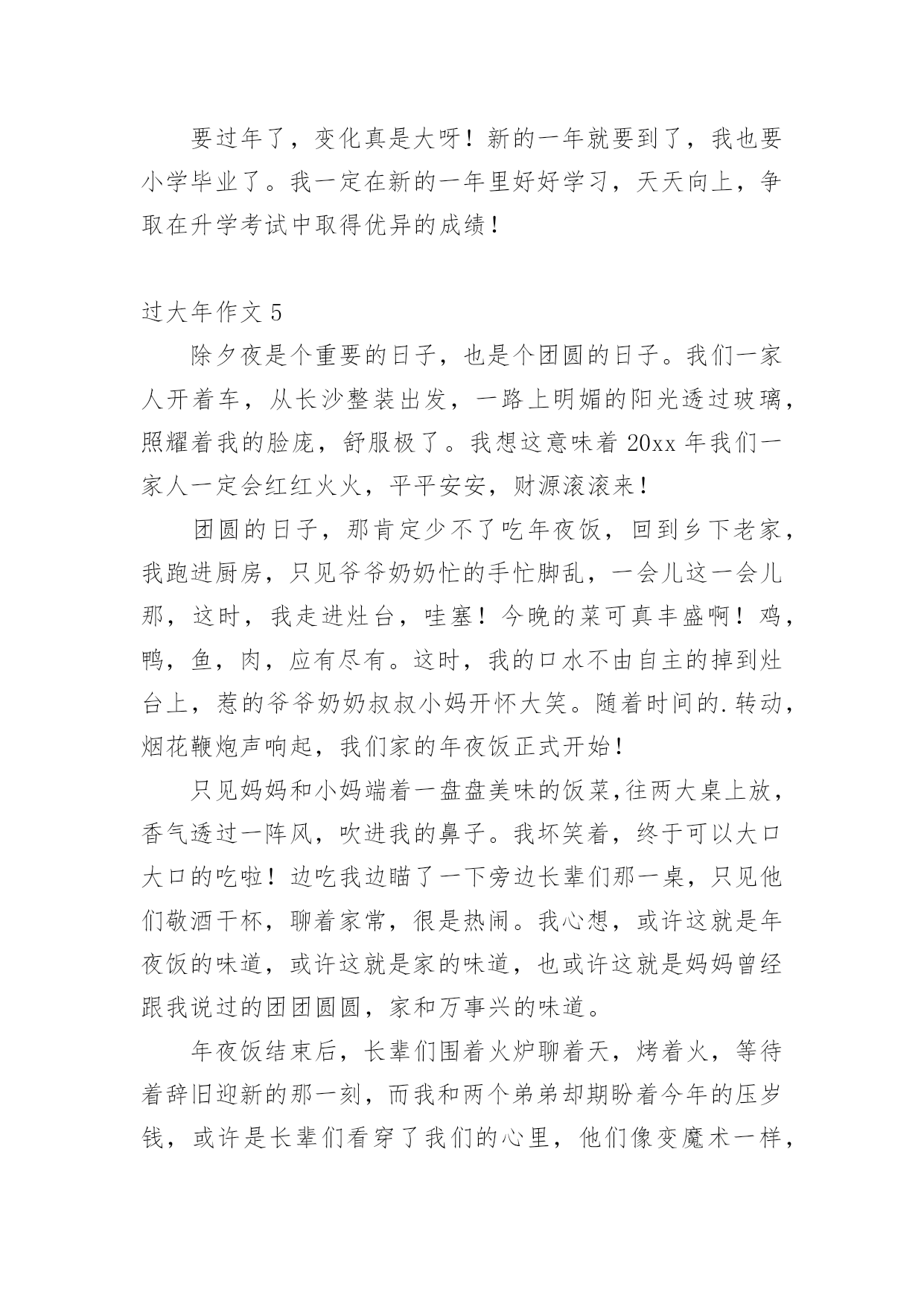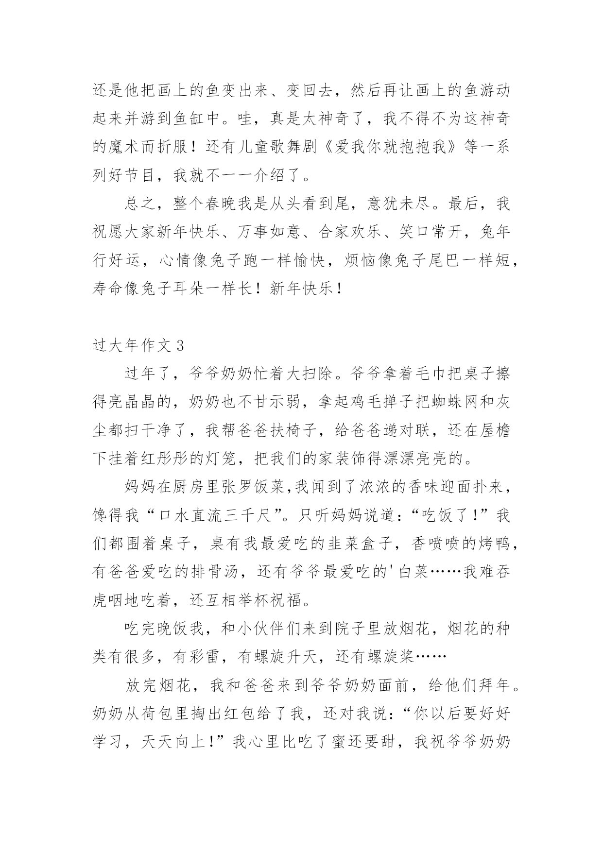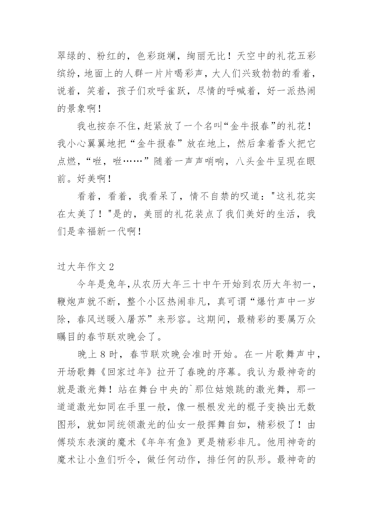 过大年作文 过大年作文在学习、工作或生活中,大家都有写作文的经历,对作文很是熟悉吧,作文是从内部言语向外部言语的过渡,即从经过压缩的简要的、自己能明白的语言,向开展的、具有规范语法结构的、能为他人所理解的外部语言形式的转化。你知道作文怎样写才规范吗?以下是小编精心整理的过大年作文,仅供参考,欢迎大家阅读。过大年作文1一年一度的春节又到了!大年初一那天,我们家去了清新温泉度假村游玩。一路上,只见男女老少都穿上新衣服,人们的脸上都洋溢着灿烂的笑容。我们居住在度假村内,五彩缤纷的灯饰点缀着整座旅馆和周围的树木,伴随其中的一个个红灯笼就像淘气的娃娃在别墅门前探头探脑。还有挂在路旁的彩旗在清风的吹拂下摇拽生姿,仿佛在欢迎来访度假村的贵宾呢。最热闹的夜晚终于到来了。五颜六色的礼花被欢乐的'人们送上夜空,把晚上的天空装扮得格外迷人,充满节日的喜庆气氛。这些礼花有的像盘曲而上的蛟龙,有的像小巧玲珑的海螺,有的像闪闪发光的巨型圣诞树……伴随着一声的巨响,又一个庞大的礼花绽放在夜空中。银白的、淡黄的、翠绿的、粉红的,色彩斑斓,绚丽无比!天空中的礼花五彩缤纷,地面上的人群一片片喝彩声,大人们兴致勃勃的看着,说着,笑着,孩子们欢呼雀跃,尽情的呼喊着,好一派热闹的景象啊!我也按奈不住,赶紧放了一个名叫“金牛报春”的礼花!我小心翼翼地把“金牛报春”放在地上,然后拿着香火把它点燃,“咝,咝……”随着一声声哨响,八头金牛呈现在眼前。好美啊!看着,看着,我看呆了,情不自禁的叹道:"这礼花实在太美了!"是的,美丽的礼花装点了我们美好的生活,我们是幸福新一代啊!过大年作文2今年是兔年,从农历大年三十中午开始到农历大年初一,鞭炮声就不断,整个小区热闹非凡,真可谓“爆竹声中一岁除,春风送暖入屠苏”来形容。这期间,最精彩的要属万众瞩目的春节联欢晚会了。晚上8时,春节联欢晚会准时开始。在一片歌舞声中,开场歌舞《回家过年》拉开了春晚的序幕。我认为最神奇的就是激光舞!站在舞台中央的`那位姑娘跳的激光舞,那一道道激光如同在手里一般,像一根根发光的棍子变换出无数图形,就如同统领激光的仙女一般挥舞自如,精彩极了!由傅琰东表演的魔术《年年有鱼》更是精彩非凡。他用神奇的魔术让小鱼们听令,做任何动作,排任何的队形。最神奇的还是他把画上的鱼变出来、变回去,然后再让画上的鱼游动起来并游到鱼缸中。哇,真是太神奇了,我不得不为这神奇的魔术而折服!还有儿童歌舞剧《爱我你就抱抱我》等一系列好节目,我就不一一介绍了。总之,整个春晚我是从头看到尾,意犹未尽。最后,我祝愿大家新年快乐、万事如意、合家欢乐、笑口常开,兔年行好运,心情像兔子跑一样愉快,烦恼像兔子尾巴一样短,寿命像兔子耳朵一样长!新年快乐!过大年作文3过年了,爷爷奶奶忙着大扫除。爷爷拿着毛巾把桌子擦得亮晶晶的,奶奶也不甘示弱,拿起鸡毛掸子把蜘蛛网和灰尘都扫干净了,我帮爸爸扶椅子,给爸爸递对联,还在屋檐下挂着红彤彤的灯笼,把我们的家装饰得漂漂亮亮的。妈妈在厨房里张罗饭菜,我闻到了浓浓的香味迎面扑来,馋得我“口水直流三千尺”。只听妈妈说道:“吃饭了!”我们都围着桌子,桌有我最爱吃的韭菜盒子,香喷喷的烤鸭,有爸爸爱吃的排骨汤,还有爷爷最爱吃的'白菜……我难吞虎咽地吃着,还互相举杯祝福。吃完晚饭我,和小伙伴们来到院子里放烟花,烟花的种类有很多,有彩雷,有螺旋升天,还有螺旋桨……放完烟花,我和爸爸来到爷爷奶奶面前,给他们拜年。奶奶从荷包里掏出红包给了我,还对我说:“你以后要好好学习,天天向上!”我心里比吃了蜜还要甜,我祝爷爷奶奶身体健康,奶奶听了高兴得嘴都合不拢了。过年是我们的习俗,也代表着新的一年即将开始,祝福大家在新的一年里健健康康。过大年作文4说来也怪,平时爸爸妈妈挺讨厌上街的,这几天怎么这么积极地要去上街?我当然也跟得去了!到了街上,眼睛一亮——啊!怎么满街都是红的?仔细一看,原来,到处挂满了红灯笼,好一派过节的气氛!街上人很多,不少人提这大包小包的,一定是去购物了。人行道上摆满了买对联的、福字的、灯笼的、爆竹的'……经过仔细的挑选,我们买了一副对联和一个福字,用来装饰家里。满街的红红火火,满街的欢欢乐乐。过年的气氛无处不在!我们准备去超市买糖。还没到,就见黑压压的一片人。我个子小,被挤得透不过气来。好不容易挤到了里面买糖,只见人们都发了疯似的在“抢”糖。妈妈也“抢”了起来,过了一会儿糖“抢”完了。我们赶紧出去,我方才舒了一口气。过年人真多!我们回到家,把屋子好好打扮了一番。看,我房间那红红的中国节,门口的对联、墙上挂着的福字……这都倾诉着人们对美好生活的向往,对新春佳节的期盼。家中净是糖果呀、饼干呀、巧克力呀、可乐呀……等等。可够我吃了。我也有自己的新玩具——一把玩具枪,我整天爱不释手,旁人碰都碰不得一下。过年前这几天,家里变化真大呀!要过年