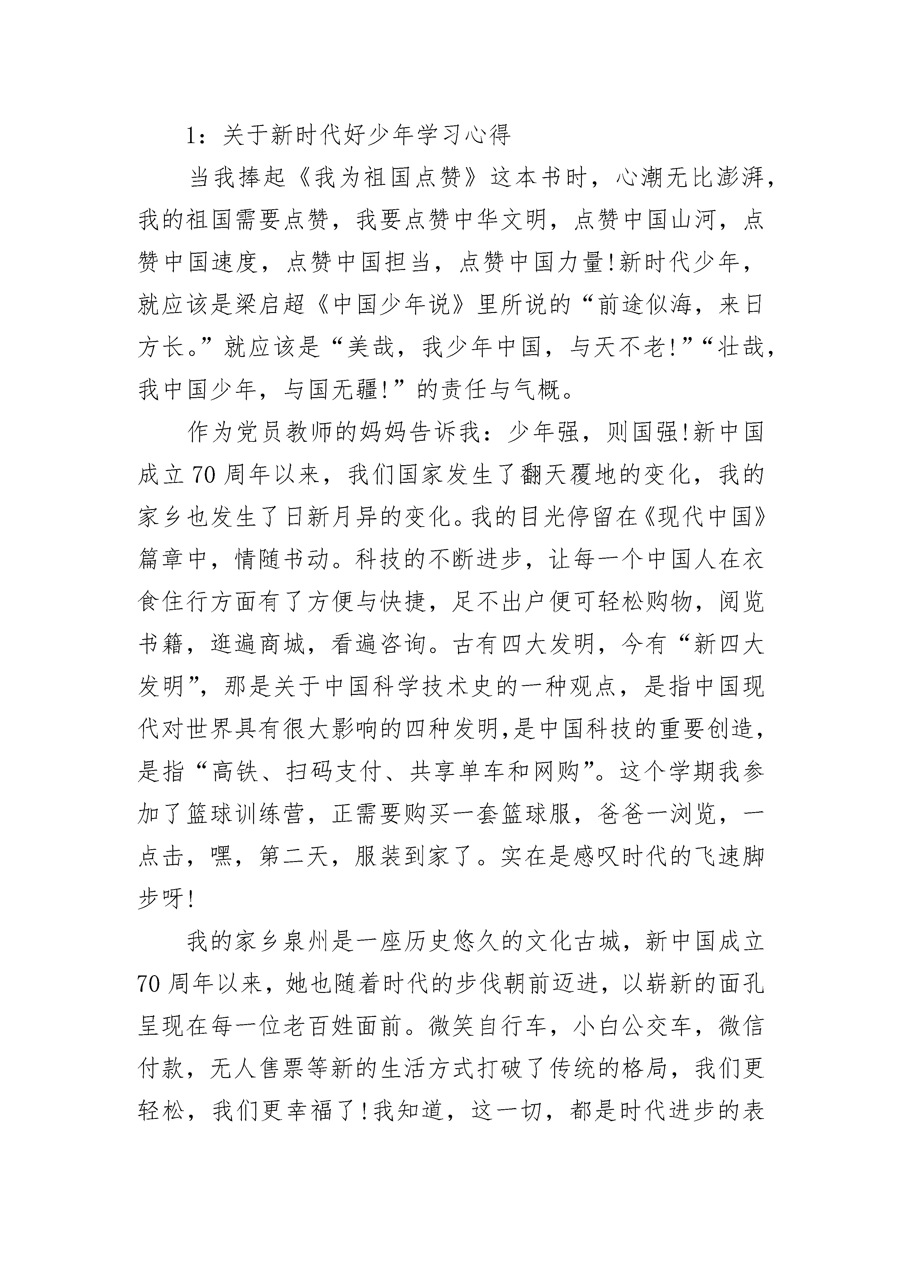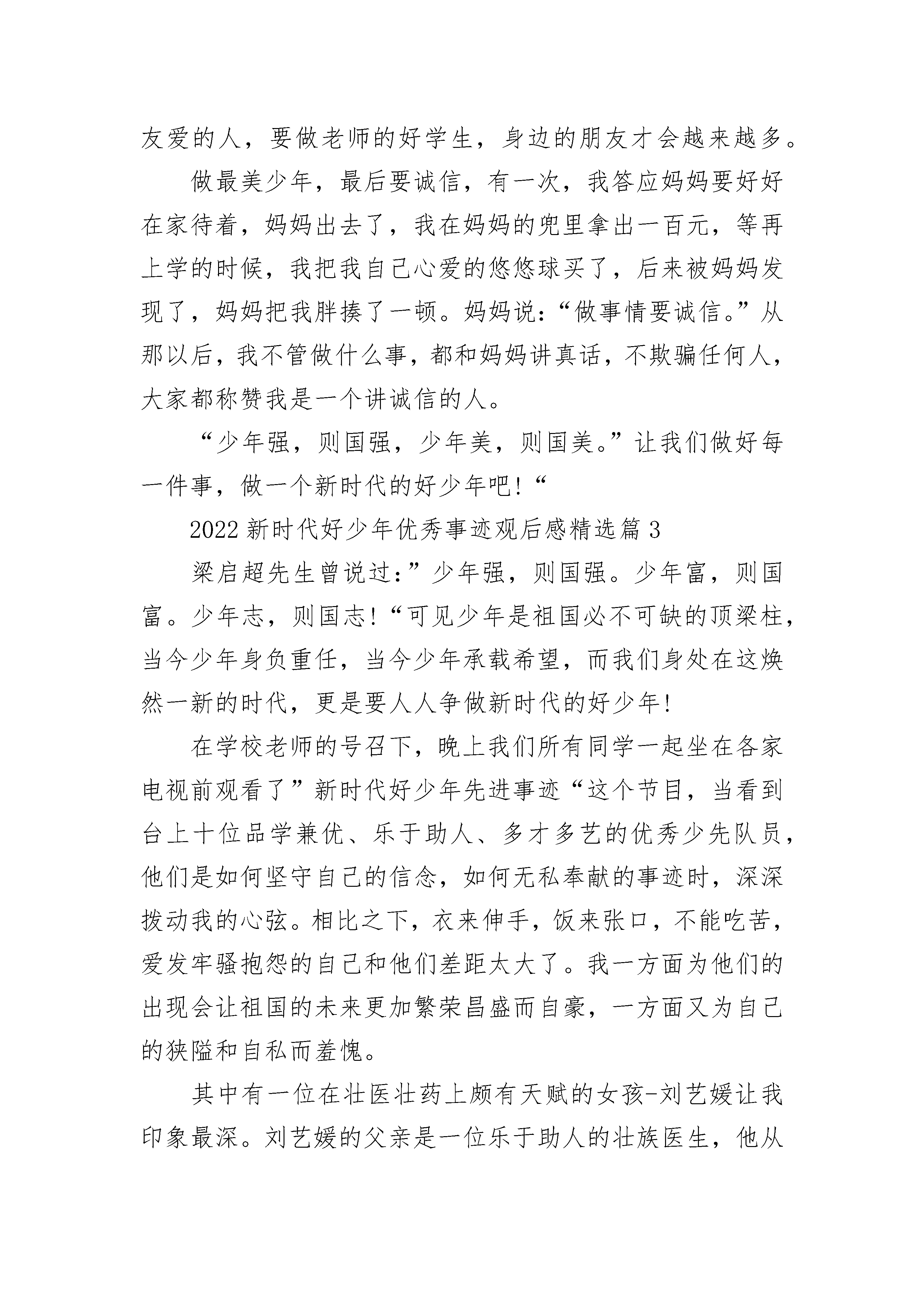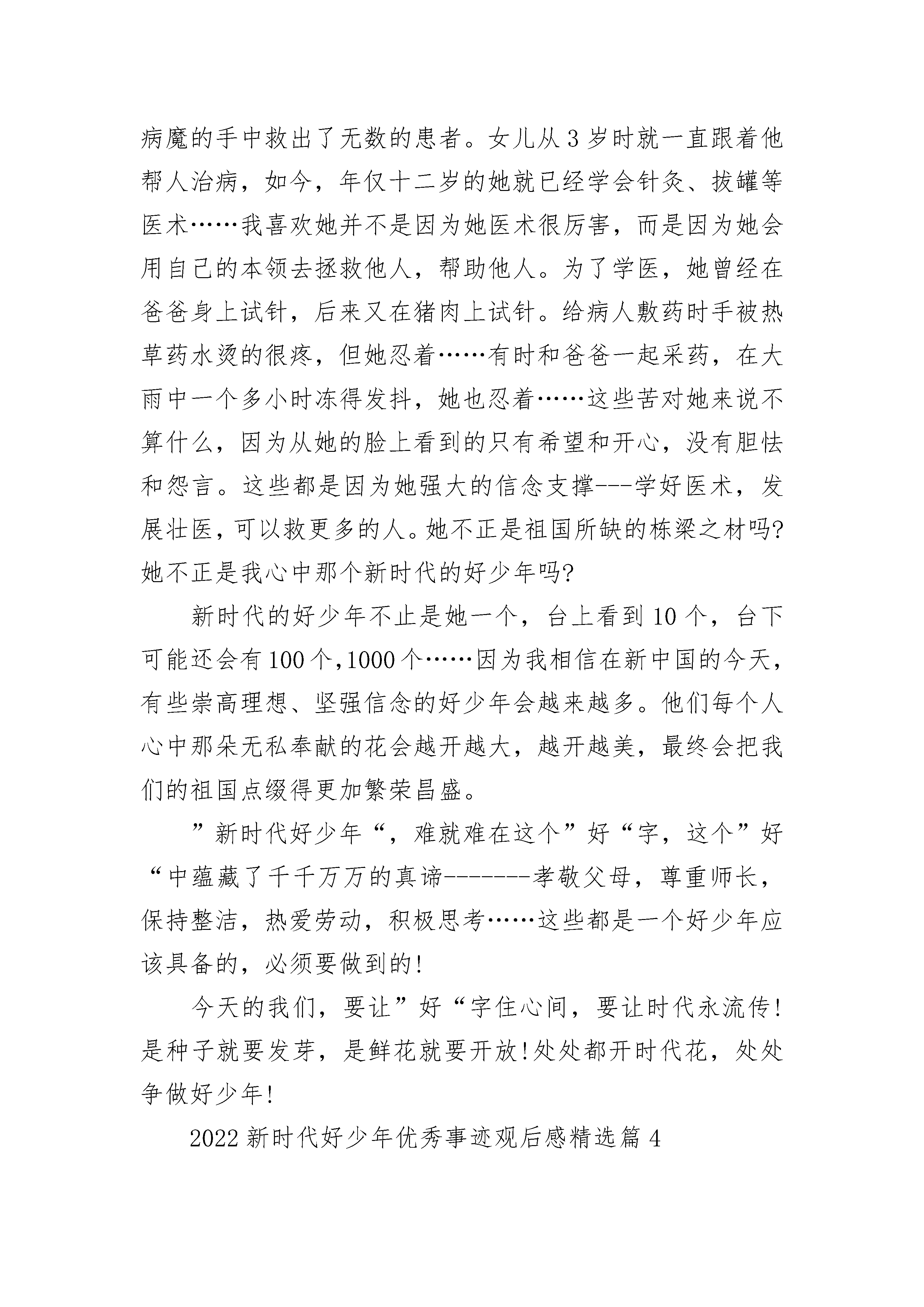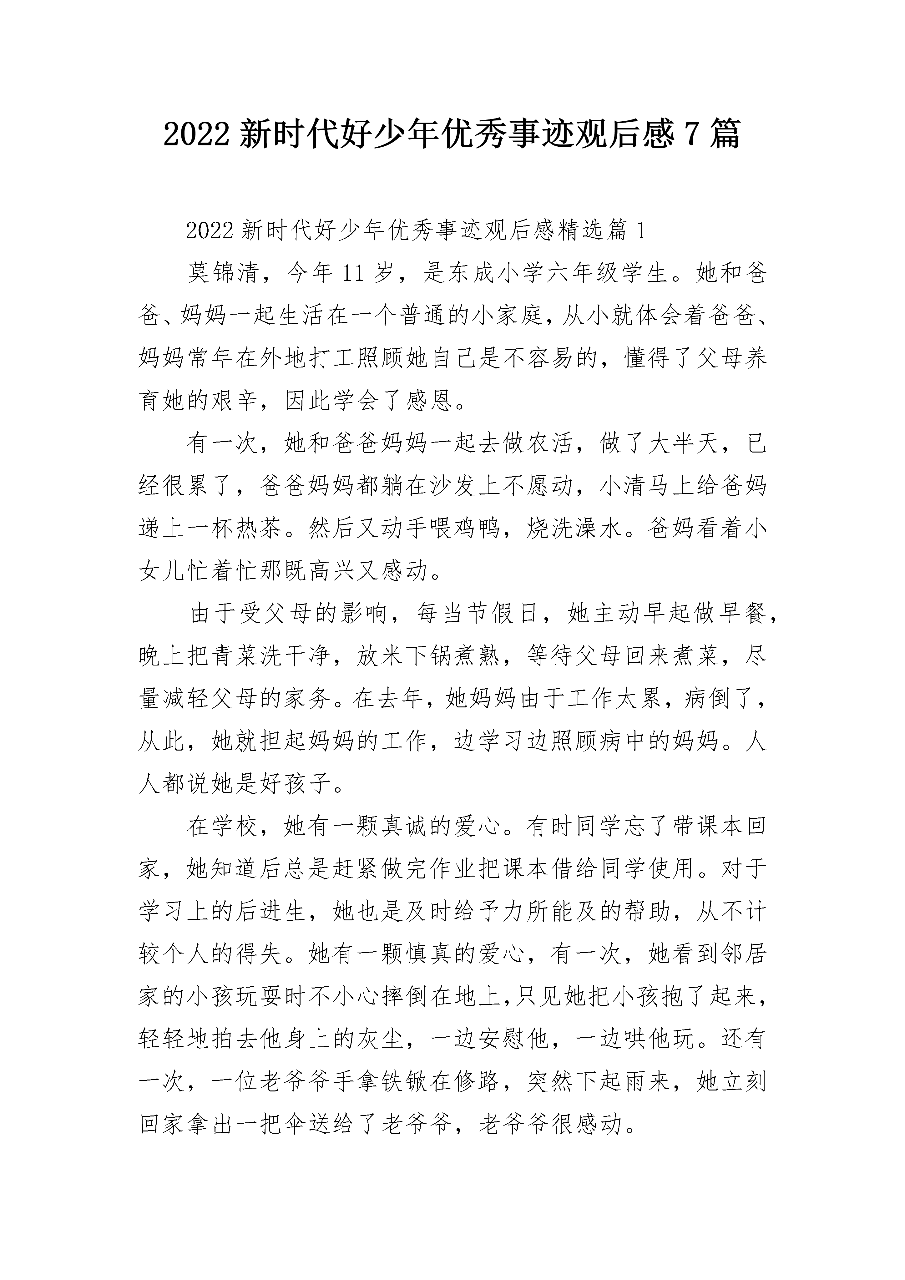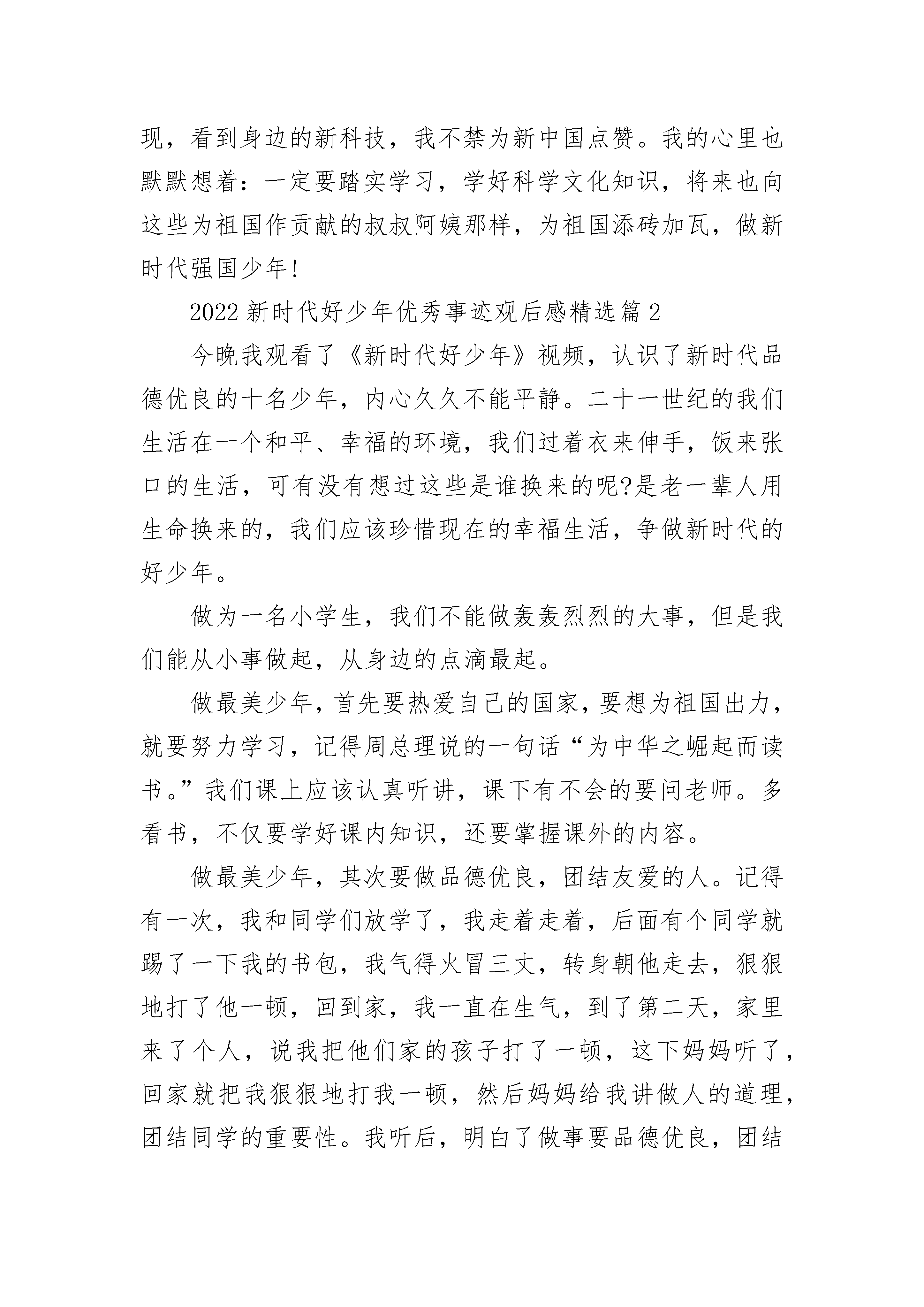2022新时代好少年优秀事迹观后感7篇2022新时代好少年优秀事迹观后感精选篇1莫锦清,今年11岁,是东成小学六年级学生。她和爸爸、妈妈一起生活在一个普通的小家庭,从小就体会着爸爸、妈妈常年在外地打工照顾她自己是不容易的,懂得了父母养育她的艰辛,因此学会了感恩。有一次,她和爸爸妈妈一起去做农活,做了大半天,已经很累了,爸爸妈妈都躺在沙发上不愿动,小清马上给爸妈递上一杯热茶。然后又动手喂鸡鸭,烧洗澡水。爸妈看着小女儿忙着忙那既高兴又感动。由于受父母的影响,每当节假日,她主动早起做早餐,晚上把青菜洗干净,放米下锅煮熟,等待父母回来煮菜,尽量减轻父母的家务。在去年,她妈妈由于工作太累,病倒了,从此,她就担起妈妈的工作,边学习边照顾病中的妈妈。人人都说她是好孩子。在学校,她有一颗真诚的爱心。有时同学忘了带课本回家,她知道后总是赶紧做完作业把课本借给同学使用。对于学习上的后进生,她也是及时给予力所能及的帮助,从不计较个人的得失。她有一颗慎真的爱心,有一次,她看到邻居家的小孩玩耍时不小心摔倒在地上,只见她把小孩抱了起来,轻轻地拍去他身上的灰尘,一边安慰他,一边哄他玩。还有一次,一位老爷爷手拿铁锨在修路,突然下起雨来,她立刻回家拿出一把伞送给了老爷爷,老爷爷很感动。1:关于新时代好少年学习心得当我捧起《我为祖国点赞》这本书时,心潮无比澎湃,我的祖国需要点赞,我要点赞中华文明,点赞中国山河,点赞中国速度,点赞中国担当,点赞中国力量!新时代少年,就应该是梁启超《中国少年说》里所说的“前途似海,来日方长。”就应该是“美哉,我少年中国,与天不老!”“壮哉,我中国少年,与国无疆!”的责任与气概。作为党员教师的妈妈告诉我:少年强,则国强!新中国成立70周年以来,我们国家发生了翻天覆地的变化,我的家乡也发生了日新月异的变化。我的目光停留在《现代中国》篇章中,情随书动。科技的不断进步,让每一个中国人在衣食住行方面有了方便与快捷,足不出户便可轻松购物,阅览书籍,逛遍商城,看遍咨询。古有四大发明,今有“新四大发明”,那是关于中国科学技术史的一种观点,是指中国现代对世界具有很大影响的四种发明,是中国科技的重要创造,是指“高铁、扫码支付、共享单车和网购”。这个学期我参加了篮球训练营,正需要购买一套篮球服,爸爸一浏览,一点击,嘿,第二天,服装到家了。实在是感叹时代的飞速脚步呀!我的家乡泉州是一座历史悠久的文化古城,新中国成立70周年以来,她也随着时代的步伐朝前迈进,以崭新的面孔呈现在每一位老百姓面前。微笑自行车,小白公交车,微信付款,无人售票等新的生活方式打破了传统的格局,我们更轻松,我们更幸福了!我知道,这一切,都是时代进步的表现,看到身边的新科技,我不禁为新中国点赞。我的心里也默默想着:一定要踏实学习,学好科学文化知识,将来也向这些为祖国作贡献的叔叔阿姨那样,为祖国添砖加瓦,做新时代强国少年!2022新时代好少年优秀事迹观后感精选篇2今晚我观看了《新时代好少年》视频,认识了新时代品德优良的十名少年,内心久久不能平静。二十一世纪的我们生活在一个和平、幸福的环境,我们过着衣来伸手,饭来张口的生活,可有没有想过这些是谁换来的呢?是老一辈人用生命换来的,我们应该珍惜现在的幸福生活,争做新时代的好少年。做为一名小学生,我们不能做轰轰烈烈的大事,但是我们能从小事做起,从身边的点滴最起。做最美少年,首先要热爱自己的国家,要想为祖国出力,就要努力学习,记得周总理说的一句话“为中华之崛起而读书。”我们课上应该认真听讲,课下有不会的要问老师。多看书,不仅要学好课内知识,还要掌握课外的内容。做最美少年,其次要做品德优良,团结友爱的人。记得有一次,我和同学们放学了,我走着走着,后面有个同学就踢了一下我的书包,我气得火冒三丈,转身朝他走去,狠狠地打了他一顿,回到家,我一直在生气,到了第二天,家里来了个人,说我把他们家的孩子打了一顿,这下妈妈听了,回家就把我狠狠地打我一顿,然后妈妈给我讲做人的道理,团结同学的重要性。我听后,明白了做事要品德优良,团结友爱的人,要做老师的好学生,身边的朋友才会越来越多。做最美少年,最后要诚信,有一次,我答应妈妈要好好在家待着,妈妈出去了,我在妈妈的兜里拿出一百元,等再上学的时候,我把我自己心爱的悠悠球买了,后来被妈妈发现了,妈妈把我胖揍了一顿。妈妈说:“做事情要诚信。”从那以后,我不管做什么事,都和妈妈讲真话,不欺骗任何人,大家都称赞我是一个讲诚信的人。“少年强,则国强,少年美,则国美。”让我们做好每一件事,做一个新时代的好少年吧!“2022新时代好少年优秀事迹观后感精选篇3梁启超先生曾说过:”少年强,则国强。少年富,则国富。少年志,则国志!“可见少年是祖国必不可缺的顶梁柱,当今少年身负重任,当今少年承载希望,而我们身处在这焕然一新的时代,更是要人人争做