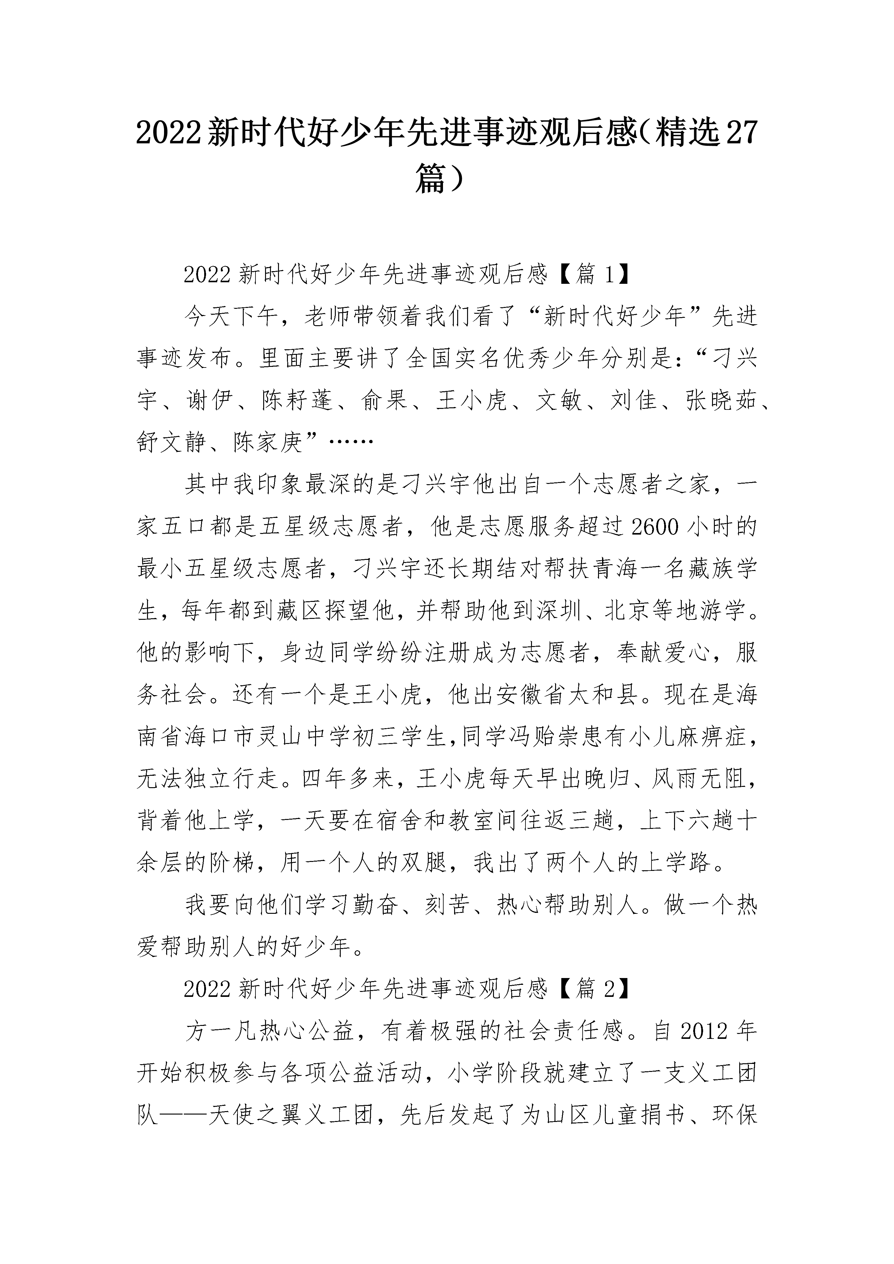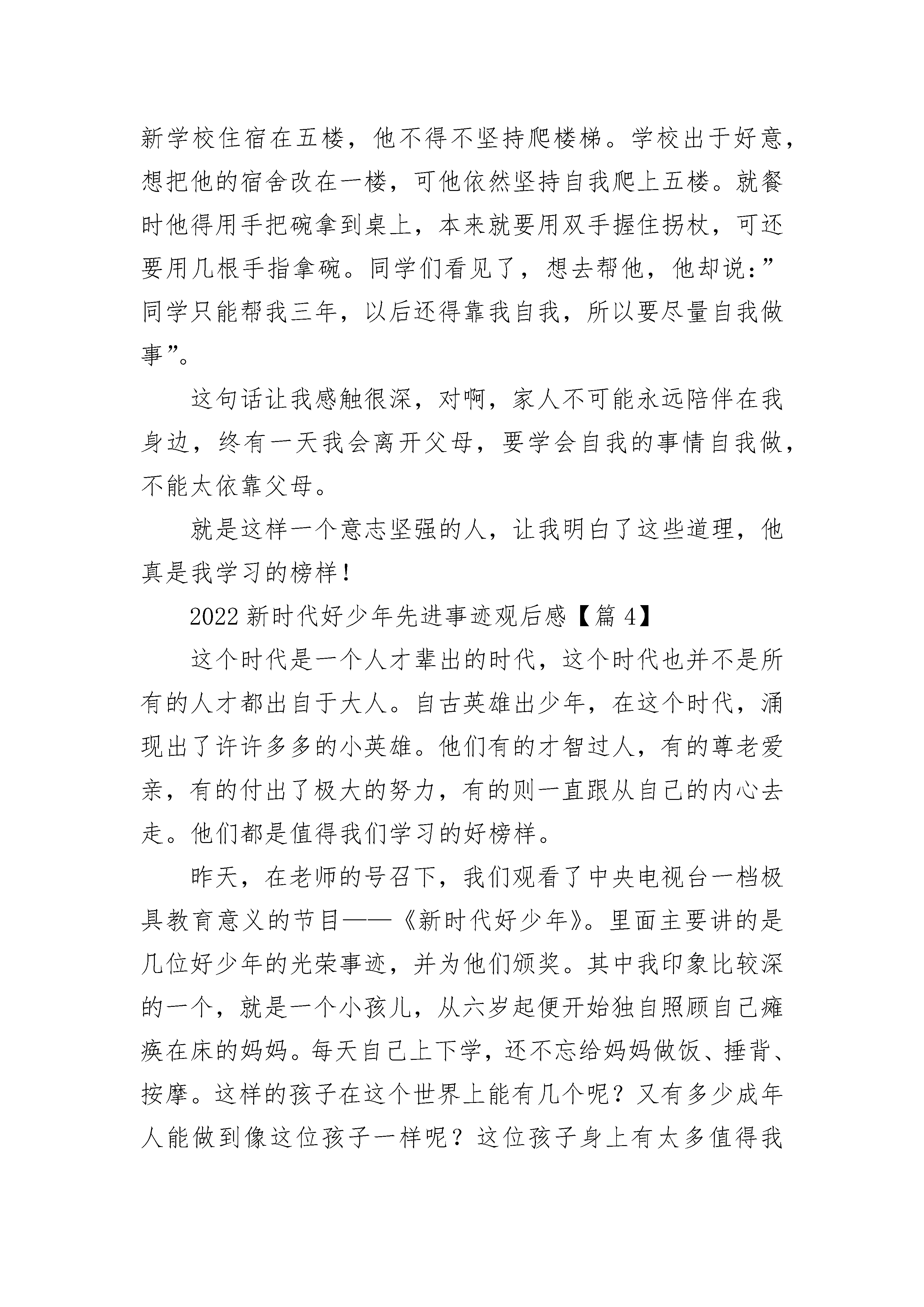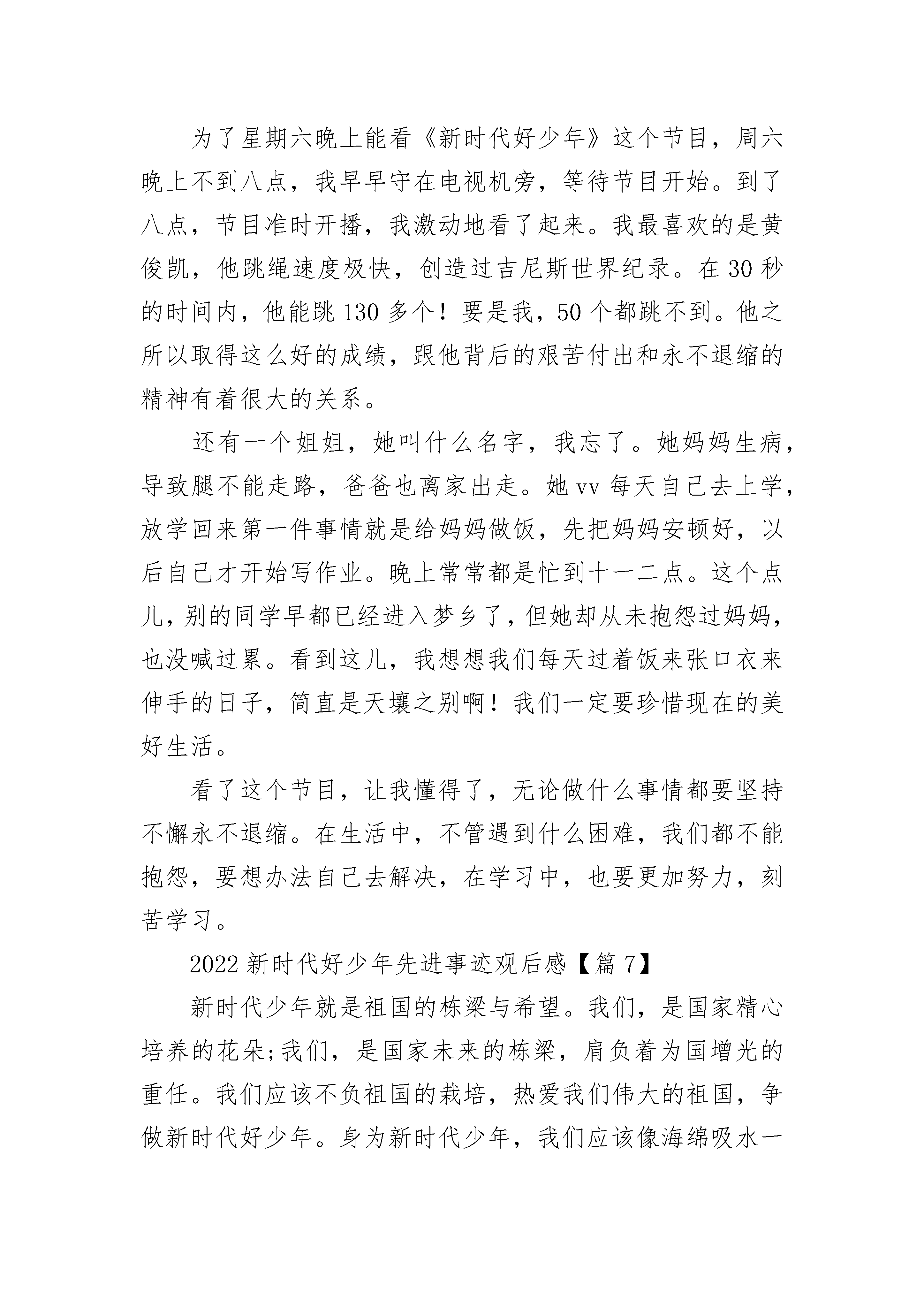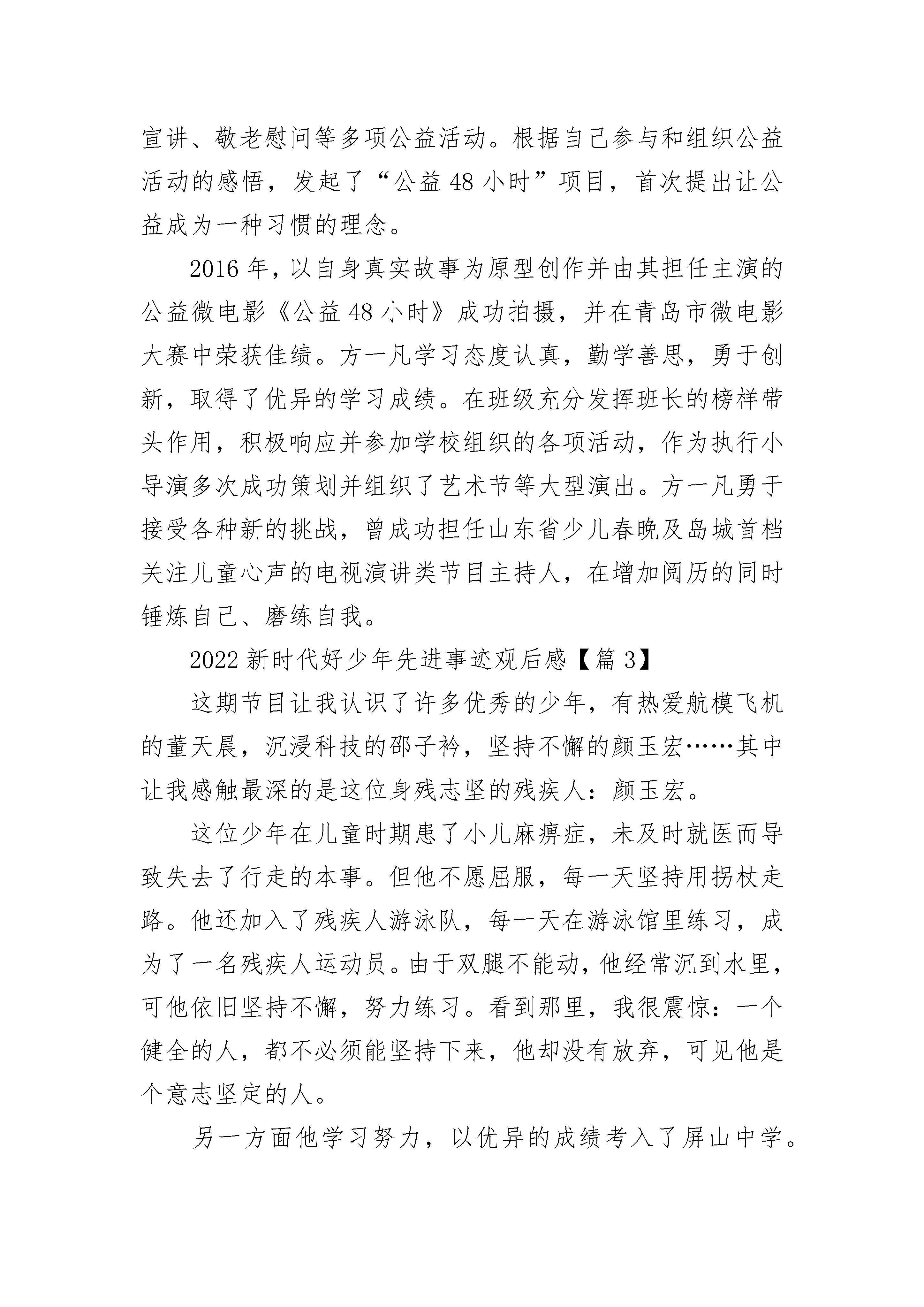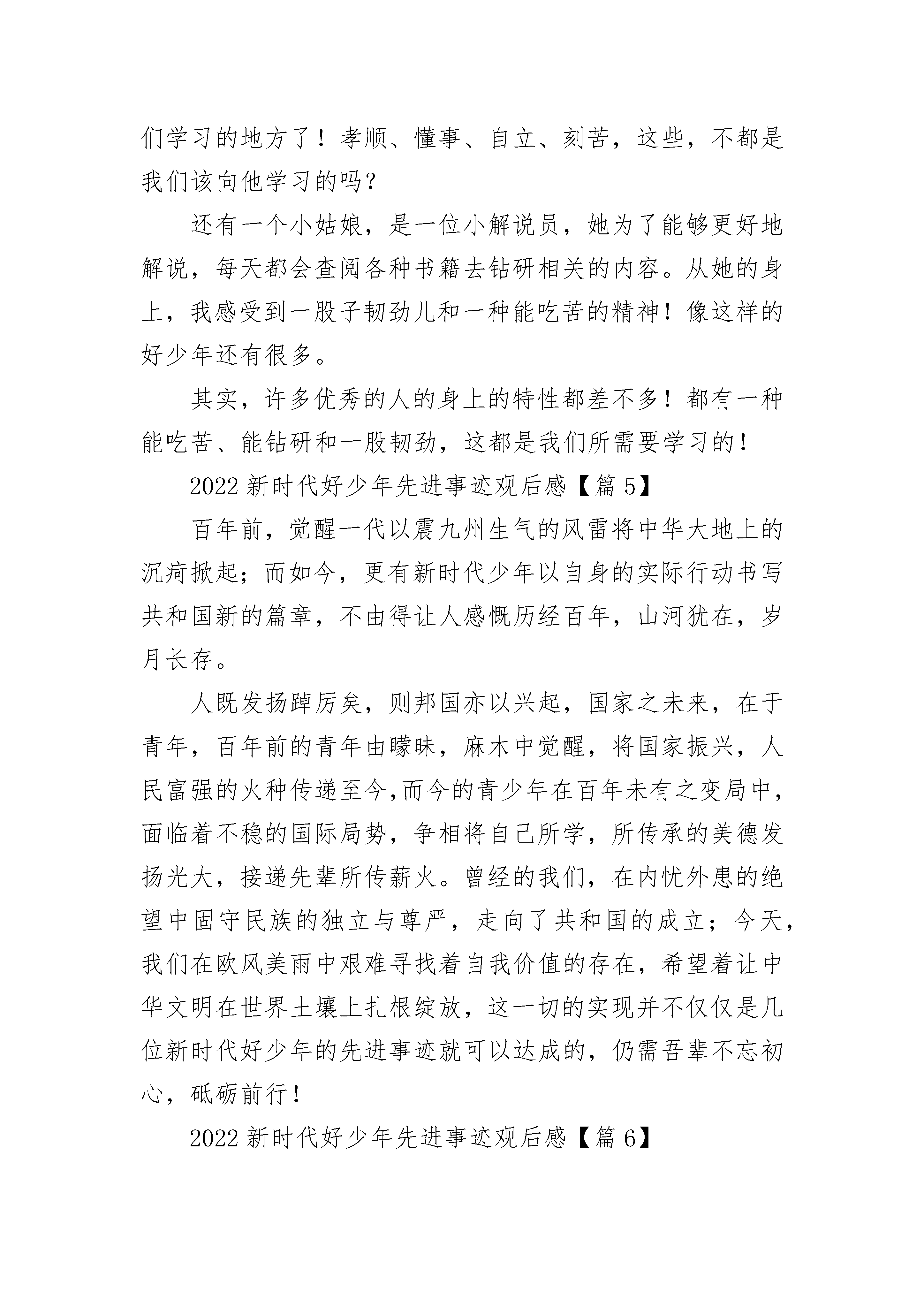 2022新时代好少年先进事迹观后感(精选27篇)2022新时代好少年先进事迹观后感【篇1】今天下午,老师带领着我们看了“新时代好少年”先进事迹发布。里面主要讲了全国实名优秀少年分别是:“刁兴宇、谢伊、陈耔蓬、俞果、王小虎、文敏、刘佳、张晓茹、舒文静、陈家庚”……其中我印象最深的是刁兴宇他出自一个志愿者之家,一家五口都是五星级志愿者,他是志愿服务超过2600小时的最小五星级志愿者,刁兴宇还长期结对帮扶青海一名藏族学生,每年都到藏区探望他,并帮助他到深圳、北京等地游学。他的影响下,身边同学纷纷注册成为志愿者,奉献爱心,服务社会。还有一个是王小虎,他出安徽省太和县。现在是海南省海口市灵山中学初三学生,同学冯贻崇患有小儿麻痹症,无法独立行走。四年多来,王小虎每天早出晚归、风雨无阻,背着他上学,一天要在宿舍和教室间往返三趟,上下六趟十余层的阶梯,用一个人的双腿,我出了两个人的上学路。我要向他们学习勤奋、刻苦、热心帮助别人。做一个热爱帮助别人的好少年。2022新时代好少年先进事迹观后感【篇2】方一凡热心公益,有着极强的社会责任感。自2012年开始积极参与各项公益活动,小学阶段就建立了一支义工团队——天使之翼义工团,先后发起了为山区儿童捐书、环保宣讲、敬老慰问等多项公益活动。根据自己参与和组织公益活动的感悟,发起了“公益48小时”项目,首次提出让公益成为一种习惯的理念。2016年,以自身真实故事为原型创作并由其担任主演的公益微电影《公益48小时》成功拍摄,并在青岛市微电影大赛中荣获佳绩。方一凡学习态度认真,勤学善思,勇于创新,取得了优异的学习成绩。在班级充分发挥班长的榜样带头作用,积极响应并参加学校组织的各项活动,作为执行小导演多次成功策划并组织了艺术节等大型演出。方一凡勇于接受各种新的挑战,曾成功担任山东省少儿春晚及岛城首档关注儿童心声的电视演讲类节目主持人,在增加阅历的同时锤炼自己、磨练自我。2022新时代好少年先进事迹观后感【篇3】这期节目让我认识了许多优秀的少年,有热爱航模飞机的董天晨,沉浸科技的邵子衿,坚持不懈的颜玉宏……其中让我感触最深的是这位身残志坚的残疾人:颜玉宏。这位少年在儿童时期患了小儿麻痹症,未及时就医而导致失去了行走的本事。但他不愿屈服,每一天坚持用拐杖走路。他还加入了残疾人游泳队,每一天在游泳馆里练习,成为了一名残疾人运动员。由于双腿不能动,他经常沉到水里,可他依旧坚持不懈,努力练习。看到那里,我很震惊:一个健全的人,都不必须能坚持下来,他却没有放弃,可见他是个意志坚定的人。另一方面他学习努力,以优异的成绩考入了屏山中学。新学校住宿在五楼,他不得不坚持爬楼梯。学校出于好意,想把他的宿舍改在一楼,可他依然坚持自我爬上五楼。就餐时他得用手把碗拿到桌上,本来就要用双手握住拐杖,可还要用几根手指拿碗。同学们看见了,想去帮他,他却说:”同学只能帮我三年,以后还得靠我自我,所以要尽量自我做事”。这句话让我感触很深,对啊,家人不可能永远陪伴在我身边,终有一天我会离开父母,要学会自我的事情自我做,不能太依靠父母。就是这样一个意志坚强的人,让我明白了这些道理,他真是我学习的榜样!2022新时代好少年先进事迹观后感【篇4】这个时代是一个人才辈出的时代,这个时代也并不是所有的人才都出自于大人。自古英雄出少年,在这个时代,涌现出了许许多多的小英雄。他们有的才智过人,有的尊老爱亲,有的付出了极大的努力,有的则一直跟从自己的内心去走。他们都是值得我们学习的好榜样。昨天,在老师的号召下,我们观看了中央电视台一档极具教育意义的节目——《新时代好少年》。里面主要讲的是几位好少年的光荣事迹,并为他们颁奖。其中我印象比较深的一个,就是一个小孩儿,从六岁起便开始独自照顾自己瘫痪在床的妈妈。每天自己上下学,还不忘给妈妈做饭、捶背、按摩。这样的孩子在这个世界上能有几个呢?又有多少成年人能做到像这位孩子一样呢?这位孩子身上有太多值得我们学习的地方了!孝顺、懂事、自立、刻苦,这些,不都是我们该向他学习的吗?还有一个小姑娘,是一位小解说员,她为了能够更好地解说,每天都会查阅各种书籍去钻研相关的内容。从她的身上,我感受到一股子韧劲儿和一种能吃苦的精神!像这样的好少年还有很多。其实,许多优秀的人的身上的特性都差不多!都有一种能吃苦、能钻研和一股韧劲,这都是我们所需要学习的!2022新时代好少年先进事迹观后感【篇5】百年前,觉醒一代以震九州生气的风雷将中华大地上的沉疴掀起;而如今,更有新时代少年以自身的实际行动书写共和国新的篇章,不由得让人感慨历经百年,山河犹在,岁月长存。人既发扬踔厉矣,则邦国亦以兴起,国家之未来,在于青年,百年前的青年由矇昧,麻木中觉醒,将国家振兴,人民富强的火种传递至今,而今的青少年在百年未有之变局中,面临着不稳的国际局势,争相将自己所学,所传
