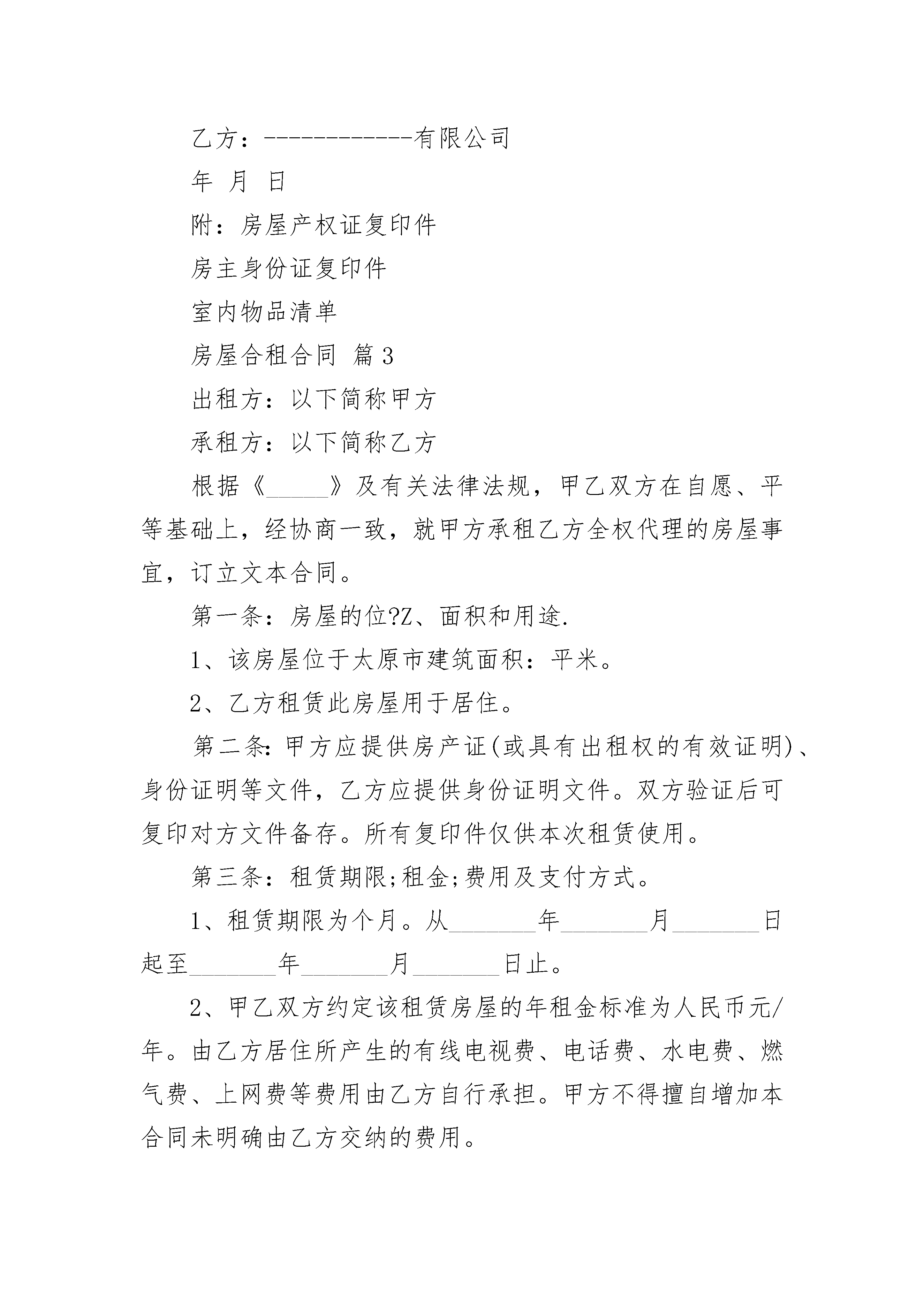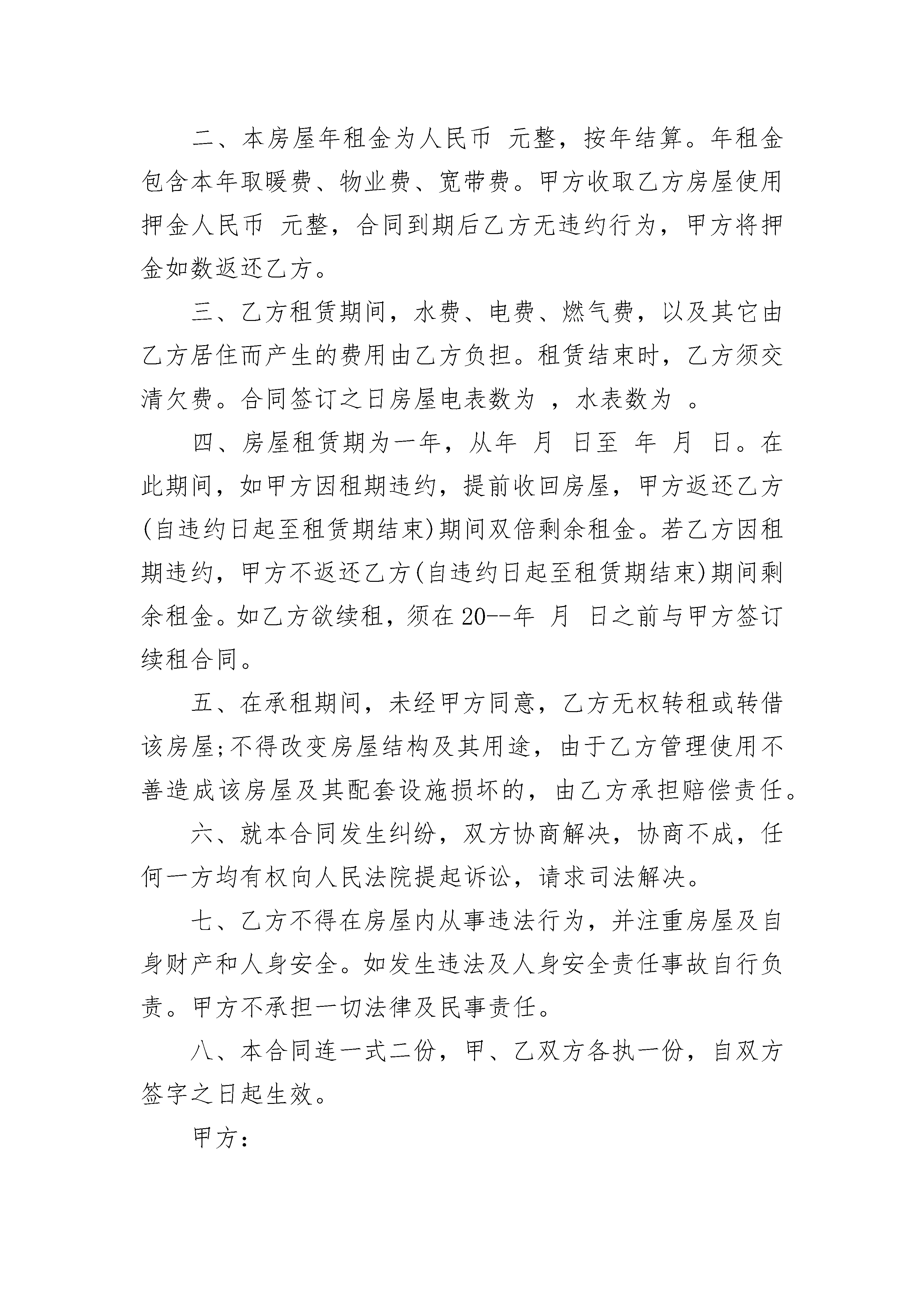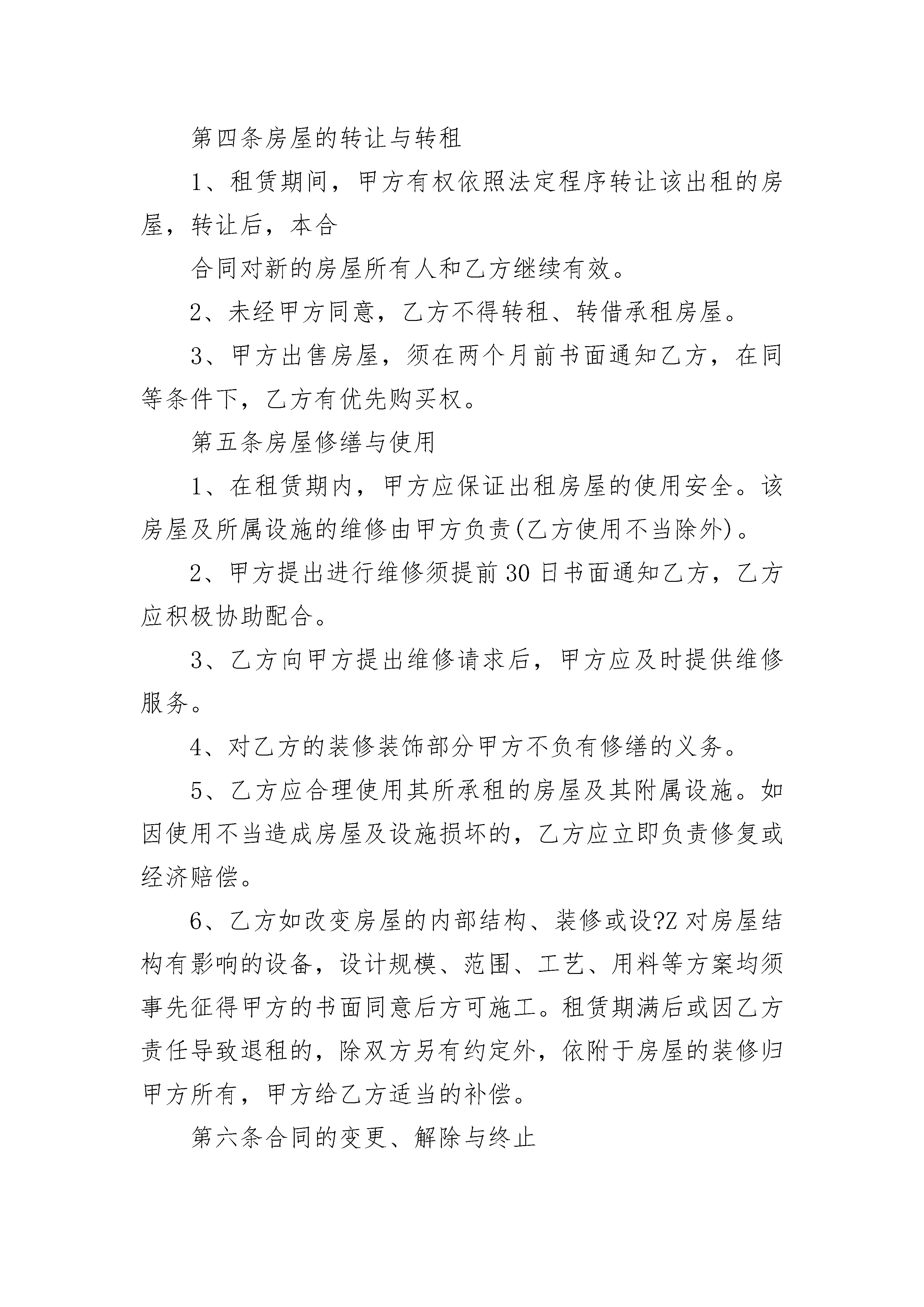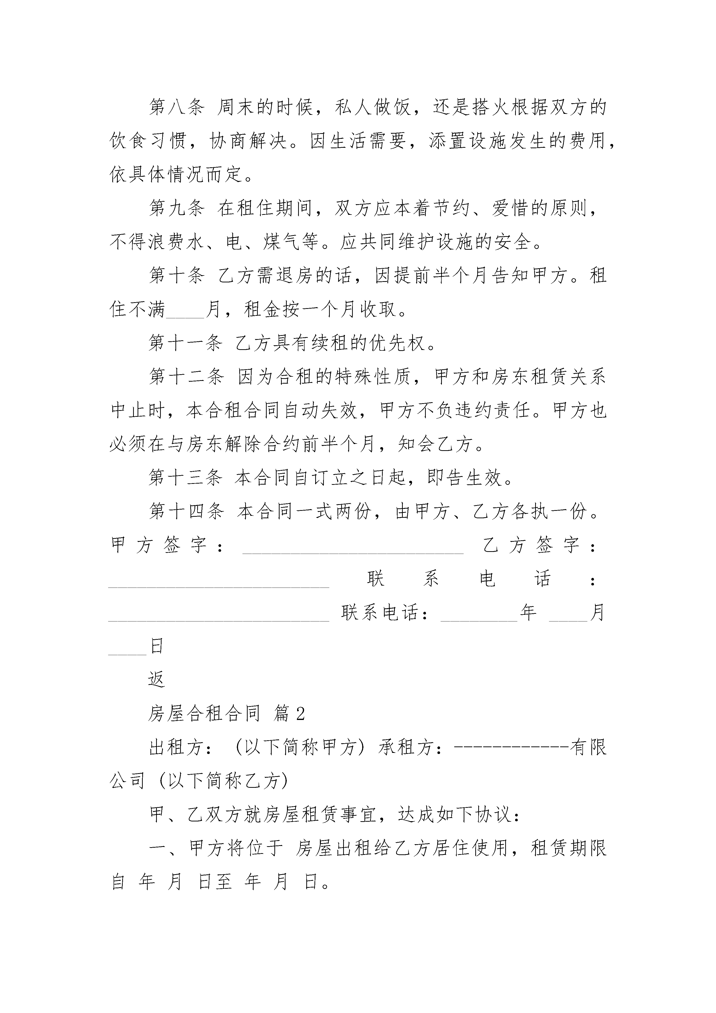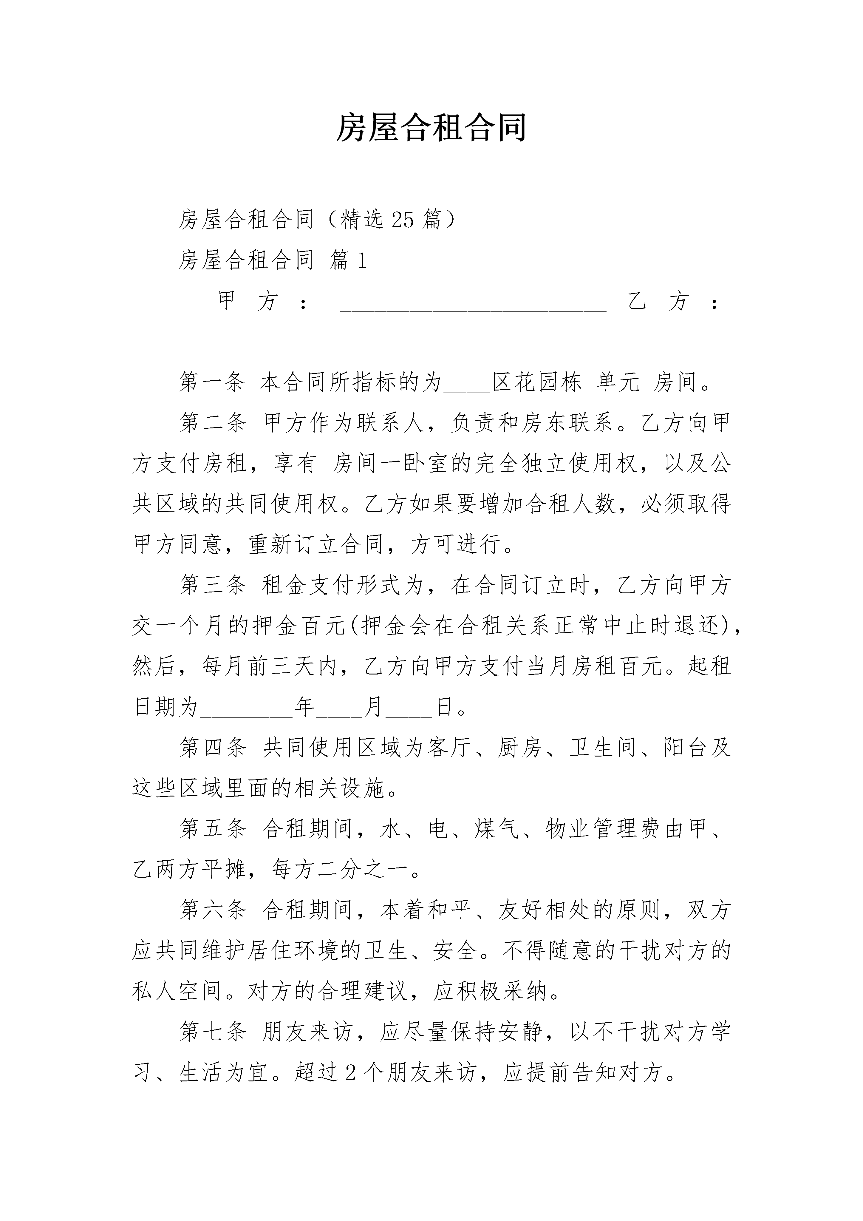房屋合租合同房屋合租合同(精选25篇)房屋合租合同篇1甲方:_______________________乙方:_______________________第一条本合同所指标的为____区花园栋单元房间。第二条甲方作为联系人,负责和房东联系。乙方向甲方支付房租,享有房间一卧室的完全独立使用权,以及公共区域的共同使用权。乙方如果要增加合租人数,必须取得甲方同意,重新订立合同,方可进行。第三条租金支付形式为,在合同订立时,乙方向甲方交一个月的押金百元(押金会在合租关系正常中止时退还),然后,每月前三天内,乙方向甲方支付当月房租百元。起租日期为________年____月____日。第四条共同使用区域为客厅、厨房、卫生间、阳台及这些区域里面的相关设施。第五条合租期间,水、电、煤气、物业管理费由甲、乙两方平摊,每方二分之一。第六条合租期间,本着和平、友好相处的原则,双方应共同维护居住环境的卫生、安全。不得随意的干扰对方的私人空间。对方的合理建议,应积极采纳。第七条朋友来访,应尽量保持安静,以不干扰对方学习、生活为宜。超过2个朋友来访,应提前告知对方。第八条周末的时候,私人做饭,还是搭火根据双方的饮食习惯,协商解决。因生活需要,添置设施发生的费用,依具体情况而定。第九条在租住期间,双方应本着节约、爱惜的原则,不得浪费水、电、煤气等。应共同维护设施的安全。第十条乙方需退房的话,因提前半个月告知甲方。租住不满____月,租金按一个月收取。第十一条乙方具有续租的优先权。第十二条因为合租的特殊性质,甲方和房东租赁关系中止时,本合租合同自动失效,甲方不负违约责任。甲方也必须在与房东解除合约前半个月,知会乙方。第十三条本合同自订立之日起,即告生效。第十四条本合同一式两份,由甲方、乙方各执一份。甲方签字:_______________________乙方签字:_______________________联系电话:_______________________联系电话:________年____月____日返房屋合租合同篇2出租方:(以下简称甲方)承租方:------------有限公司(以下简称乙方)甲、乙双方就房屋租赁事宜,达成如下协议:一、甲方将位于房屋出租给乙方居住使用,租赁期限自年月日至年月日。二、本房屋年租金为人民币元整,按年结算。年租金包含本年取暖费、物业费、宽带费。甲方收取乙方房屋使用押金人民币元整,合同到期后乙方无违约行为,甲方将押金如数返还乙方。三、乙方租赁期间,水费、电费、燃气费,以及其它由乙方居住而产生的费用由乙方负担。租赁结束时,乙方须交清欠费。合同签订之日房屋电表数为,水表数为。四、房屋租赁期为一年,从年月日至年月日。在此期间,如甲方因租期违约,提前收回房屋,甲方返还乙方(自违约日起至租赁期结束)期间双倍剩余租金。若乙方因租期违约,甲方不返还乙方(自违约日起至租赁期结束)期间剩余租金。如乙方欲续租,须在20--年月日之前与甲方签订续租合同。五、在承租期间,未经甲方同意,乙方无权转租或转借该房屋;不得改变房屋结构及其用途,由于乙方管理使用不善造成该房屋及其配套设施损坏的,由乙方承担赔偿责任。六、就本合同发生纠纷,双方协商解决,协商不成,任何一方均有权向人民法院提起诉讼,请求司法解决。七、乙方不得在房屋内从事违法行为,并注重房屋及自身财产和人身安全。如发生违法及人身安全责任事故自行负责。甲方不承担一切法律及民事责任。八、本合同连一式二份,甲、乙双方各执一份,自双方签字之日起生效。甲方:乙方:------------有限公司年月日附:房屋产权证复印件房主身份证复印件室内物品清单房屋合租合同篇3出租方:以下简称甲方承租方:以下简称乙方根据《_____》及有关法律法规,甲乙双方在自愿、平等基础上,经协商一致,就甲方承租乙方全权代理的房屋事宜,订立文本合同。第一条:房屋的位?Z、面积和用途.1、该房屋位于太原市建筑面积:平米。2、乙方租赁此房屋用于居住。第二条:甲方应提供房产证(或具有出租权的有效证明)、身份证明等文件,乙方应提供身份证明文件。双方验证后可复印对方文件备存。所有复印件仅供本次租赁使用。第三条:租赁期限;租金;费用及支付方式。1、租赁期限为个月。从_______年_______月_______日起至_______年_______月_______日止。2、甲乙双方约定该租赁房屋的年租金标准为人民币元/年。由乙方居住所产生的有线电视费、电话费、水电费、燃气费、上网费等费用由乙方自行承担。甲方不得擅自增加本合同未明确由乙方交纳的费用。第四条房屋的转让与转租1、租赁期间,甲方有权依照法定程序转让该出租的房屋,转让后,本合合同对新的房屋所有人和乙方继续有效。2、未经甲方同意,乙方不得转租、转借承租房屋。3、甲方出售房屋,须在