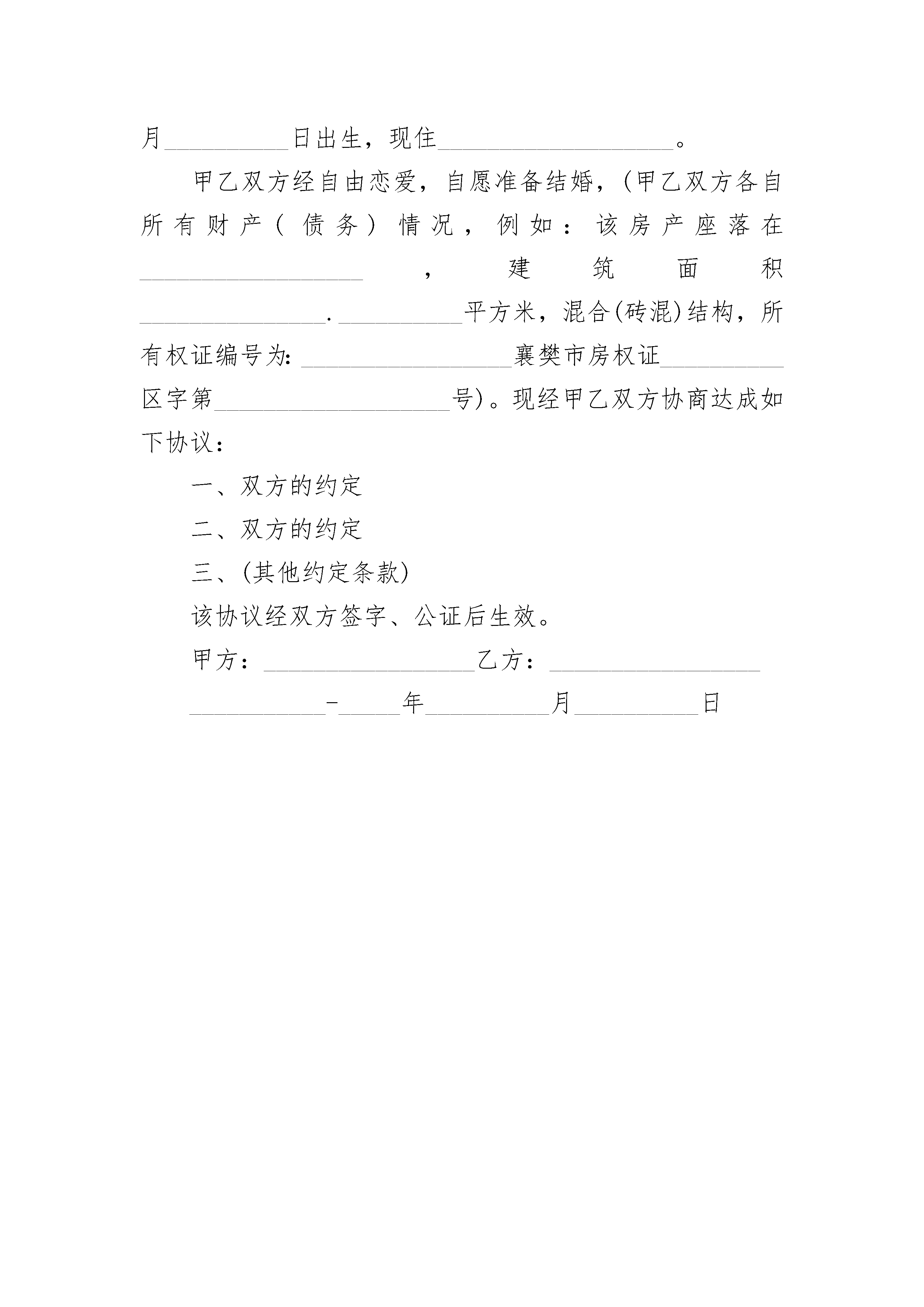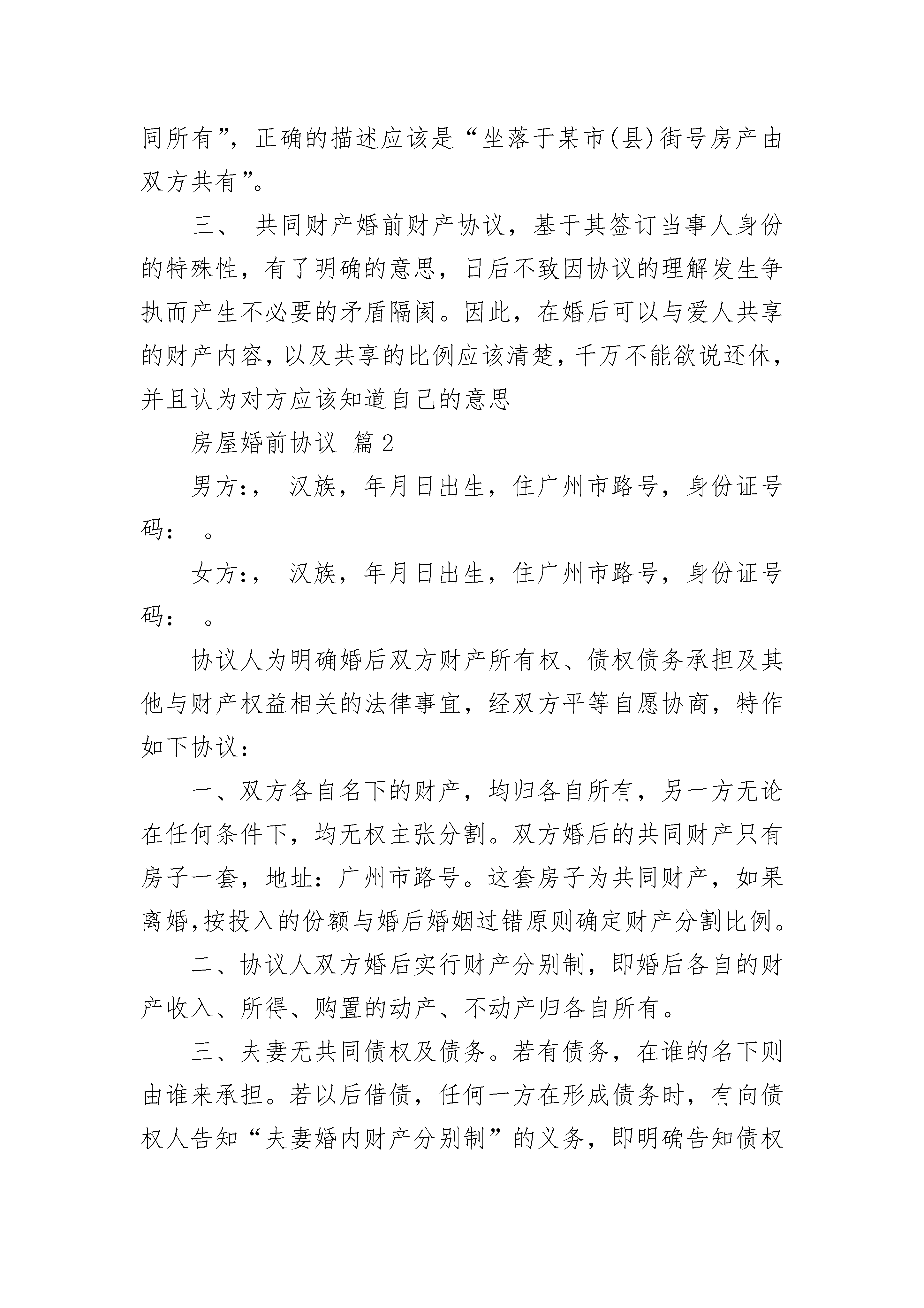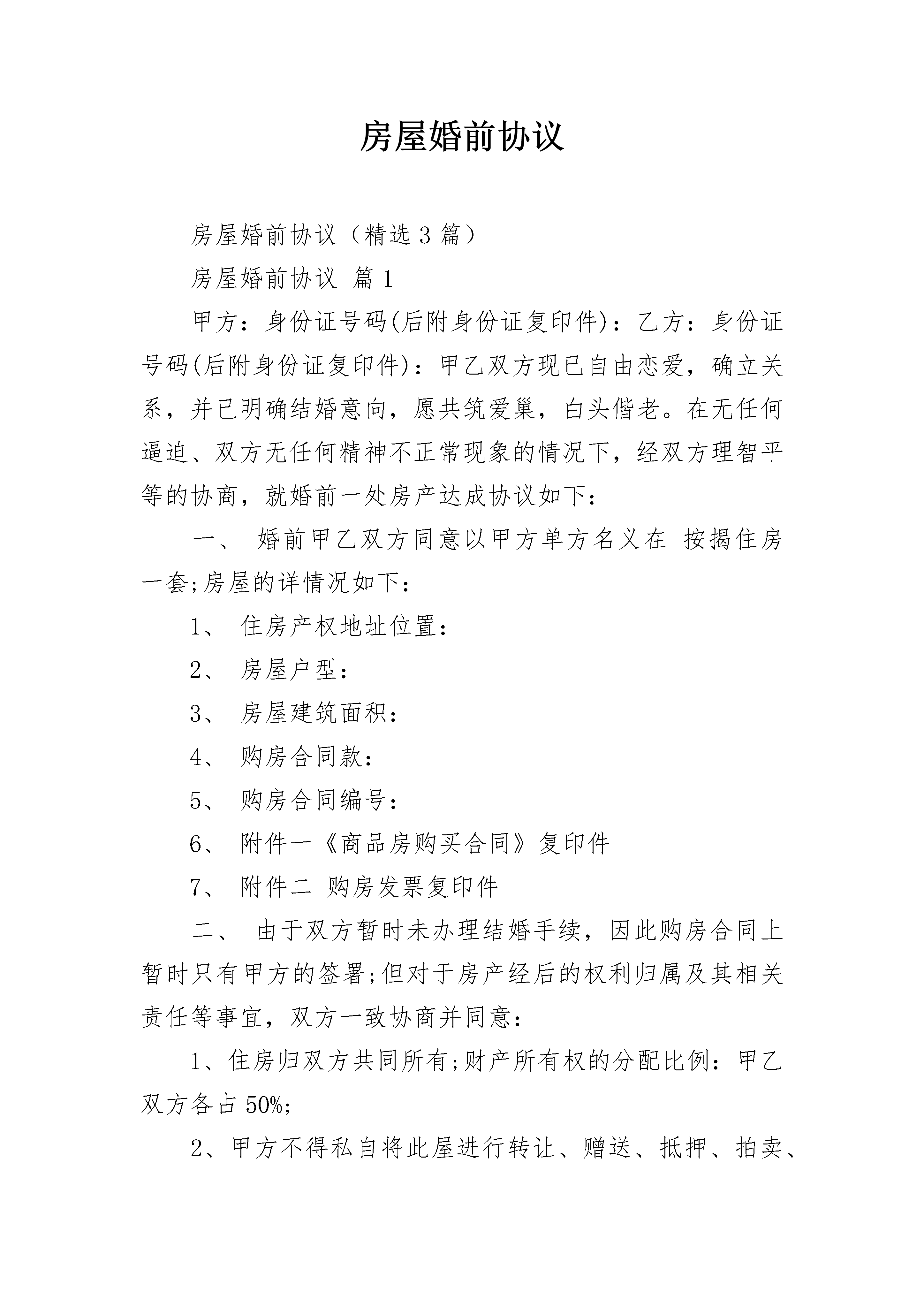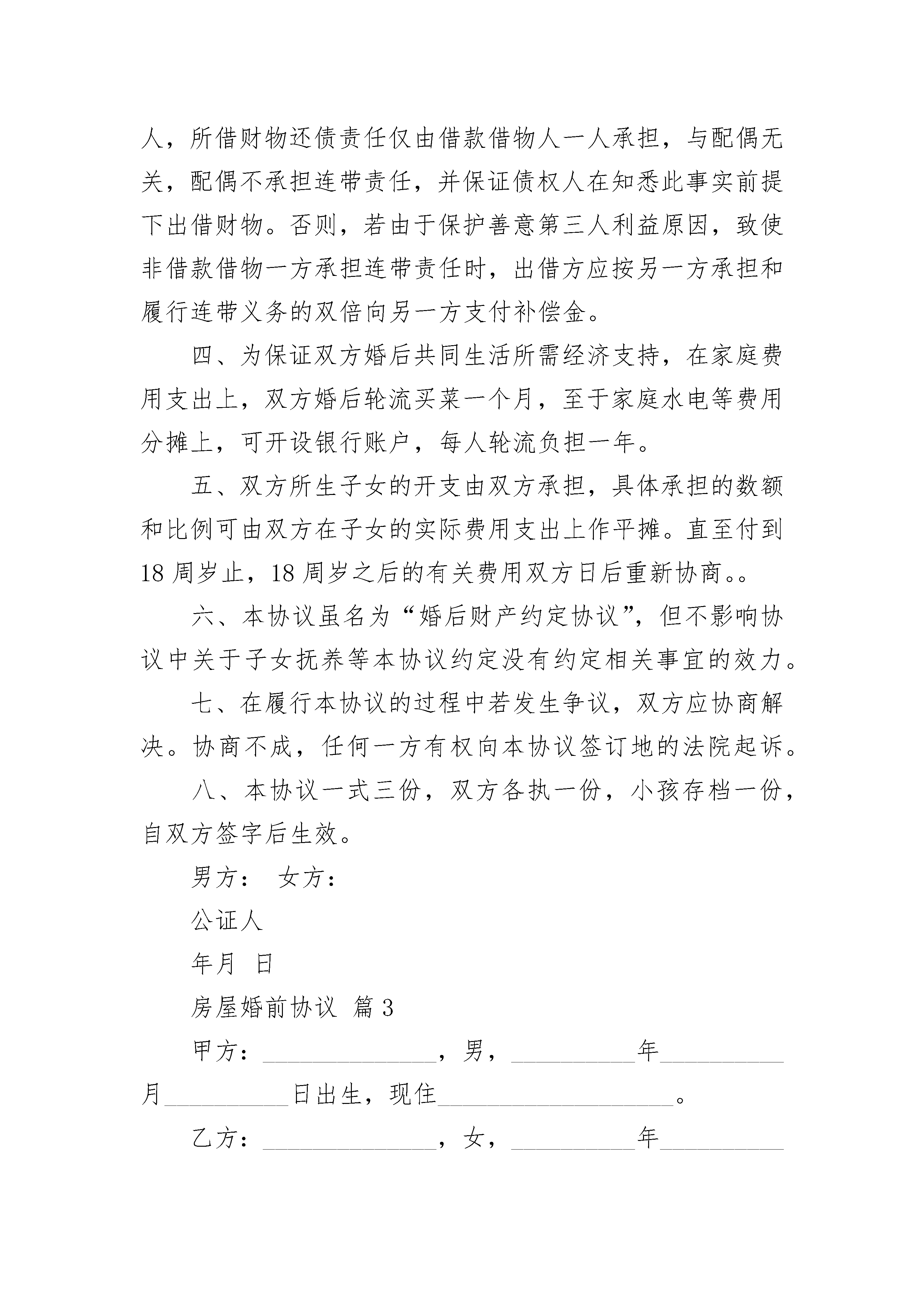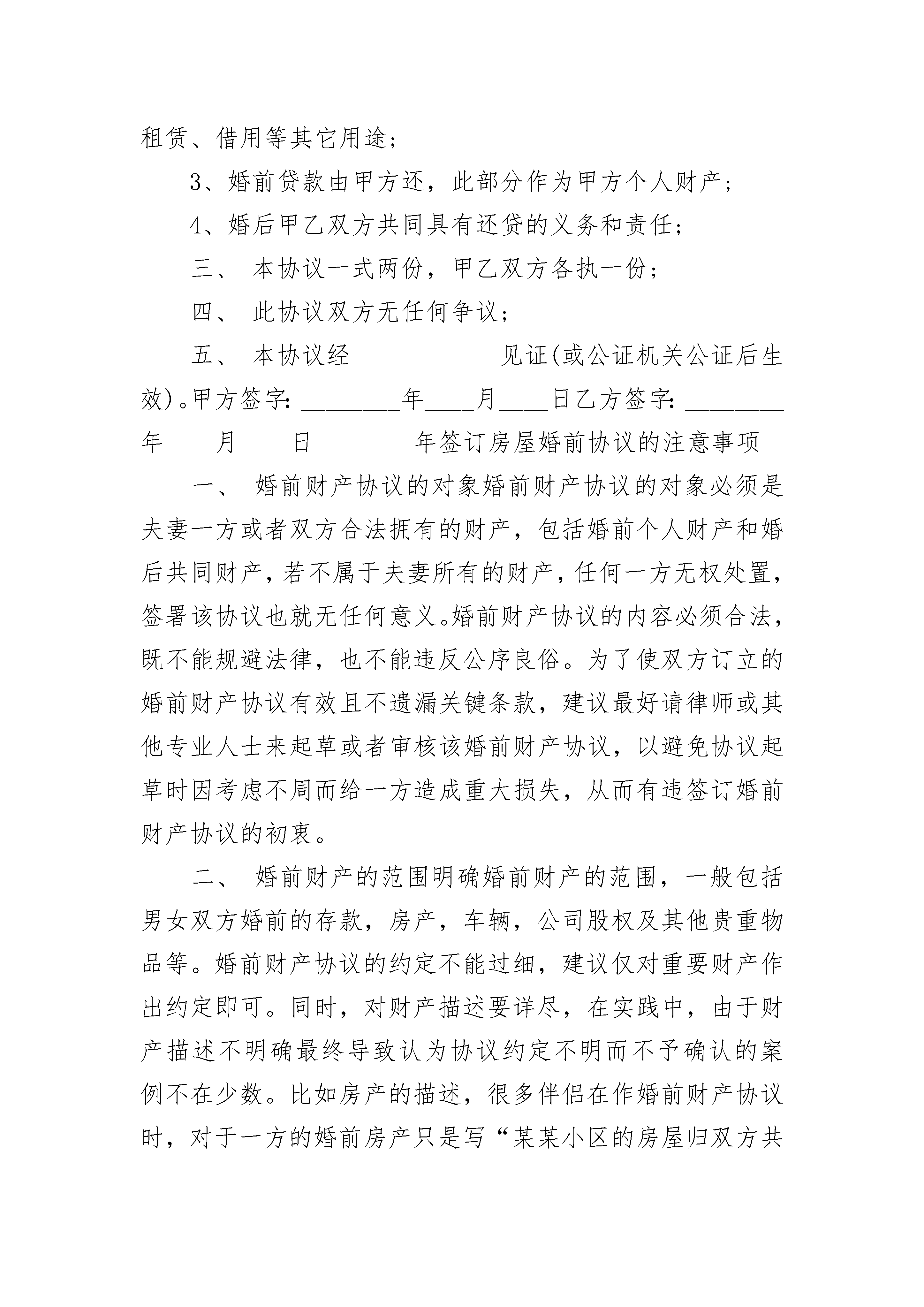 房屋婚前协议房屋婚前协议(精选3篇)房屋婚前协议篇1甲方:身份证号码(后附身份证复印件):乙方:身份证号码(后附身份证复印件):甲乙双方现已自由恋爱,确立关系,并已明确结婚意向,愿共筑爱巢,白头偕老。在无任何逼迫、双方无任何精神不正常现象的情况下,经双方理智平等的协商,就婚前一处房产达成协议如下:一、婚前甲乙双方同意以甲方单方名义在按揭住房一套;房屋的详情况如下:1、住房产权地址位置:2、房屋户型:3、房屋建筑面积:4、购房合同款:5、购房合同编号:6、附件一《商品房购买合同》复印件7、附件二购房发票复印件二、由于双方暂时未办理结婚手续,因此购房合同上暂时只有甲方的签署;但对于房产经后的权利归属及其相关责任等事宜,双方一致协商并同意:1、住房归双方共同所有;财产所有权的分配比例:甲乙双方各占50%;2、甲方不得私自将此屋进行转让、赠送、抵押、拍卖、租赁、借用等其它用途;3、婚前贷款由甲方还,此部分作为甲方个人财产;4、婚后甲乙双方共同具有还贷的义务和责任;三、本协议一式两份,甲乙双方各执一份;四、此协议双方无任何争议;五、本协议经____________见证(或公证机关公证后生效)。甲方签字:________年____月____日乙方签字:________年____月____日________年签订房屋婚前协议的注意事项一、婚前财产协议的对象婚前财产协议的对象必须是夫妻一方或者双方合法拥有的财产,包括婚前个人财产和婚后共同财产,若不属于夫妻所有的财产,任何一方无权处置,签署该协议也就无任何意义。婚前财产协议的内容必须合法,既不能规避法律,也不能违反公序良俗。为了使双方订立的婚前财产协议有效且不遗漏关键条款,建议最好请律师或其他专业人士来起草或者审核该婚前财产协议,以避免协议起草时因考虑不周而给一方造成重大损失,从而有违签订婚前财产协议的初衷。二、婚前财产的范围明确婚前财产的范围,一般包括男女双方婚前的存款,房产,车辆,公司股权及其他贵重物品等。婚前财产协议的约定不能过细,建议仅对重要财产作出约定即可。同时,对财产描述要详尽,在实践中,由于财产描述不明确最终导致认为协议约定不明而不予确认的案例不在少数。比如房产的描述,很多伴侣在作婚前财产协议时,对于一方的婚前房产只是写“某某小区的房屋归双方共同所有”,正确的描述应该是“坐落于某市(县)街号房产由双方共有”。三、共同财产婚前财产协议,基于其签订当事人身份的特殊性,有了明确的意思,日后不致因协议的理解发生争执而产生不必要的矛盾隔阂。因此,在婚后可以与爱人共享的财产内容,以及共享的比例应该清楚,千万不能欲说还休,并且认为对方应该知道自己的意思房屋婚前协议篇2男方:,汉族,年月日出生,住广州市路号,身份证号码:。女方:,汉族,年月日出生,住广州市路号,身份证号码:。协议人为明确婚后双方财产所有权、债权债务承担及其他与财产权益相关的法律事宜,经双方平等自愿协商,特作如下协议:一、双方各自名下的财产,均归各自所有,另一方无论在任何条件下,均无权主张分割。双方婚后的共同财产只有房子一套,地址:广州市路号。这套房子为共同财产,如果离婚,按投入的份额与婚后婚姻过错原则确定财产分割比例。二、协议人双方婚后实行财产分别制,即婚后各自的财产收入、所得、购置的动产、不动产归各自所有。三、夫妻无共同债权及债务。若有债务,在谁的名下则由谁来承担。若以后借债,任何一方在形成债务时,有向债权人告知“夫妻婚内财产分别制”的义务,即明确告知债权人,所借财物还债责任仅由借款借物人一人承担,与配偶无关,配偶不承担连带责任,并保证债权人在知悉此事实前提下出借财物。否则,若由于保护善意第三人利益原因,致使非借款借物一方承担连带责任时,出借方应按另一方承担和履行连带义务的双倍向另一方支付补偿金。四、为保证双方婚后共同生活所需经济支持,在家庭费用支出上,双方婚后轮流买菜一个月,至于家庭水电等费用分摊上,可开设银行账户,每人轮流负担一年。五、双方所生子女的开支由双方承担,具体承担的数额和比例可由双方在子女的实际费用支出上作平摊。直至付到18周岁止,18周岁之后的有关费用双方日后重新协商。。六、本协议虽名为“婚后财产约定协议”,但不影响协议中关于子女抚养等本协议约定没有约定相关事宜的效力。七、在履行本协议的过程中若发生争议,双方应协商解决。协商不成,任何一方有权向本协议签订地的法院起诉。八、本协议一式三份,双方各执一份,小孩存档一份,自双方签字后生效。男方:女方:公证人年月日房屋婚前协议篇3甲方:______________,男,__________年__________月__________日出生,现住___________________。乙方:______________,女,__________年__________月