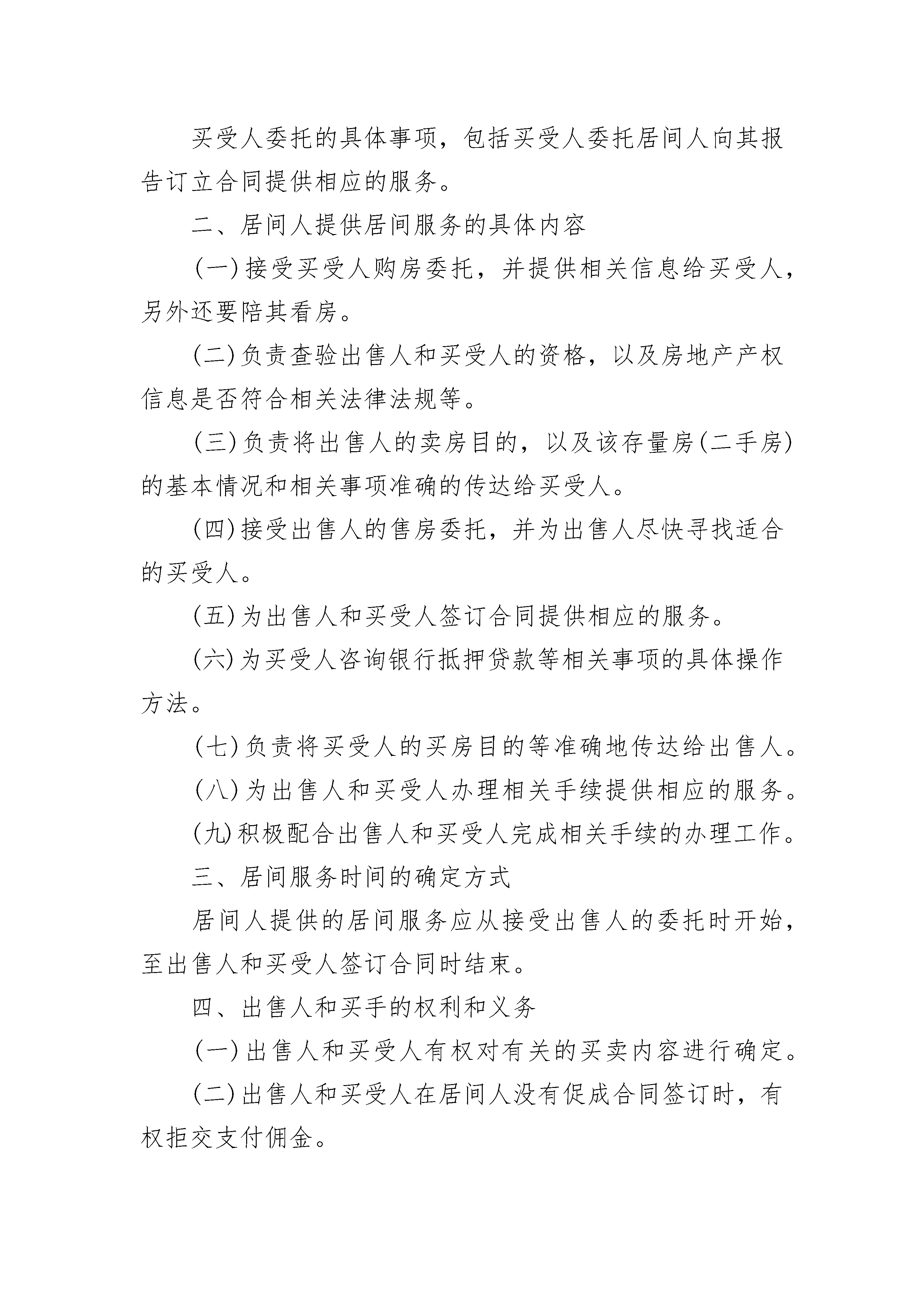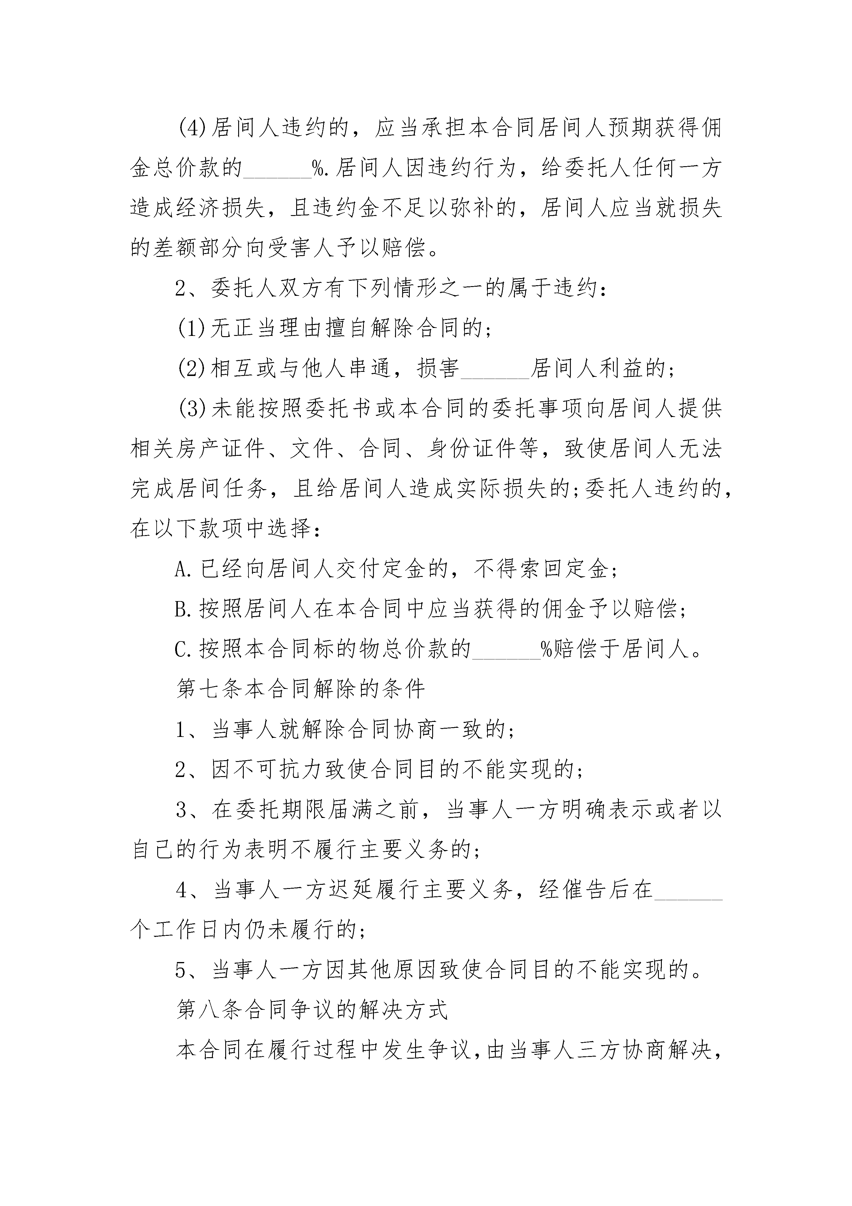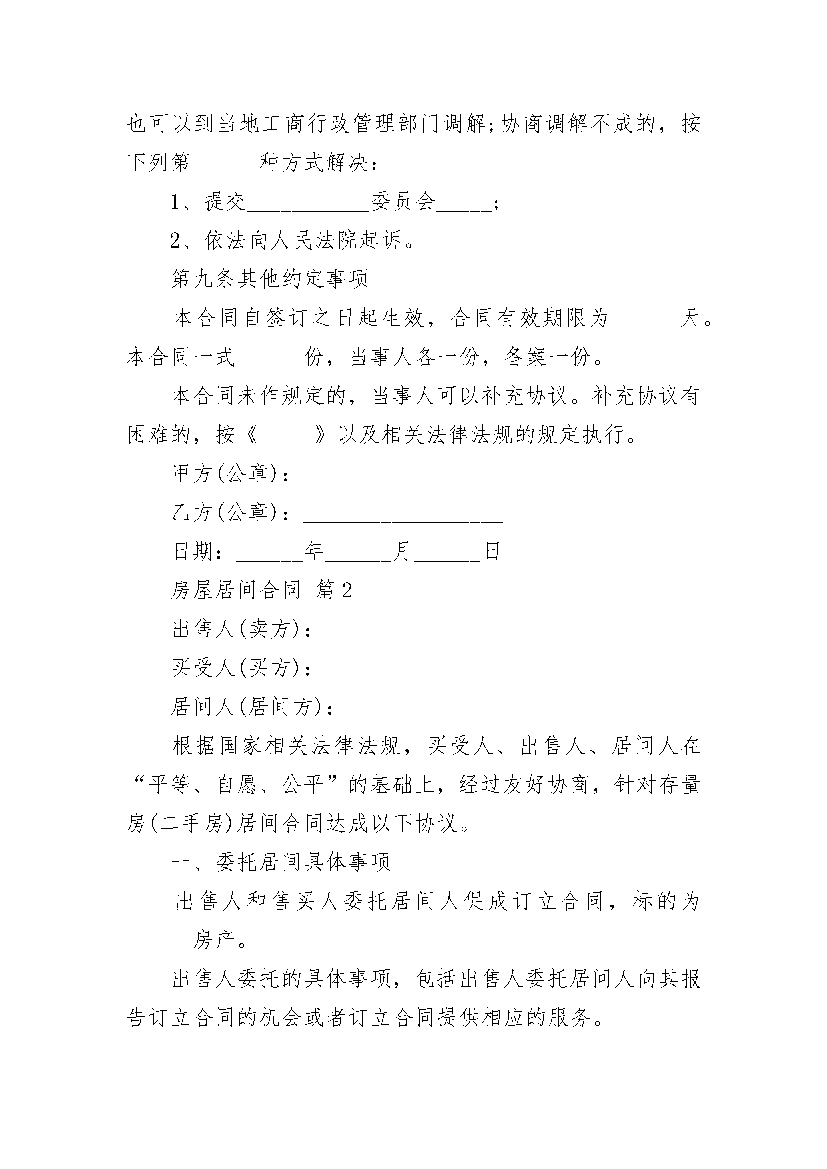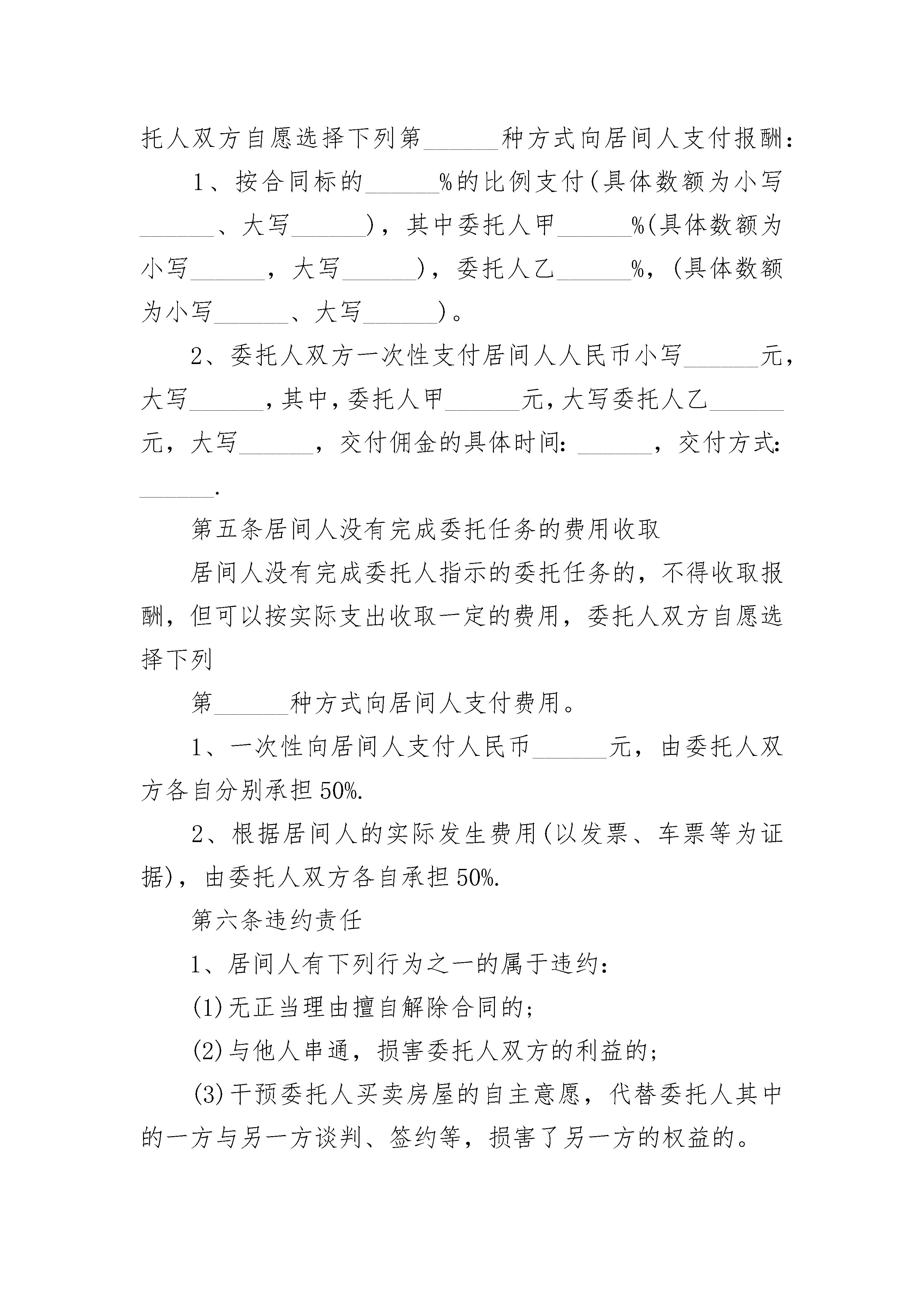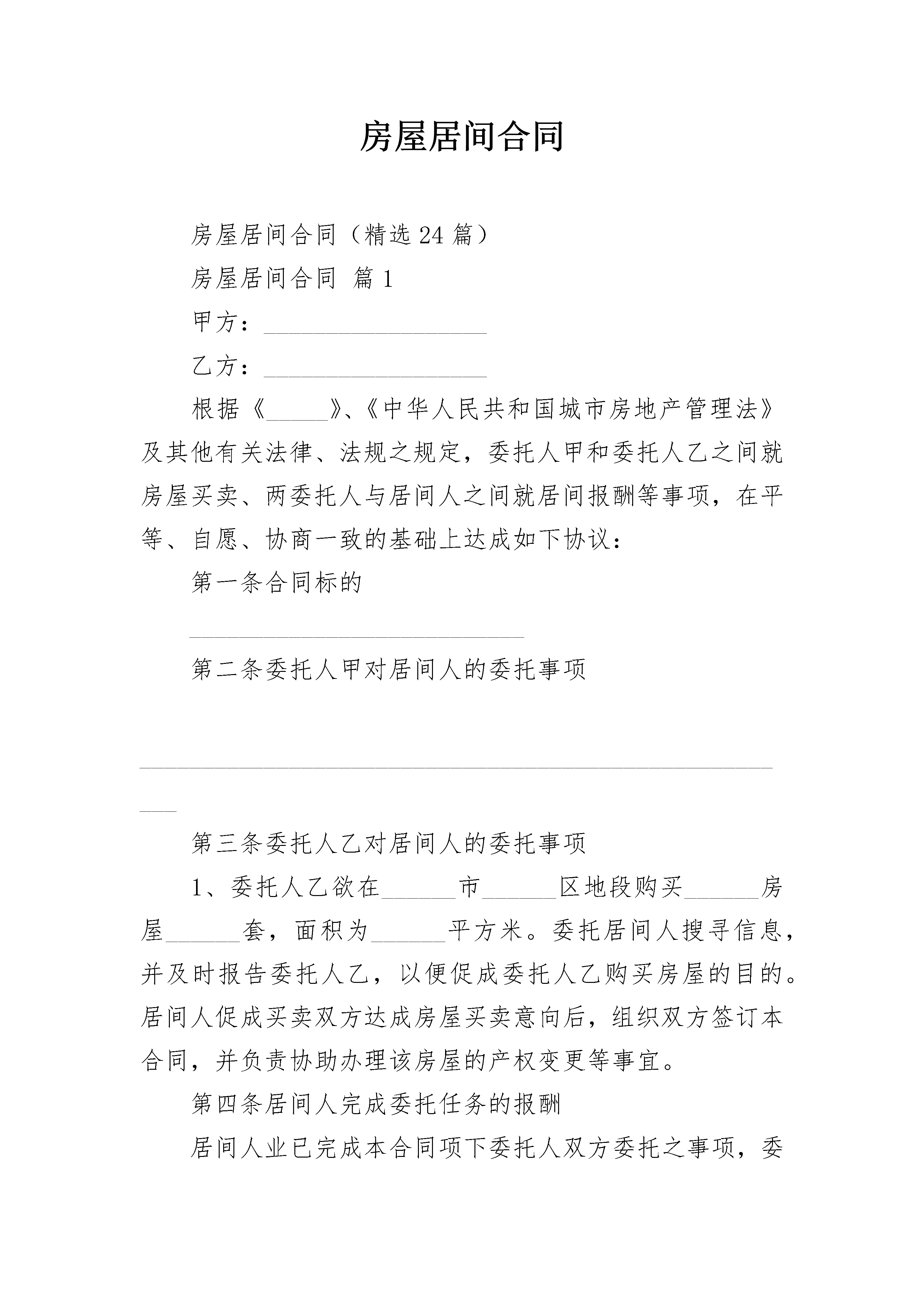 房屋居间合同房屋居间合同(精选24篇)房屋居间合同篇1甲方:__________________乙方:__________________根据《_____》、《中华人民共和国城市房地产管理法》及其他有关法律、法规之规定,委托人甲和委托人乙之间就房屋买卖、两委托人与居间人之间就居间报酬等事项,在平等、自愿、协商一致的基础上达成如下协议:第一条合同标的___________________________第二条委托人甲对居间人的委托事项______________________________________________________第三条委托人乙对居间人的委托事项1、委托人乙欲在______市______区地段购买______房屋______套,面积为______平方米。委托居间人搜寻信息,并及时报告委托人乙,以便促成委托人乙购买房屋的目的。居间人促成买卖双方达成房屋买卖意向后,组织双方签订本合同,并负责协助办理该房屋的产权变更等事宜。第四条居间人完成委托任务的报酬居间人业已完成本合同项下委托人双方委托之事项,委托人双方自愿选择下列第______种方式向居间人支付报酬:1、按合同标的______%的比例支付(具体数额为小写______、大写______),其中委托人甲______%(具体数额为小写______,大写______),委托人乙______%,(具体数额为小写______、大写______)。2、委托人双方一次性支付居间人人民币小写______元,大写______,其中,委托人甲______元,大写委托人乙______元,大写______,交付佣金的具体时间:______,交付方式:______.第五条居间人没有完成委托任务的费用收取居间人没有完成委托人指示的委托任务的,不得收取报酬,但可以按实际支出收取一定的费用,委托人双方自愿选择下列第______种方式向居间人支付费用。1、一次性向居间人支付人民币______元,由委托人双方各自分别承担50%.2、根据居间人的实际发生费用(以发票、车票等为证据),由委托人双方各自承担50%.第六条违约责任1、居间人有下列行为之一的属于违约:(1)无正当理由擅自解除合同的;(2)与他人串通,损害委托人双方的利益的;(3)干预委托人买卖房屋的自主意愿,代替委托人其中的一方与另一方谈判、签约等,损害了另一方的权益的。(4)居间人违约的,应当承担本合同居间人预期获得佣金总价款的______%.居间人因违约行为,给委托人任何一方造成经济损失,且违约金不足以弥补的,居间人应当就损失的差额部分向受害人予以赔偿。2、委托人双方有下列情形之一的属于违约:(1)无正当理由擅自解除合同的;(2)相互或与他人串通,损害______居间人利益的;(3)未能按照委托书或本合同的委托事项向居间人提供相关房产证件、文件、合同、身份证件等,致使居间人无法完成居间任务,且给居间人造成实际损失的;委托人违约的,在以下款项中选择:A.已经向居间人交付定金的,不得索回定金;B.按照居间人在本合同中应当获得的佣金予以赔偿;C.按照本合同标的物总价款的______%赔偿于居间人。第七条本合同解除的条件1、当事人就解除合同协商一致的;2、因不可抗力致使合同目的不能实现的;3、在委托期限届满之前,当事人一方明确表示或者以自己的行为表明不履行主要义务的;4、当事人一方迟延履行主要义务,经催告后在______个工作日内仍未履行的;5、当事人一方因其他原因致使合同目的不能实现的。第八条合同争议的解决方式本合同在履行过程中发生争议,由当事人三方协商解决,也可以到当地工商行政管理部门调解;协商调解不成的,按下列第______种方式解决:1、提交___________委员会_____;2、依法向人民法院起诉。第九条其他约定事项本合同自签订之日起生效,合同有效期限为______天。本合同一式______份,当事人各一份,备案一份。本合同未作规定的,当事人可以补充协议。补充协议有困难的,按《_____》以及相关法律法规的规定执行。甲方(公章):__________________乙方(公章):__________________日期:______年______月______日房屋居间合同篇2出售人(卖方):__________________买受人(买方):__________________居间人(居间方):________________根据国家相关法律法规,买受人、出售人、居间人在“平等、自愿、公平”的基础上,经过友好协商,针对存量房(二手房)居间合同达成以下协议。一、委托居间具体事项出售人和售买人委托居间人促成订立合同,标的为______房产。出售人委托的具体事项,包括出售人委托居间人向其报告订立合同的机会或者订立合同提供相