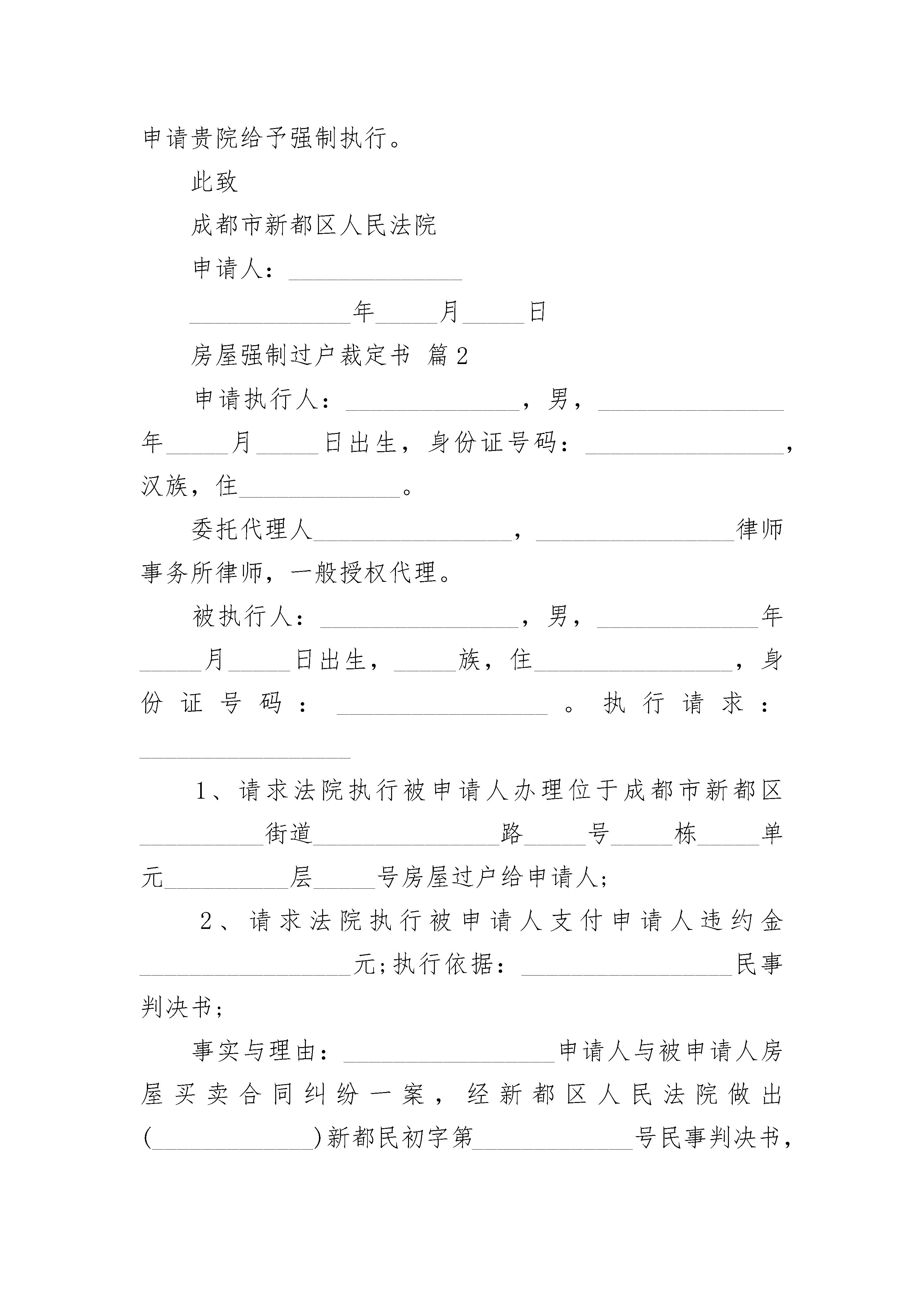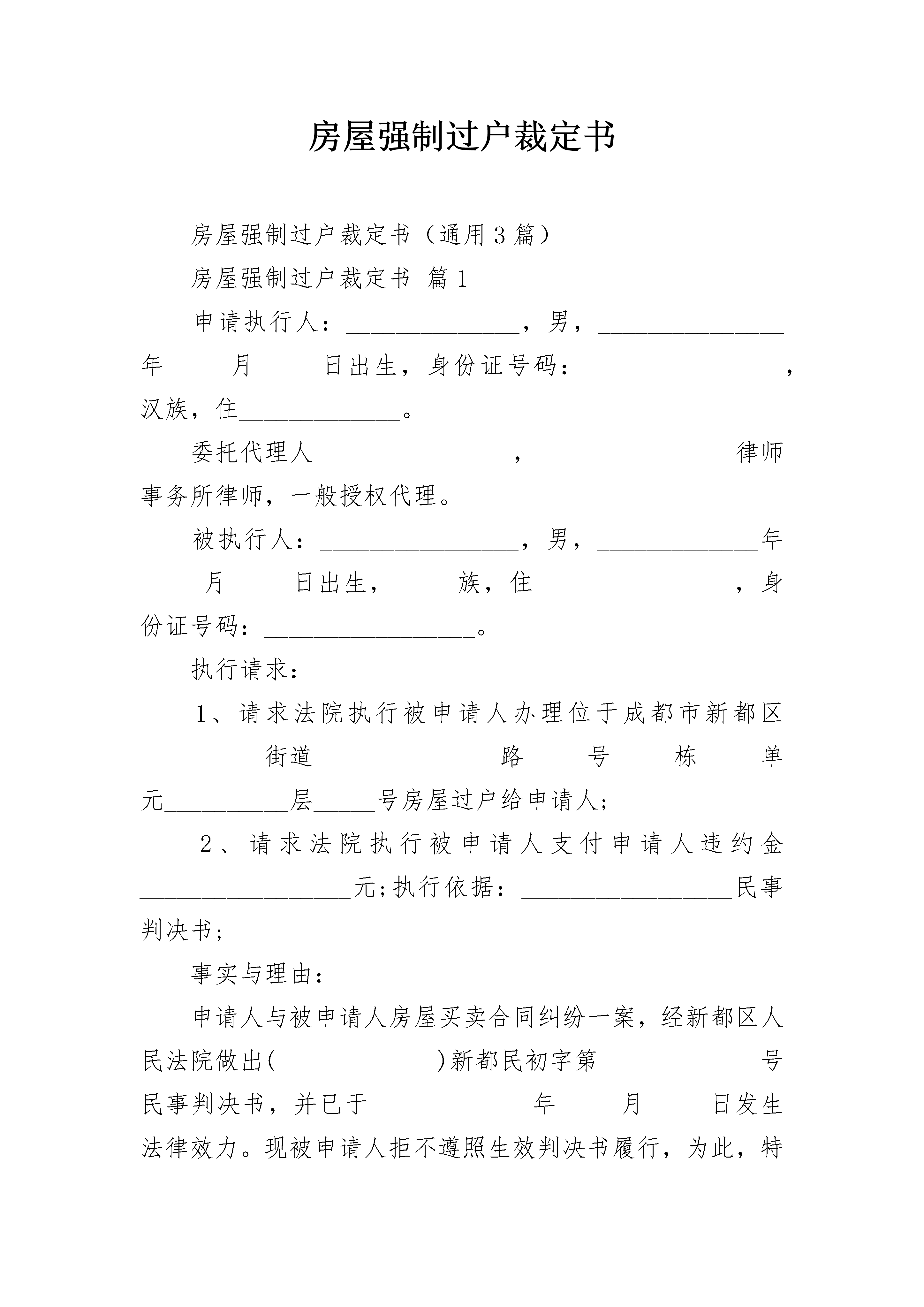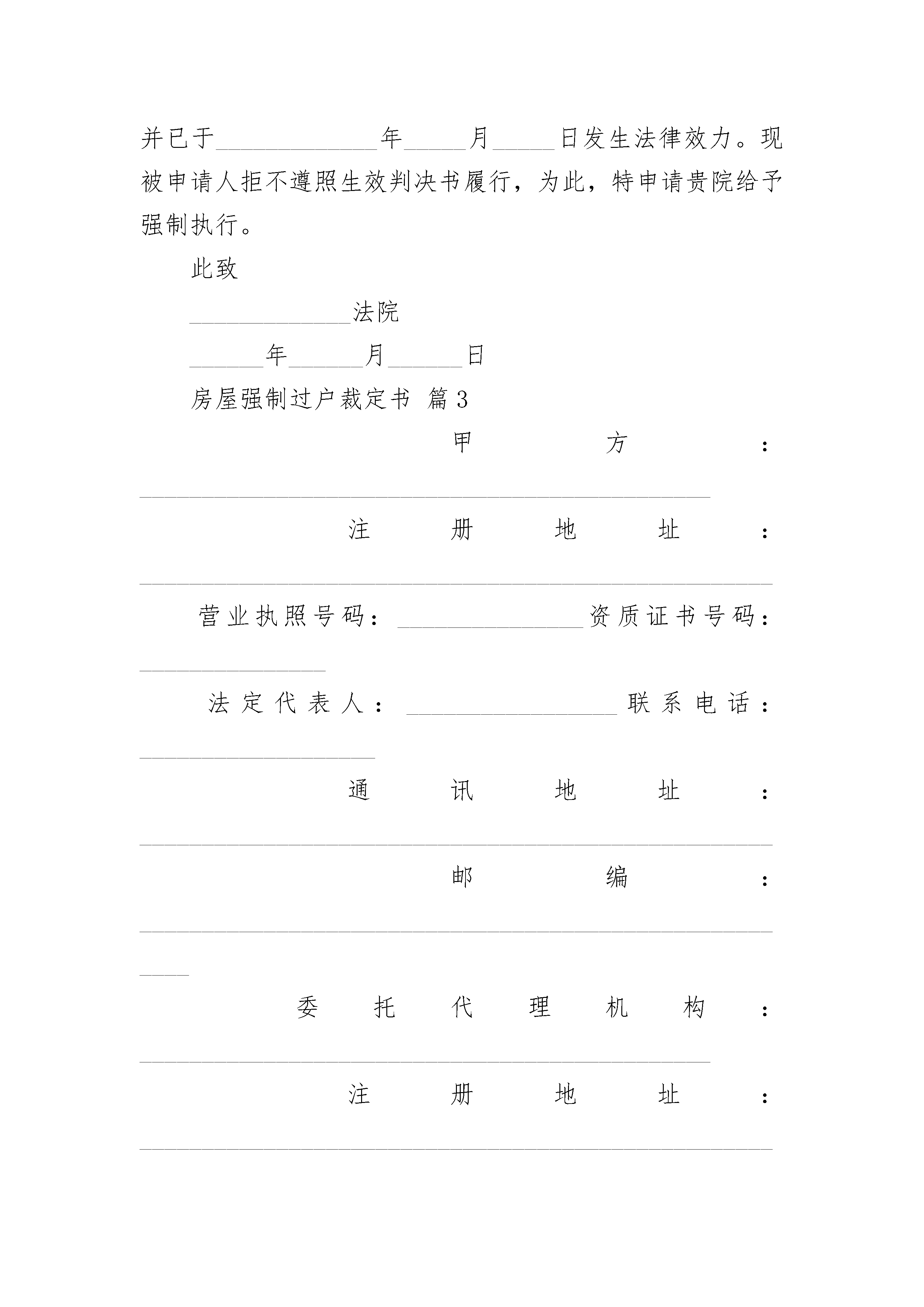 房屋强制过户裁定书房屋强制过户裁定书(通用3篇)房屋强制过户裁定书篇1申请执行人:______________,男,_______________年_____月_____日出生,身份证号码:________________,汉族,住_____________。委托代理人________________,________________律师事务所律师,一般授权代理。被执行人:________________,男,_____________年_____月_____日出生,_____族,住________________,身份证号码:_________________。执行请求:1、请求法院执行被申请人办理位于成都市新都区__________街道_______________路_____号_____栋_____单元__________层_____号房屋过户给申请人;2、请求法院执行被申请人支付申请人违约金_________________元;执行依据:_________________民事判决书;事实与理由:申请人与被申请人房屋买卖合同纠纷一案,经新都区人民法院做出(_____________)新都民初字第_____________号民事判决书,并已于_____________年_____月_____日发生法律效力。现被申请人拒不遵照生效判决书履行,为此,特申请贵院给予强制执行。此致成都市新都区人民法院申请人:___________________________年_____月_____日房屋强制过户裁定书篇2申请执行人:______________,男,_______________年_____月_____日出生,身份证号码:________________,汉族,住_____________。委托代理人________________,________________律师事务所律师,一般授权代理。被执行人:________________,男,_____________年_____月_____日出生,_____族,住________________,身份证号码:_________________。执行请求:_________________1、请求法院执行被申请人办理位于成都市新都区__________街道_______________路_____号_____栋_____单元__________层_____号房屋过户给申请人;2、请求法院执行被申请人支付申请人违约金_________________元;执行依据:_________________民事判决书;事实与理由:_________________申请人与被申请人房屋买卖合同纠纷一案,经新都区人民法院做出(_____________)新都民初字第_____________号民事判决书,并已于_____________年_____月_____日发生法律效力。现被申请人拒不遵照生效判决书履行,为此,特申请贵院给予强制执行。此致_____________法院______年______月______日房屋强制过户裁定书篇3甲方:______________________________________________注册地址:___________________________________________________营业执照号码:_______________资质证书号码:_______________法定代表人:_________________联系电话:___________________通讯地址:___________________________________________________邮编:_______________________________________________________委托代理机构:______________________________________________注册地址:___________________________________________________营业执照号码:_______________资质证书号码:_______________法定代表人:_________________联系电话:___________________通讯地址:___________________________________________________邮编:_______________________________________________________.乙方:______________________________________________住所:______________