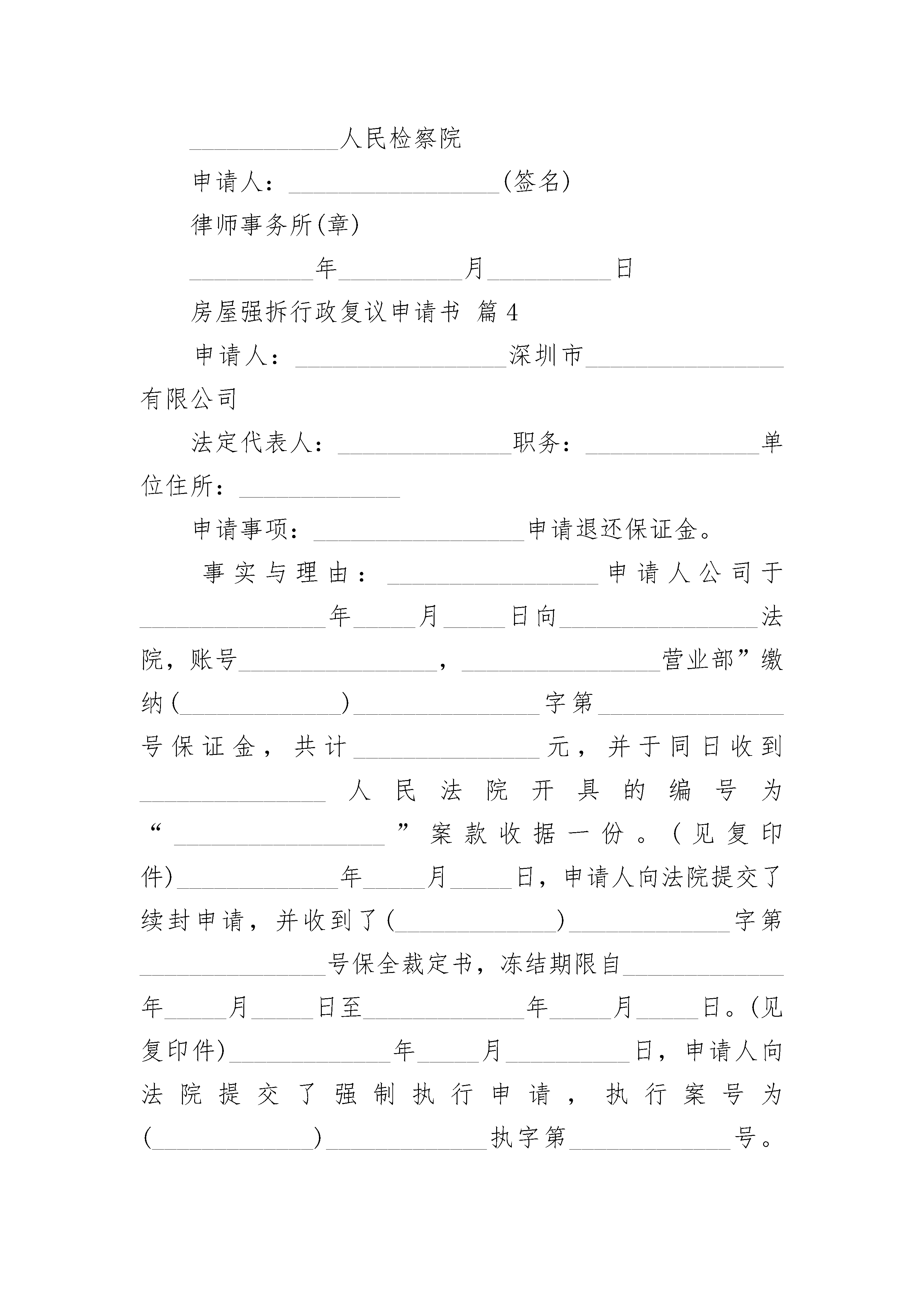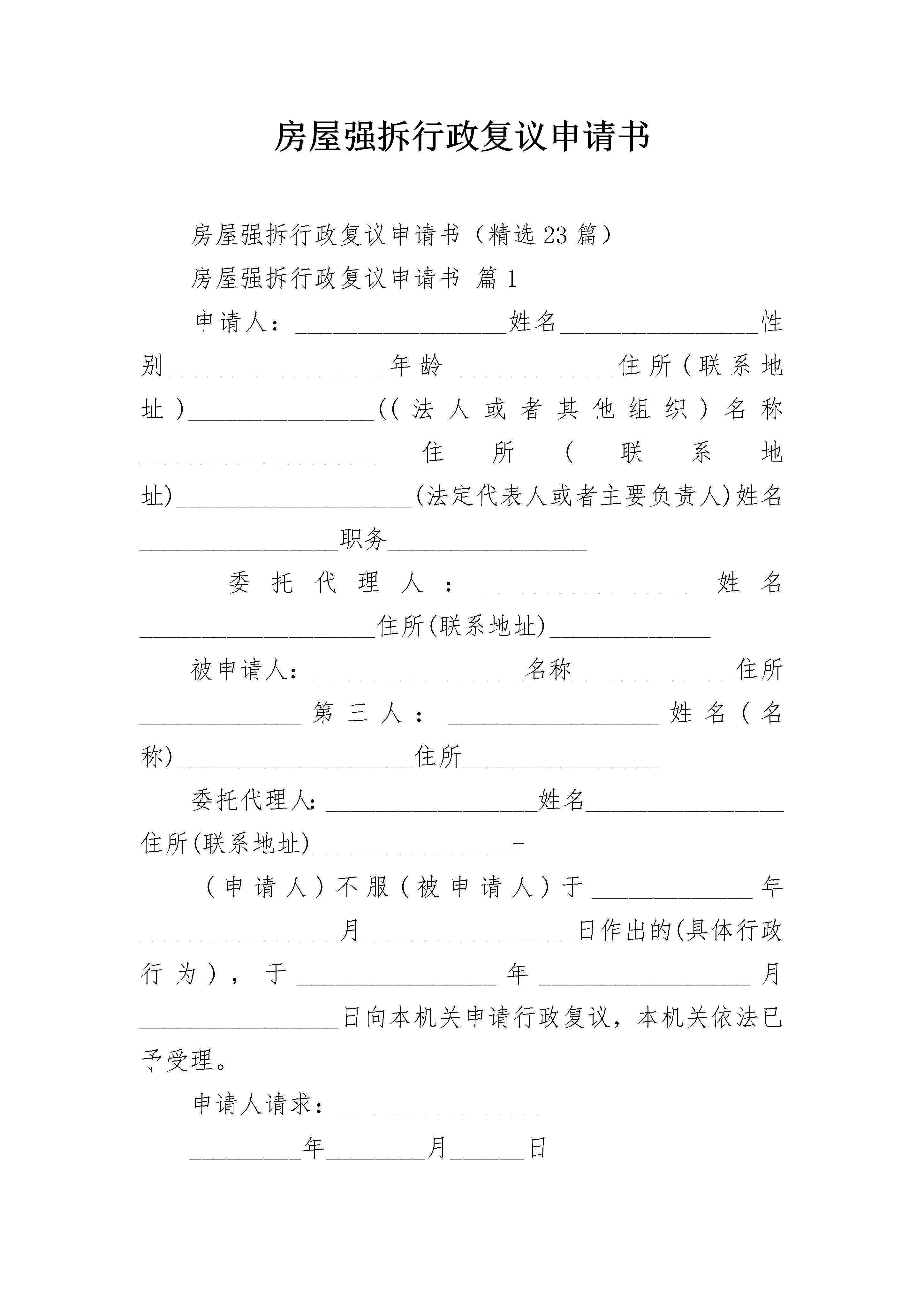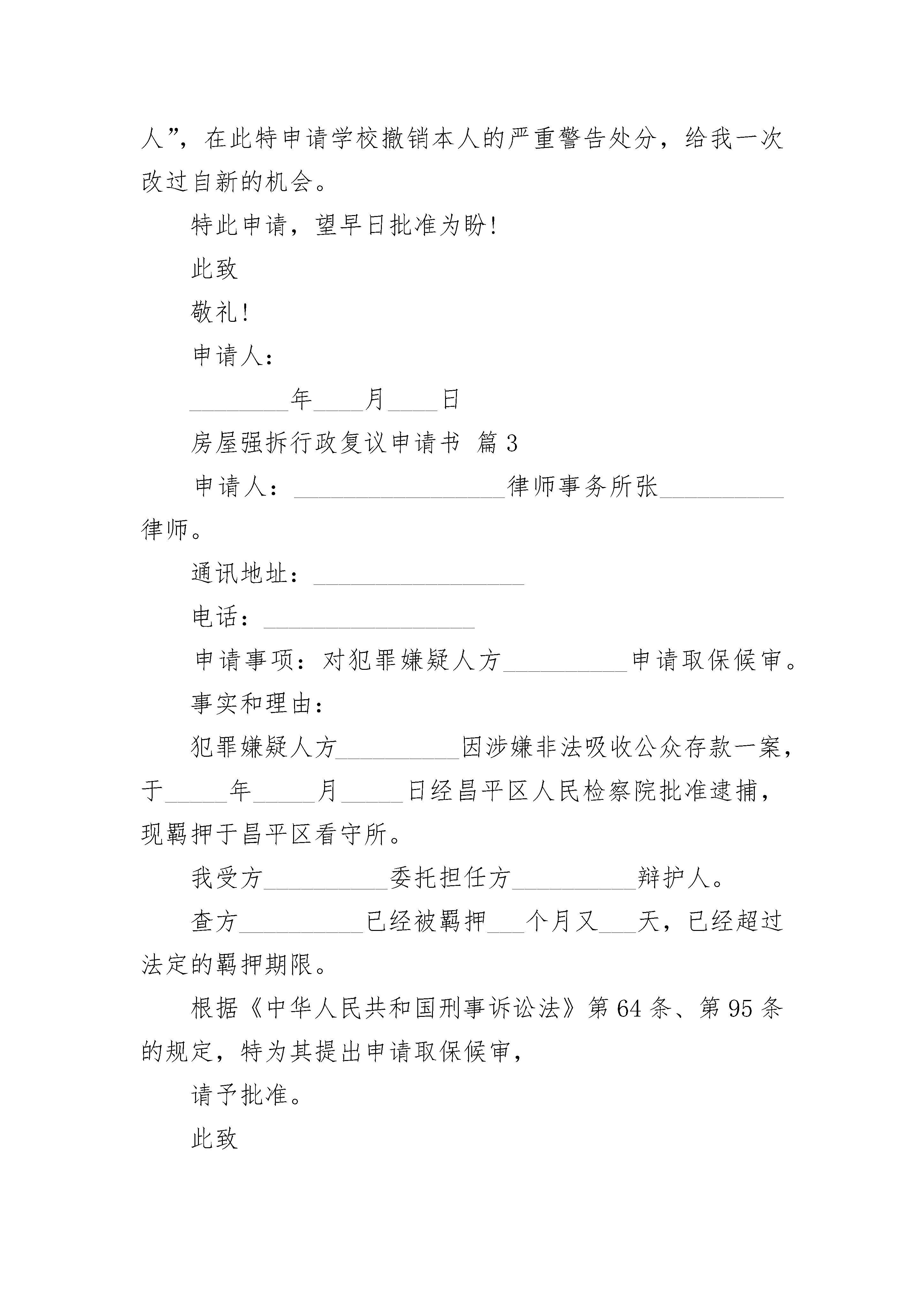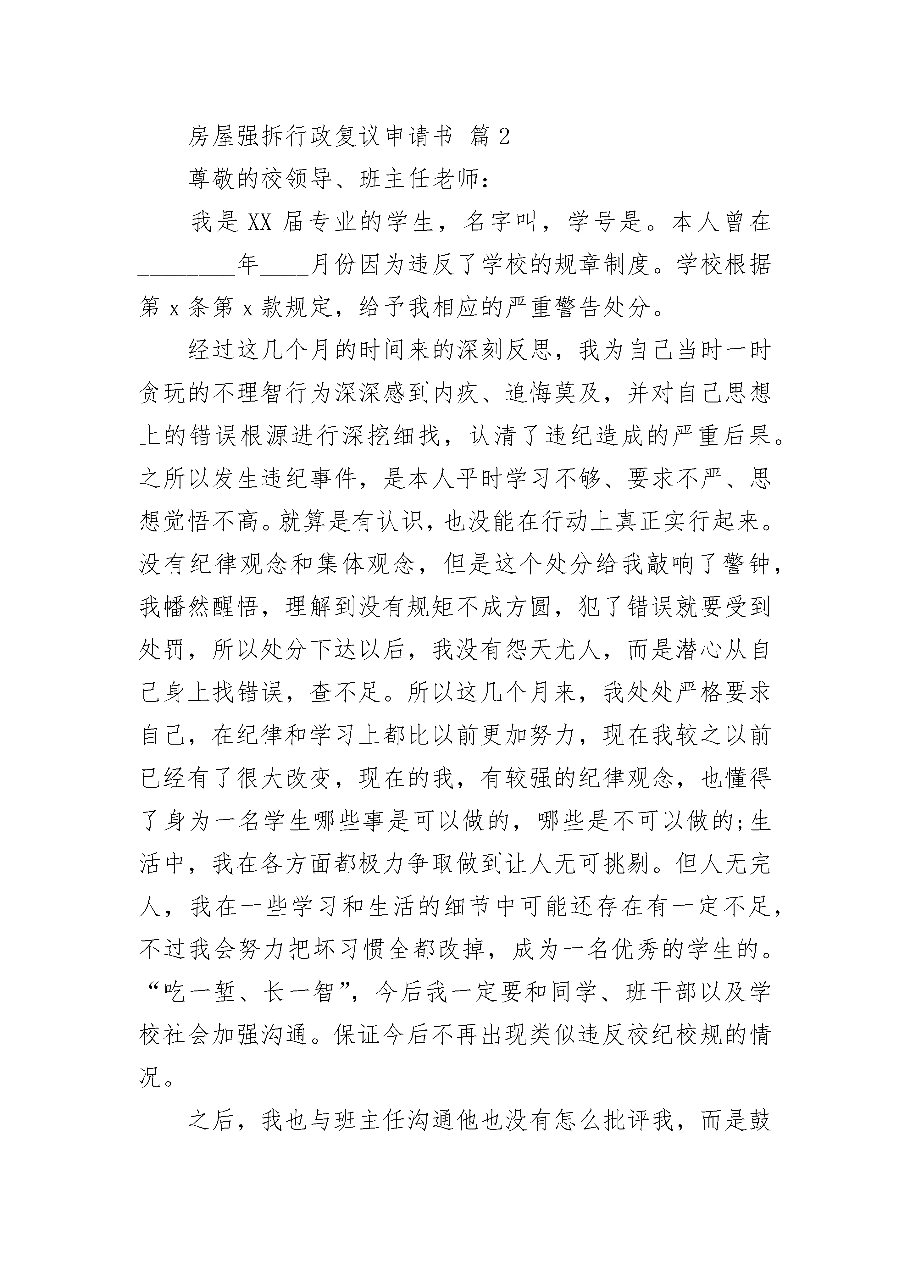 房屋强拆行政复议申请书房屋强拆行政复议申请书(精选23篇)房屋强拆行政复议申请书篇1申请人:_________________姓名________________性别_________________年龄_____________住所(联系地址)_______________((法人或者其他组织)名称___________________住所(联系地址)___________________(法定代表人或者主要负责人)姓名________________职务________________委托代理人:_________________姓名___________________住所(联系地址)_____________被申请人:_________________名称_____________住所_____________第三人:_________________姓名(名称)___________________住所________________委托代理人:_________________姓名________________住所(联系地址)________________-(申请人)不服(被申请人)于_____________年________________月_________________日作出的(具体行政行为),于________________年_________________月________________日向本机关申请行政复议,本机关依法已予受理。申请人请求:_________________________年________月______日房屋强拆行政复议申请书篇2尊敬的校领导、班主任老师:我是XX届专业的学生,名字叫,学号是。本人曾在________年____月份因为违反了学校的规章制度。学校根据第x条第x款规定,给予我相应的严重警告处分。经过这几个月的时间来的深刻反思,我为自己当时一时贪玩的不理智行为深深感到内疚、追悔莫及,并对自己思想上的错误根源进行深挖细找,认清了违纪造成的严重后果。之所以发生违纪事件,是本人平时学习不够、要求不严、思想觉悟不高。就算是有认识,也没能在行动上真正实行起来。没有纪律观念和集体观念,但是这个处分给我敲响了警钟,我幡然醒悟,理解到没有规矩不成方圆,犯了错误就要受到处罚,所以处分下达以后,我没有怨天尤人,而是潜心从自己身上找错误,查不足。所以这几个月来,我处处严格要求自己,在纪律和学习上都比以前更加努力,现在我较之以前已经有了很大改变,现在的我,有较强的纪律观念,也懂得了身为一名学生哪些事是可以做的,哪些是不可以做的;生活中,我在各方面都极力争取做到让人无可挑剔。但人无完人,我在一些学习和生活的细节中可能还存在有一定不足,不过我会努力把坏习惯全都改掉,成为一名优秀的学生的。“吃一堑、长一智”,今后我一定要和同学、班干部以及学校社会加强沟通。保证今后不再出现类似违反校纪校规的情况。之后,我也与班主任沟通他也没有怎么批评我,而是鼓励我,希望我不要抱怨别人和环境,要勇敢的去面对错误,争取后面的做的更好,甚至努力去做出更出色的成绩来弥补这次错误。在与领导老师的交谈之后,我不仅认识到了我犯的错误,还懂得了我后面该怎么去做。事实上,这几个月来,我也按老师们的希望在努力着。首先,思想上,不断加强自己的修养,提升思想认识。与时俱进,了解社会发展动态,认识社会发展趋势。作为中专生,刚刚进校的学生,我要让自己知道以后要如何的去认真学习。好对以后自己出社会,为社会做一份有用的贡献。如今我已没有旷课,偶尔因点事情迟到。但是我已经尽了自己的努力了。以上是我在这几个月来的主要表现,希望领导老师审查。并恳请学校领导老师准予取消处分。我非常感谢老师和学生会干部对我所犯错误的及时指正,我保证今后不会再有类似行为发生在我身上,希望老师和同学们在今后的工作、生活、工作中多多帮助我,帮助我克服我的缺点,改正我的错误。为了挖掘我思想上的错误根源,我在此进行了十分深刻的反思和检讨。也真心地希望我能够得到改正的机会。请老师和同学们多多监督我。相信老师看到我这个态度也可以知道我对这次事件有很深刻的悔过态度,相信我的悔过之心,我的行为不是向老师的纪律进行挑战,是自己的一时失足,希望老师可以原谅我的错误。由于本人今后人生的道路还很长,“惩前毖后,治病救人”,在此特申请学校撤销本人的严重警告处分,给我一次改过自新的机会。特此申请,望早日批准为盼!此致敬礼!申请人:________年____月____日房屋强拆行政复议申请书篇3申请人:_________________律师事务所张__________律师。通讯地址:_________________电话:_________________申请事项:对犯罪嫌疑人方_______