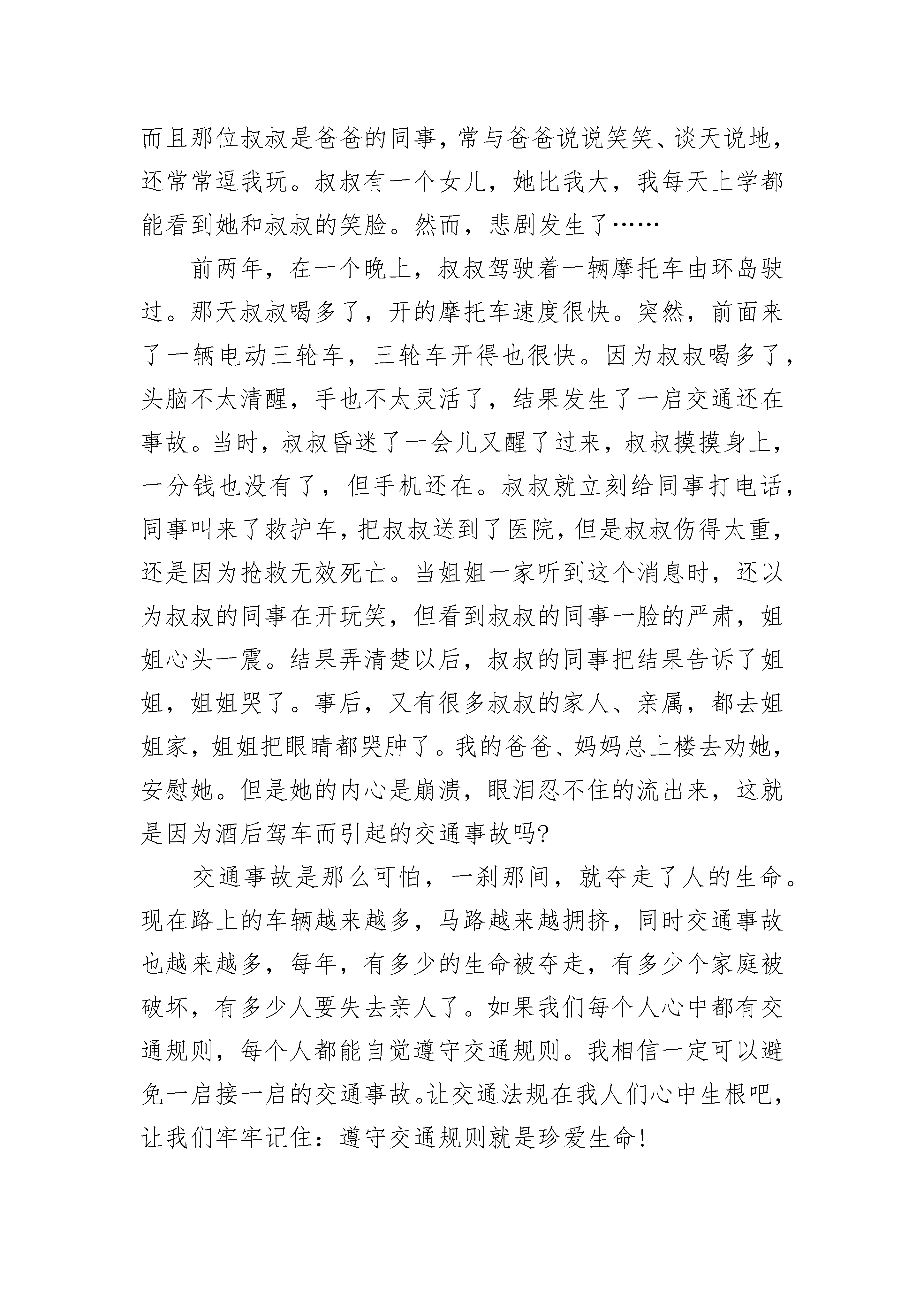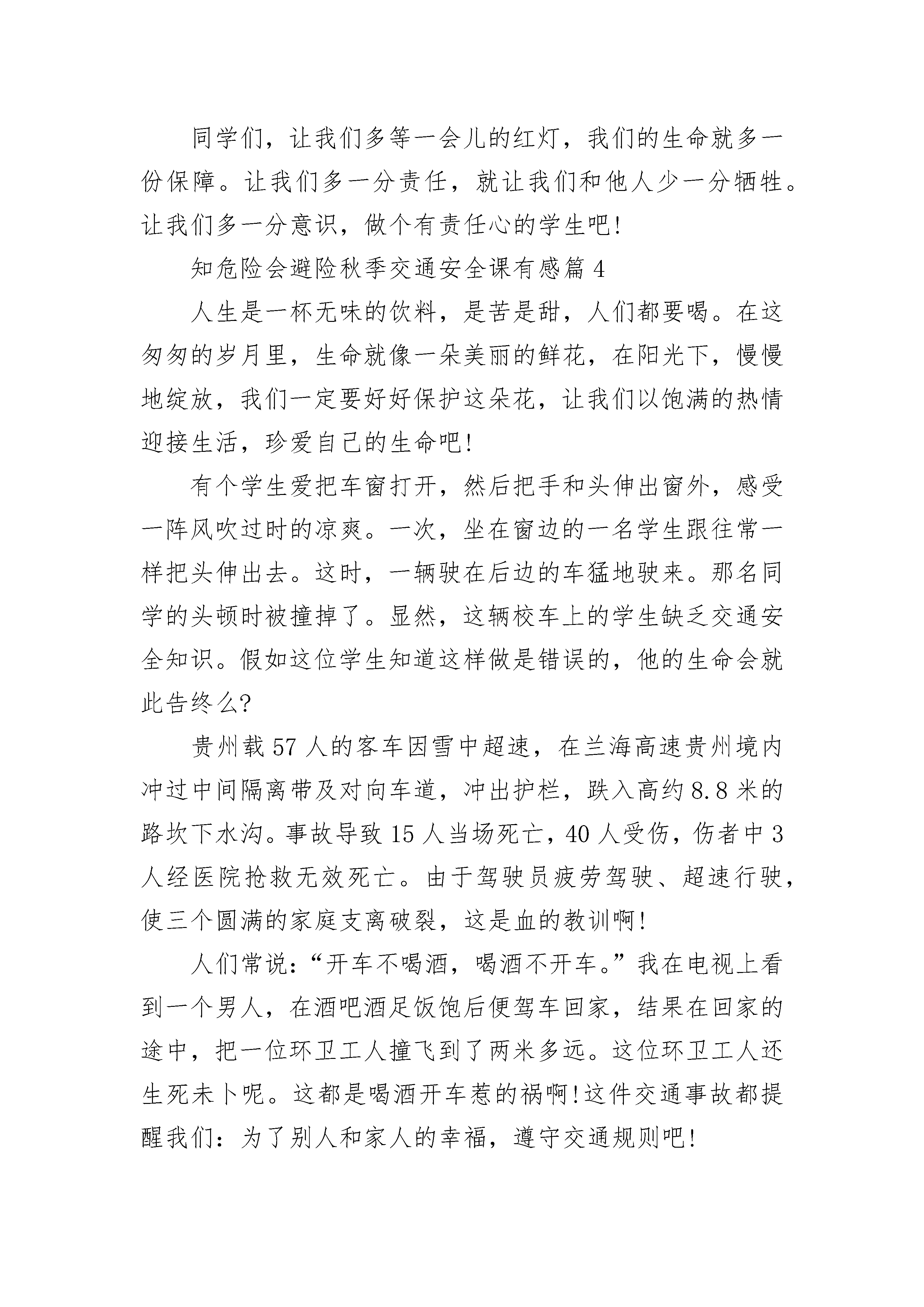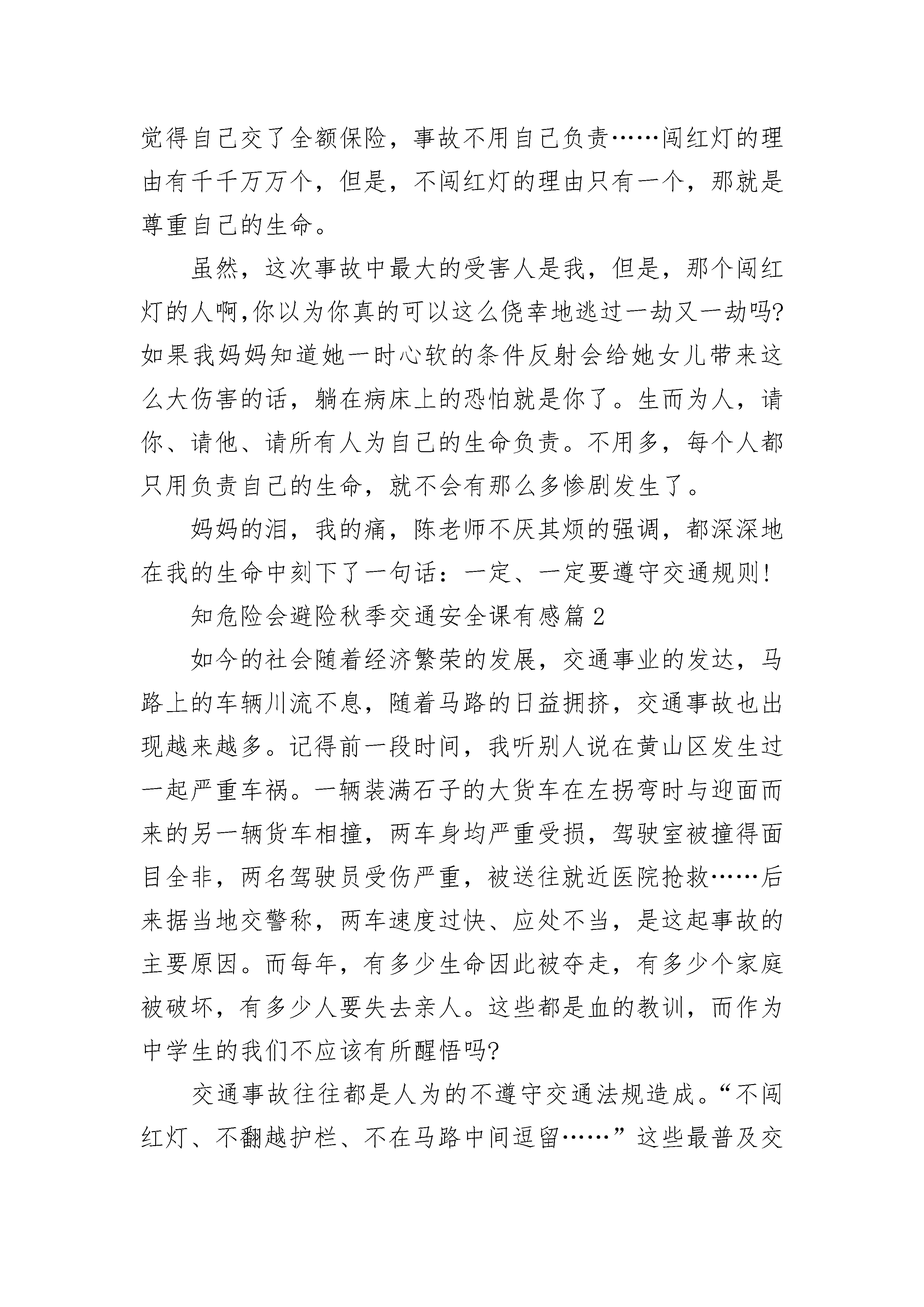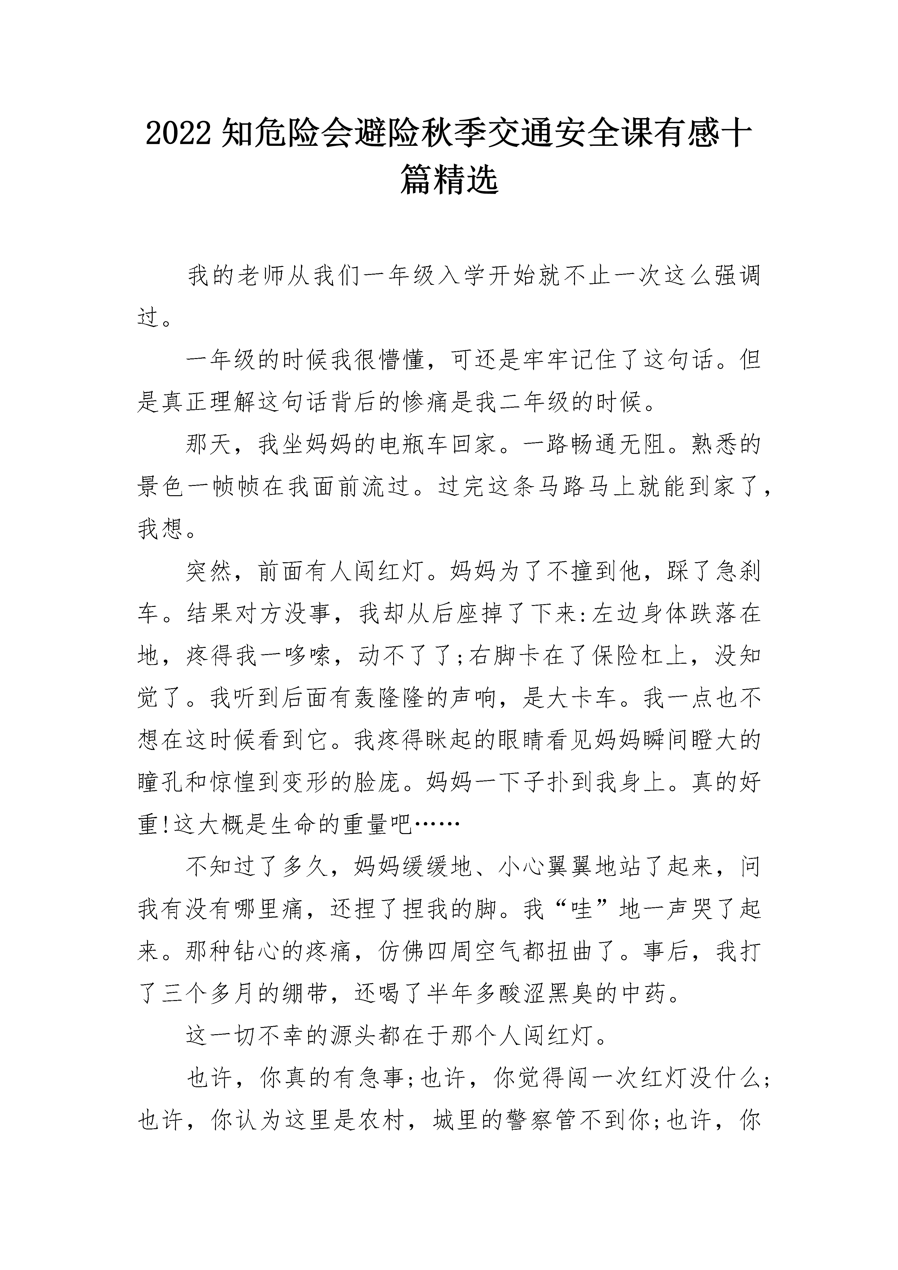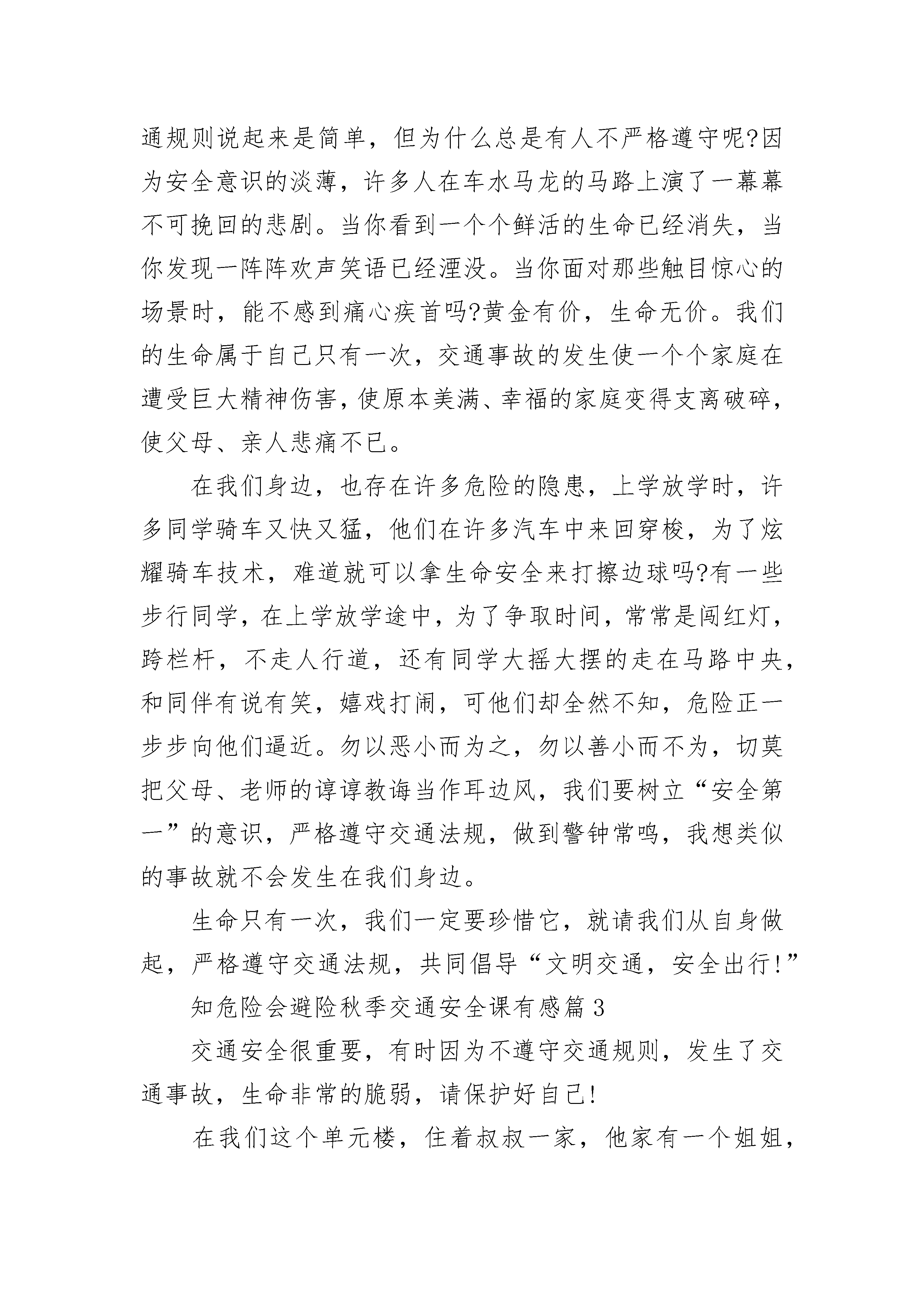 2022知危险会避险秋季交通安全课有感十篇精选我的老师从我们一年级入学开始就不止一次这么强调过。一年级的时候我很懵懂,可还是牢牢记住了这句话。但是真正理解这句话背后的惨痛是我二年级的时候。那天,我坐妈妈的电瓶车回家。一路畅通无阻。熟悉的景色一帧帧在我面前流过。过完这条马路马上就能到家了,我想。突然,前面有人闯红灯。妈妈为了不撞到他,踩了急刹车。结果对方没事,我却从后座掉了下来:左边身体跌落在地,疼得我一哆嗦,动不了了;右脚卡在了保险杠上,没知觉了。我听到后面有轰隆隆的声响,是大卡车。我一点也不想在这时候看到它。我疼得眯起的眼睛看见妈妈瞬间瞪大的瞳孔和惊惶到变形的脸庞。妈妈一下子扑到我身上。真的好重!这大概是生命的重量吧……不知过了多久,妈妈缓缓地、小心翼翼地站了起来,问我有没有哪里痛,还捏了捏我的脚。我“哇”地一声哭了起来。那种钻心的疼痛,仿佛四周空气都扭曲了。事后,我打了三个多月的绷带,还喝了半年多酸涩黑臭的中药。这一切不幸的源头都在于那个人闯红灯。也许,你真的有急事;也许,你觉得闯一次红灯没什么;也许,你认为这里是农村,城里的警察管不到你;也许,你觉得自己交了全额保险,事故不用自己负责……闯红灯的理由有千千万万个,但是,不闯红灯的理由只有一个,那就是尊重自己的生命。虽然,这次事故中最大的受害人是我,但是,那个闯红灯的人啊,你以为你真的可以这么侥幸地逃过一劫又一劫吗?如果我妈妈知道她一时心软的条件反射会给她女儿带来这么大伤害的话,躺在病床上的恐怕就是你了。生而为人,请你、请他、请所有人为自己的生命负责。不用多,每个人都只用负责自己的生命,就不会有那么多惨剧发生了。妈妈的泪,我的痛,陈老师不厌其烦的强调,都深深地在我的生命中刻下了一句话:一定、一定要遵守交通规则!知危险会避险秋季交通安全课有感篇2如今的社会随着经济繁荣的发展,交通事业的发达,马路上的车辆川流不息,随着马路的日益拥挤,交通事故也出现越来越多。记得前一段时间,我听别人说在黄山区发生过一起严重车祸。一辆装满石子的大货车在左拐弯时与迎面而来的另一辆货车相撞,两车身均严重受损,驾驶室被撞得面目全非,两名驾驶员受伤严重,被送往就近医院抢救……后来据当地交警称,两车速度过快、应处不当,是这起事故的主要原因。而每年,有多少生命因此被夺走,有多少个家庭被破坏,有多少人要失去亲人。这些都是血的教训,而作为中学生的我们不应该有所醒悟吗?交通事故往往都是人为的不遵守交通法规造成。“不闯红灯、不翻越护栏、不在马路中间逗留……”这些最普及交通规则说起来是简单,但为什么总是有人不严格遵守呢?因为安全意识的淡薄,许多人在车水马龙的马路上演了一幕幕不可挽回的悲剧。当你看到一个个鲜活的生命已经消失,当你发现一阵阵欢声笑语已经湮没。当你面对那些触目惊心的场景时,能不感到痛心疾首吗?黄金有价,生命无价。我们的生命属于自己只有一次,交通事故的发生使一个个家庭在遭受巨大精神伤害,使原本美满、幸福的家庭变得支离破碎,使父母、亲人悲痛不已。在我们身边,也存在许多危险的隐患,上学放学时,许多同学骑车又快又猛,他们在许多汽车中来回穿梭,为了炫耀骑车技术,难道就可以拿生命安全来打擦边球吗?有一些步行同学,在上学放学途中,为了争取时间,常常是闯红灯,跨栏杆,不走人行道,还有同学大摇大摆的走在马路中央,和同伴有说有笑,嬉戏打闹,可他们却全然不知,危险正一步步向他们逼近。勿以恶小而为之,勿以善小而不为,切莫把父母、老师的谆谆教诲当作耳边风,我们要树立“安全第一”的意识,严格遵守交通法规,做到警钟常鸣,我想类似的事故就不会发生在我们身边。生命只有一次,我们一定要珍惜它,就请我们从自身做起,严格遵守交通法规,共同倡导“文明交通,安全出行!”知危险会避险秋季交通安全课有感篇3交通安全很重要,有时因为不遵守交通规则,发生了交通事故,生命非常的脆弱,请保护好自己!在我们这个单元楼,住着叔叔一家,他家有一个姐姐,而且那位叔叔是爸爸的同事,常与爸爸说说笑笑、谈天说地,还常常逗我玩。叔叔有一个女儿,她比我大,我每天上学都能看到她和叔叔的笑脸。然而,悲剧发生了……前两年,在一个晚上,叔叔驾驶着一辆摩托车由环岛驶过。那天叔叔喝多了,开的摩托车速度很快。突然,前面来了一辆电动三轮车,三轮车开得也很快。因为叔叔喝多了,头脑不太清醒,手也不太灵活了,结果发生了一启交通还在事故。当时,叔叔昏迷了一会儿又醒了过来,叔叔摸摸身上,一分钱也没有了,但手机还在。叔叔就立刻给同事打电话,同事叫来了救护车,把叔叔送到了医院,但是叔叔伤得太重,还是因为抢救无效死亡。当姐姐一家听到这个消息时,还以为叔叔的同事在开玩笑,但看到叔叔的同事一脸的严肃,姐姐心头一震。结果弄清楚以后,叔叔的同事把结果告诉了姐姐,姐姐哭了。事后,又有很多叔叔的家人、亲属,都去姐姐家,姐