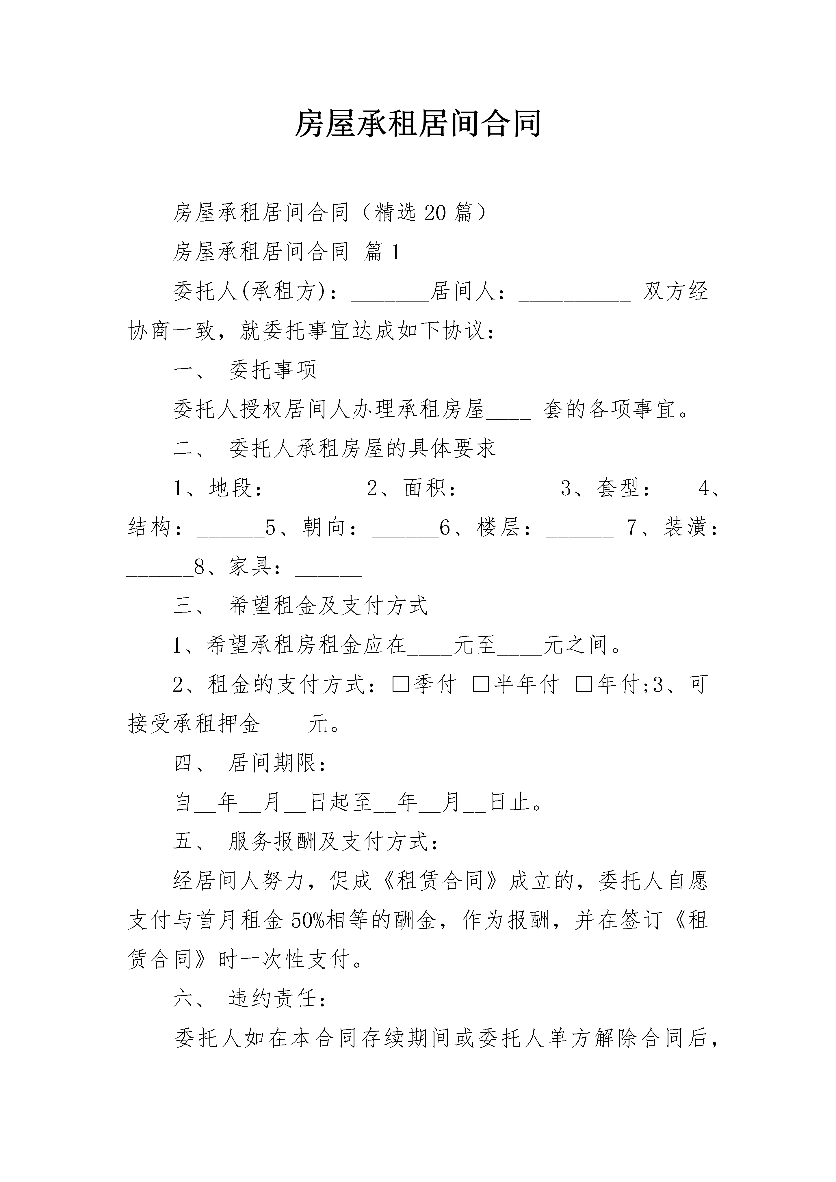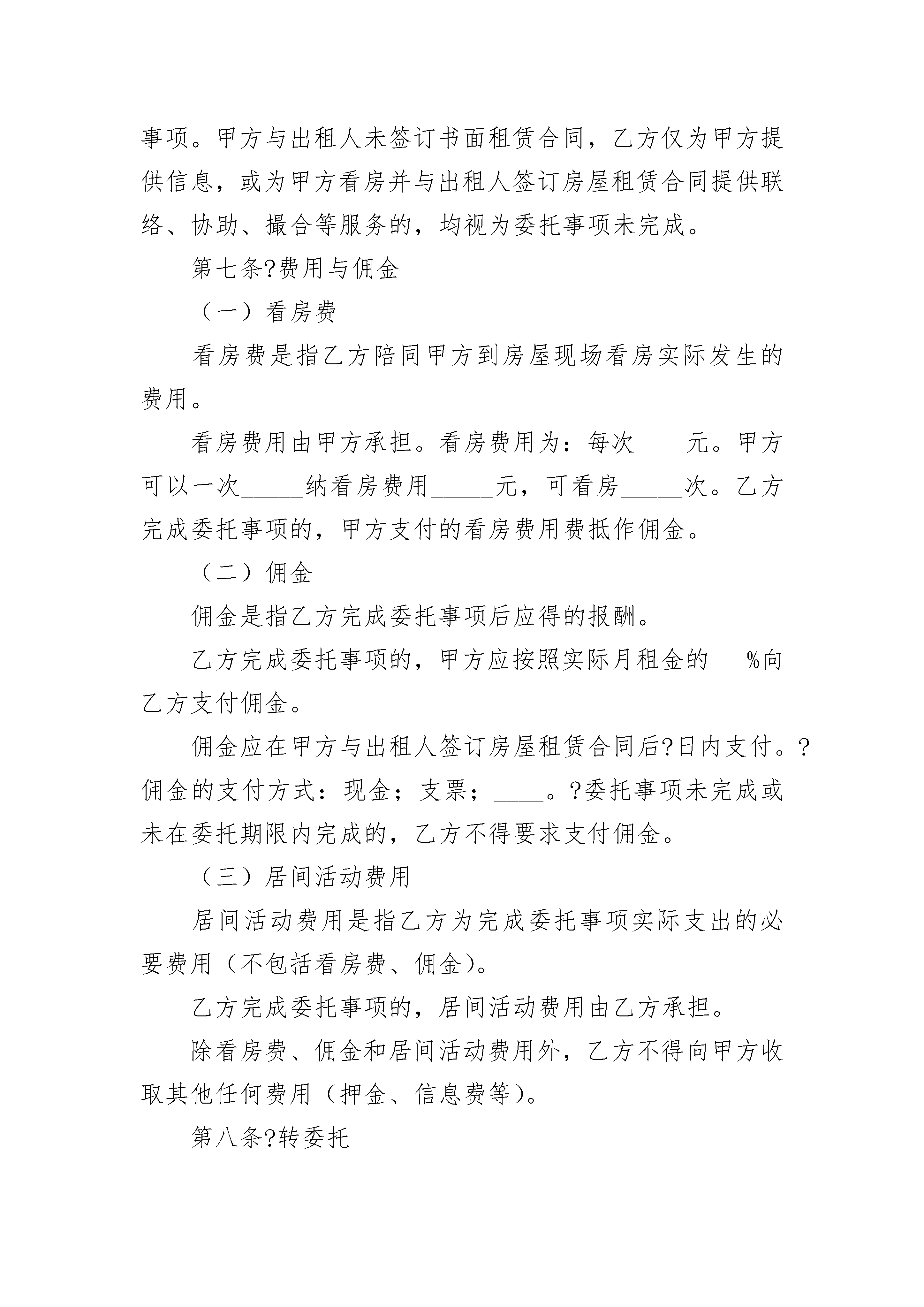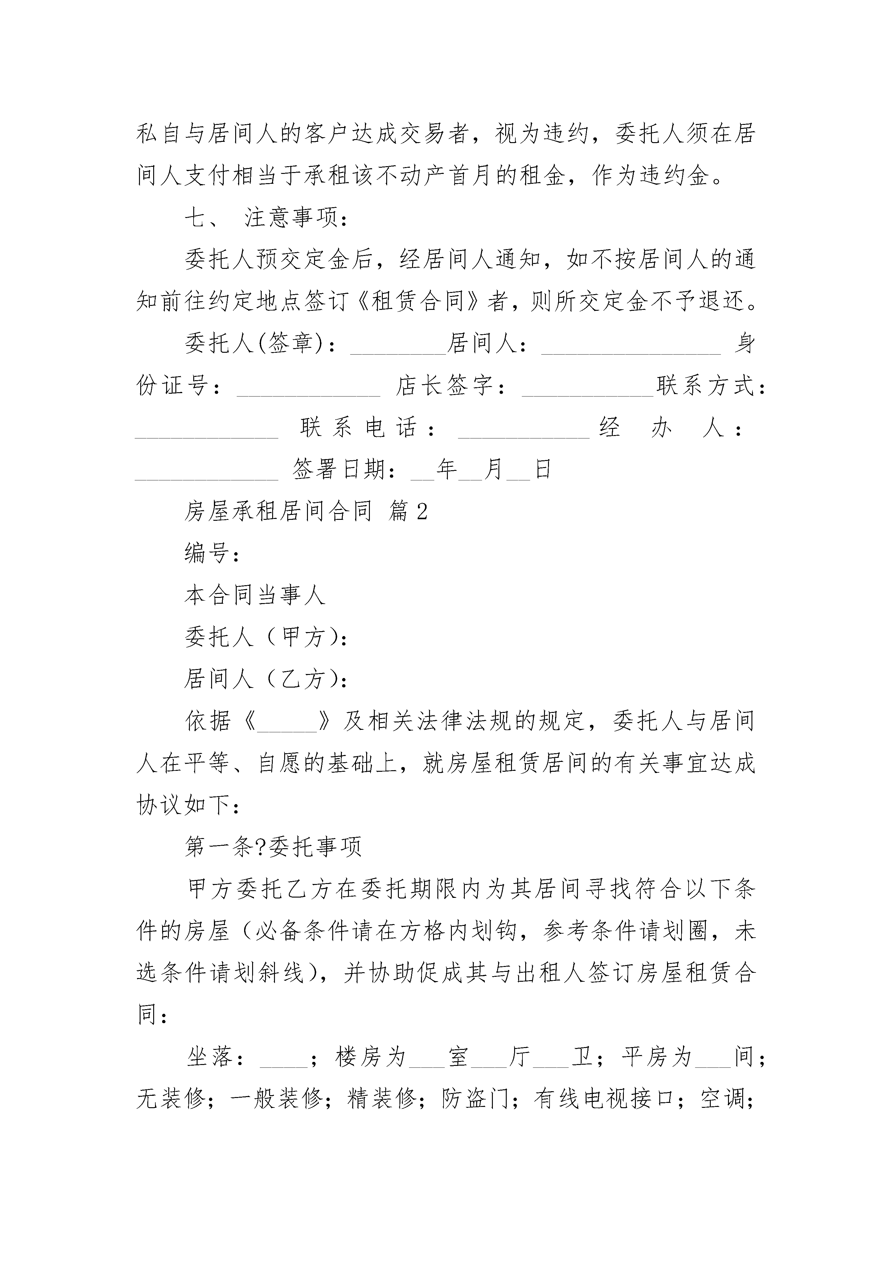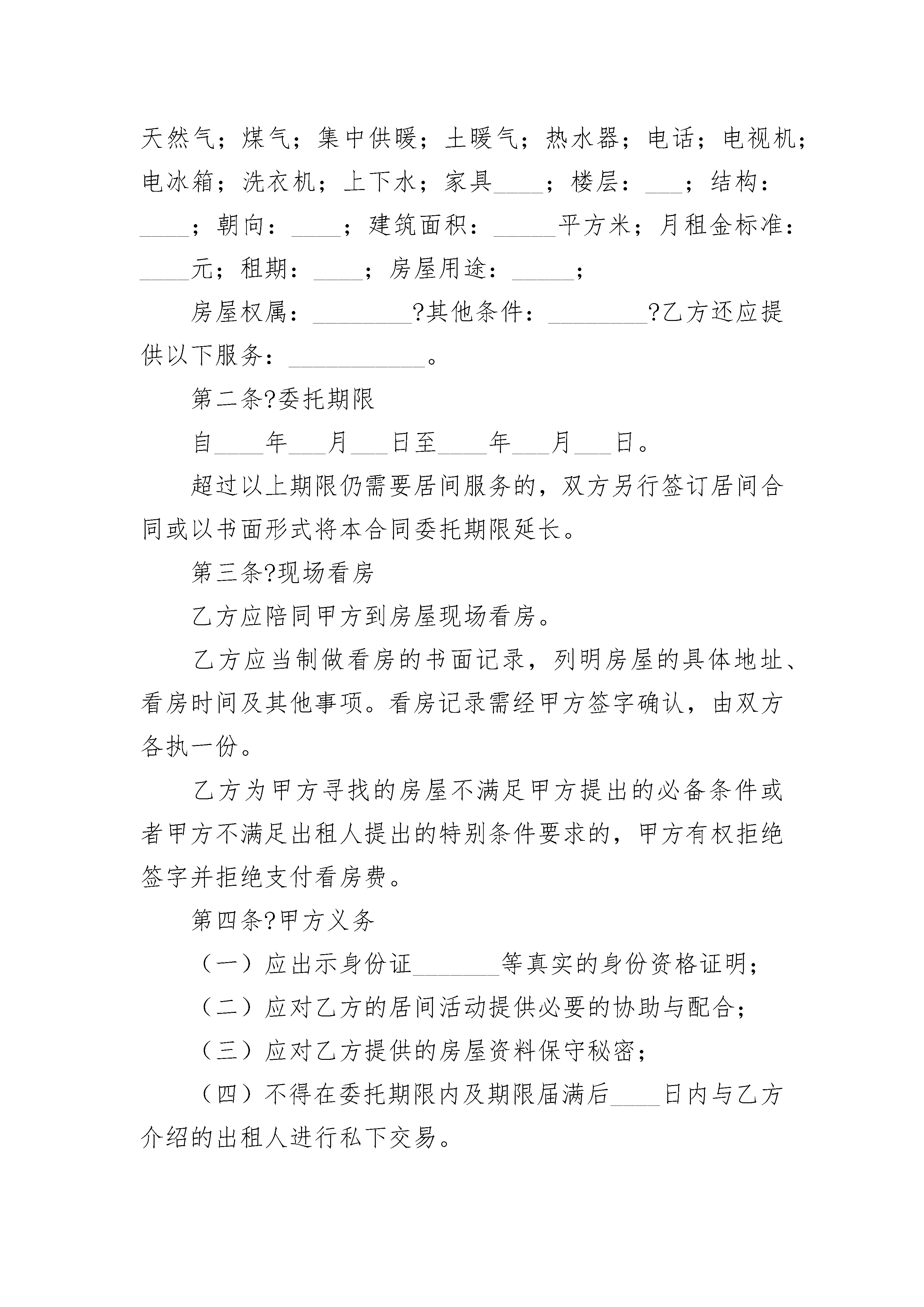 房屋承租居间合同房屋承租居间合同(精选20篇)房屋承租居间合同篇1委托人(承租方):_______居间人:__________双方经协商一致,就委托事宜达成如下协议:一、委托事项委托人授权居间人办理承租房屋____套的各项事宜。二、委托人承租房屋的具体要求1、地段:________2、面积:________3、套型:___4、结构:______5、朝向:______6、楼层:______7、装潢:______8、家具:______三、希望租金及支付方式1、希望承租房租金应在____元至____元之间。2、租金的支付方式:□季付□半年付□年付;3、可接受承租押金____元。四、居间期限:自__年__月__日起至__年__月__日止。五、服务报酬及支付方式:经居间人努力,促成《租赁合同》成立的,委托人自愿支付与首月租金50%相等的酬金,作为报酬,并在签订《租赁合同》时一次性支付。六、违约责任:委托人如在本合同存续期间或委托人单方解除合同后,私自与居间人的客户达成交易者,视为违约,委托人须在居间人支付相当于承租该不动产首月的租金,作为违约金。七、注意事项:委托人预交定金后,经居间人通知,如不按居间人的通知前往约定地点签订《租赁合同》者,则所交定金不予退还。委托人(签章):________居间人:_______________身份证号:____________店长签字:___________联系方式:____________联系电话:___________经办人:____________签署日期:__年__月__日房屋承租居间合同篇2编号:本合同当事人委托人(甲方):居间人(乙方):依据《_____》及相关法律法规的规定,委托人与居间人在平等、自愿的基础上,就房屋租赁居间的有关事宜达成协议如下:第一条?委托事项甲方委托乙方在委托期限内为其居间寻找符合以下条件的房屋(必备条件请在方格内划钩,参考条件请划圈,未选条件请划斜线),并协助促成其与出租人签订房屋租赁合同:坐落:____;楼房为___室___厅___卫;平房为___间;无装修;一般装修;精装修;防盗门;有线电视接口;空调;天然气;煤气;集中供暖;土暖气;热水器;电话;电视机;电冰箱;洗衣机;上下水;家具____;楼层:___;结构:____;朝向:____;建筑面积:_____平方米;月租金标准:____元;租期:____;房屋用途:_____;房屋权属:________?其他条件:________?乙方还应提供以下服务:___________。第二条?委托期限自____年___月___日至____年___月___日。超过以上期限仍需要居间服务的,双方另行签订居间合同或以书面形式将本合同委托期限延长。第三条?现场看房乙方应陪同甲方到房屋现场看房。乙方应当制做看房的书面记录,列明房屋的具体地址、看房时间及其他事项。看房记录需经甲方签字确认,由双方各执一份。乙方为甲方寻找的房屋不满足甲方提出的必备条件或者甲方不满足出租人提出的特别条件要求的,甲方有权拒绝签字并拒绝支付看房费。第四条?甲方义务(一)应出示身份证_______等真实的身份资格证明;(二)应对乙方的居间活动提供必要的协助与配合;(三)应对乙方提供的房屋资料保守秘密;(四)不得在委托期限内及期限届满后____日内与乙方介绍的出租人进行私下交易。第五条?乙方义务(一)应出示营业执照、房地产经纪机构资质证书等合法的经营资格证明;(二)应尽力完成甲方的委托事项,按照本合同第一条甲方提出的条件为甲方寻找房屋,将处理情况及时向甲方如实汇报,为甲方看房和与出租人签订房屋租赁合同提供联络、协助、撮合等服务,并促成甲方与出租人的房屋租赁合同成立;(三)应保证为甲方提供的房屋资料已经事先核实,并且甲方满足出租人提出的特别条件要求;(四)不得提供虚假信息、隐瞒重要事实或与他人恶意串通,损害甲方利益;(五)对甲方的经济情况、个人信息、商业秘密等保守秘密;(六)应保证为甲方介绍的出租人具有房屋所有权证书或对出租房屋依法享有出租权利的其他证明及身份证、营业执照等身份资格证明;保证出租房屋产权明晰,不存在所有权纠纷或者其他权利纠纷;(七)收取看房费、佣金、居间活动费用的,应向甲方开具合法、规范的_____票据;(八)本合同签订后,乙方不得以任何形式向甲方收取任何名目的预_____用。第六条?委托事项的完成“完成委托事项”是指完成本合同第一条所列全部委托事项。甲方与出租人未签订书面租赁合同,乙方仅为甲方提供信息,或为甲方看房并与出租人签订房屋租赁合同提供联络、协助、撮合等服务的,均视为委托事项未完成。第七条?费用与佣金(一)看房费看房费是指乙方陪同甲方到房屋现场看房实际发生的费用。看房费用由甲方承担。看房费用为:每次____元。甲方可以一次_____