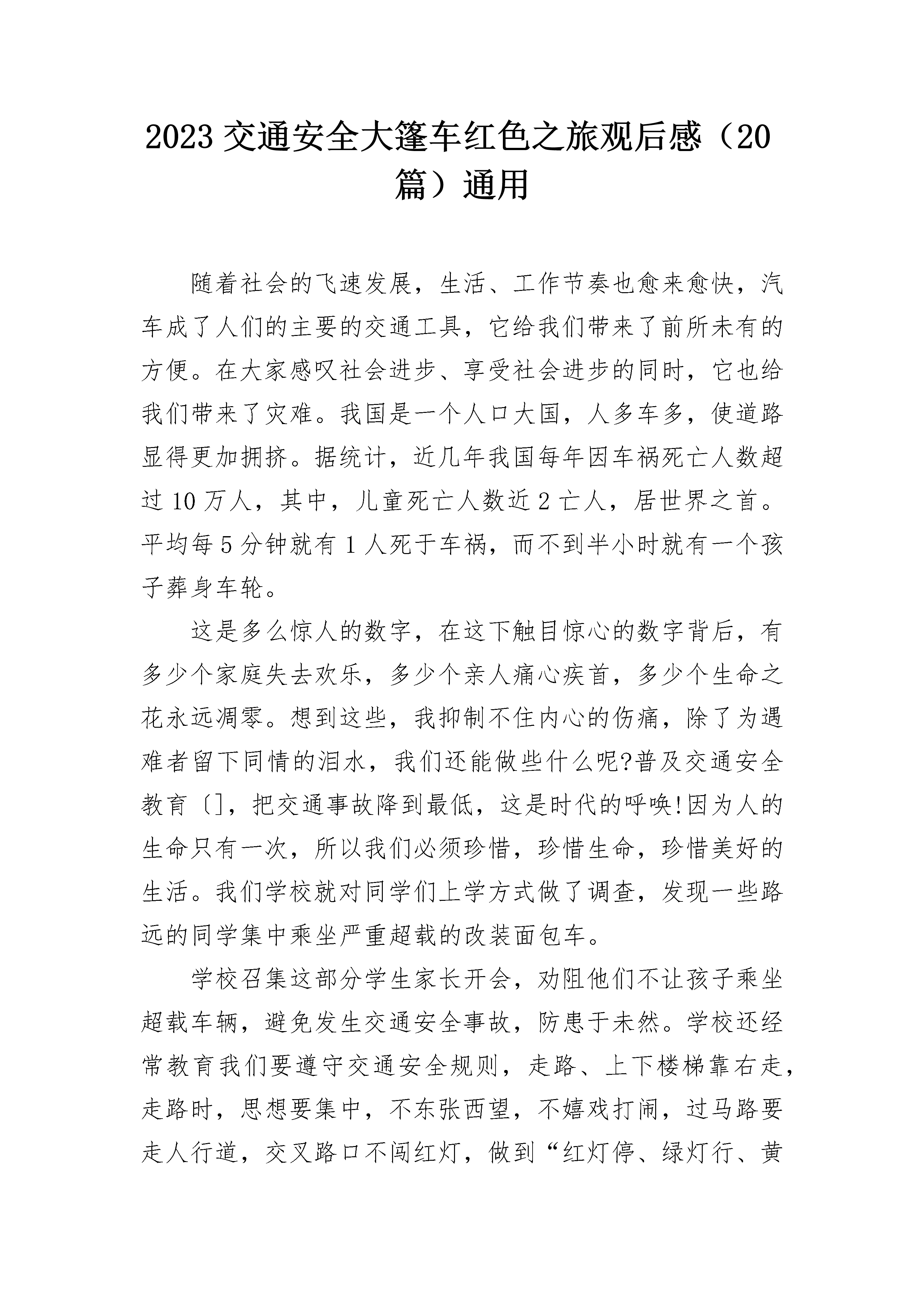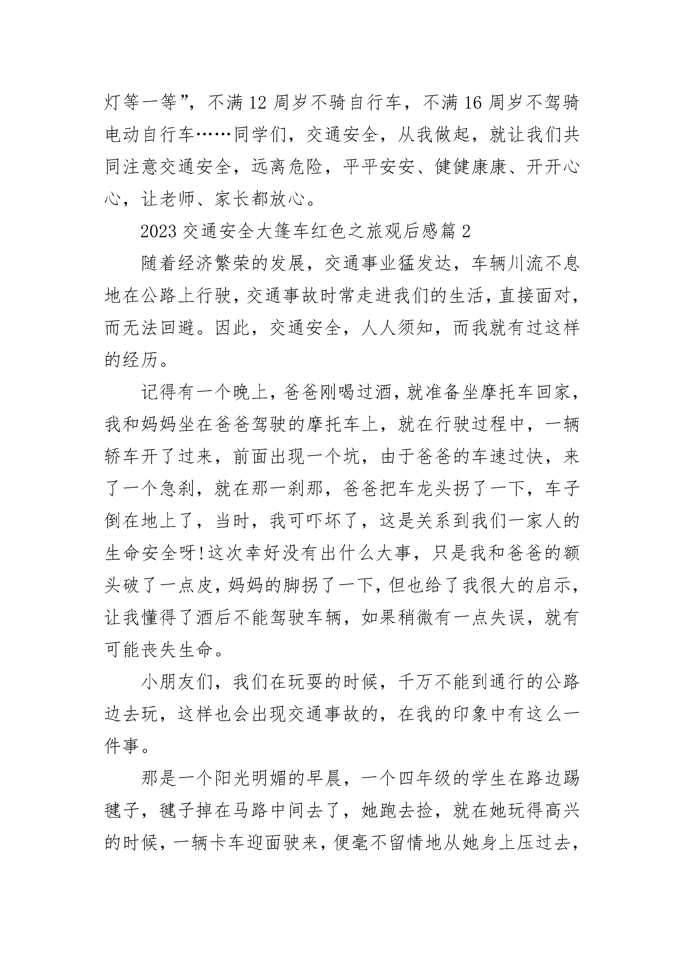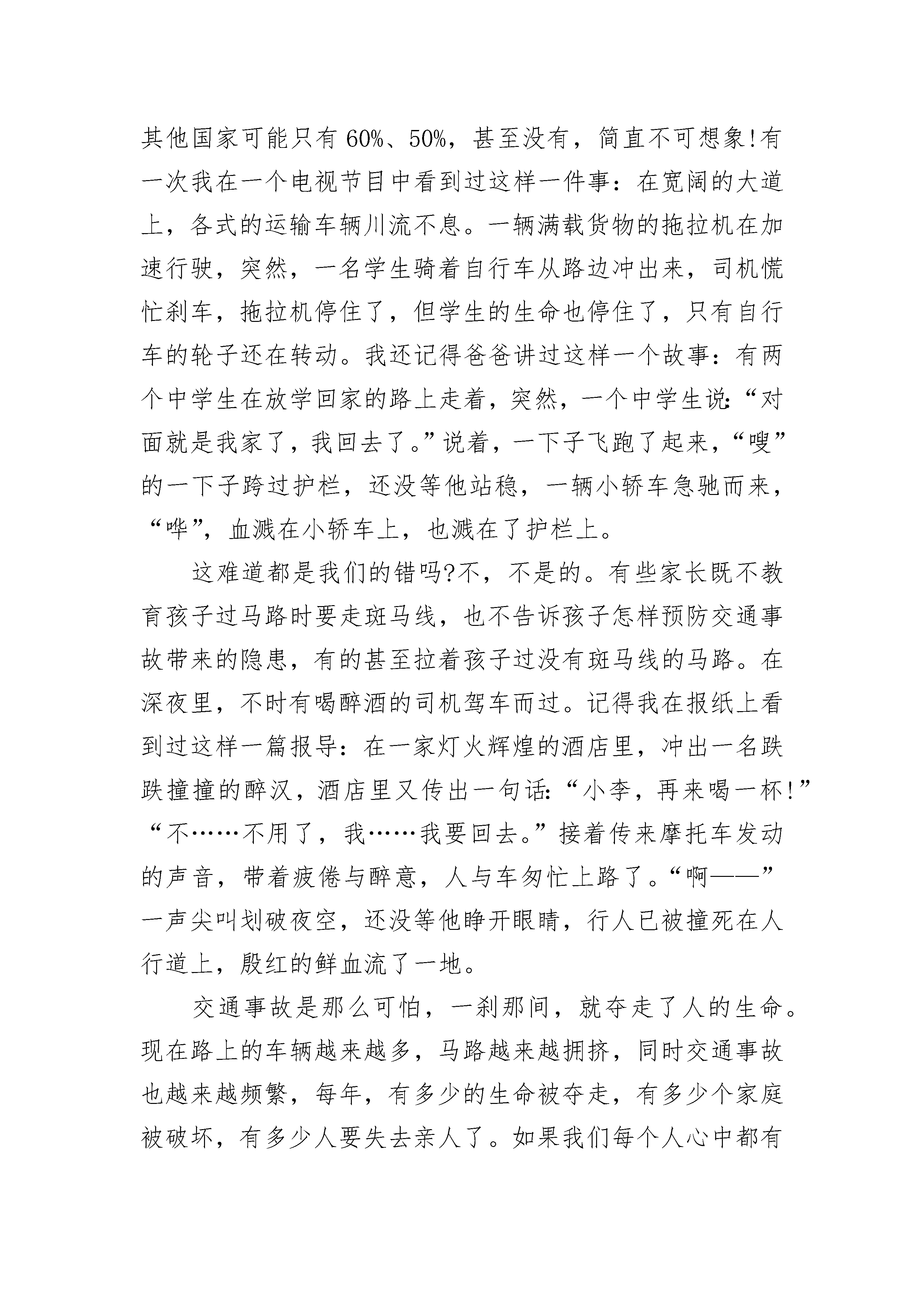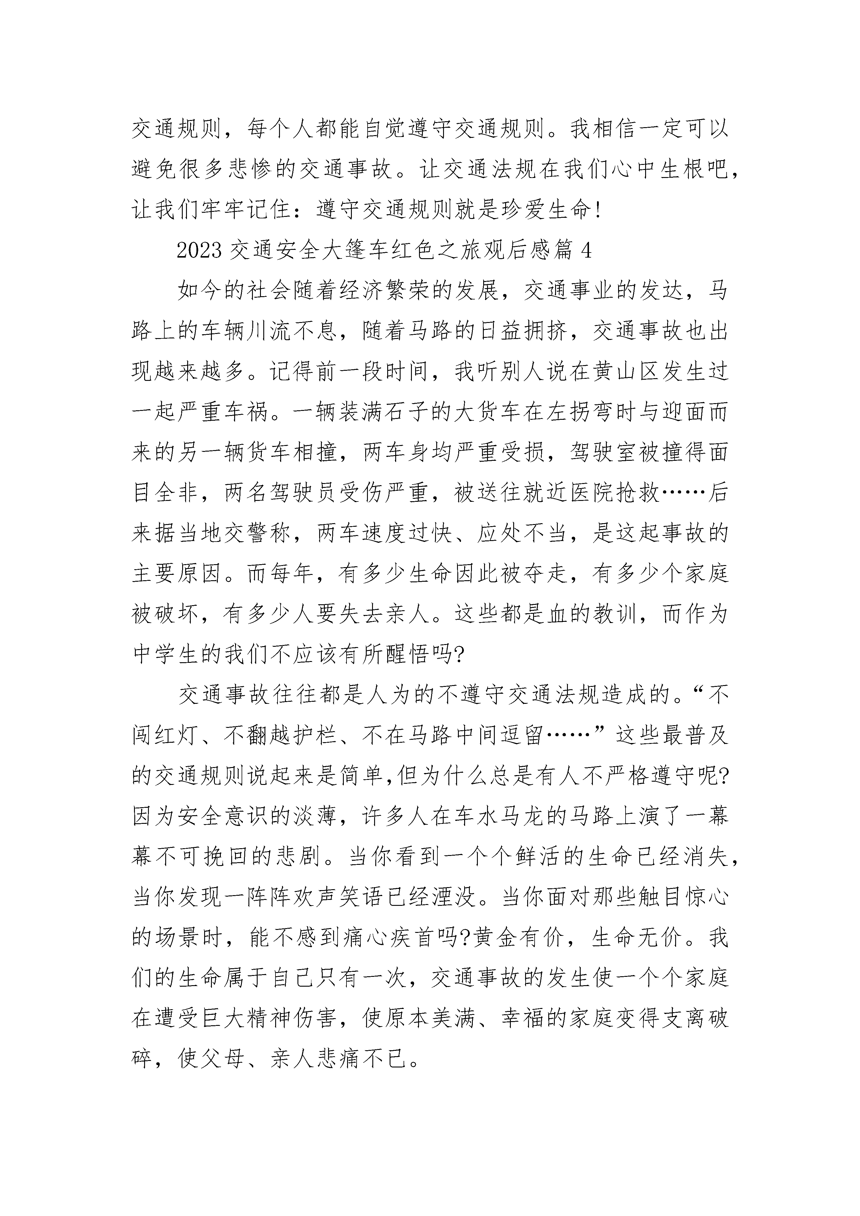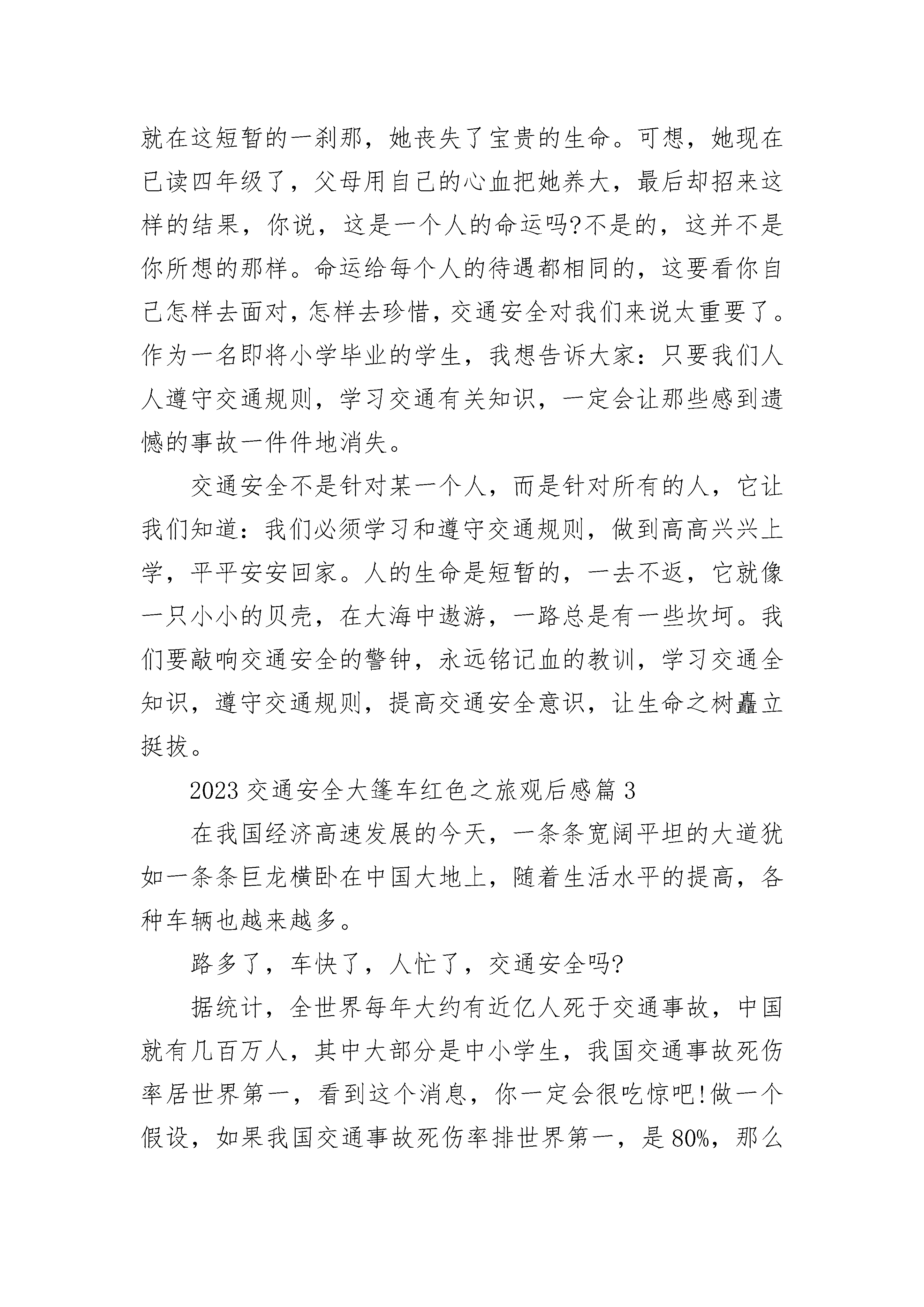 2023交通安全大篷车红色之旅观后感(20篇)通用随着社会的飞速发展,生活、工作节奏也愈来愈快,汽车成了人们的主要的交通工具,它给我们带来了前所未有的方便。在大家感叹社会进步、享受社会进步的同时,它也给我们带来了灾难。我国是一个人口大国,人多车多,使道路显得更加拥挤。据统计,近几年我国每年因车祸死亡人数超过10万人,其中,儿童死亡人数近2亡人,居世界之首。平均每5分钟就有1人死于车祸,而不到半小时就有一个孩子葬身车轮。这是多么惊人的数字,在这下触目惊心的数字背后,有多少个家庭失去欢乐,多少个亲人痛心疾首,多少个生命之花永远凋零。想到这些,我抑制不住内心的伤痛,除了为遇难者留下同情的泪水,我们还能做些什么呢?普及交通安全教育〔],把交通事故降到最低,这是时代的呼唤!因为人的生命只有一次,所以我们必须珍惜,珍惜生命,珍惜美好的生活。我们学校就对同学们上学方式做了调查,发现一些路远的同学集中乘坐严重超载的改装面包车。学校召集这部分学生家长开会,劝阻他们不让孩子乘坐超载车辆,避免发生交通安全事故,防患于未然。学校还经常教育我们要遵守交通安全规则,走路、上下楼梯靠右走,走路时,思想要集中,不东张西望,不嬉戏打闹,过马路要走人行道,交叉路口不闯红灯,做到“红灯停、绿灯行、黄灯等一等”,不满12周岁不骑自行车,不满16周岁不驾骑电动自行车……同学们,交通安全,从我做起,就让我们共同注意交通安全,远离危险,平平安安、健健康康、开开心心,让老师、家长都放心。2023交通安全大篷车红色之旅观后感篇2随着经济繁荣的发展,交通事业猛发达,车辆川流不息地在公路上行驶,交通事故时常走进我们的生活,直接面对,而无法回避。因此,交通安全,人人须知,而我就有过这样的经历。记得有一个晚上,爸爸刚喝过酒,就准备坐摩托车回家,我和妈妈坐在爸爸驾驶的摩托车上,就在行驶过程中,一辆轿车开了过来,前面出现一个坑,由于爸爸的车速过快,来了一个急刹,就在那一刹那,爸爸把车龙头拐了一下,车子倒在地上了,当时,我可吓坏了,这是关系到我们一家人的生命安全呀!这次幸好没有出什么大事,只是我和爸爸的额头破了一点皮,妈妈的脚拐了一下,但也给了我很大的启示,让我懂得了酒后不能驾驶车辆,如果稍微有一点失误,就有可能丧失生命。小朋友们,我们在玩耍的时候,千万不能到通行的公路边去玩,这样也会出现交通事故的,在我的印象中有这么一件事。那是一个阳光明媚的早晨,一个四年级的学生在路边踢毽子,毽子掉在马路中间去了,她跑去捡,就在她玩得高兴的时候,一辆卡车迎面驶来,便毫不留情地从她身上压过去,就在这短暂的一刹那,她丧失了宝贵的生命。可想,她现在已读四年级了,父母用自己的心血把她养大,最后却招来这样的结果,你说,这是一个人的命运吗?不是的,这并不是你所想的那样。命运给每个人的待遇都相同的,这要看你自己怎样去面对,怎样去珍惜,交通安全对我们来说太重要了。作为一名即将小学毕业的学生,我想告诉大家:只要我们人人遵守交通规则,学习交通有关知识,一定会让那些感到遗憾的事故一件件地消失。交通安全不是针对某一个人,而是针对所有的人,它让我们知道:我们必须学习和遵守交通规则,做到高高兴兴上学,平平安安回家。人的生命是短暂的,一去不返,它就像一只小小的贝壳,在大海中遨游,一路总是有一些坎坷。我们要敲响交通安全的警钟,永远铭记血的教训,学习交通全知识,遵守交通规则,提高交通安全意识,让生命之树矗立挺拔。2023交通安全大篷车红色之旅观后感篇3在我国经济高速发展的今天,一条条宽阔平坦的大道犹如一条条巨龙横卧在中国大地上,随着生活水平的提高,各种车辆也越来越多。路多了,车快了,人忙了,交通安全吗?据统计,全世界每年大约有近亿人死于交通事故,中国就有几百万人,其中大部分是中小学生,我国交通事故死伤率居世界第一,看到这个消息,你一定会很吃惊吧!做一个假设,如果我国交通事故死伤率排世界第一,是80%,那么其他国家可能只有60%、50%,甚至没有,简直不可想象!有一次我在一个电视节目中看到过这样一件事:在宽阔的大道上,各式的运输车辆川流不息。一辆满载货物的拖拉机在加速行驶,突然,一名学生骑着自行车从路边冲出来,司机慌忙刹车,拖拉机停住了,但学生的生命也停住了,只有自行车的轮子还在转动。我还记得爸爸讲过这样一个故事:有两个中学生在放学回家的路上走着,突然,一个中学生说:“对面就是我家了,我回去了。”说着,一下子飞跑了起来,“嗖”的一下子跨过护栏,还没等他站稳,一辆小轿车急驰而来,“哗”,血溅在小轿车上,也溅在了护栏上。这难道都是我们的错吗?不,不是的。有些家长既不教育孩子过马路时要走斑马线,也不告诉孩子怎样预防交通事故带来的隐患,有的甚至拉着孩子过没有斑马线的马路。在深夜里,不时有喝醉酒的司机驾车而过。记得我在报纸上看到过这样一篇报导: