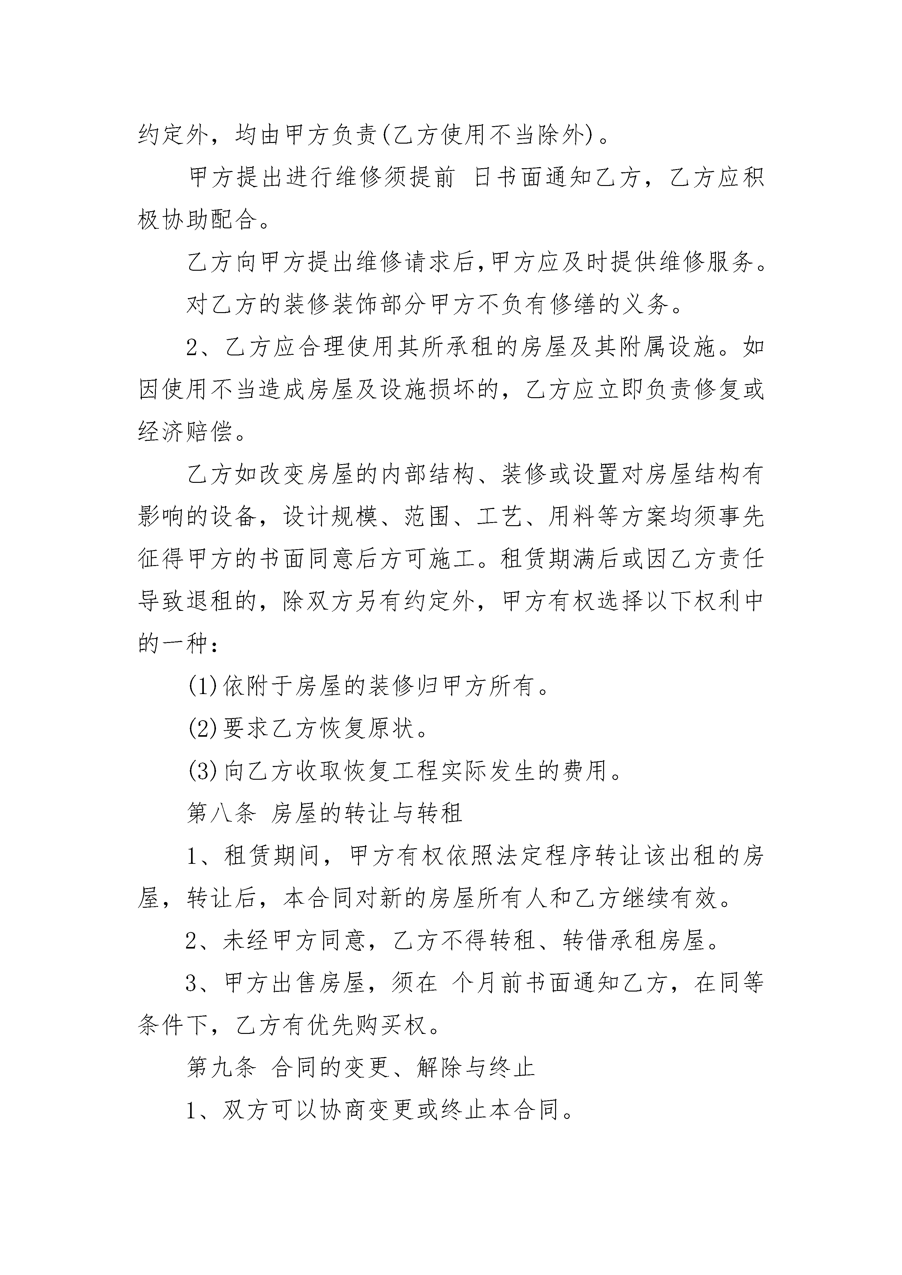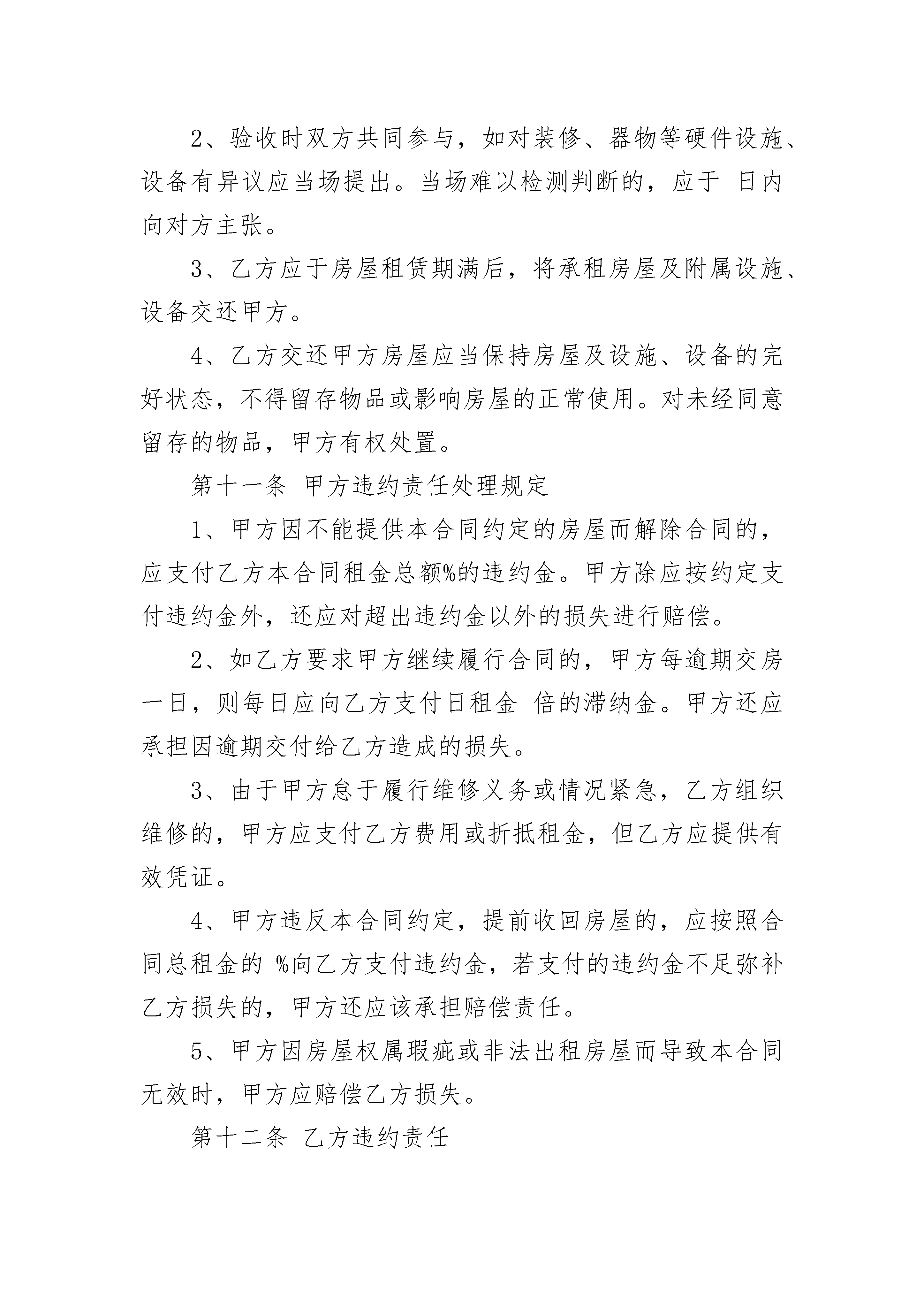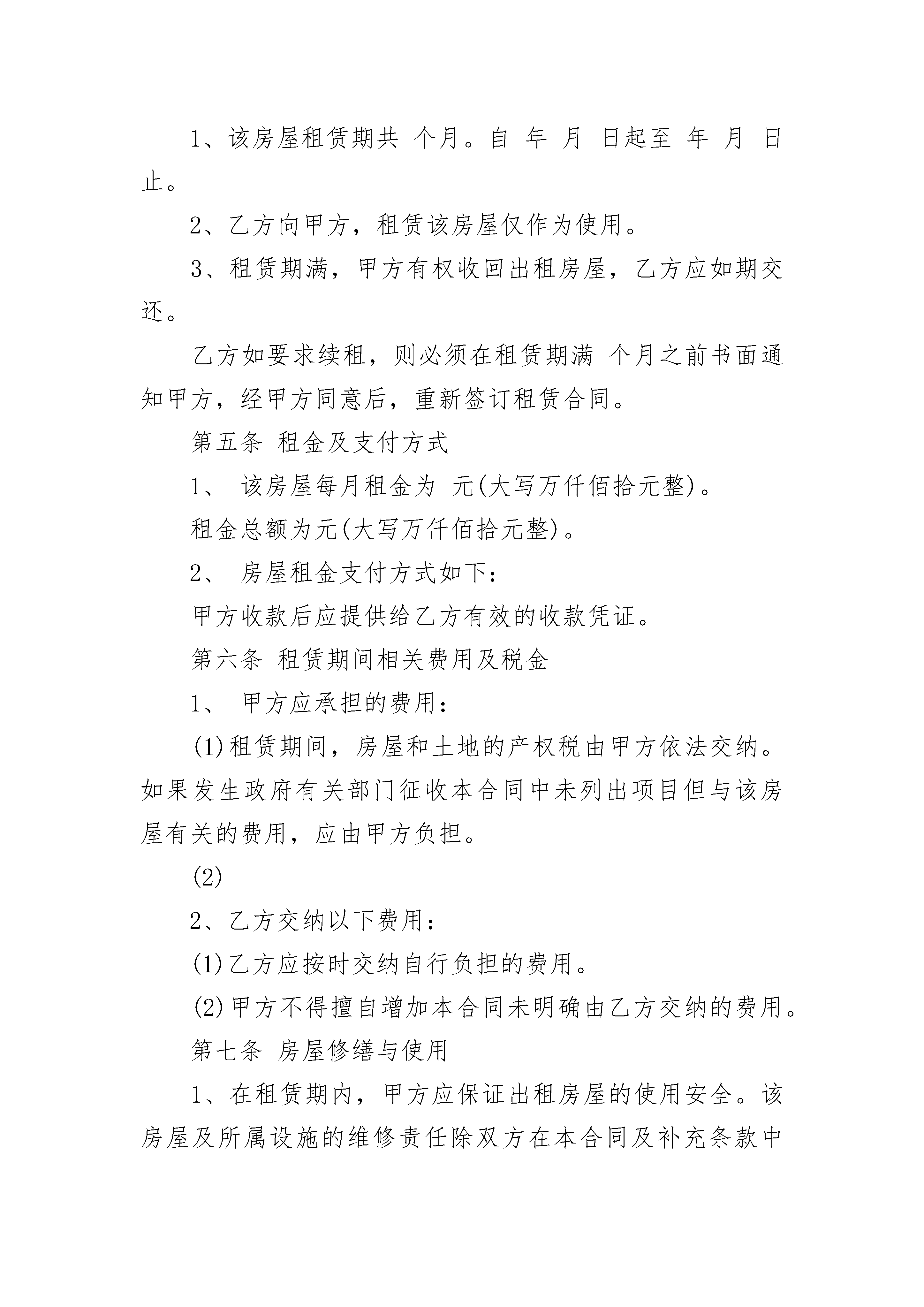 房屋租房合同房屋租房合同(通用24篇)房屋租房合同篇1编号:甲方:(出租人)乙方:(承租人)双方经友好协商,根据《合同法》及国家、当地政府对房屋租赁的有关规定,就租赁房屋一事达成以下协议。第一部分房屋概况第一条甲方保证向乙方出租的房屋系(本人,共有)拥有完全所有权和使用权,设有房屋它项权利有(如果房屋是共有,则还应增加:已经共有人同意,附书面同意声明。如果是委托租赁,应有房屋所有权人与受托人的委托协议书)第二条房屋法律概况1、房屋所有权证书登记人:,身份证号码:;2、房屋所有权证书编号:;3、土地使用权证书编号:;4、房屋所有权证书上登记的房屋建筑面积:;5、房屋的使用面积:6、房屋的附属建筑物和归房屋所有权人使用的设施:第三条出租房屋概况(包括从落地址、名称、用途、间数、建筑面积、使用面积、地面、墙壁质量、家具设备等)第四条租赁期限、用途1、该房屋租赁期共个月。自年月日起至年月日止。2、乙方向甲方,租赁该房屋仅作为使用。3、租赁期满,甲方有权收回出租房屋,乙方应如期交还。乙方如要求续租,则必须在租赁期满个月之前书面通知甲方,经甲方同意后,重新签订租赁合同。第五条租金及支付方式1、该房屋每月租金为元(大写万仟佰拾元整)。租金总额为元(大写万仟佰拾元整)。2、房屋租金支付方式如下:甲方收款后应提供给乙方有效的收款凭证。第六条租赁期间相关费用及税金1、甲方应承担的费用:(1)租赁期间,房屋和土地的产权税由甲方依法交纳。如果发生政府有关部门征收本合同中未列出项目但与该房屋有关的费用,应由甲方负担。(2)2、乙方交纳以下费用:(1)乙方应按时交纳自行负担的费用。(2)甲方不得擅自增加本合同未明确由乙方交纳的费用。第七条房屋修缮与使用1、在租赁期内,甲方应保证出租房屋的使用安全。该房屋及所属设施的维修责任除双方在本合同及补充条款中约定外,均由甲方负责(乙方使用不当除外)。甲方提出进行维修须提前日书面通知乙方,乙方应积极协助配合。乙方向甲方提出维修请求后,甲方应及时提供维修服务。对乙方的装修装饰部分甲方不负有修缮的义务。2、乙方应合理使用其所承租的房屋及其附属设施。如因使用不当造成房屋及设施损坏的,乙方应立即负责修复或经济赔偿。乙方如改变房屋的内部结构、装修或设置对房屋结构有影响的设备,设计规模、范围、工艺、用料等方案均须事先征得甲方的书面同意后方可施工。租赁期满后或因乙方责任导致退租的,除双方另有约定外,甲方有权选择以下权利中的一种:(1)依附于房屋的装修归甲方所有。(2)要求乙方恢复原状。(3)向乙方收取恢复工程实际发生的费用。第八条房屋的转让与转租1、租赁期间,甲方有权依照法定程序转让该出租的房屋,转让后,本合同对新的房屋所有人和乙方继续有效。2、未经甲方同意,乙方不得转租、转借承租房屋。3、甲方出售房屋,须在个月前书面通知乙方,在同等条件下,乙方有优先购买权。第九条合同的变更、解除与终止1、双方可以协商变更或终止本合同。2、甲方有以下行为之一的,乙方有权解除合同:(1)不能提供房屋或所提供房屋不符合约定条件,严重影响居住。(2)甲方未尽房屋修缮义务,严重影响居住的。3、房屋租赁期间,乙方有下列行为之一的,甲方有权解除合同,收回出租房屋;(1)未经甲方书面同意,转租、转借承租房屋。(2)未经甲方书面同意,拆改变动房屋结构。(3)损坏承租房屋,在甲方提出的合理期限内仍未修复的。(4)未经甲方书面同意,改变本合同约定的房屋租赁用途。(5)利用承租房屋存放危险物品或进行违法活动。(6)逾期未交纳按约定应当由乙方交纳的各项费用,已经给甲方造成严重损害的。(7)拖欠房租累计个月以上。4、租赁期满前,乙方要继续租赁的,应当在租赁期满个月前书面通知甲方。如甲方在租期届满后仍要对外出租的,在同等条件下,乙方享有优先承租权。5、租赁期满合同自然终止。6、因不可抗力因素导致合同无法履行的,合同终止。第十条房屋交付及收回的验收1、甲方应保证租赁房屋本身及附属设施、设备处于能够正常使用状态。2、验收时双方共同参与,如对装修、器物等硬件设施、设备有异议应当场提出。当场难以检测判断的,应于日内向对方主张。3、乙方应于房屋租赁期满后,将承租房屋及附属设施、设备交还甲方。4、乙方交还甲方房屋应当保持房屋及设施、设备的完好状态,不得留存物品或影响房屋的正常使用。对未经同意留存的物品,甲方有权处置。第十一条甲方违约责任处理规定1、甲方因不能提供本合同约定的房屋而解除合同的,应支付乙方本合同租金总额%的违约金。甲方除应按约定支付违约金外,还应对超出违约金以外的损失进行赔偿。2、如乙方要求甲方继续履行合同的,甲方每逾期交房一日,则每日应向乙方支付日租金倍的滞纳金。甲方还应承担因逾期交付给乙方造成的损失。3、由于甲方怠于履行维修义务或情况紧急,乙方组织维修的,甲方应支付