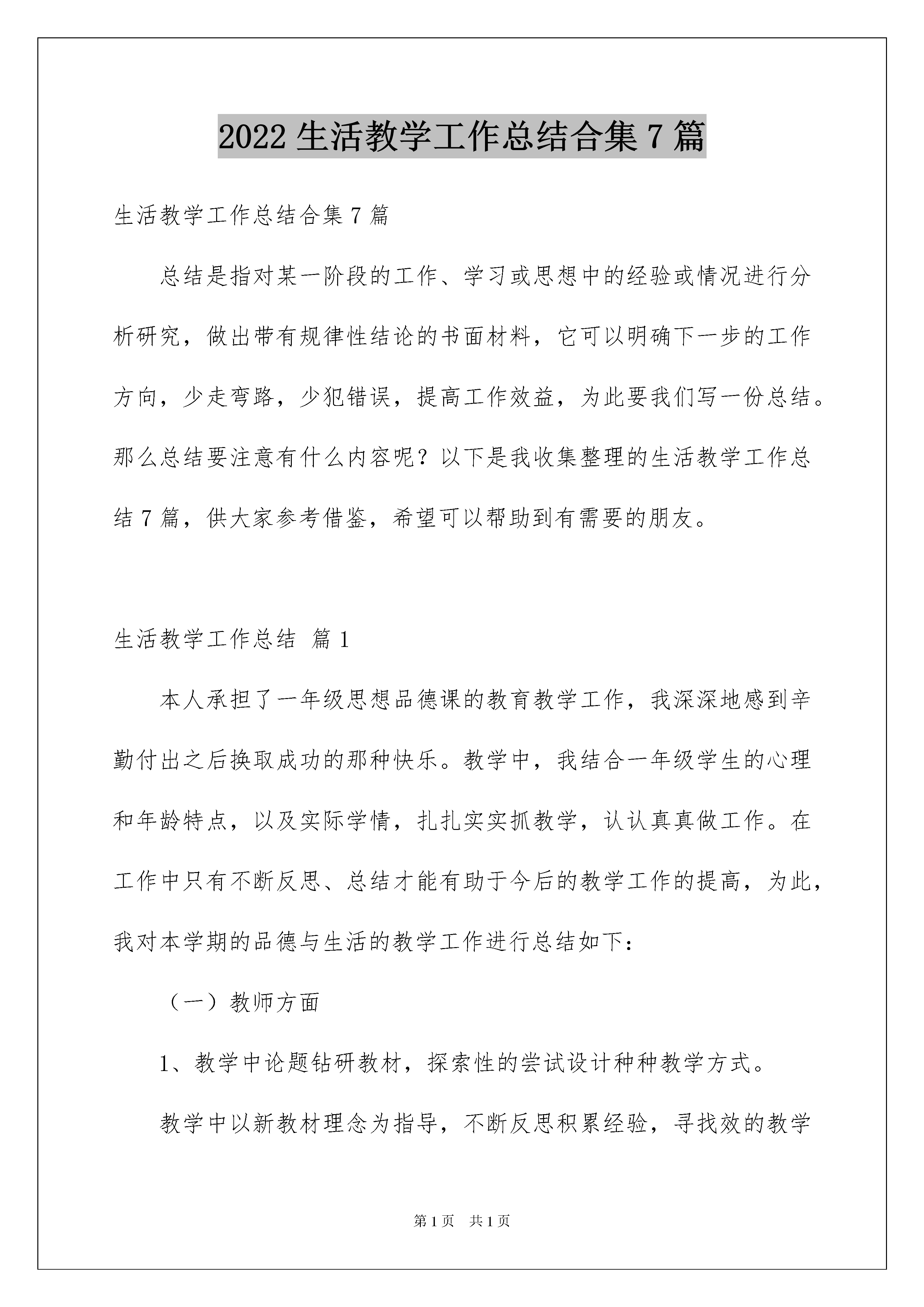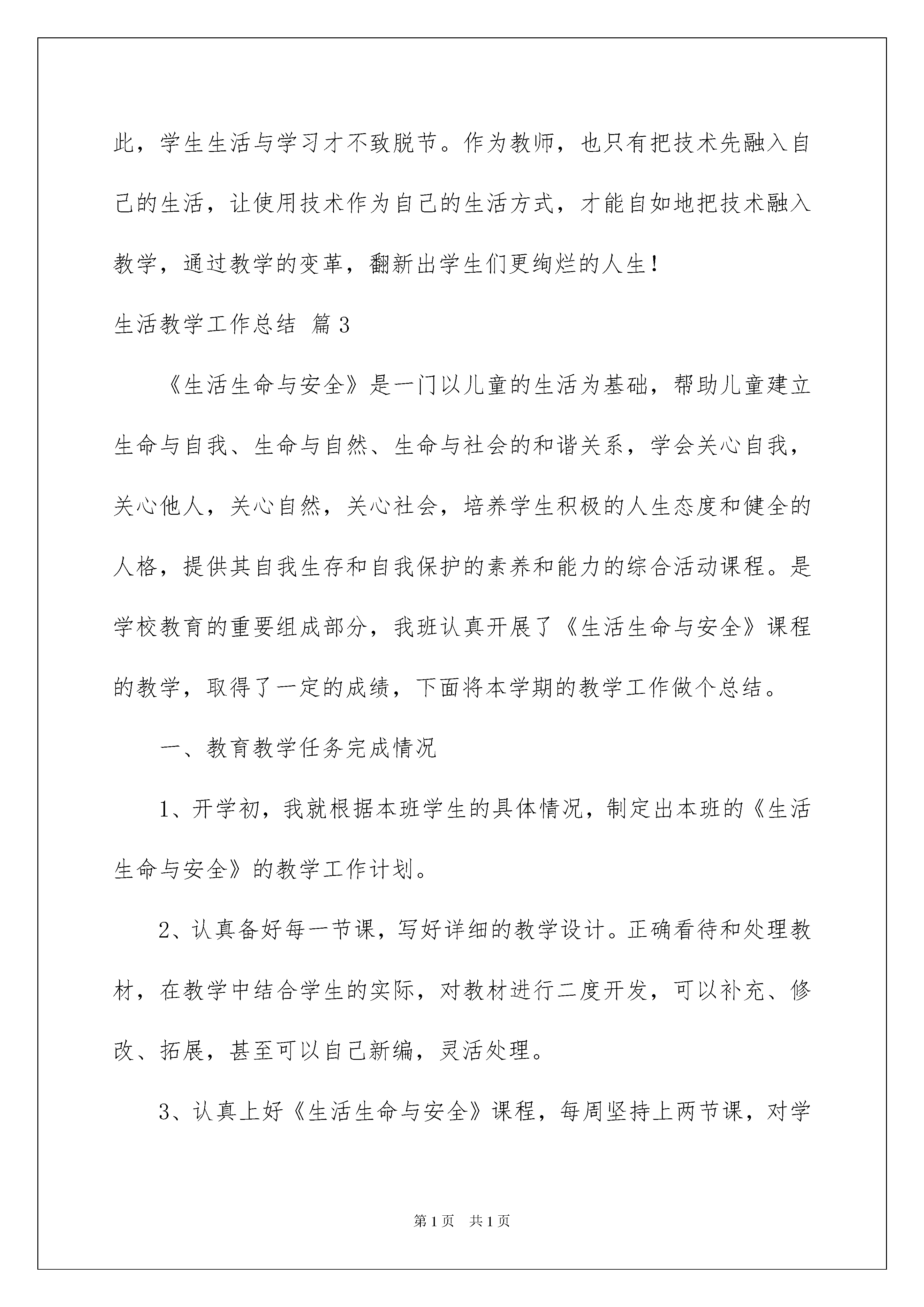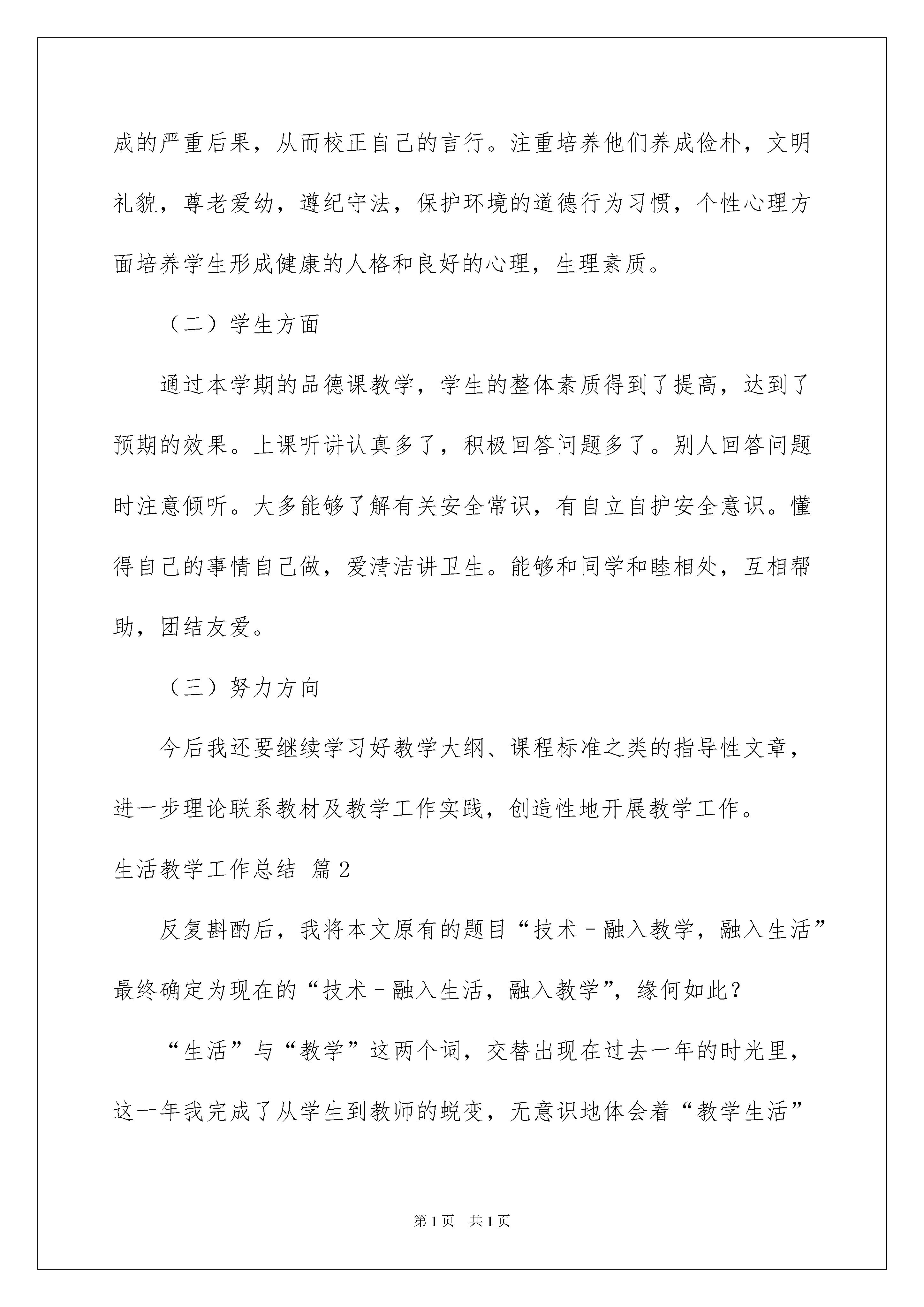 2022生活教学工作总结合集7篇生活教学工作总结合集7篇总结是指对某一阶段的工作、学习或思想中的经验或情况进行分析研究,做出带有规律性结论的书面材料,它可以明确下一步的工作方向,少走弯路,少犯错误,提高工作效益,为此要我们写一份总结。那么总结要注意有什么内容呢?以下是我收集整理的生活教学工作总结7篇,供大家参考借鉴,希望可以帮助到有需要的朋友。生活教学工作总结篇1本人承担了一年级思想品德课的教育教学工作,我深深地感到辛勤付出之后换取成功的那种快乐。教学中,我结合一年级学生的心理和年龄特点,以及实际学情,扎扎实实抓教学,认认真真做工作。在工作中只有不断反思、总结才能有助于今后的教学工作的提高,为此,我对本学期的品德与生活的教学工作进行总结如下:(一)教师方面1、教学中论题钻研教材,探索性的尝试设计种种教学方式。教学中以新教材理念为指导,不断反思积累经验,寻找效的教学途径。所任科目学生积极主动的学习,成绩良好,提高了学生的整体素质。2、教学中把思品与生活课的教学同学生日常生活紧密联系起来。在教学中帮助学生掌握正确的是非评价标准,懂得何谓善、恶、美、丑,提高他们养成良好道德行为习惯的自觉性和安全意识,形成健康的人格和良好的心理,生理素质。本学期的品德与生活,教学目标是初步培养学生形成良好的生活、劳动习惯;教育学生遵守纪律,养成基本的文明行为;保护环境,爱惜资源;使学生初步了解了一些生活中最常见的自然、社会常识;掌握了一些自己生活中需要的基本知识和劳动技能。3、在教学活动的每一个环节我注意把握儿童的实际情况,根据课程标准的各项规定制定教学计划和教案。在教学中要帮助儿童展开活动。儿童的品德和行为习惯的形成、知识和能力的发展、经验的积累是一个连续的过程。因此,教学活动中我注意活动之间的连续性,帮助儿童获得彼此联系的、不断深化的经验和体验。4、在课堂上,关注言行不良表现的学生。平时及时调动班级和教师的力量帮助他们认识错误,认识错误造成的严重后果,从而校正自己的言行。注重培养他们养成俭朴,文明礼貌,尊老爱幼,遵纪守法,保护环境的道德行为习惯,个性心理方面培养学生形成健康的人格和良好的心理,生理素质。(二)学生方面通过本学期的品德课教学,学生的整体素质得到了提高,达到了预期的效果。上课听讲认真多了,积极回答问题多了。别人回答问题时注意倾听。大多能够了解有关安全常识,有自立自护安全意识。懂得自己的事情自己做,爱清洁讲卫生。能够和同学和睦相处,互相帮助,团结友爱。(三)努力方向今后我还要继续学习好教学大纲、课程标准之类的指导性文章,进一步理论联系教材及教学工作实践,创造性地开展教学工作。生活教学工作总结篇2反复斟酌后,我将本文原有的题目“技术–融入教学,融入生活”最终确定为现在的“技术–融入生活,融入教学”,缘何如此?“生活”与“教学”这两个词,交替出现在过去一年的时光里,这一年我完成了从学生到教师的蜕变,无意识地体会着“教学生活”与“生活教学”的细微区别,而本次的暑期培训恰恰给了我一个深入思考的机会,如丝线般将一年中的所感所悟串结成珠,着实给自己的成长送上一份珍贵的贺礼。作为年轻教师的我,在过去一年里经常以自己的“技术优势”为组内老师奉上绵薄之力,在互联网环境中长大,相比于老教师们,我似乎已经习惯了技术不断进步、资源不断拓展,对于Moocs、TED演讲、网易公开课、知乎等等这样的新鲜事物,从来不曾想过其背后蕴含着怎样的时代潮流,从来不曾意识到原来自己早已赶在风头浪尖。研修学习中这些熟悉名词的出现才让我豁然开朗,原来教研活动中出现的慕课、翻转课堂、微课等等教学技术、教学形式,早已是我生活中的一部分,是这三者的密切联系塑造了后技术时代的课堂,造就了我们这样一批来自“微星”的年轻人。技术,源于生活的需要,如果不是哪里会有“可汗学院”的备受推崇。技术,将教学不断翻新,“翻新”后的’教学范围更广、效率更高。而生活与教学的关系,陶行知先生的“生活即教育”、课程标准中“学习生活中的地理”无不告诉我们–教学为更好的生活服务。如今,生活中处处有技术的影子,教学自然也要顺应趋势,唯有此,学生生活与学习才不致脱节。作为教师,也只有把技术先融入自己的生活,让使用技术作为自己的生活方式,才能自如地把技术融入教学,通过教学的变革,翻新出学生们更绚烂的人生!生活教学工作总结篇3《生活生命与安全》是一门以儿童的生活为基础,帮助儿童建立生命与自我、生命与自然、生命与社会的和谐关系,学会关心自我,关心他人,关心自然,关心社会,培养学生积极的人生态度和健全的人格,提供其自我生存和自我保护的素养和能力的综合活动课程。是学校教育的重