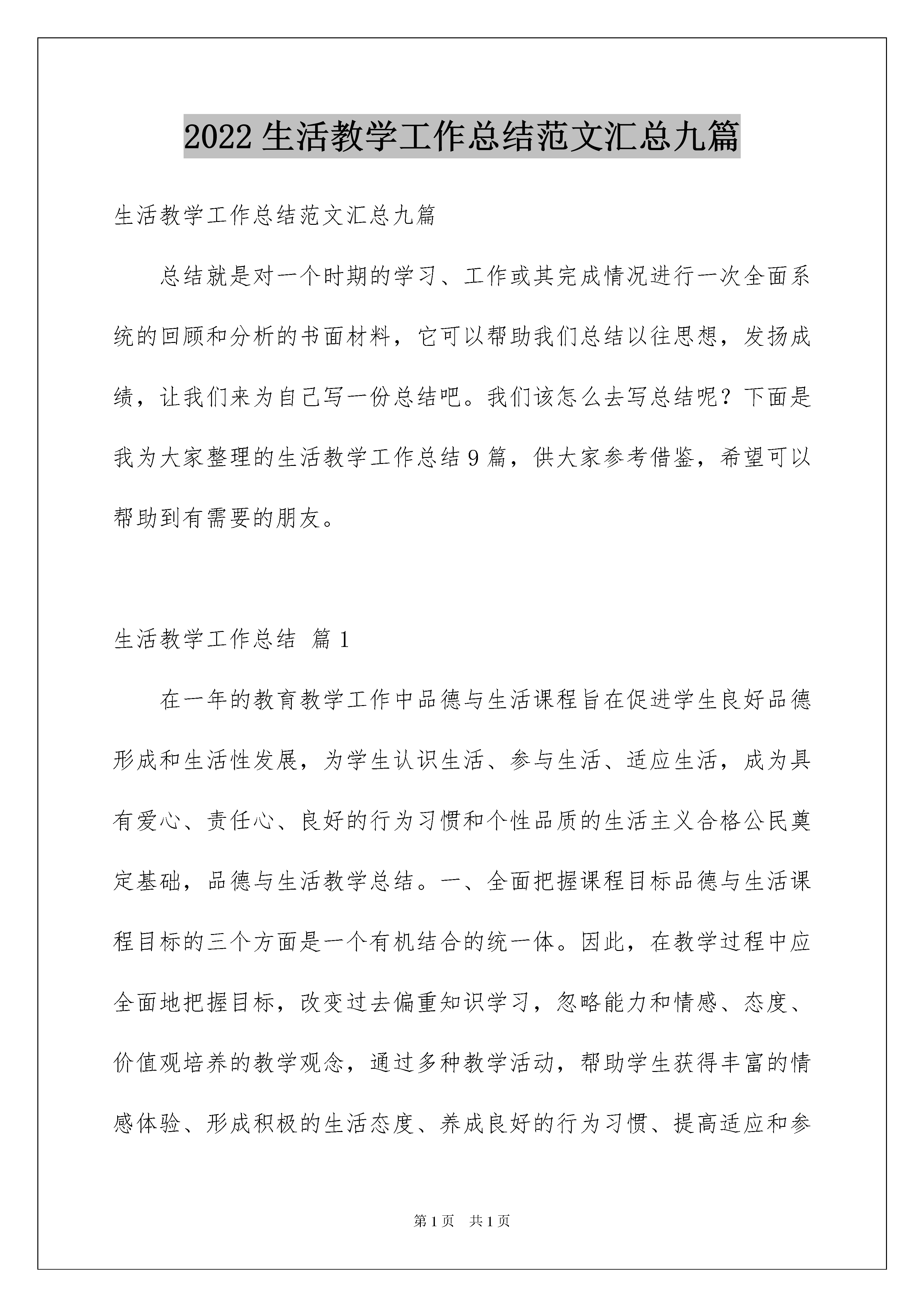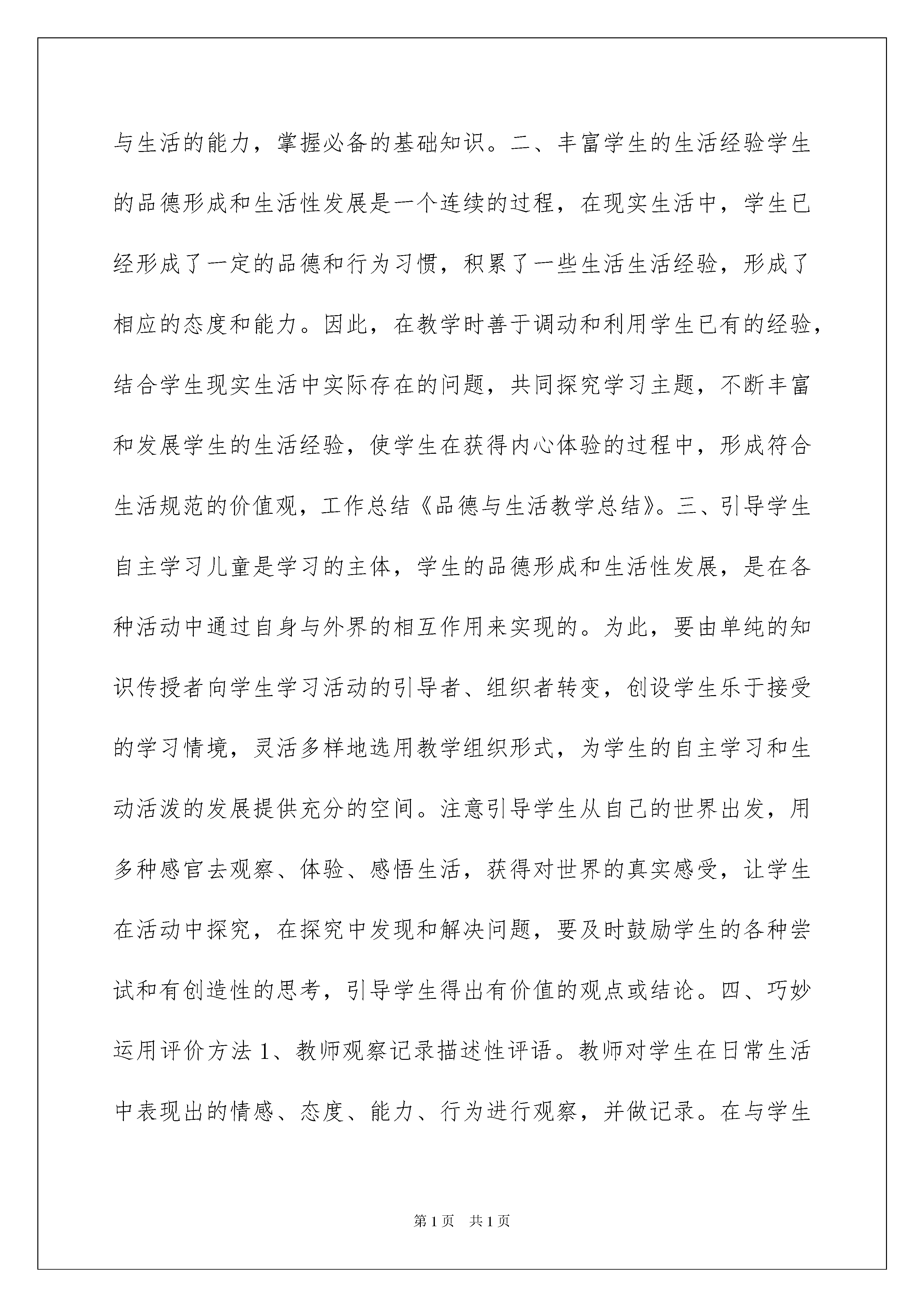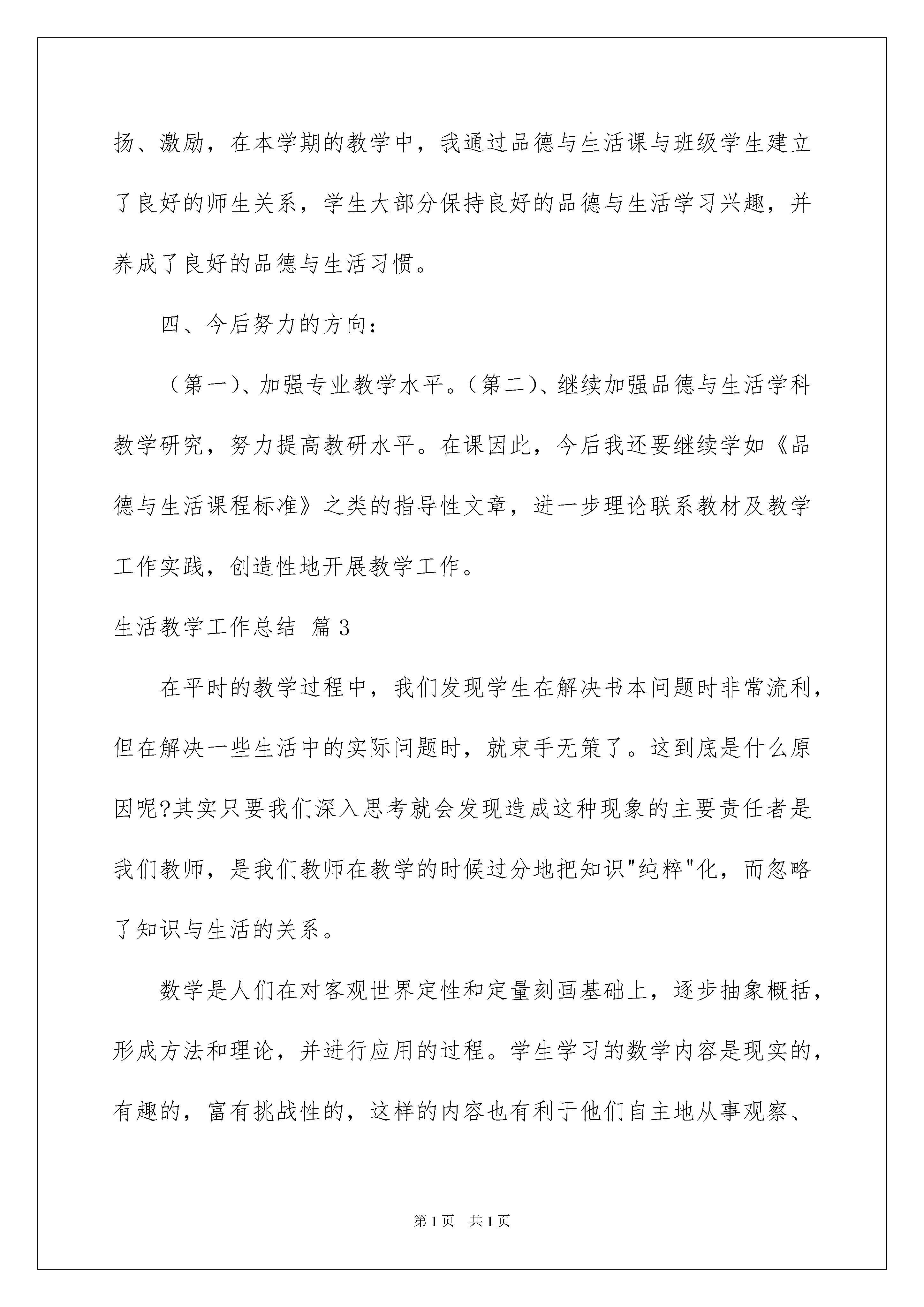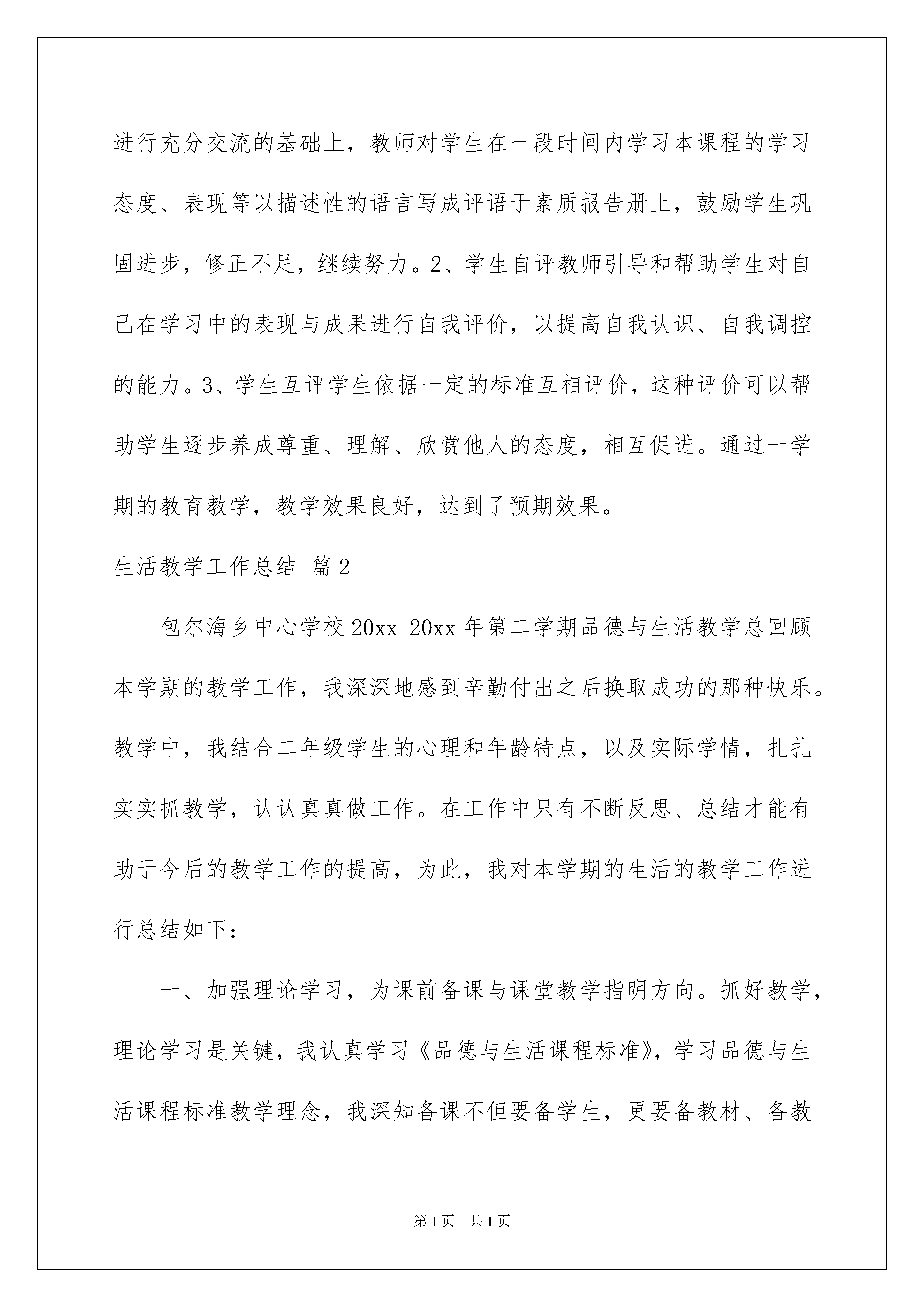 2022生活教学工作总结范文汇总九篇生活教学工作总结范文汇总九篇总结就是对一个时期的学习、工作或其完成情况进行一次全面系统的回顾和分析的书面材料,它可以帮助我们总结以往思想,发扬成绩,让我们来为自己写一份总结吧。我们该怎么去写总结呢?下面是我为大家整理的生活教学工作总结9篇,供大家参考借鉴,希望可以帮助到有需要的朋友。生活教学工作总结篇1在一年的教育教学工作中品德与生活课程旨在促进学生良好品德形成和生活性发展,为学生认识生活、参与生活、适应生活,成为具有爱心、责任心、良好的行为习惯和个性品质的生活主义合格公民奠定基础,品德与生活教学总结。一、全面把握课程目标品德与生活课程目标的三个方面是一个有机结合的统一体。因此,在教学过程中应全面地把握目标,改变过去偏重知识学习,忽略能力和情感、态度、价值观培养的教学观念,通过多种教学活动,帮助学生获得丰富的情感体验、形成积极的生活态度、养成良好的行为习惯、提高适应和参与生活的能力,掌握必备的基础知识。二、丰富学生的生活经验学生的品德形成和生活性发展是一个连续的过程,在现实生活中,学生已经形成了一定的品德和行为习惯,积累了一些生活生活经验,形成了相应的态度和能力。因此,在教学时善于调动和利用学生已有的经验,结合学生现实生活中实际存在的问题,共同探究学习主题,不断丰富和发展学生的生活经验,使学生在获得内心体验的过程中,形成符合生活规范的价值观,工作总结《品德与生活教学总结》。三、引导学生自主学习儿童是学习的主体,学生的品德形成和生活性发展,是在各种活动中通过自身与外界的相互作用来实现的。为此,要由单纯的知识传授者向学生学习活动的引导者、组织者转变,创设学生乐于接受的学习情境,灵活多样地选用教学组织形式,为学生的自主学习和生动活泼的发展提供充分的空间。注意引导学生从自己的世界出发,用多种感官去观察、体验、感悟生活,获得对世界的真实感受,让学生在活动中探究,在探究中发现和解决问题,要及时鼓励学生的各种尝试和有创造性的思考,引导学生得出有价值的观点或结论。四、巧妙运用评价方法1、教师观察记录描述性评语。教师对学生在日常生活中表现出的情感、态度、能力、行为进行观察,并做记录。在与学生进行充分交流的基础上,教师对学生在一段时间内学习本课程的学习态度、表现等以描述性的语言写成评语于素质报告册上,鼓励学生巩固进步,修正不足,继续努力。2、学生自评教师引导和帮助学生对自己在学习中的表现与成果进行自我评价,以提高自我认识、自我调控的能力。3、学生互评学生依据一定的标准互相评价,这种评价可以帮助学生逐步养成尊重、理解、欣赏他人的态度,相互促进。通过一学期的教育教学,教学效果良好,达到了预期效果。生活教学工作总结篇2包尔海乡中心学校20xx-20xx年第二学期品德与生活教学总回顾本学期的教学工作,我深深地感到辛勤付出之后换取成功的那种快乐。教学中,我结合二年级学生的心理和年龄特点,以及实际学情,扎扎实实抓教学,认认真真做工作。在工作中只有不断反思、总结才能有助于今后的教学工作的提高,为此,我对本学期的生活的教学工作进行总结如下:一、加强理论学习,为课前备课与课堂教学指明方向。抓好教学,理论学习是关键,我认真学习《品德与生活课程标准》,学习品德与生活课程标准教学理念,我深知备课不但要备学生,更要备教材、备教法,并能从学生的实际生活、学习经验出发,根据教材内容设计不同类型的课,认真预设教学,为上好每一堂课做好充分的准备,更懂得了如何创造性地使用教材。《品德与生活》课程是以儿童的生活为基础,以培养品德良好、乐于探究、热爱生活的儿童为目标的活动型综合课程。本课程以儿童直接参与的丰富多彩的活动为主要教学形式,强调寓教育于活动之中。我十分注重对教材情境创设的创造性改编,对课堂教学练习的重组和创新,使得课堂教学更富有趣味性、生活性和生命意义,力争课堂40分钟的教学质量。二、读透教材,严抓教学,力争课堂的有序、有趣、有效。儿童的品德和行为习惯的形成、知识和能力的发展、经验的积累是一个连过程。三、以鼓励性评价为主,讲究评价方式多样化。评价应求“全”,包括学生的学习兴趣、学习态度、学生活动和实践过程等,进行全面而有针对性和合理性的评价。其次是评价渠道多样化,采用教师评、学生小组互评、自评、家长评等多种评价方式,并且评价讲究及时、适度,这样不同水平的学生在很多情况下都能得到老师的鼓励和学习引导,充分地发挥评价的功能,让每一个学生都能受到老师及时的表扬、激励,在本学期的教学中,我通过品德与生活课与班级学生建立了良好的师生关系,学生大部分保持良好的品德与生活学习兴趣,并养成了良好的品德