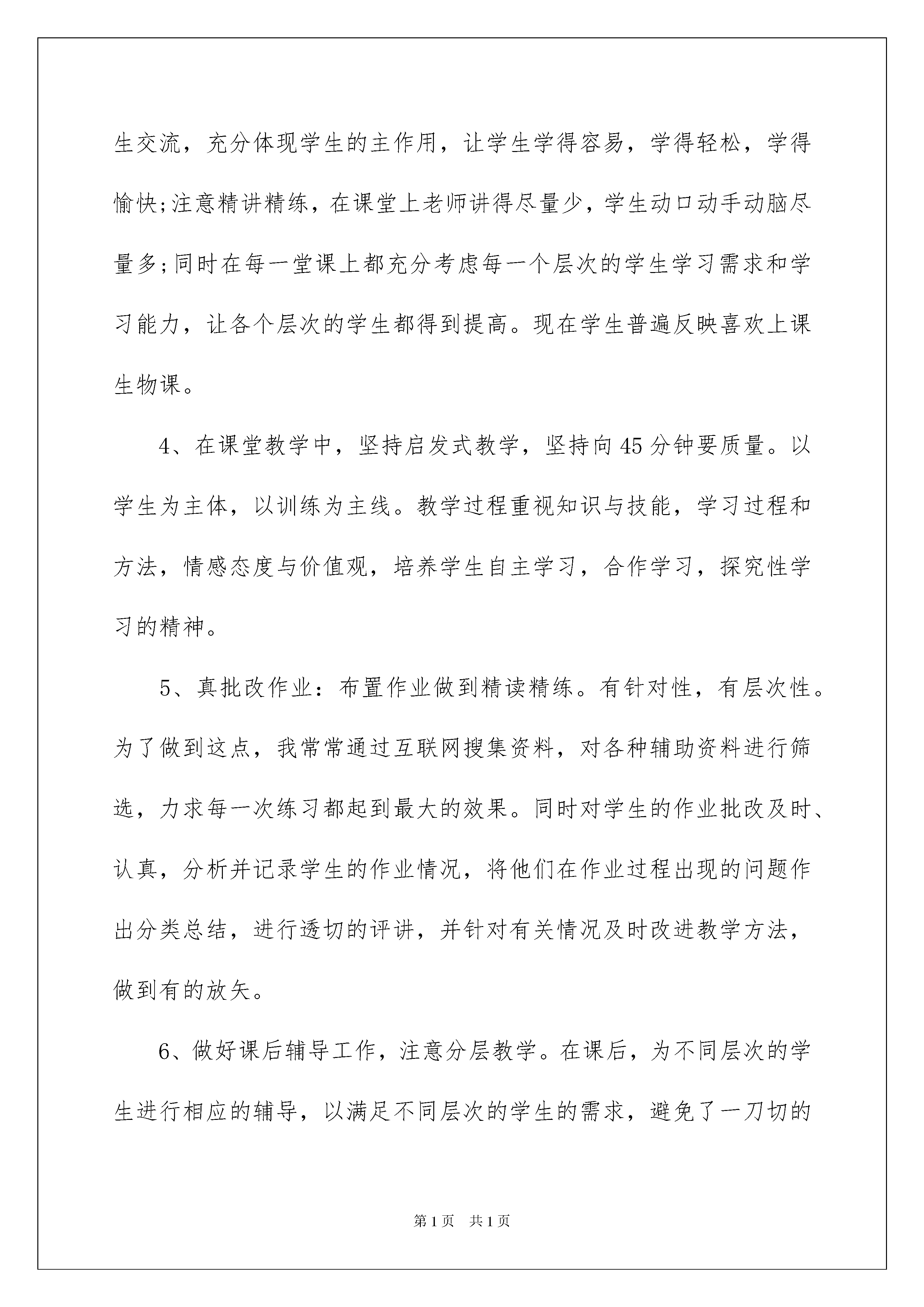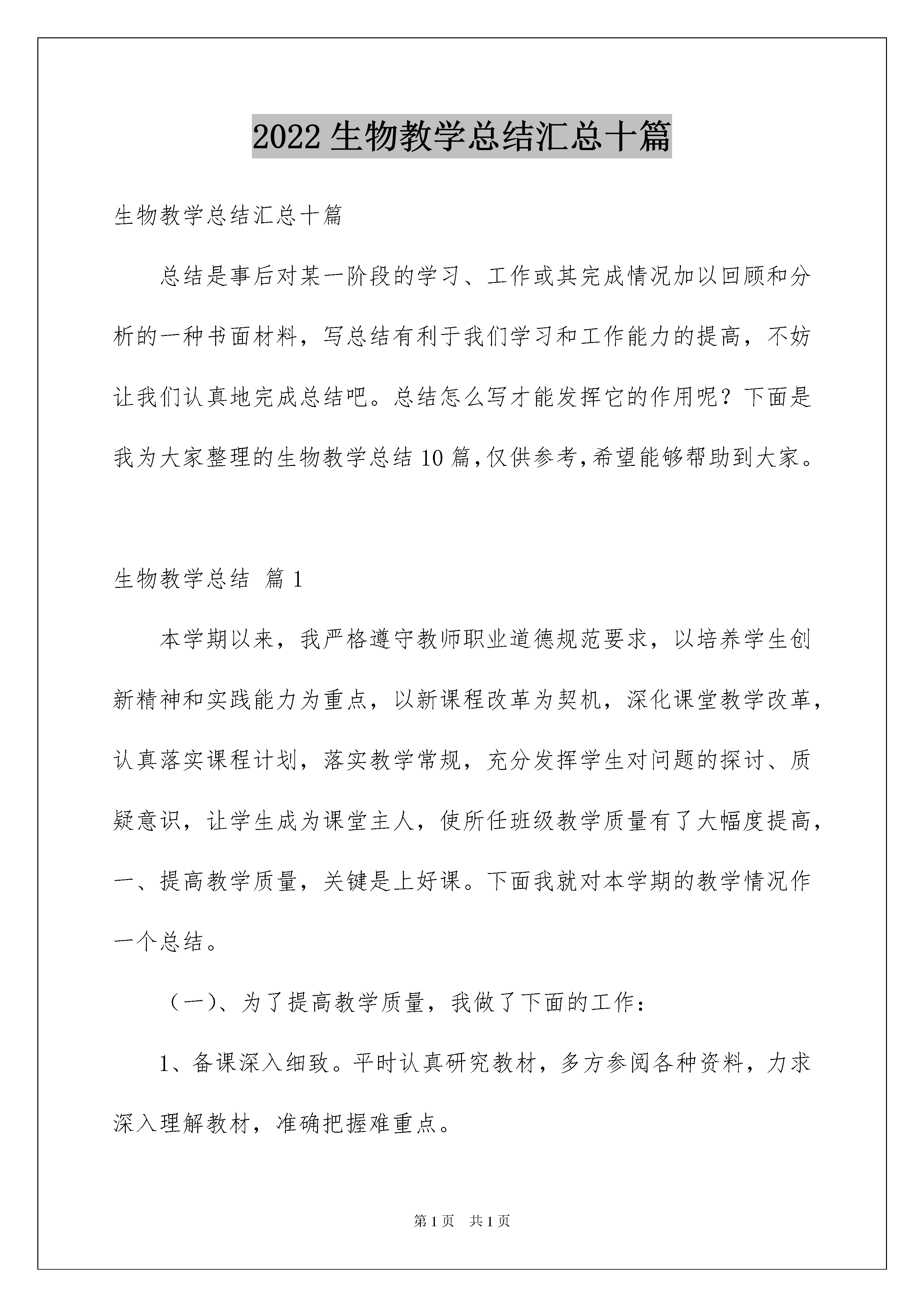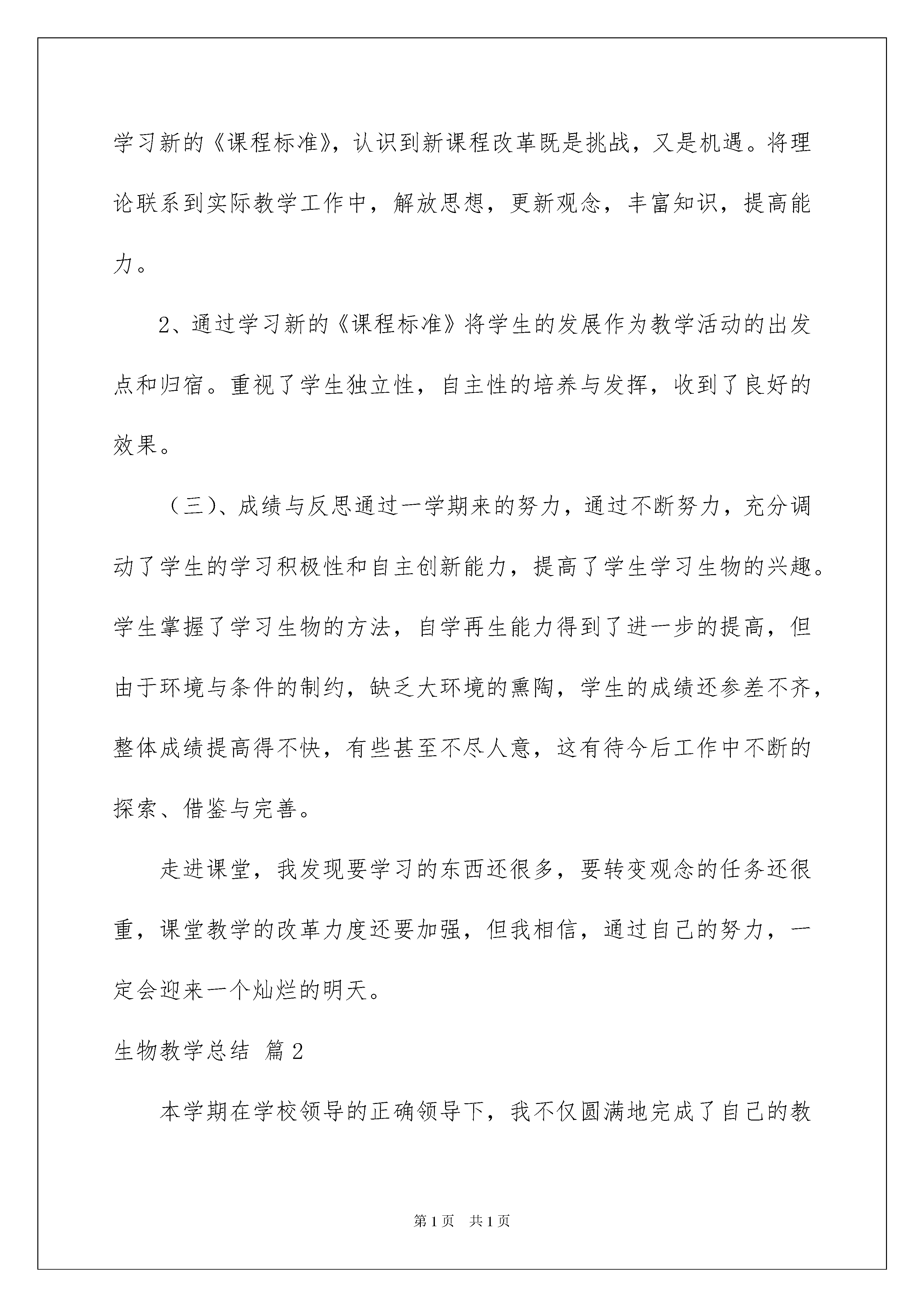 2022生物教学总结汇总十篇生物教学总结汇总十篇总结是事后对某一阶段的学习、工作或其完成情况加以回顾和分析的一种书面材料,写总结有利于我们学习和工作能力的提高,不妨让我们认真地完成总结吧。总结怎么写才能发挥它的作用呢?下面是我为大家整理的生物教学总结10篇,仅供参考,希望能够帮助到大家。生物教学总结篇1本学期以来,我严格遵守教师职业道德规范要求,以培养学生创新精神和实践能力为重点,以新课程改革为契机,深化课堂教学改革,认真落实课程计划,落实教学常规,充分发挥学生对问题的探讨、质疑意识,让学生成为课堂主人,使所任班级教学质量有了大幅度提高,一、提高教学质量,关键是上好课。下面我就对本学期的教学情况作一个总结。(一)、为了提高教学质量,我做了下面的工作:1、备课深入细致。平时认真研究教材,多方参阅各种资料,力求深入理解教材,准确把握难重点。2、注重课堂教学效果。针对中年级学生特点,以愉快式教学为主,不搞满堂灌,坚持学生为主体,教师为主导,注重讲练结合。在教学中注意抓住重点,突破难点。3、在作业批改上,认真及时,力求做到全批全改,重在订正,及时了解学生的学习情况,以便在辅导中做到有的放矢。4、还要做好课后工作,我着重抓好学生的思想教育,并使这一工作惯彻到对学生的学习指导中去,还要做好对学生学习的辅导和帮助工作,对调皮的学生我做到从友善开始,从赞美着手,所有的人都渴望得到别人的理解和尊重,所以,和学生交谈时,对他的处境、想法表示深刻的理解和尊重。这样,学生对我也就漫漫的喜欢和尊重,也开始喜欢学习生物。5、积极参与听课、评课。虚心向老教师学习教学方法,博采众长,以提高教学水平。随着课程改革的推进,对教师的素质要求更高,在今后的教育教学工作中,我将更严格要求自己,努力工作,发扬优点,改正缺点。(二)、认真学习,提高思想认识,树立新的理念1、坚持每周的政治学习和业务学习,紧紧围绕学习新课程,通过学习新的《课程标准》,认识到新课程改革既是挑战,又是机遇。将理论联系到实际教学工作中,解放思想,更新观念,丰富知识,提高能力。2、通过学习新的《课程标准》将学生的发展作为教学活动的出发点和归宿。重视了学生独立性,自主性的培养与发挥,收到了良好的效果。(三)、成绩与反思通过一学期来的努力,通过不断努力,充分调动了学生的学习积极性和自主创新能力,提高了学生学习生物的兴趣。学生掌握了学习生物的方法,自学再生能力得到了进一步的提高,但由于环境与条件的制约,缺乏大环境的熏陶,学生的成绩还参差不齐,整体成绩提高得不快,有些甚至不尽人意,这有待今后工作中不断的探索、借鉴与完善。走进课堂,我发现要学习的东西还很多,要转变观念的任务还很重,课堂教学的改革力度还要加强,但我相信,通过自己的努力,一定会迎来一个灿烂的明天。生物教学总结篇2本学期在学校领导的正确领导下,我不仅圆满地完成了自己的教学任务,还在业务水平上有了很大的提高。立足现在,放眼未来,为使今后的工作取得更大的进步,现对本学年教学工作作出总结,希望能发扬优点,克服不足,总结经验教训,继往开来,以促进教育工作更上一层楼。这一年的教学历程,是忙碌的一年;是充满艰辛的一年;这也是收获喜悦的一学年。现将有关方面总结如下:1、热爱并忠诚于人民的教学事业,教学态度认真,教风扎实,严格遵守学校的规章制度。2、认真备课,不但备学生而且备教材备教法,根据教材内容及学生的实际,设计课的类型,拟定采用的教学方法,并对教学过程的程序及时间安排都作了详细的记录,认真写好教案。每一课都做到“有备而来”,每堂课都在课前做好充分的准备,并制作各种利于吸引学生注意力的有趣教具,课后及时对该课作出总结,写好教后感,并认真按搜集每课书的知识要点,归纳成集。3、增强上课技能,提高教学质量,使讲解清晰化,条理化,准确化,条理化,准确化,情感化,生动化,做到线索清晰,层次分明,言简意赅,深入浅出。在课堂上特别注意调动学生的积极性,加强师生交流,充分体现学生的主作用,让学生学得容易,学得轻松,学得愉快;注意精讲精练,在课堂上老师讲得尽量少,学生动口动手动脑尽量多;同时在每一堂课上都充分考虑每一个层次的学生学习需求和学习能力,让各个层次的学生都得到提高。现在学生普遍反映喜欢上课生物课。4、在课堂教学中,坚持启发式教学,坚持向45分钟要质量。以学生为主体,以训练为主线。教学过程重视知识与技能,学习过程和方法,情感态度与价值观,培养学生自主学习,合作学习,探究性学习的精神。5、真批改作业:布置作业做到精读精练。有针对性,有层次性。为了做到这点,我常常通过互联网搜集资料,对各种辅助资料进行筛选,力求每一次练