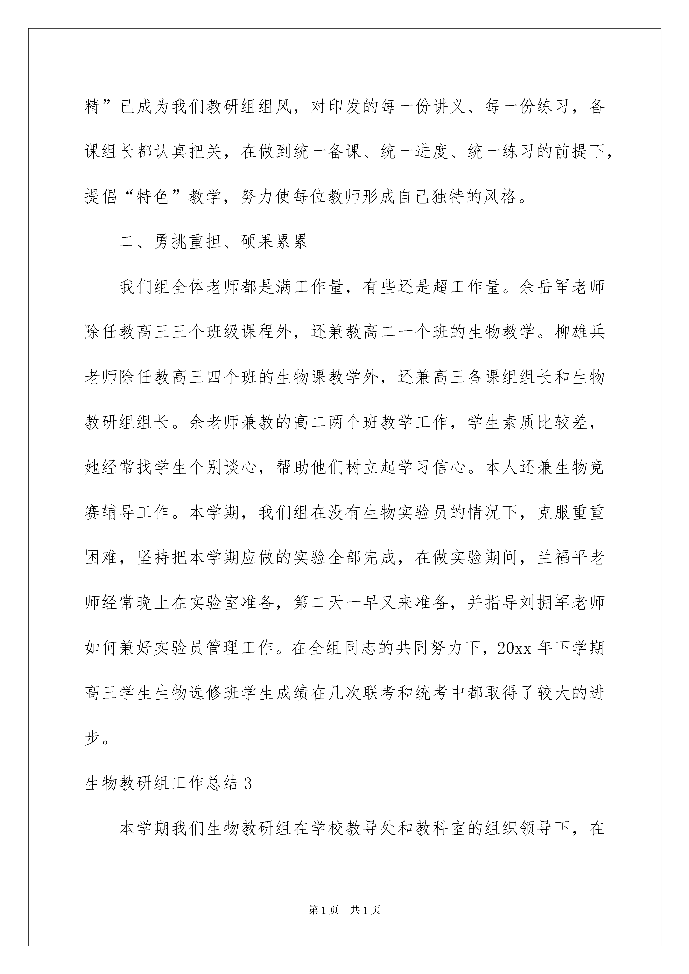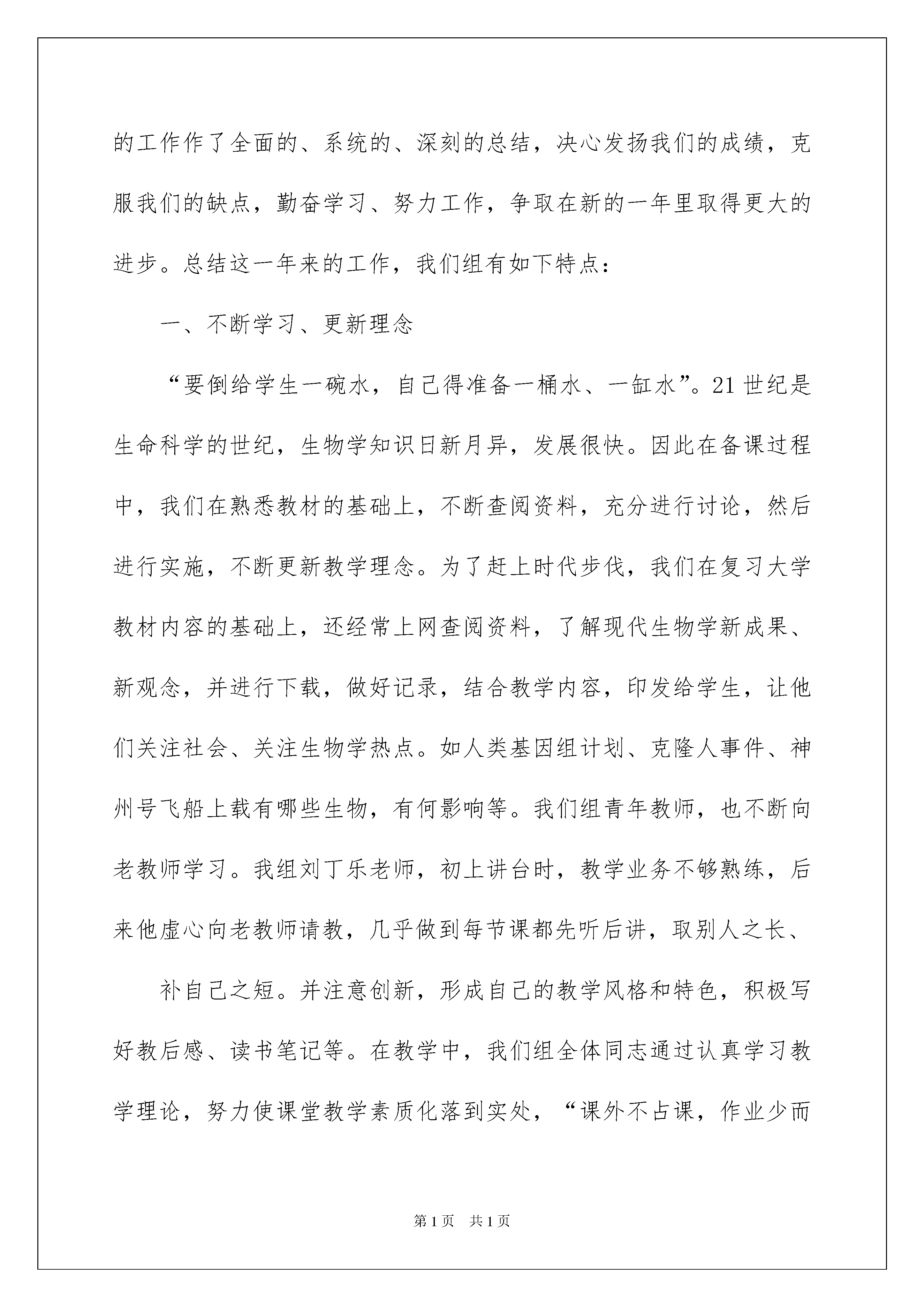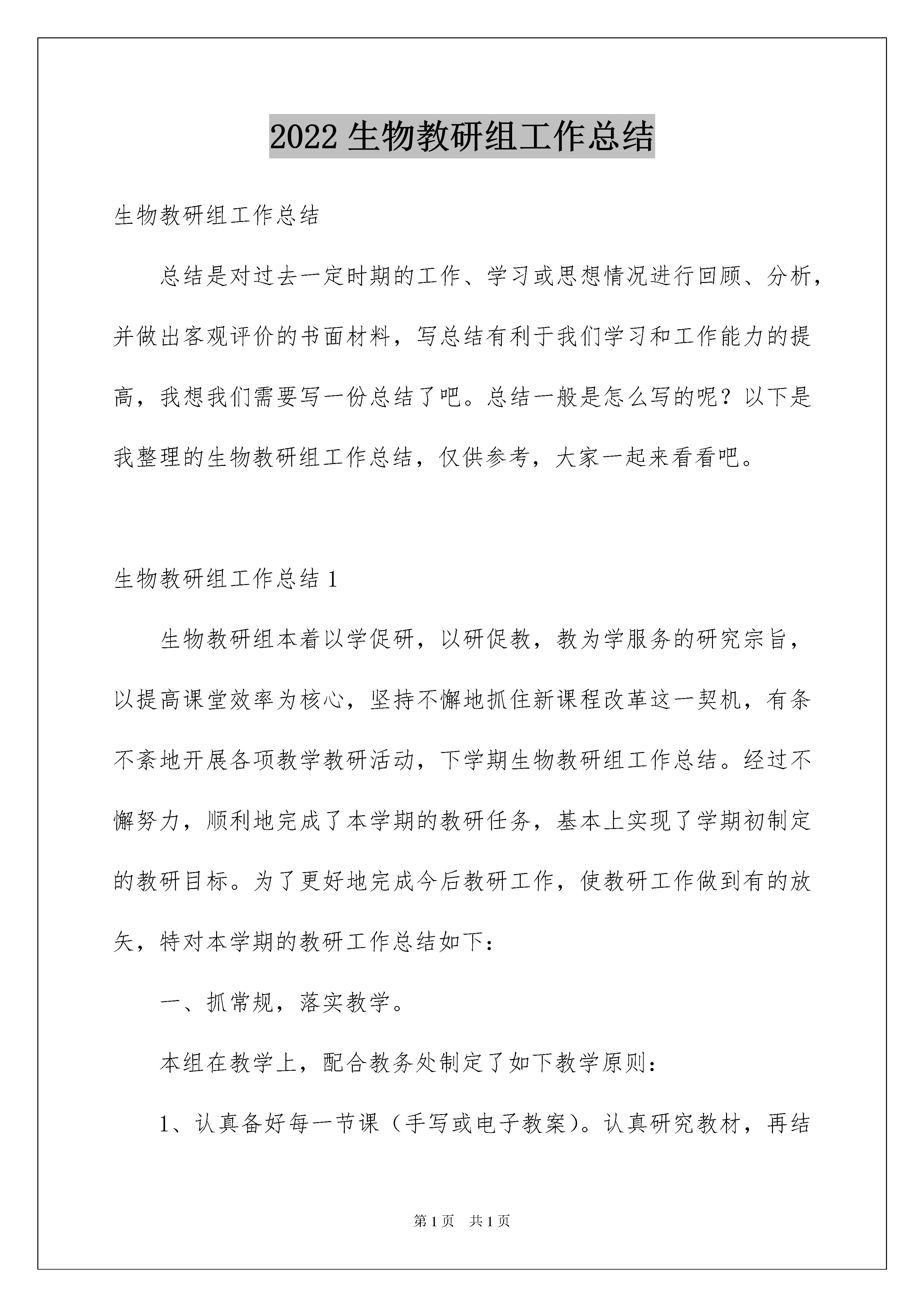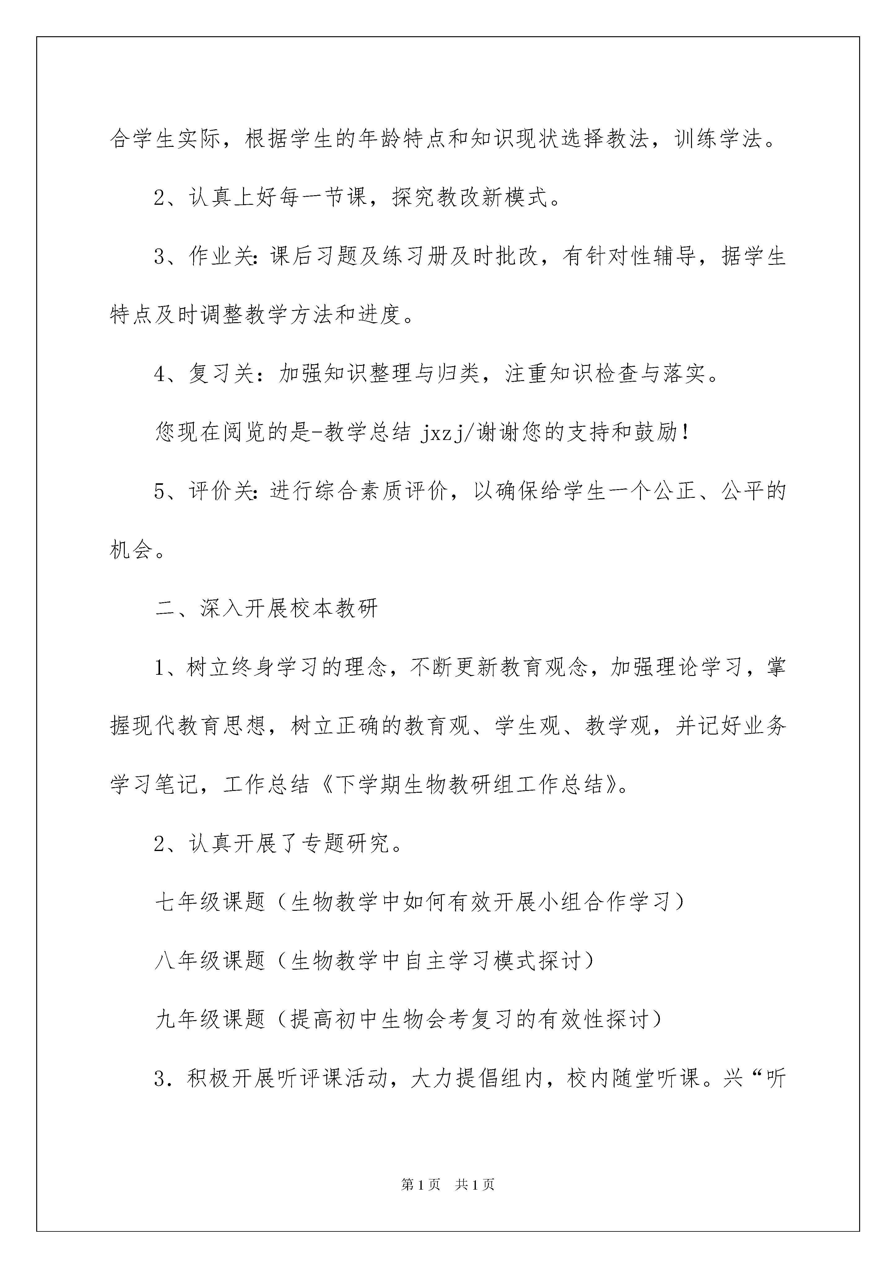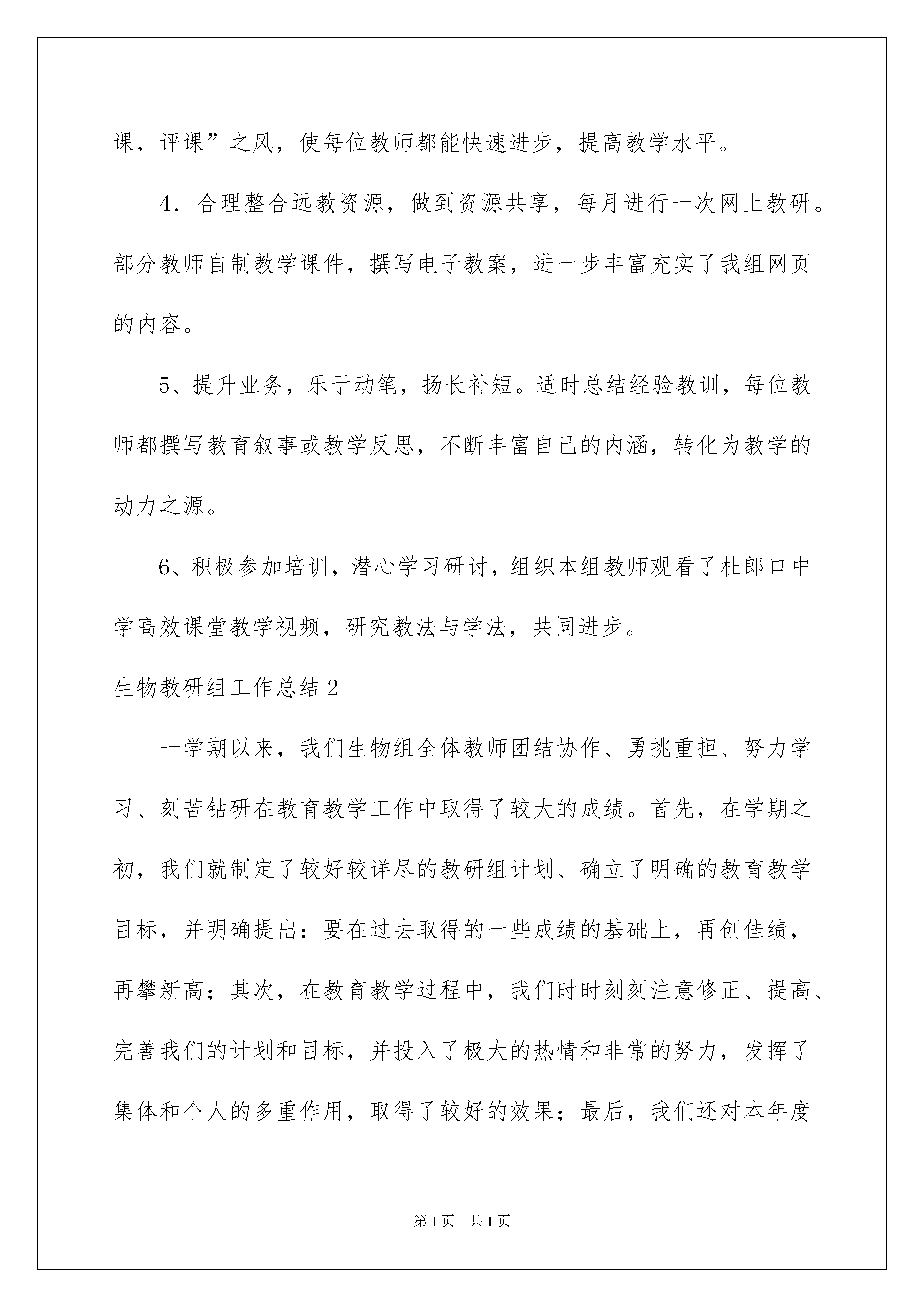 2022生物教研组工作总结生物教研组工作总结总结是对过去一定时期的工作、学习或思想情况进行回顾、分析,并做出客观评价的书面材料,写总结有利于我们学习和工作能力的提高,我想我们需要写一份总结了吧。总结一般是怎么写的呢?以下是我整理的生物教研组工作总结,仅供参考,大家一起来看看吧。生物教研组工作总结1生物教研组本着以学促研,以研促教,教为学服务的研究宗旨,以提高课堂效率为核心,坚持不懈地抓住新课程改革这一契机,有条不紊地开展各项教学教研活动,下学期生物教研组工作总结。经过不懈努力,顺利地完成了本学期的教研任务,基本上实现了学期初制定的教研目标。为了更好地完成今后教研工作,使教研工作做到有的放矢,特对本学期的教研工作总结如下:一、抓常规,落实教学。本组在教学上,配合教务处制定了如下教学原则:1、认真备好每一节课(手写或电子教案)。认真研究教材,再结合学生实际,根据学生的年龄特点和知识现状选择教法,训练学法。2、认真上好每一节课,探究教改新模式。3、作业关:课后习题及练习册及时批改,有针对性辅导,据学生特点及时调整教学方法和进度。4、复习关:加强知识整理与归类,注重知识检查与落实。您现在阅览的是-教学总结jxzj/谢谢您的支持和鼓励!5、评价关:进行综合素质评价,以确保给学生一个公正、公平的机会。二、深入开展校本教研1、树立终身学习的理念,不断更新教育观念,加强理论学习,掌握现代教育思想,树立正确的教育观、学生观、教学观,并记好业务学习笔记,工作总结《下学期生物教研组工作总结》。2、认真开展了专题研究。七年级课题(生物教学中如何有效开展小组合作学习)八年级课题(生物教学中自主学习模式探讨)九年级课题(提高初中生物会考复习的有效性探讨)3.积极开展听评课活动,大力提倡组内,校内随堂听课。兴“听课,评课”之风,使每位教师都能快速进步,提高教学水平。4.合理整合远教资源,做到资源共享,每月进行一次网上教研。部分教师自制教学课件,撰写电子教案,进一步丰富充实了我组网页的内容。5、提升业务,乐于动笔,扬长补短。适时总结经验教训,每位教师都撰写教育叙事或教学反思,不断丰富自己的内涵,转化为教学的动力之源。6、积极参加培训,潜心学习研讨,组织本组教师观看了杜郎口中学高效课堂教学视频,研究教法与学法,共同进步。生物教研组工作总结2一学期以来,我们生物组全体教师团结协作、勇挑重担、努力学习、刻苦钻研在教育教学工作中取得了较大的成绩。首先,在学期之初,我们就制定了较好较详尽的教研组计划、确立了明确的教育教学目标,并明确提出:要在过去取得的一些成绩的基础上,再创佳绩,再攀新高;其次,在教育教学过程中,我们时时刻刻注意修正、提高、完善我们的计划和目标,并投入了极大的热情和非常的努力,发挥了集体和个人的多重作用,取得了较好的效果;最后,我们还对本年度的工作作了全面的、系统的、深刻的总结,决心发扬我们的成绩,克服我们的缺点,勤奋学习、努力工作,争取在新的一年里取得更大的进步。总结这一年来的工作,我们组有如下特点:一、不断学习、更新理念“要倒给学生一碗水,自己得准备一桶水、一缸水”。21世纪是生命科学的世纪,生物学知识日新月异,发展很快。因此在备课过程中,我们在熟悉教材的基础上,不断查阅资料,充分进行讨论,然后进行实施,不断更新教学理念。为了赶上时代步伐,我们在复习大学教材内容的基础上,还经常上网查阅资料,了解现代生物学新成果、新观念,并进行下载,做好记录,结合教学内容,印发给学生,让他们关注社会、关注生物学热点。如人类基因组计划、克隆人事件、神州号飞船上载有哪些生物,有何影响等。我们组青年教师,也不断向老教师学习。我组刘丁乐老师,初上讲台时,教学业务不够熟练,后来他虚心向老教师请教,几乎做到每节课都先听后讲,取别人之长、补自己之短。并注意创新,形成自己的教学风格和特色,积极写好教后感、读书笔记等。在教学中,我们组全体同志通过认真学习教学理论,努力使课堂教学素质化落到实处,“课外不占课,作业少而精”已成为我们教研组组风,对印发的每一份讲义、每一份练习,备课组长都认真把关,在做到统一备课、统一进度、统一练习的前提下,提倡“特色”教学,努力使每位教师形成自己独特的风格。二、勇挑重担、硕果累累我们组全体老师都是满工作量,有些还是超工作量。余岳军老师除任教高三三个班级课程外,还兼教高二一个班的生物教学。柳雄兵老师除任教高三四个班的生物课教学外,还兼高三备课组组长和生物教研组组长。余老师兼教的高二两个班教学工作,学生素质比较差,她经常找学生个别谈心,帮助他们树立起学习信心。本人还兼生物竞赛辅导工作。本学期,我们组在没有