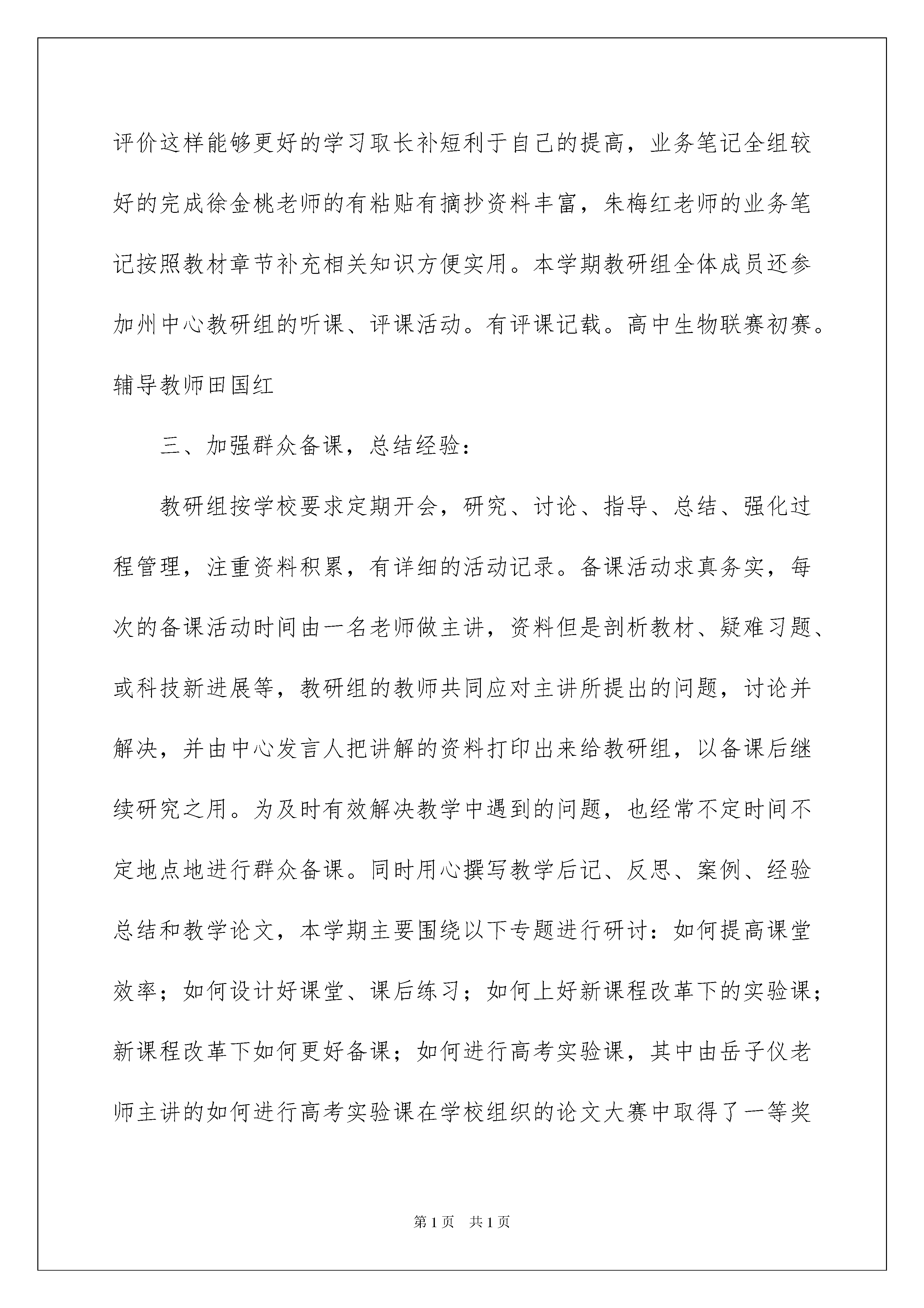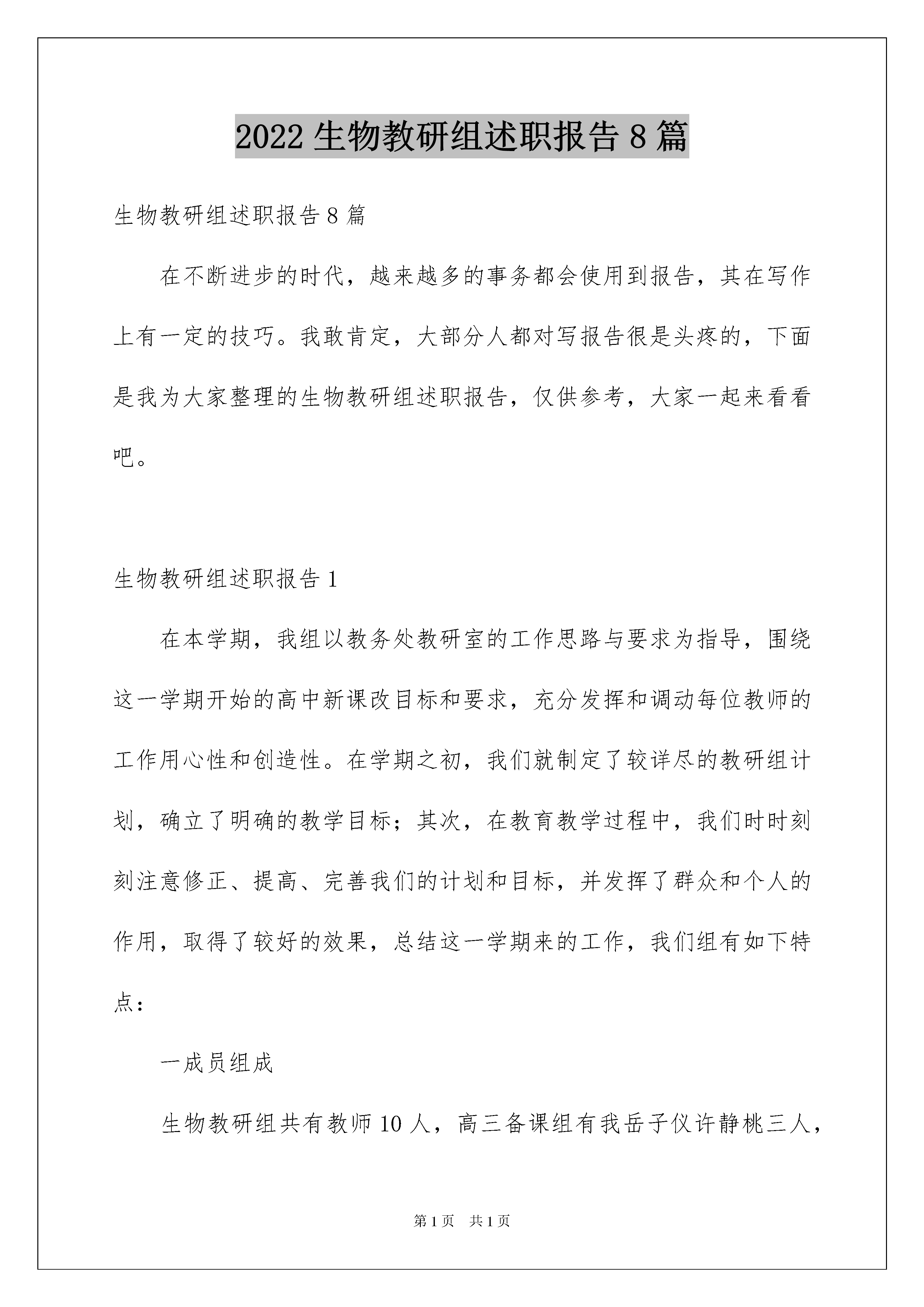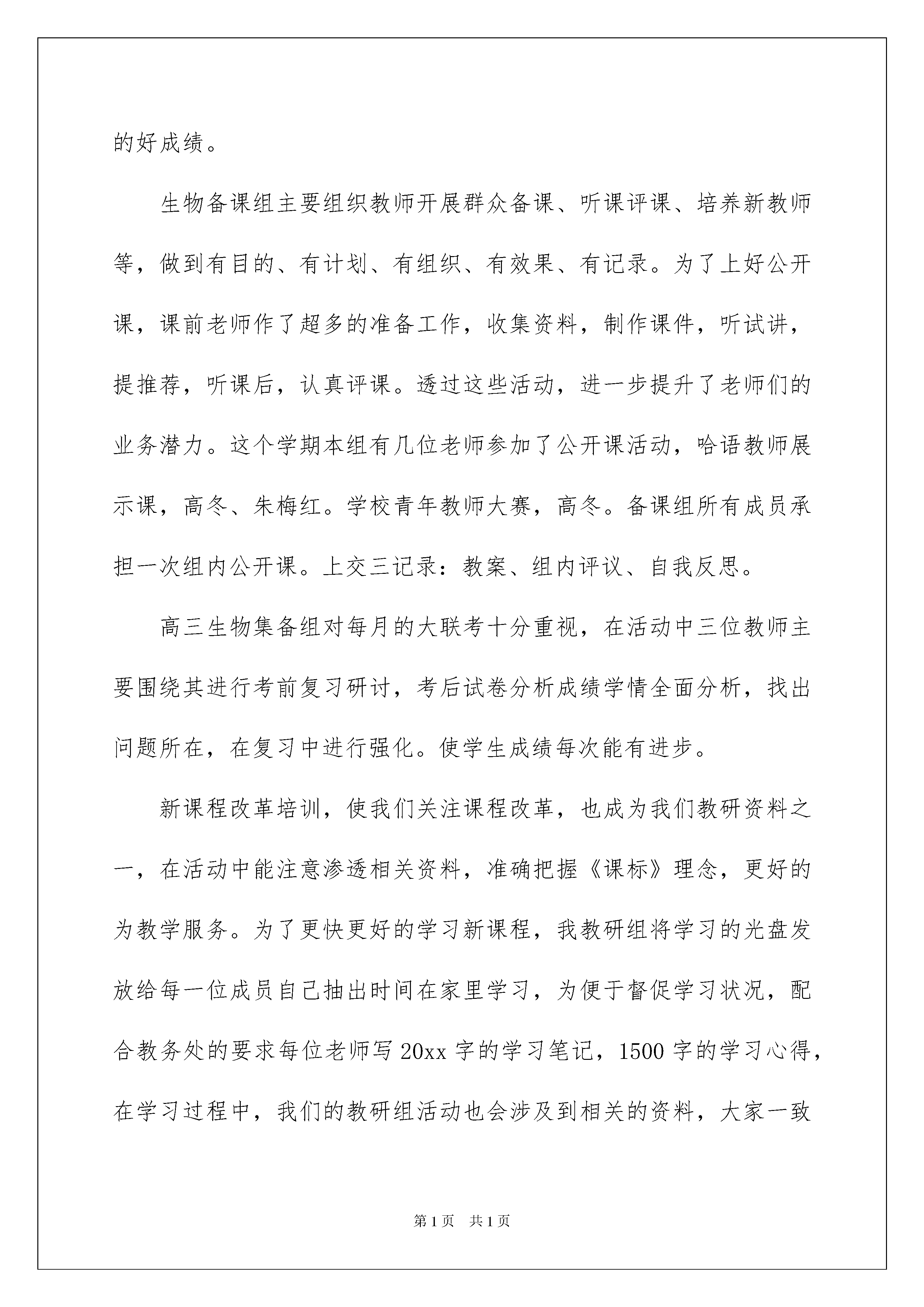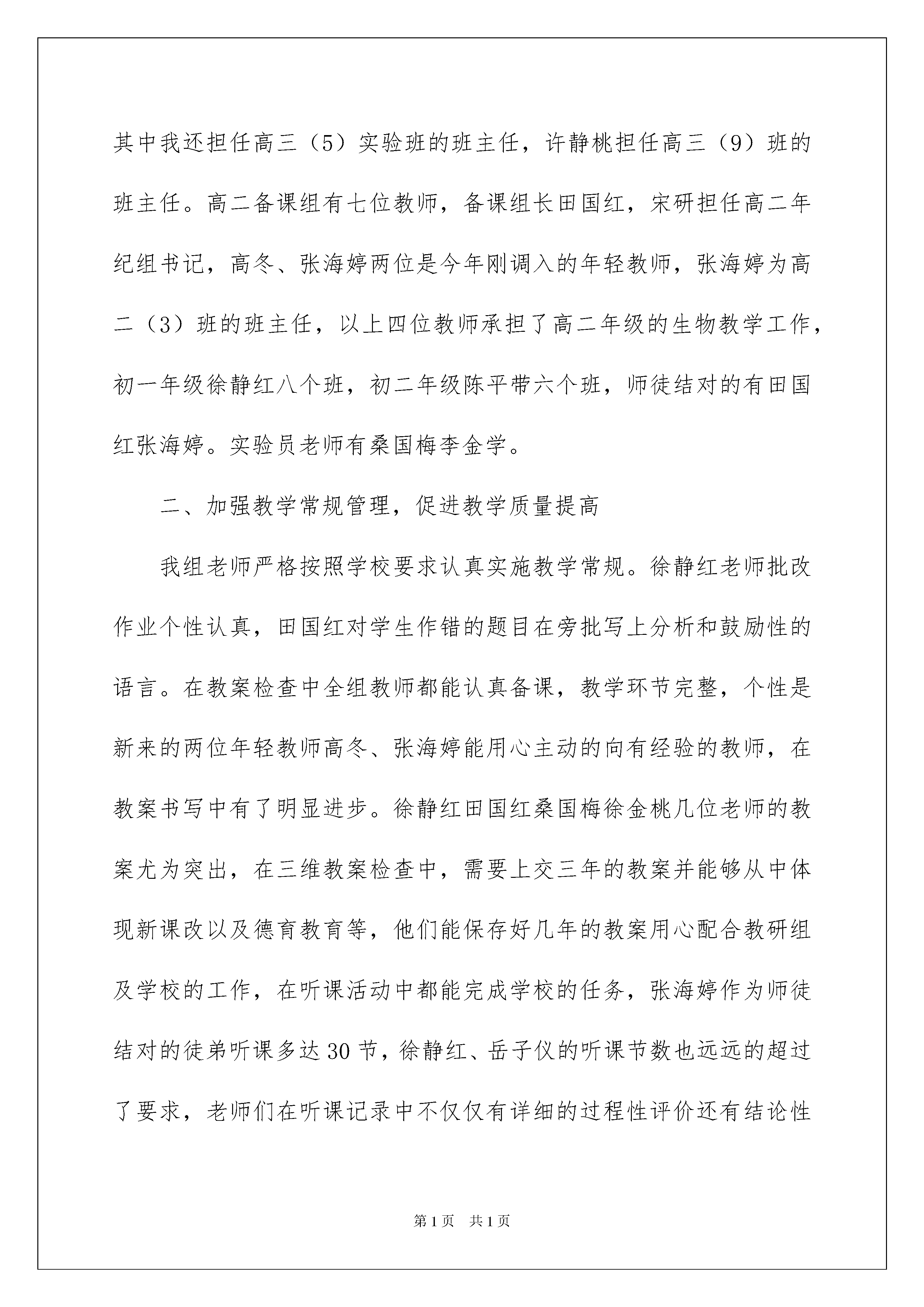 2022生物教研组述职报告8篇生物教研组述职报告8篇在不断进步的时代,越来越多的事务都会使用到报告,其在写作上有一定的技巧。我敢肯定,大部分人都对写报告很是头疼的,下面是我为大家整理的生物教研组述职报告,仅供参考,大家一起来看看吧。生物教研组述职报告1在本学期,我组以教务处教研室的工作思路与要求为指导,围绕这一学期开始的高中新课改目标和要求,充分发挥和调动每位教师的工作用心性和创造性。在学期之初,我们就制定了较详尽的教研组计划,确立了明确的教学目标;其次,在教育教学过程中,我们时时刻刻注意修正、提高、完善我们的计划和目标,并发挥了群众和个人的作用,取得了较好的效果,总结这一学期来的工作,我们组有如下特点:一成员组成生物教研组共有教师10人,高三备课组有我岳子仪许静桃三人,其中我还担任高三(5)实验班的班主任,许静桃担任高三(9)班的班主任。高二备课组有七位教师,备课组长田国红,宋研担任高二年纪组书记,高冬、张海婷两位是今年刚调入的年轻教师,张海婷为高二(3)班的班主任,以上四位教师承担了高二年级的生物教学工作,初一年级徐静红八个班,初二年级陈平带六个班,师徒结对的有田国红张海婷。实验员老师有桑国梅李金学。二、加强教学常规管理,促进教学质量提高我组老师严格按照学校要求认真实施教学常规。徐静红老师批改作业个性认真,田国红对学生作错的题目在旁批写上分析和鼓励性的语言。在教案检查中全组教师都能认真备课,教学环节完整,个性是新来的两位年轻教师高冬、张海婷能用心主动的向有经验的教师,在教案书写中有了明显进步。徐静红田国红桑国梅徐金桃几位老师的教案尤为突出,在三维教案检查中,需要上交三年的教案并能够从中体现新课改以及德育教育等,他们能保存好几年的教案用心配合教研组及学校的工作,在听课活动中都能完成学校的任务,张海婷作为师徒结对的徒弟听课多达30节,徐静红、岳子仪的听课节数也远远的超过了要求,老师们在听课记录中不仅仅有详细的过程性评价还有结论性评价这样能够更好的学习取长补短利于自己的提高,业务笔记全组较好的完成徐金桃老师的有粘贴有摘抄资料丰富,朱梅红老师的业务笔记按照教材章节补充相关知识方便实用。本学期教研组全体成员还参加州中心教研组的听课、评课活动。有评课记载。高中生物联赛初赛。辅导教师田国红三、加强群众备课,总结经验:教研组按学校要求定期开会,研究、讨论、指导、总结、强化过程管理,注重资料积累,有详细的活动记录。备课活动求真务实,每次的备课活动时间由一名老师做主讲,资料但是剖析教材、疑难习题、或科技新进展等,教研组的教师共同应对主讲所提出的问题,讨论并解决,并由中心发言人把讲解的资料打印出来给教研组,以备课后继续研究之用。为及时有效解决教学中遇到的问题,也经常不定时间不定地点地进行群众备课。同时用心撰写教学后记、反思、案例、经验总结和教学论文,本学期主要围绕以下专题进行研讨:如何提高课堂效率;如何设计好课堂、课后练习;如何上好新课程改革下的实验课;新课程改革下如何更好备课;如何进行高考实验课,其中由岳子仪老师主讲的如何进行高考实验课在学校组织的论文大赛中取得了一等奖的好成绩。生物备课组主要组织教师开展群众备课、听课评课、培养新教师等,做到有目的、有计划、有组织、有效果、有记录。为了上好公开课,课前老师作了超多的准备工作,收集资料,制作课件,听试讲,提推荐,听课后,认真评课。透过这些活动,进一步提升了老师们的业务潜力。这个学期本组有几位老师参加了公开课活动,哈语教师展示课,高冬、朱梅红。学校青年教师大赛,高冬。备课组所有成员承担一次组内公开课。上交三记录:教案、组内评议、自我反思。高三生物集备组对每月的大联考十分重视,在活动中三位教师主要围绕其进行考前复习研讨,考后试卷分析成绩学情全面分析,找出问题所在,在复习中进行强化。使学生成绩每次能有进步。新课程改革培训,使我们关注课程改革,也成为我们教研资料之一,在活动中能注意渗透相关资料,准确把握《课标》理念,更好的为教学服务。为了更快更好的学习新课程,我教研组将学习的光盘发放给每一位成员自己抽出时间在家里学习,为便于督促学习状况,配合教务处的要求每位老师写20xx字的学习笔记,1500字的学习心得,在学习过程中,我们的教研组活动也会涉及到相关的资料,大家一致达成共识课改改革的重点不在于形式,而就应是教学的实效性,就应把重点放在教育教学效果的提高。为此,认为是要正确处理“教师主导”与“学生主体”的关系,提倡自主、合作、探究学习,不要排斥和否定理解式学习。教学过程中教学方式和手段不是单一的,多种教学方式交互使用能够到达更好的教育教学效果。教学中